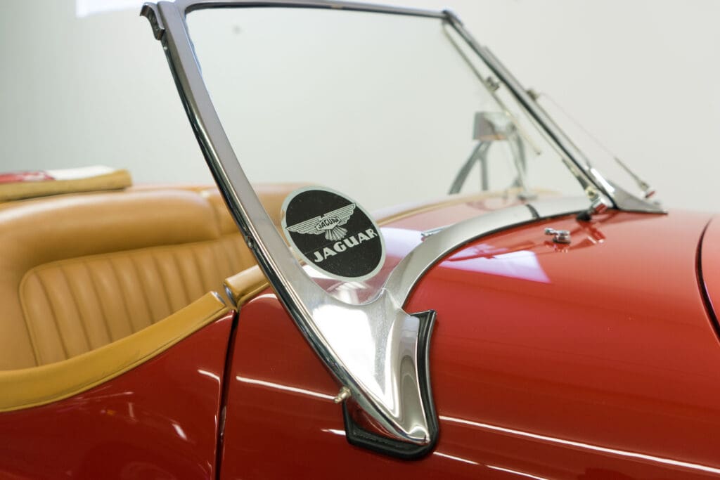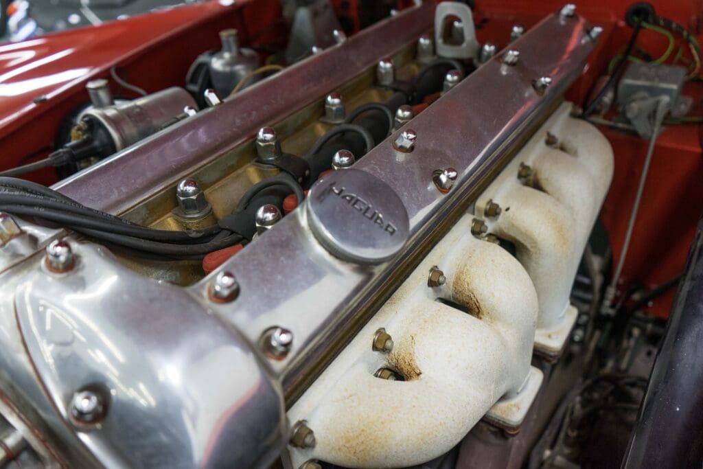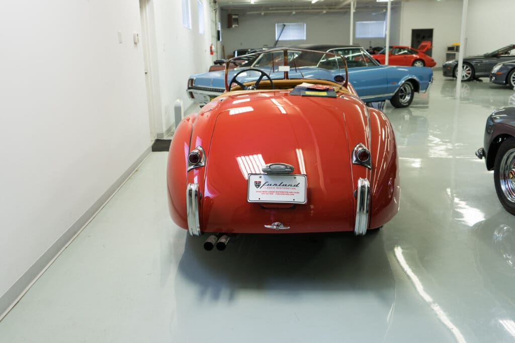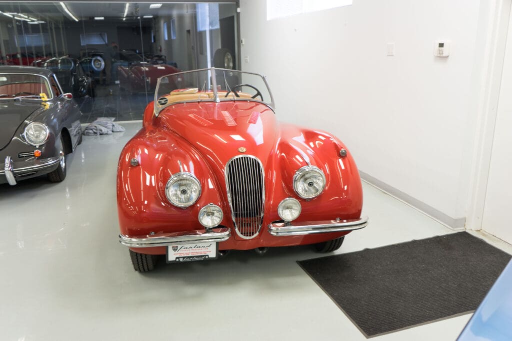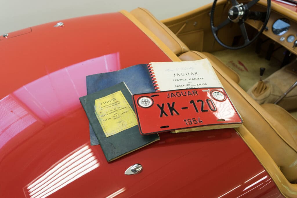 By vintage Jaguar standards, it doesn’t even leak much! It has new batteries & tires and could be taken on a 500-mile tour tomorrow.Yes, the hood (bonnet!) was louvered many years ago to help keep it cool, but it has the original spats, wheel trim rings, owner’s book, shop manual, spare wheel, jack, etc. The paint is quite good, the leather and top have been replaced and all the instruments work. It is best described as a really nice driver, not a show queen, simply because of the hood louvers and a color change. A Heritage Certificate has been applied for and we will be posting a full set of professional photos soon, but these will give someone a headstart on this nice XK120.