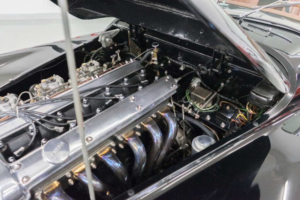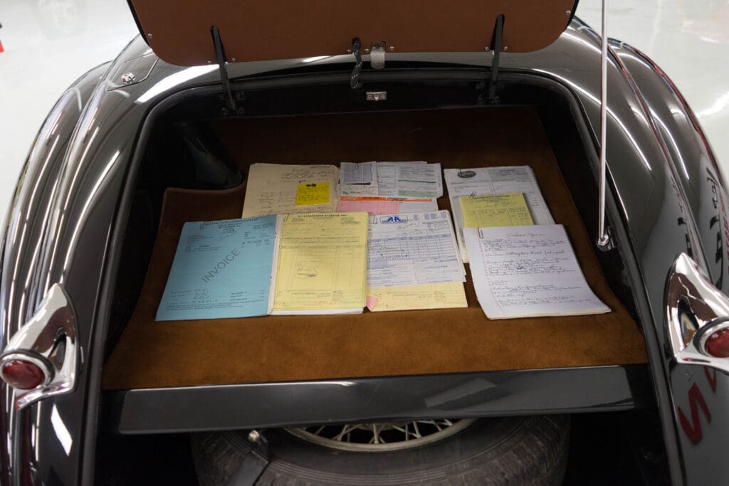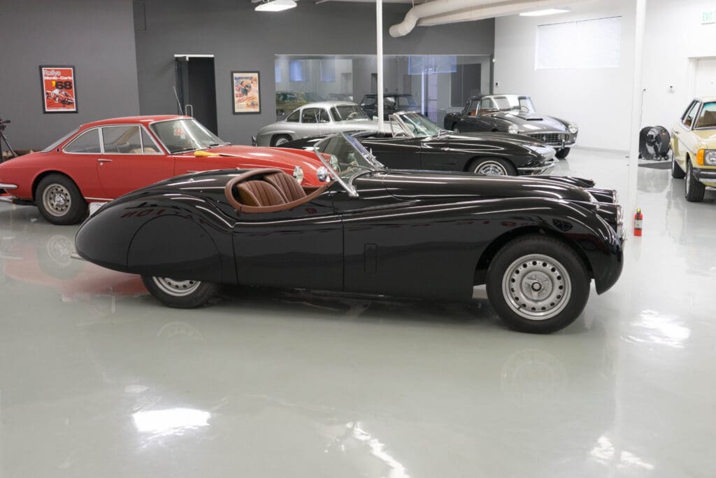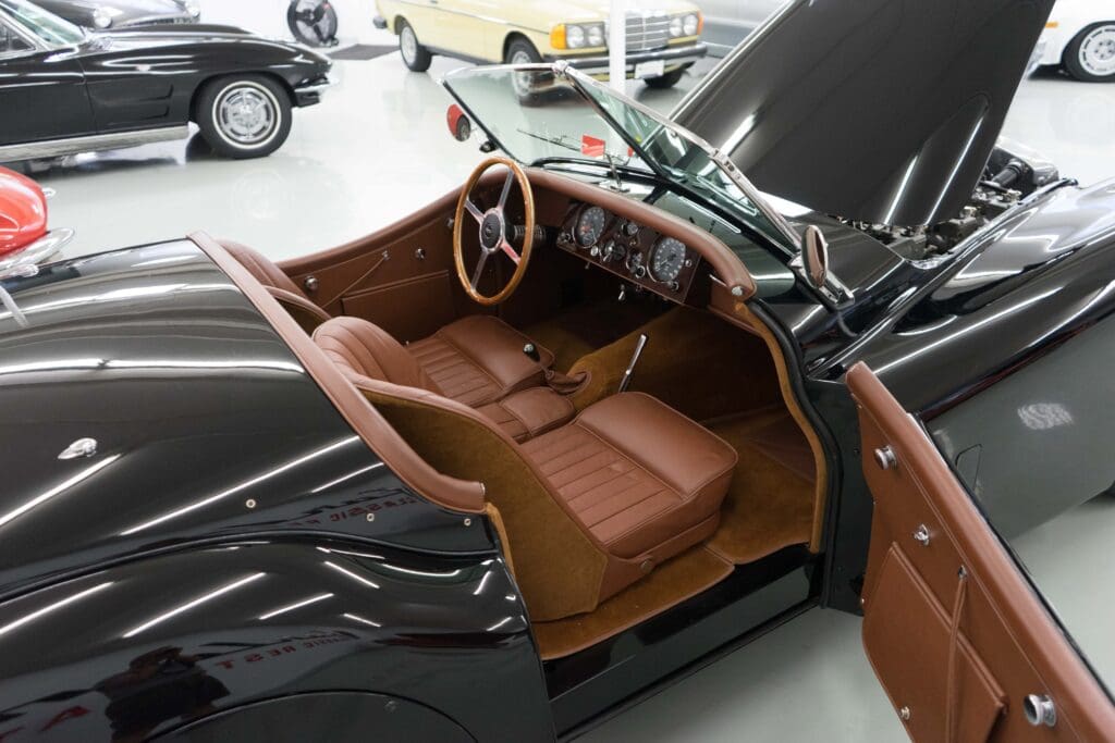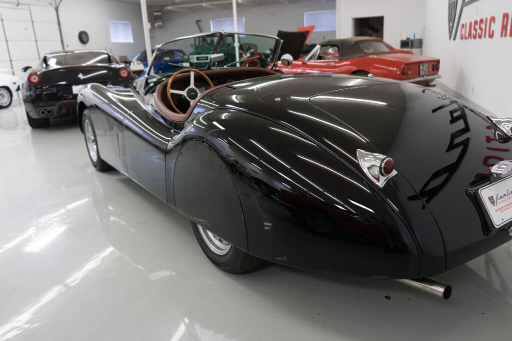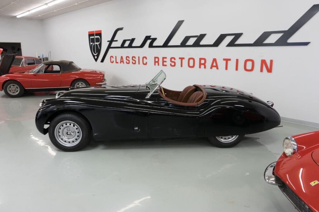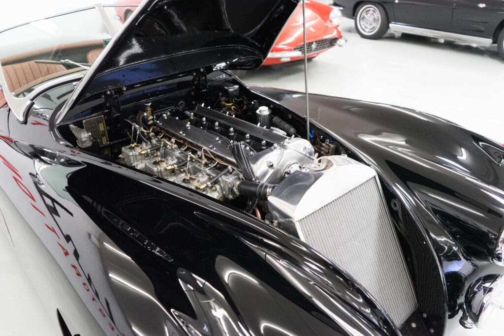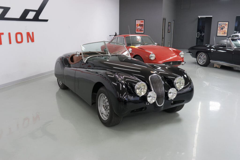 The restoration was extensive and included being stripped to bare metal (including the chassis), a rebuilt, tuned & balanced 3.8 engine with a large-valve straight-port head breathing through three Webers. Also boasts a Getrag 5-speed, 4-wheel power disc brakes, D-Type wheels, special seats, XK140 rack & pinion and three more pages of beautiful, professional, enhancements by one of the best-known XK fabricators. The show-quality black paint is accented with all-new custom leather trim, new weather equipment and supported by several large binders of receipts and hundreds of photos documenting the transformation. You cannot find a more sophisticated and effective 1000-mile event classic Jaguar, and it is available immediately for far less than it cost to build.