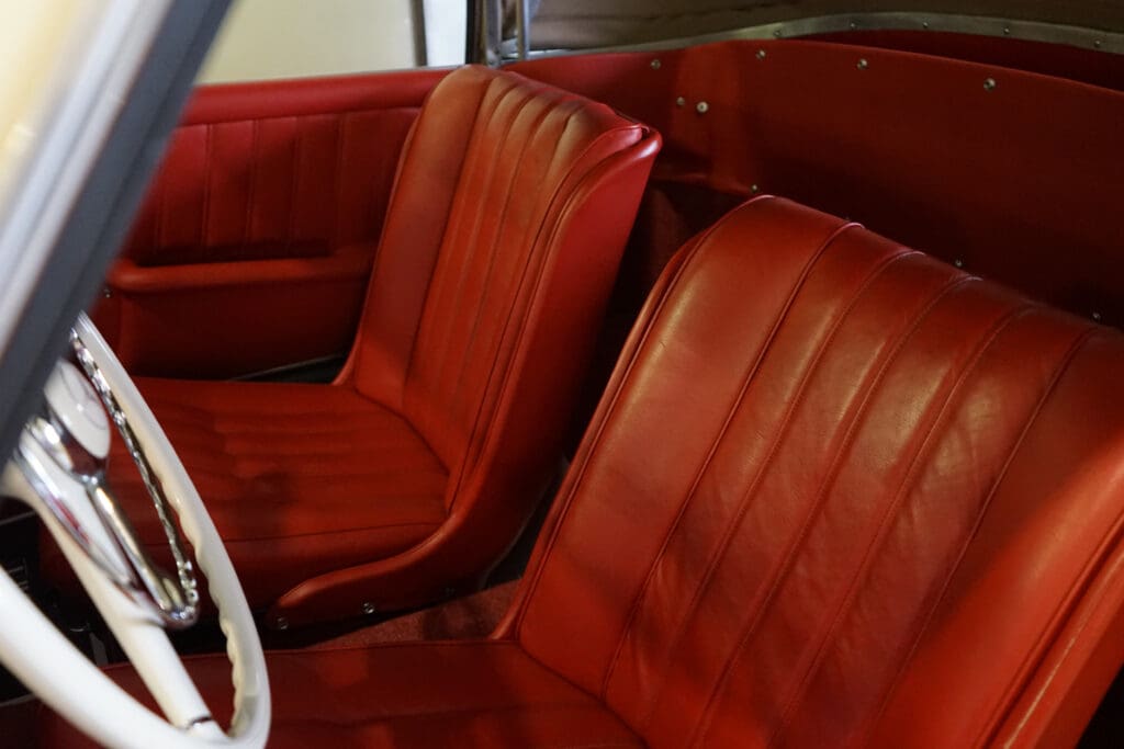 Our customer has owned this very early and quite original 1955 190 SL for over 25 years. The car had been in extended storage for many years. We began by restoring the fuel, brake, cooling & heating systems. As we moved along and got to know this car, we marveled at the original paint. Our expert paint technicians were able to preserve it as we polished and restored it to a gleaming shine. We also replaced the red carpets with a new set and did a simple refresh on the whole interior.