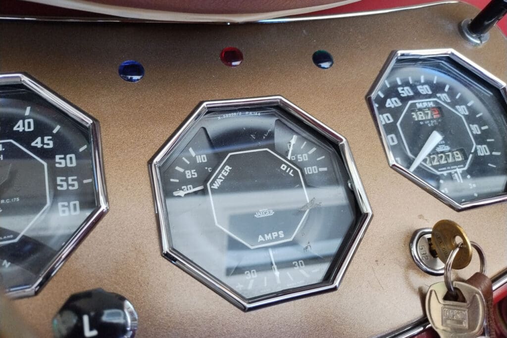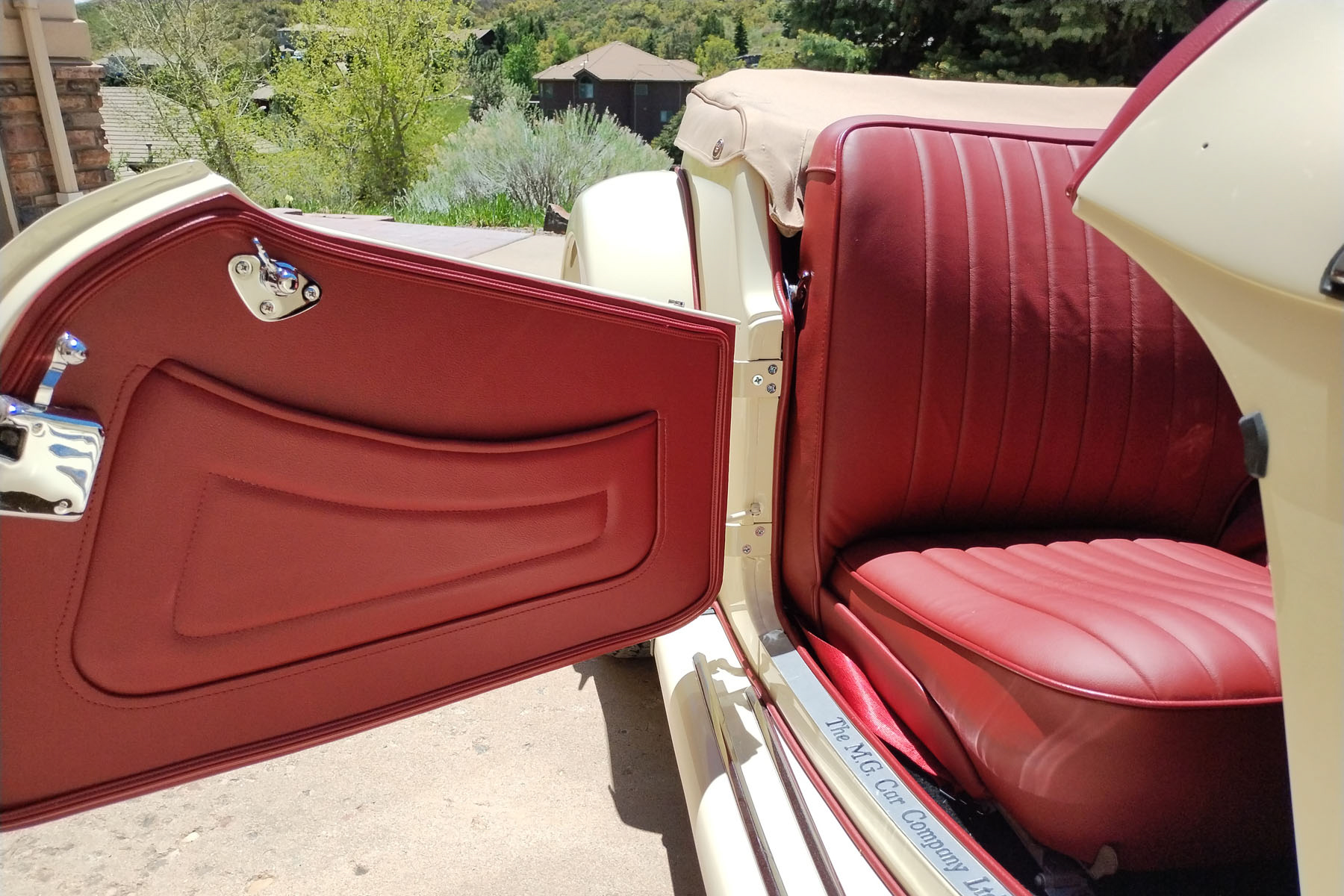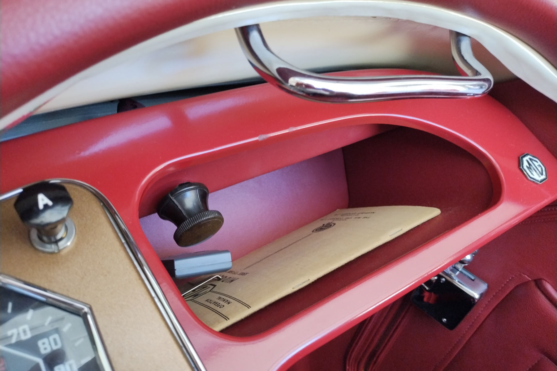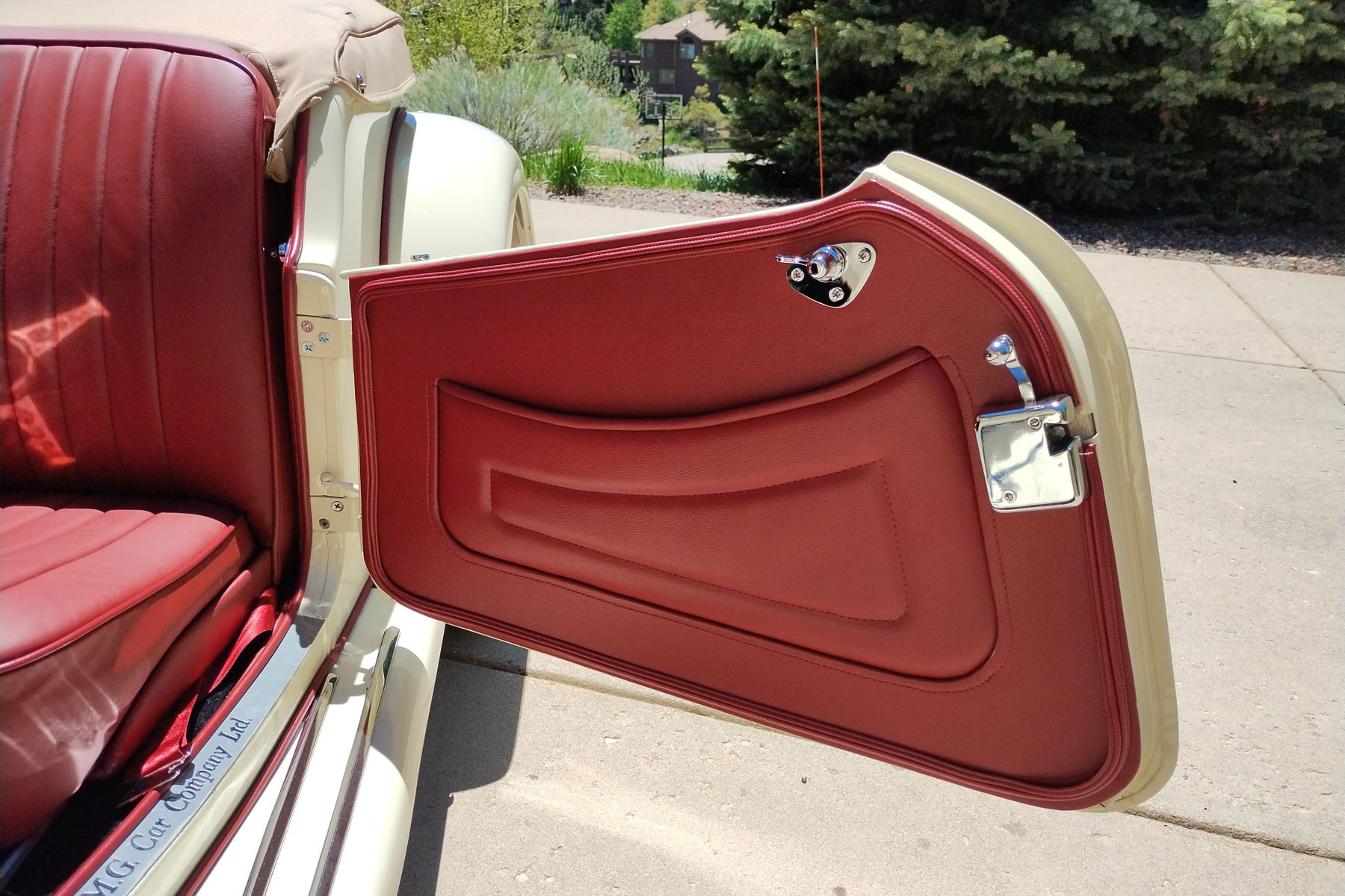 This car was sold new to a lady in Long Beach, CA who kept it 60 years (!) until her passing in 2015 and is now being sold for the second owner, who restored it to a very high level after bringing it home to Colorado. The car had no old damage to rectify and being in SoCal, it had escaped the rust problems so common to vintage English cars. The body was stripped to metal and professionally painted in our shop less than two years ago. Following the paint, new red leather upholstery was installed along with wiring harness, steering rack and other mechanical replacements. The original 48-spoke wheels were replaced with new chrome 60-spoke ones with Vredestein Sprint Classic tires. (Originals come with the car, plus a bin of spare parts, manual, all original tools (very rare) & car cover)