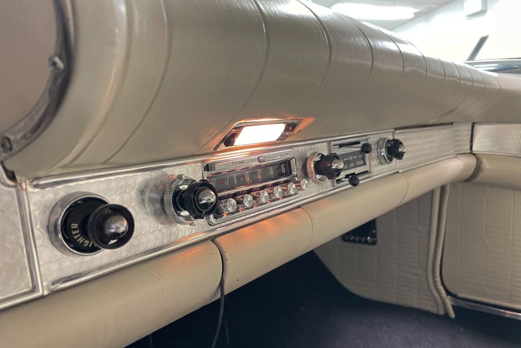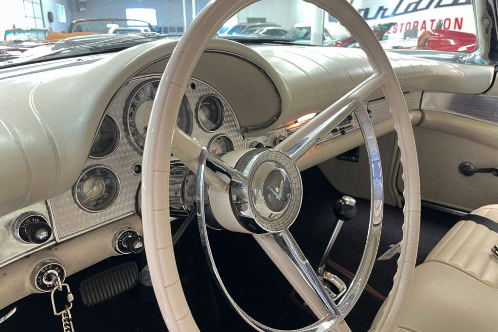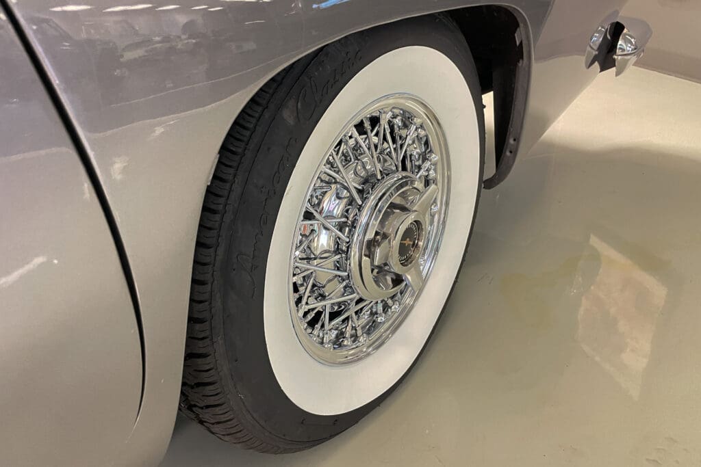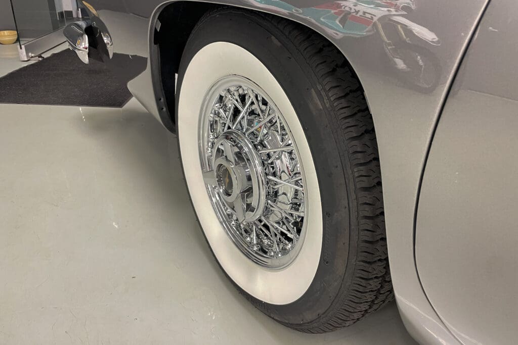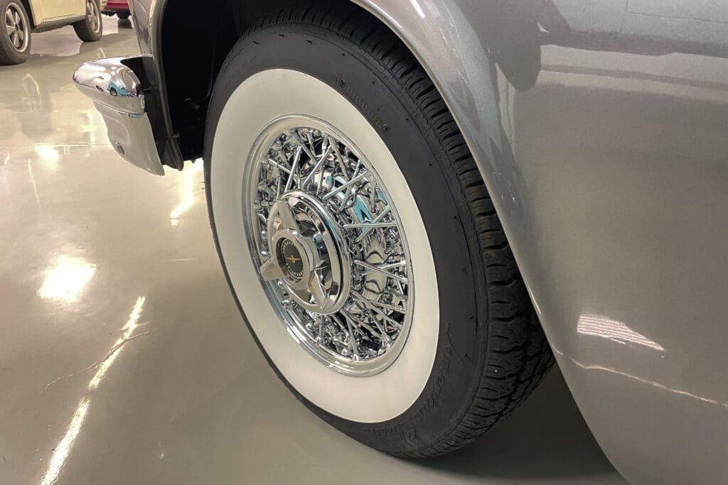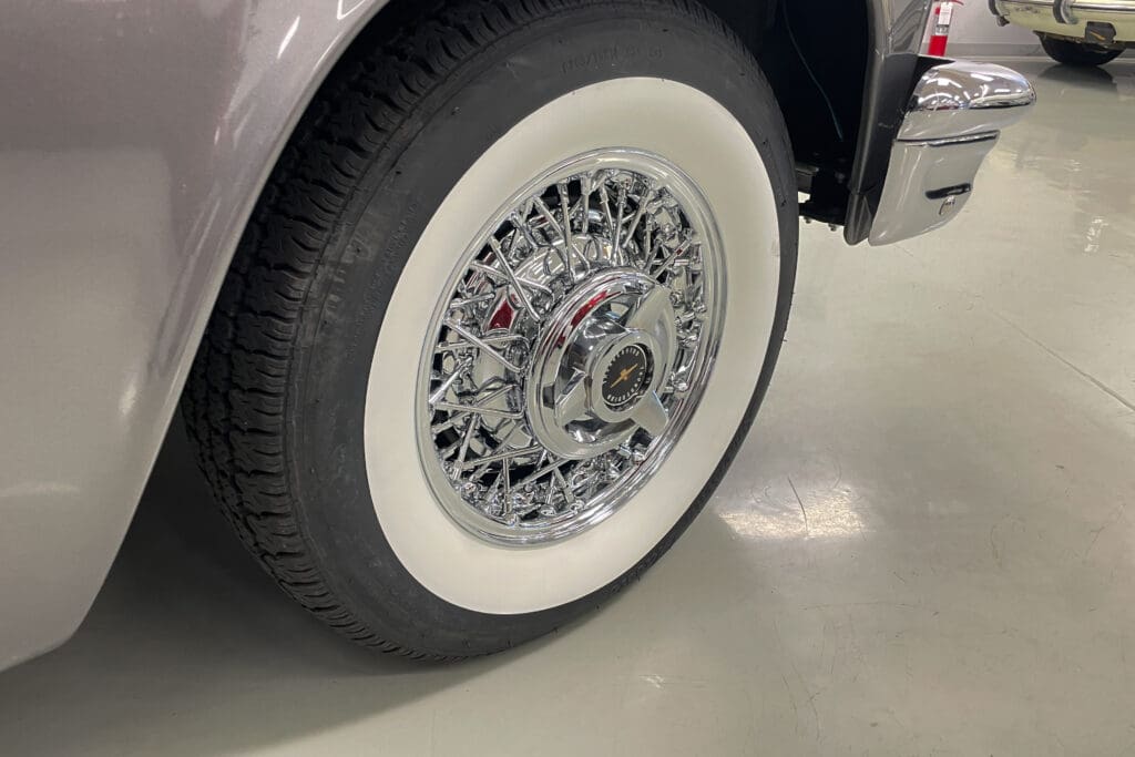 At the same time the interior was completely redone in the original color plus a new white convertible top was installed. The car sports a great set of chrome Kelsey-Hayes wire wheels and an original-looking radio with modern bluetooth internals that was recently installed. It has the popular 4-barrel 312 engine fitted with the dress-up kit that included aluminum valve covers and five new period-correct Coker tires were added last year.
