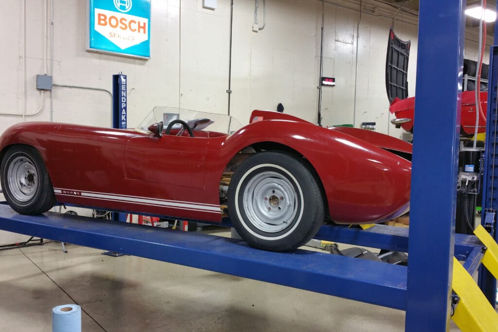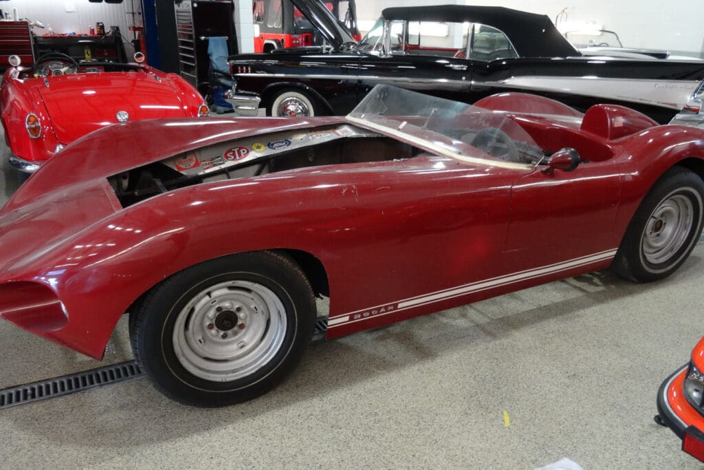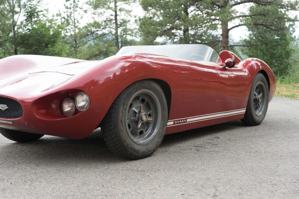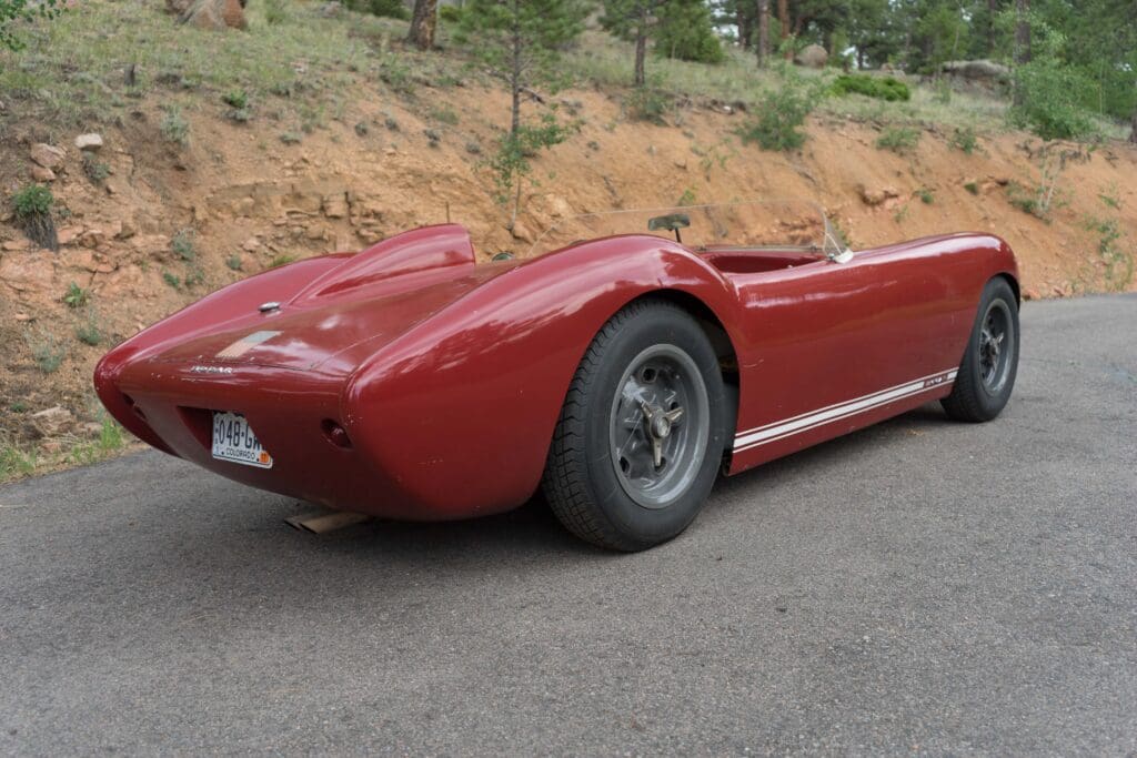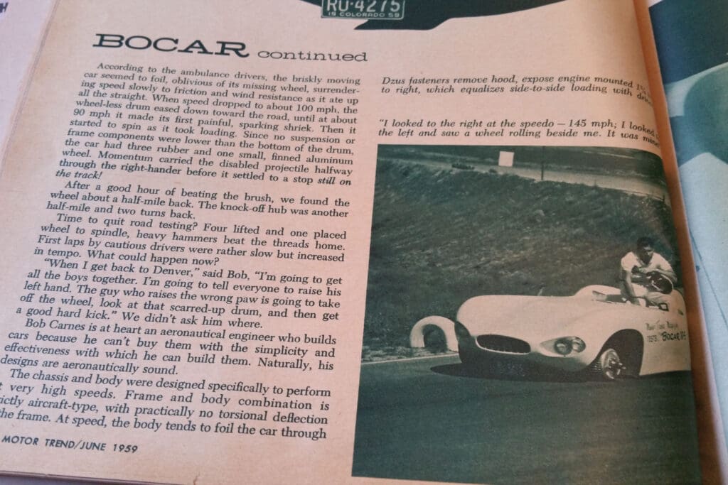 This is a rare and unusual car, a 1959 Bocar. The Bocar was a tube chassis, fiberglass bodied sports car built here in Colorado between 1958-1961 by Bob Carnes. Bob Carnes sold cars as complete, ready-to-drive, or a customer could purchase the chassis and body separately.