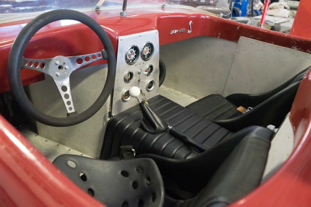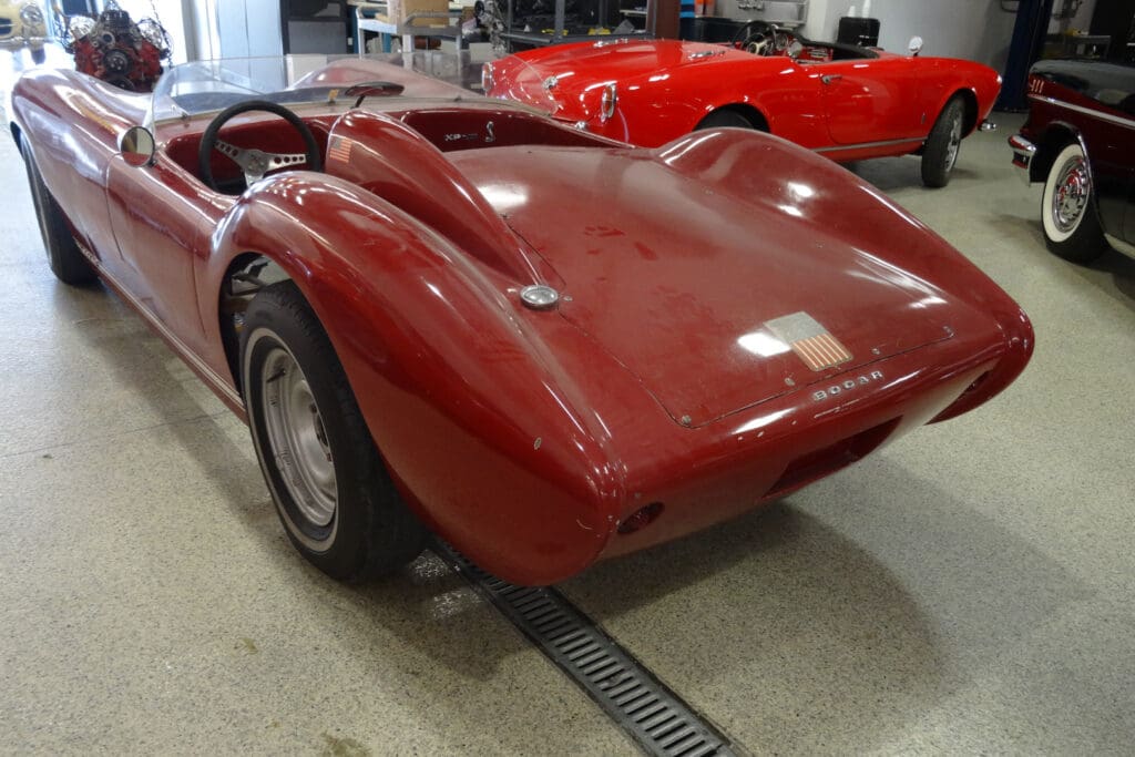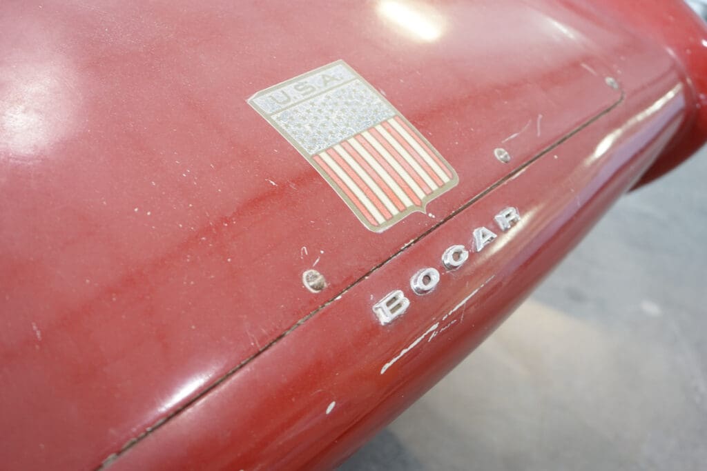 This particular car was constructed from a chassis and body that were purchased separately in the early 60s in a deal between the original owner and Bob Carnes that involved the trading of another completed Bocar. It is titled as serial #004, and is known as an XP-6 model. Unfortunately, the Bocar factory burned on Christmas day of 1961.Cars completed by Bob Carnes were outfitted with the Corvette 283 engine, however this particular Bocar, being completed by the owner, was outfitted with something different. The original owner purchased a then brand new to the market combination, a Ford Mustang 289 HiPo V8 and Toploader 4-speed transmission. He purchased these items from Garnsey & Wheeler Ford of Greeley, Colorado.