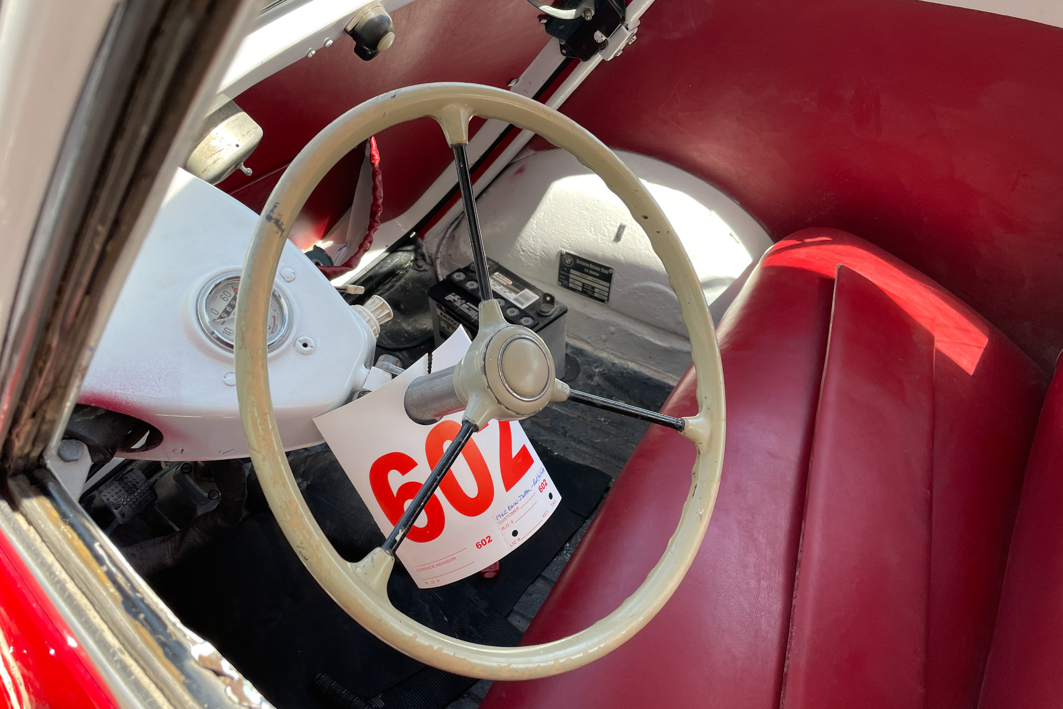 This car was recently purchased by a new owner. On the drive home the seat made contact with the battery and caused a small electrical fire, to which the owner responded “did I do that?” Of course, this was a previously mishandled repair by another shop and now our techs will be carefully rewiring this micro-classic.