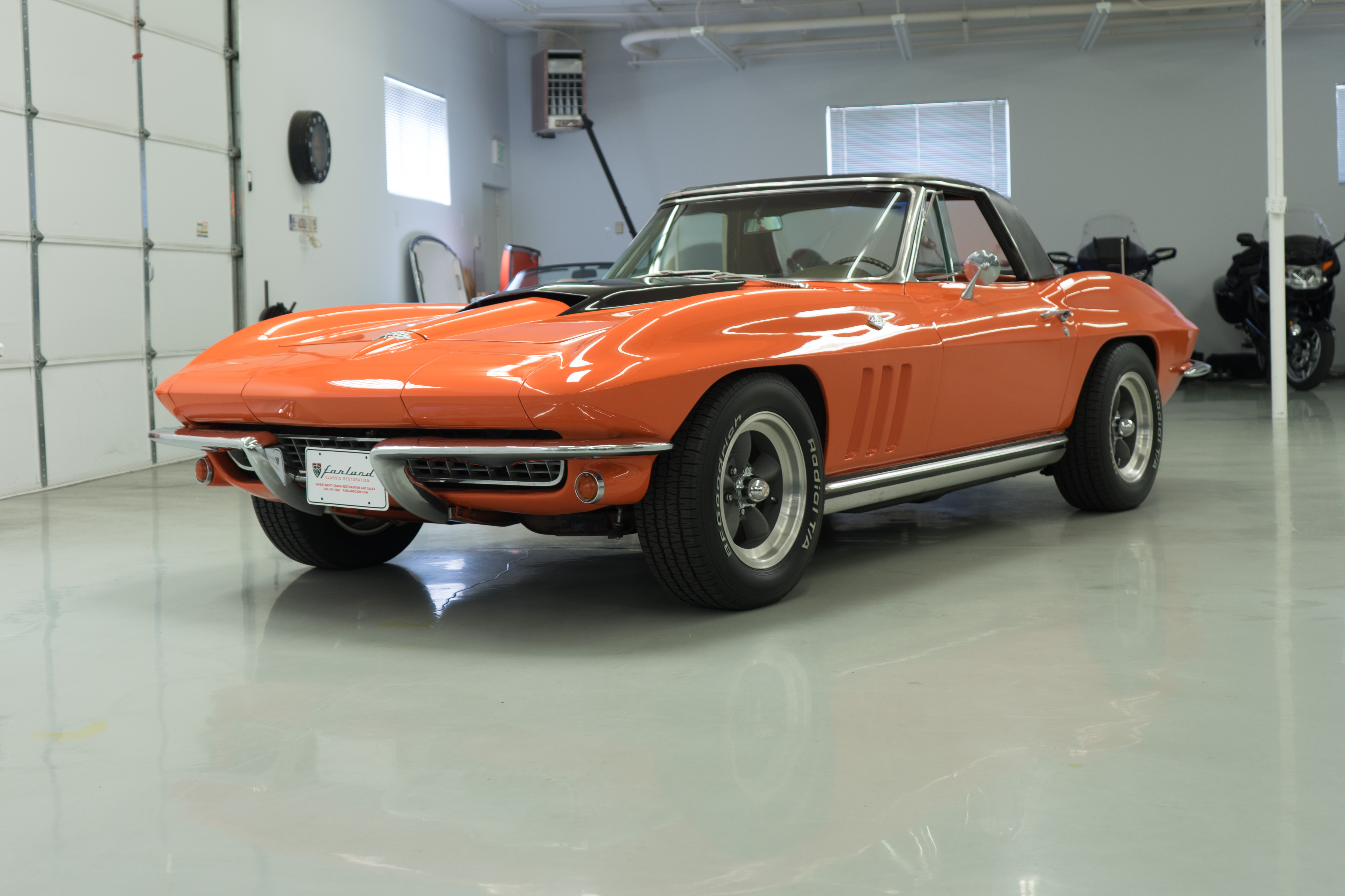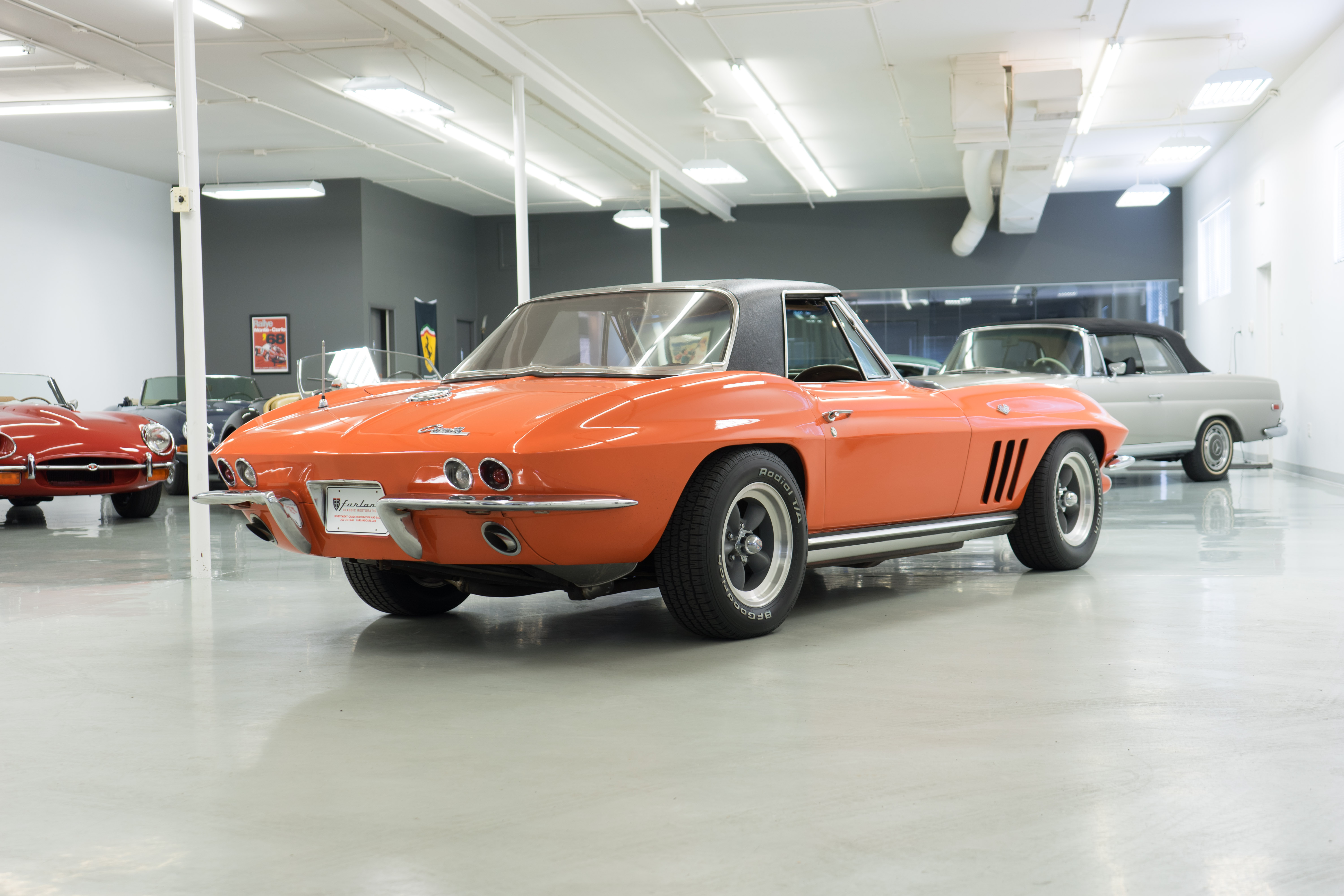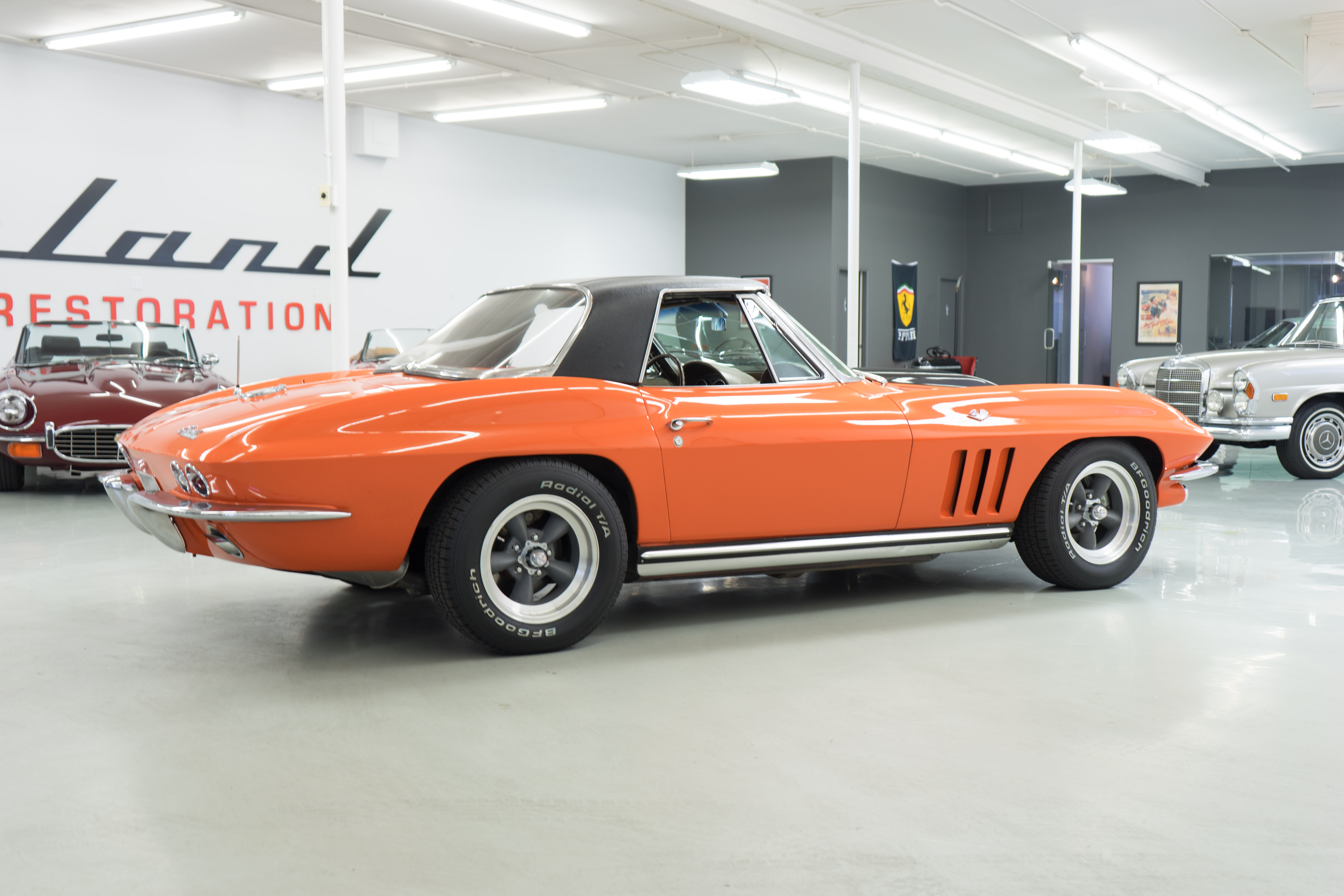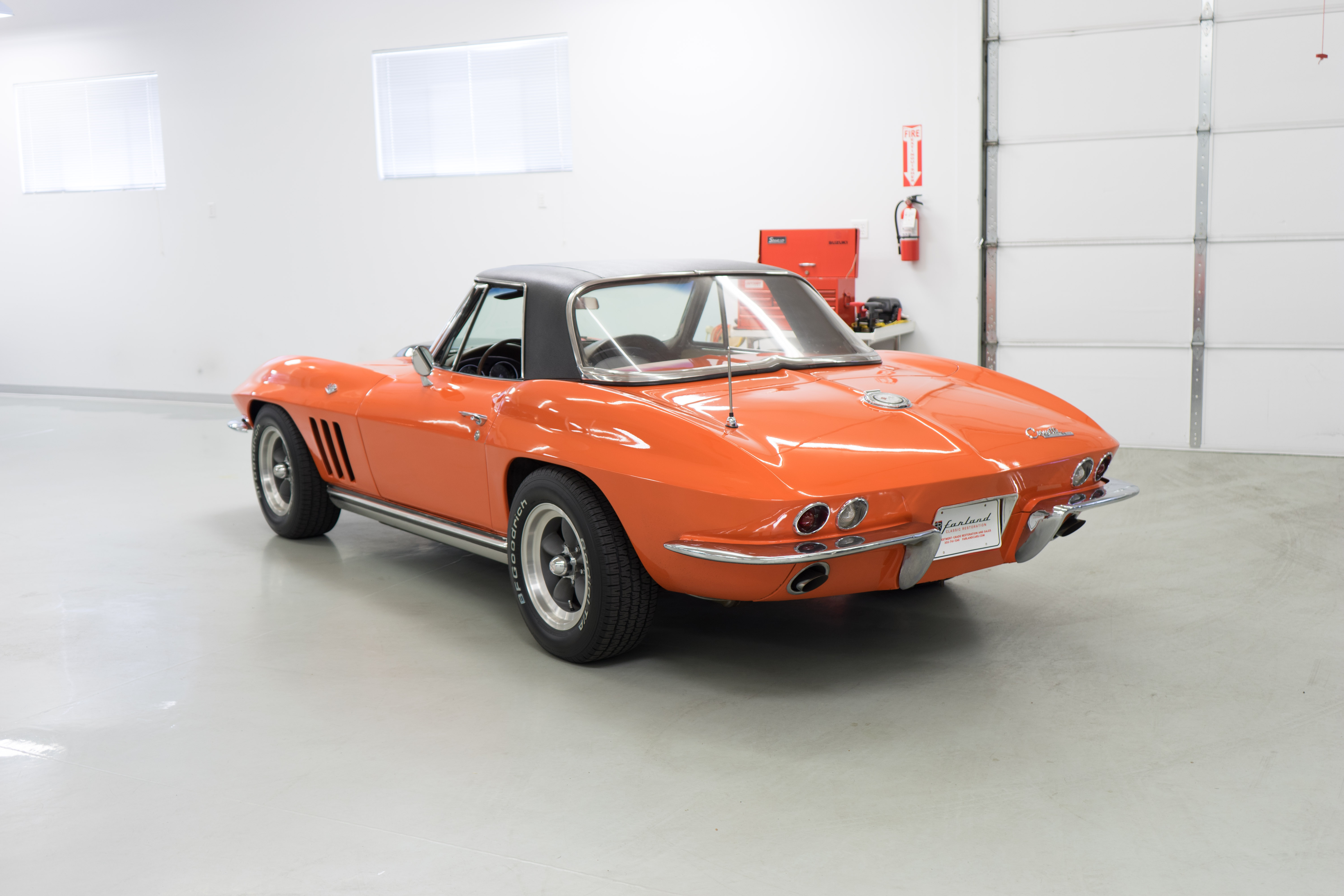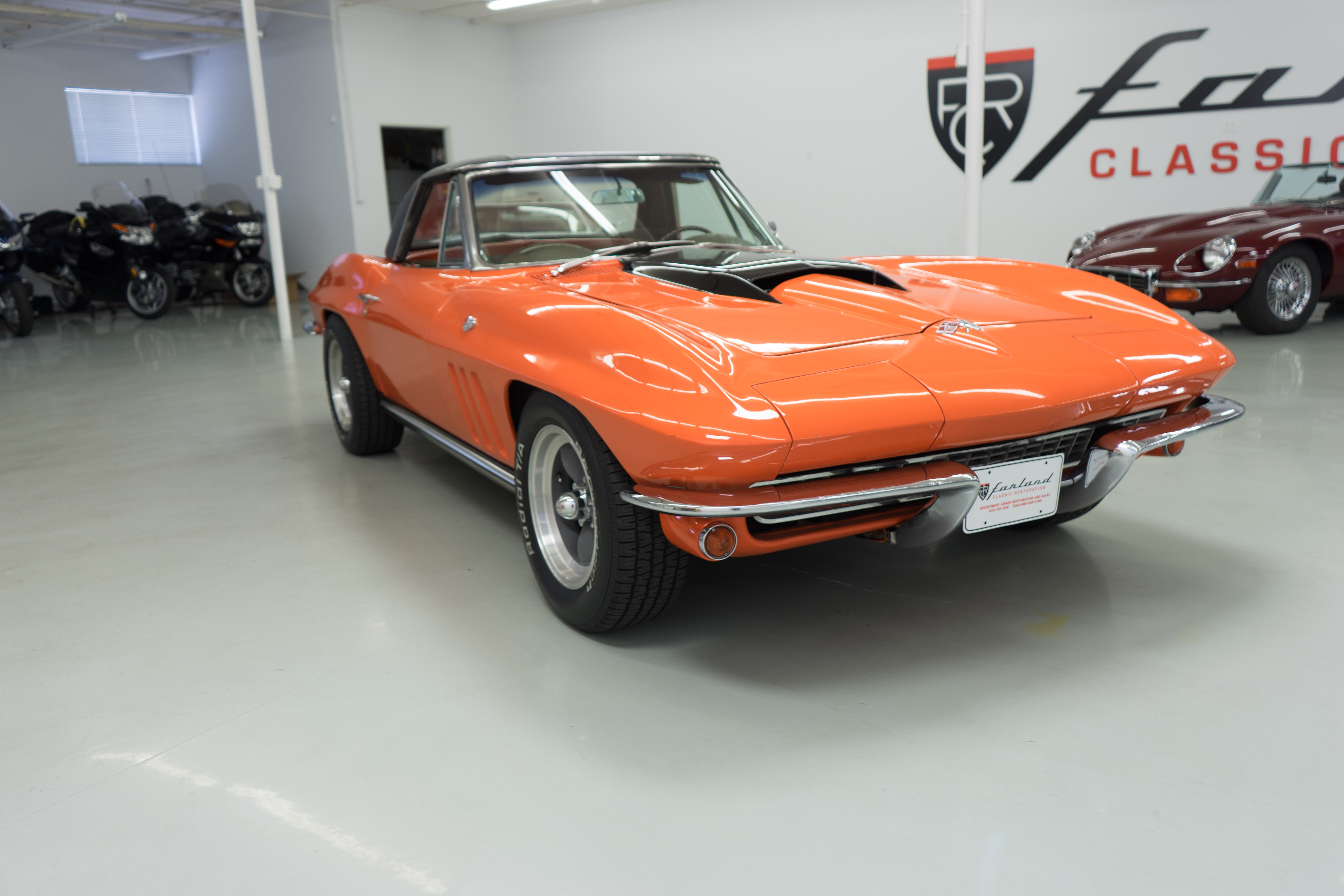 THIS CAR HAS BEEN SOLD – Please call 720-588-8427 or Email info@farlandcars.com to speak to a specialist about other options. Short of the ultra-rare fuel-injected L84, the 365-horsepower L76 327 was the hottest Corvette engine available in 1965 until the 396 arrived. With only ten horsepower less than the fuelie, the L76 was a popular choice, especially when paired with the Muncie 4-speed and positraction. This car had all those features—from new—and is exciting to drive!Over the last 55 years, the car has retained its original factory engine & drivetrain and lived a fairly uneventful life. It grew a stinger hood and a factory hardtop along the way, plus a great period set of American Racing mag wheels. The original Saddle interior is fair and the white convertible top is very serviceable.