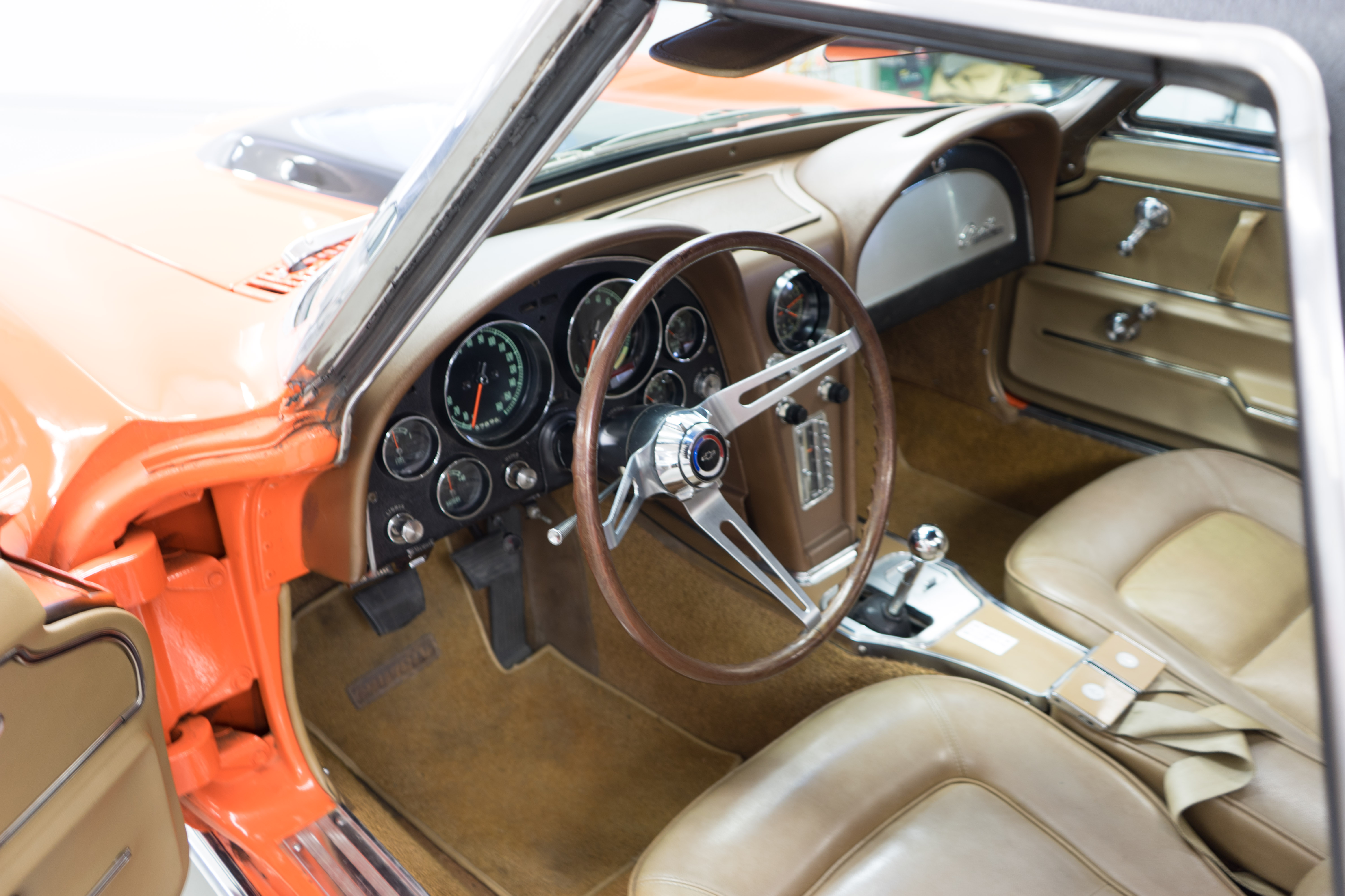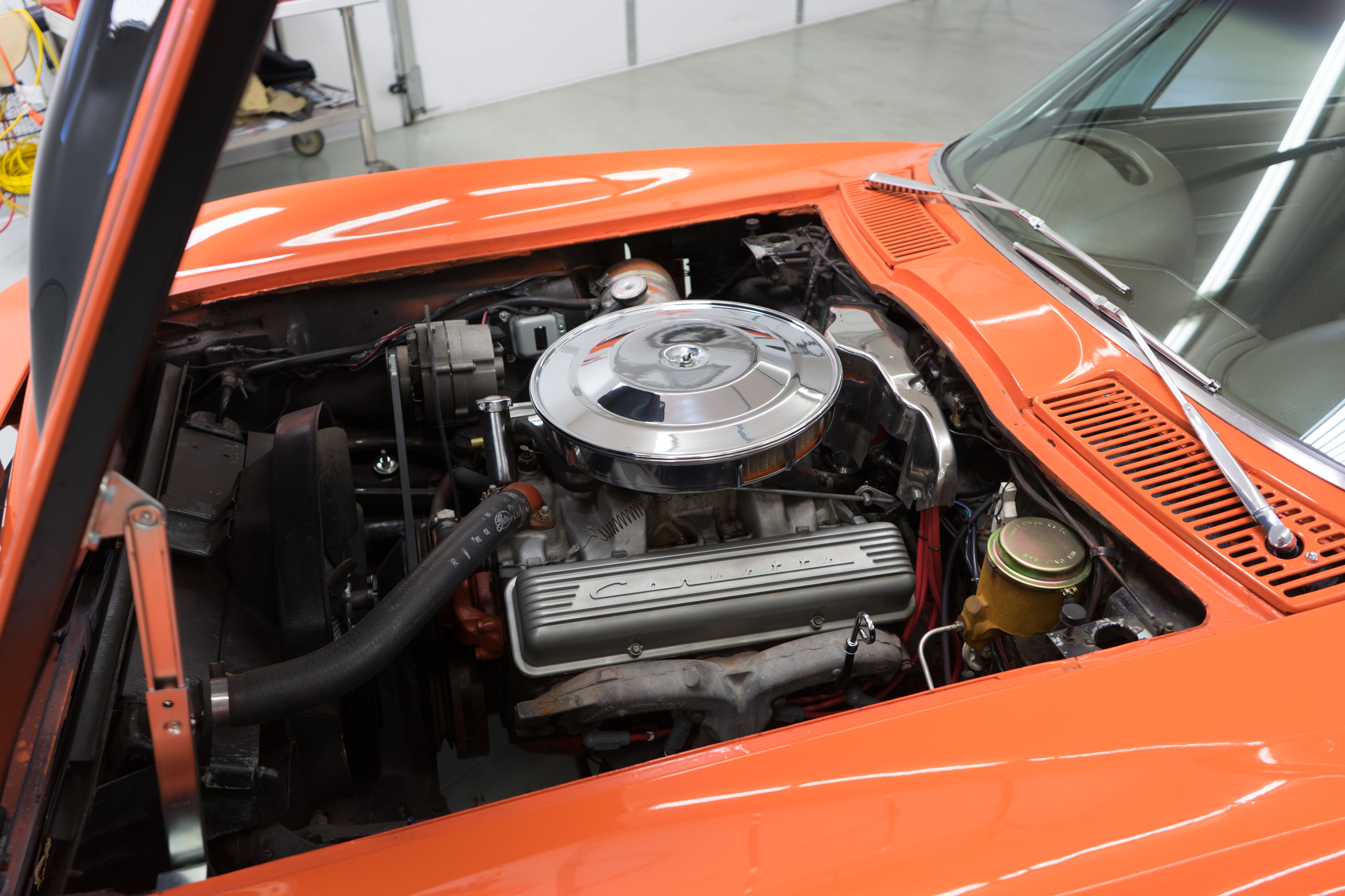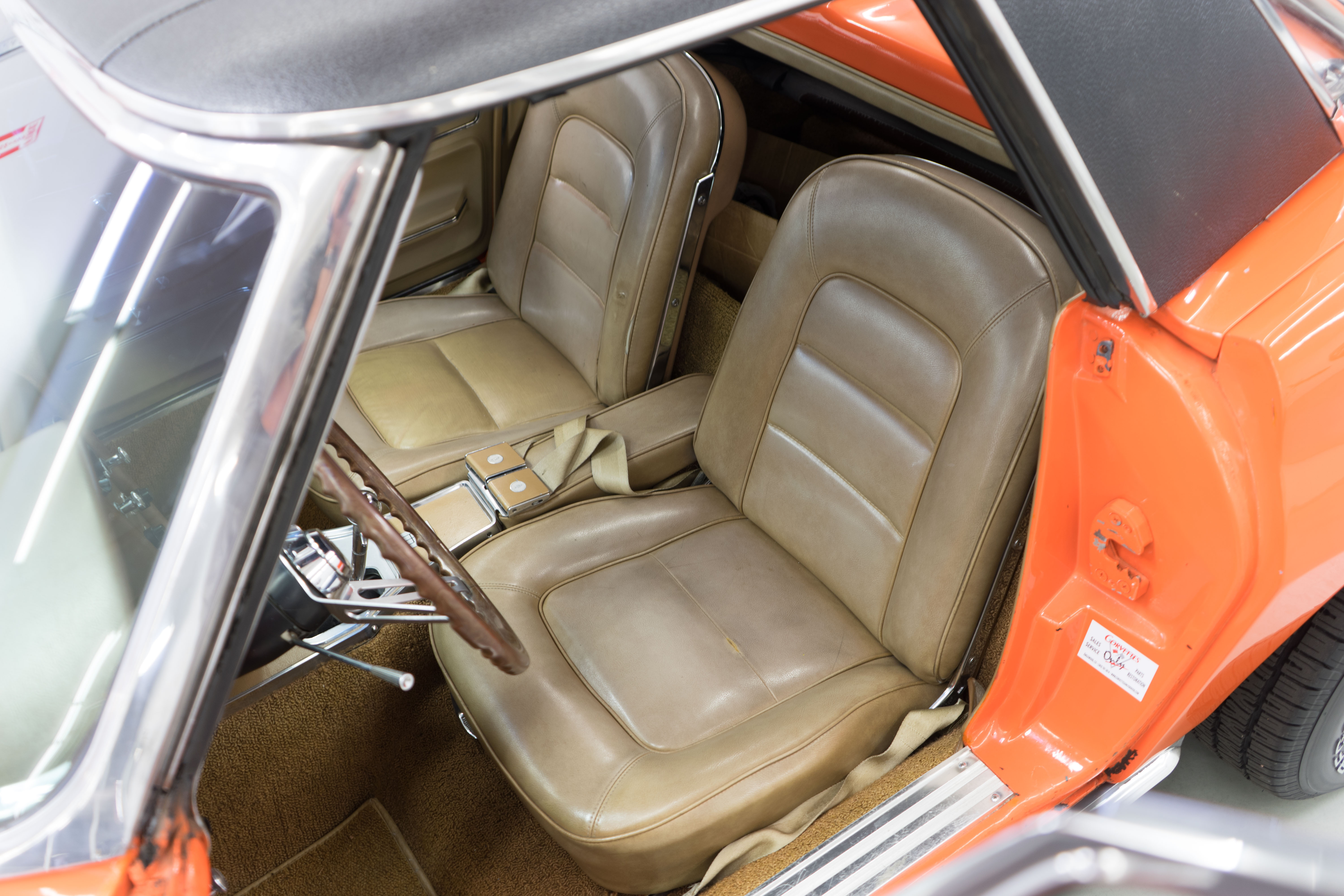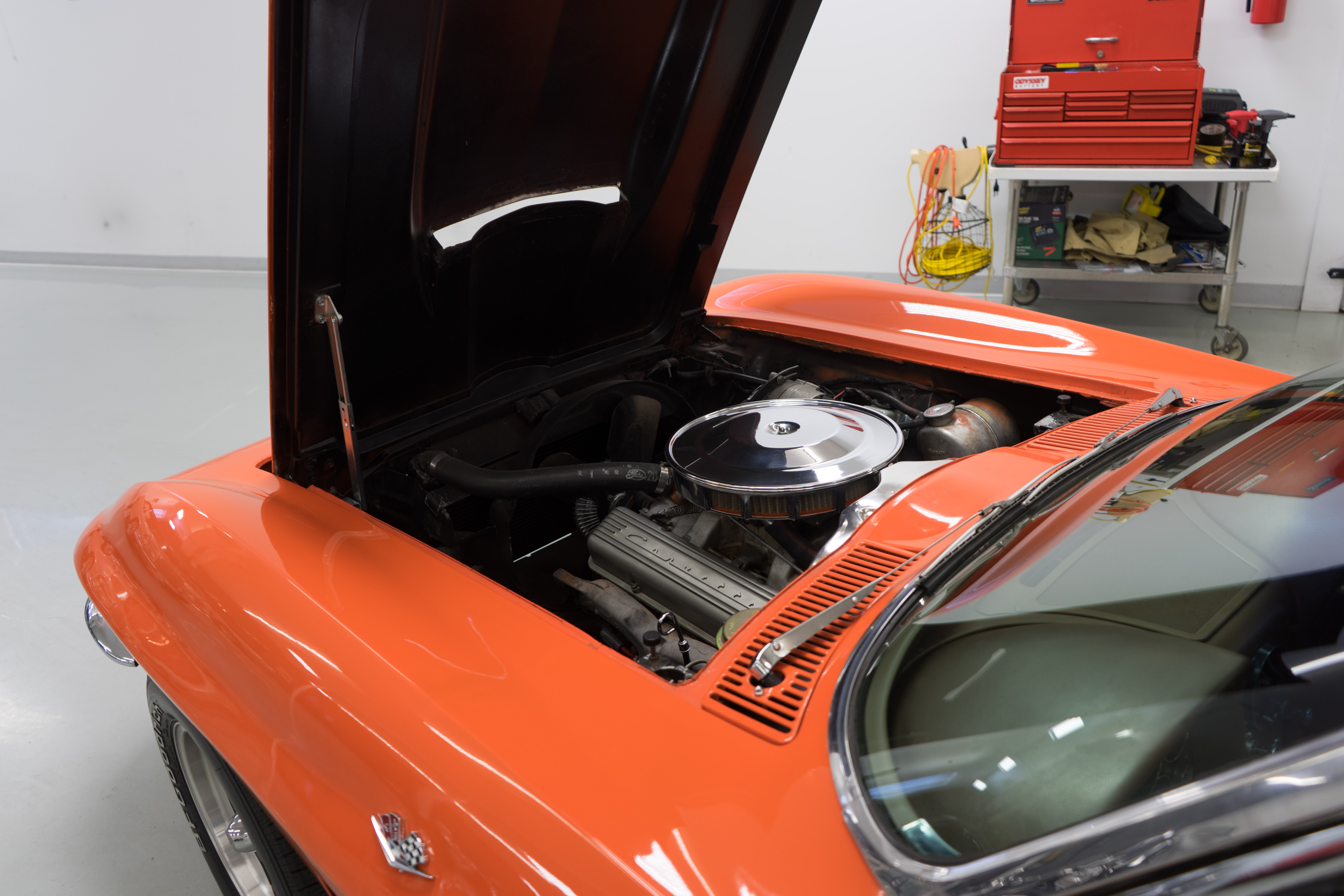 The last paint job was this rather polarizing orange; it still looks reasonably good, but has plenty of minor flaws and begs to go back to the original Glen Green…or Black, or red or whatever you happen to like. Obviously, it’s the car’s biggest weakness, but has been compensated for in the price. Consequently, it presents a great opportunity for someone who is handy and likes to do detailing work to get rid of the overspray here & there by putting sweat equity into this very solid C2.Odds & ends: New radial T/As, heater core, exhaust. Tinted windshield & hardtop window nice & clear, new shocks, factory telescoping column w/teak wheel, original radio, clock works (!) and there’s a big file of receipts & documentation that go with the car showing new clutch & synchros (7K miles ago) and a strong compression test 3K miles ago. A killer ’65 L76 is an $80,000+ car today, so there’s lots of room to grow the car’s value and you can enjoy it as the project proceeds. Very desirable original specs, matching numbers and ‘way under market—that doesn’t happen often!