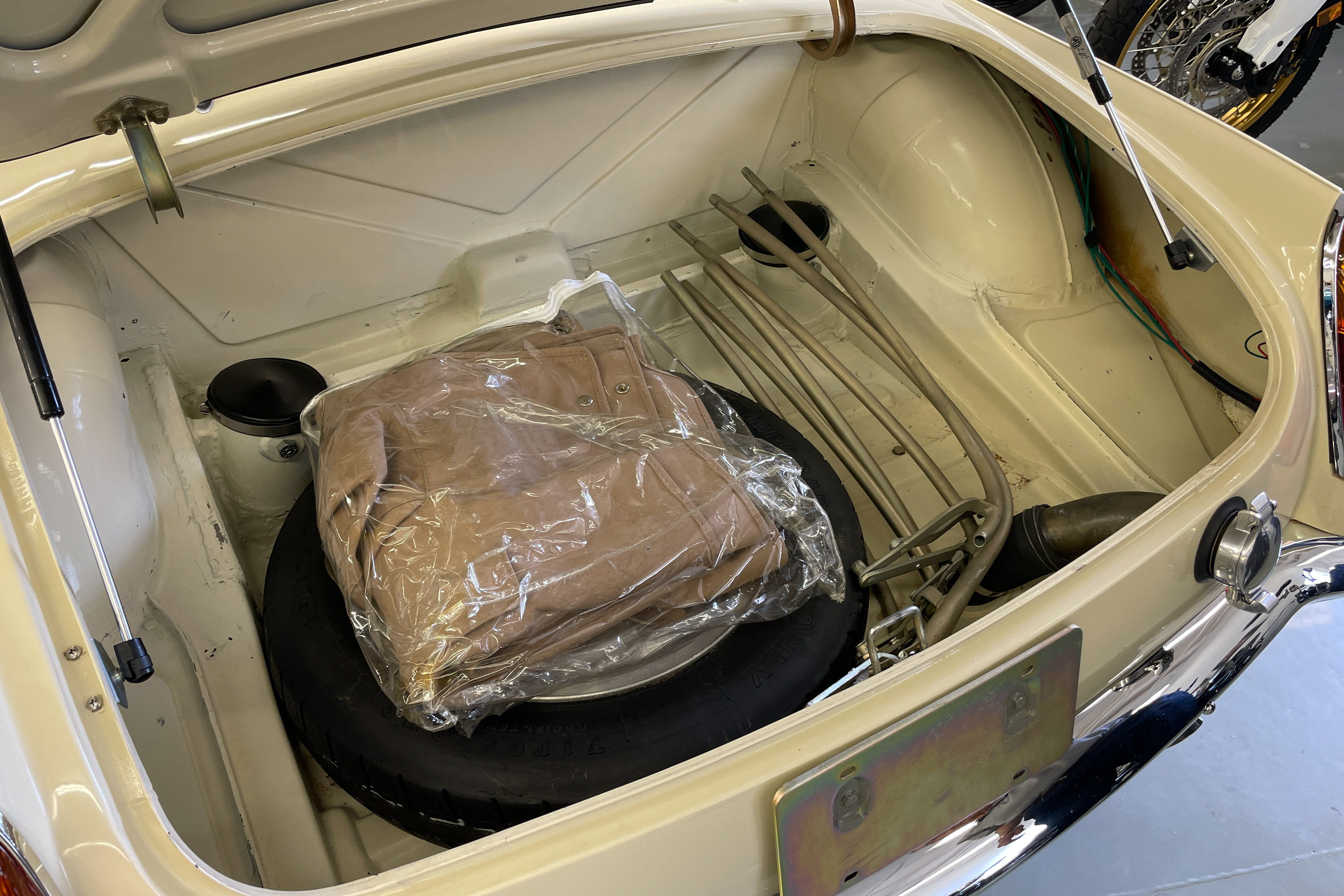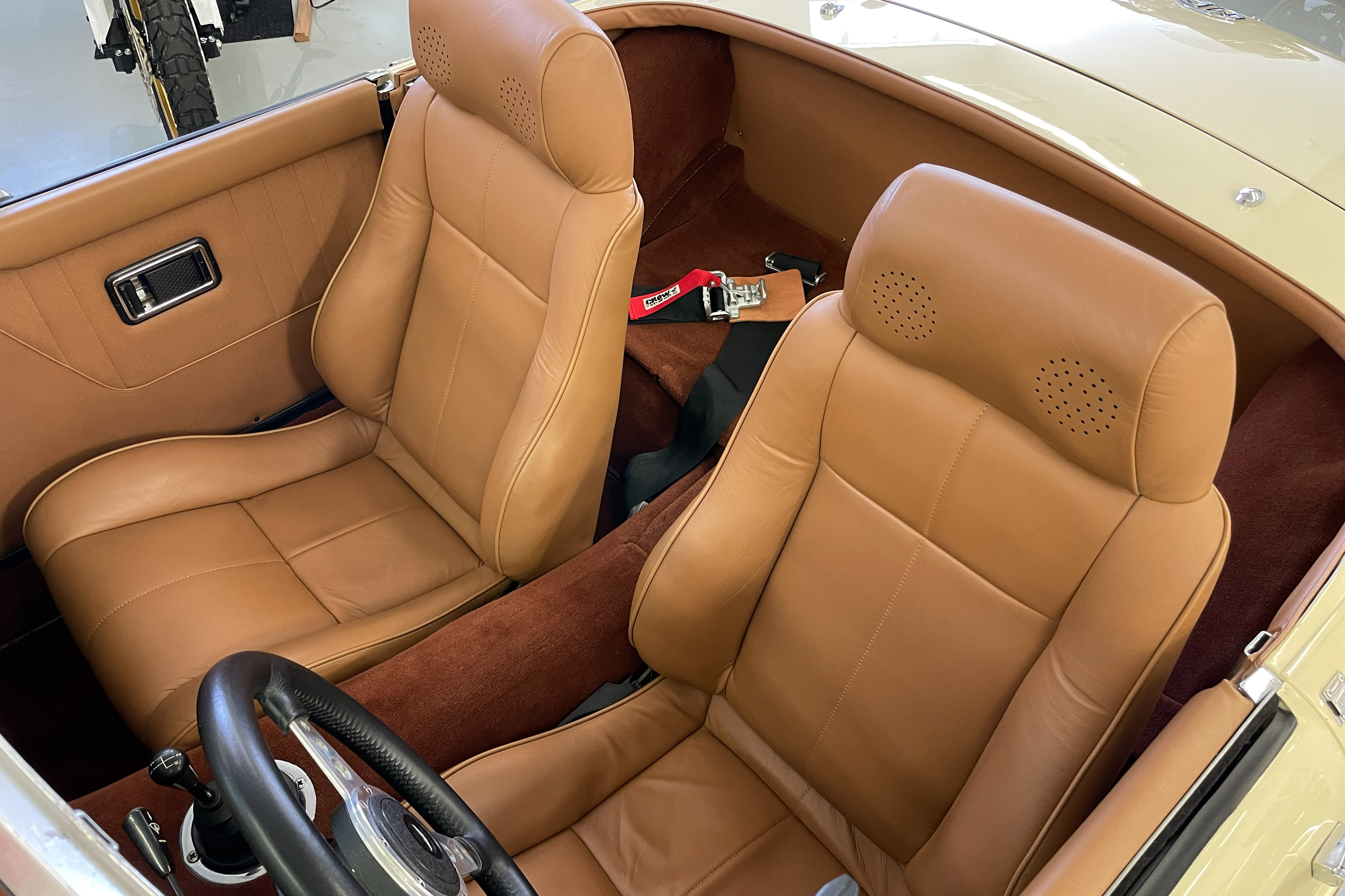 It has high-back (heated!) Leather-covered bucket seats and matching leather was used to trim the rest of the custom interior. Unlike many conversions, the seating comfort, gear lever position and overall feel is conducive to comfortable driving—and it even has a quality convertible top plus a nice fiberglass hardtop comes with it!