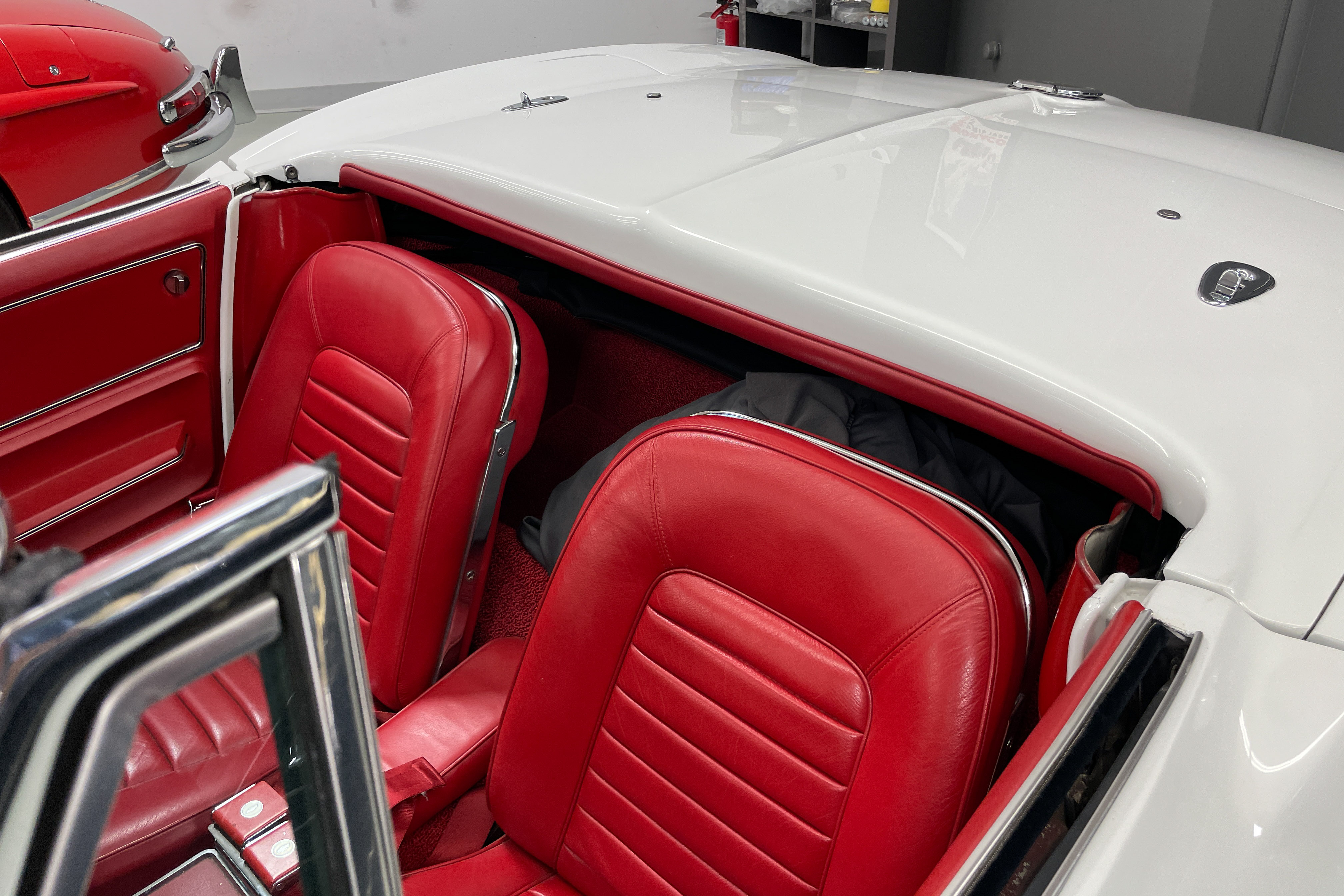 The car was sold new in Texas, migrated to California decades ago and stayed in SoCal until coming to us in Colorado in 2020. Consequently, the frame has no corrosion or rust issues and the fiberglass is smooth and clean under a recent repaint in the original color. The interior was red vinyl originally, but was retrimmed in red leather during a recent refurbishment when a new black soft top was installed.