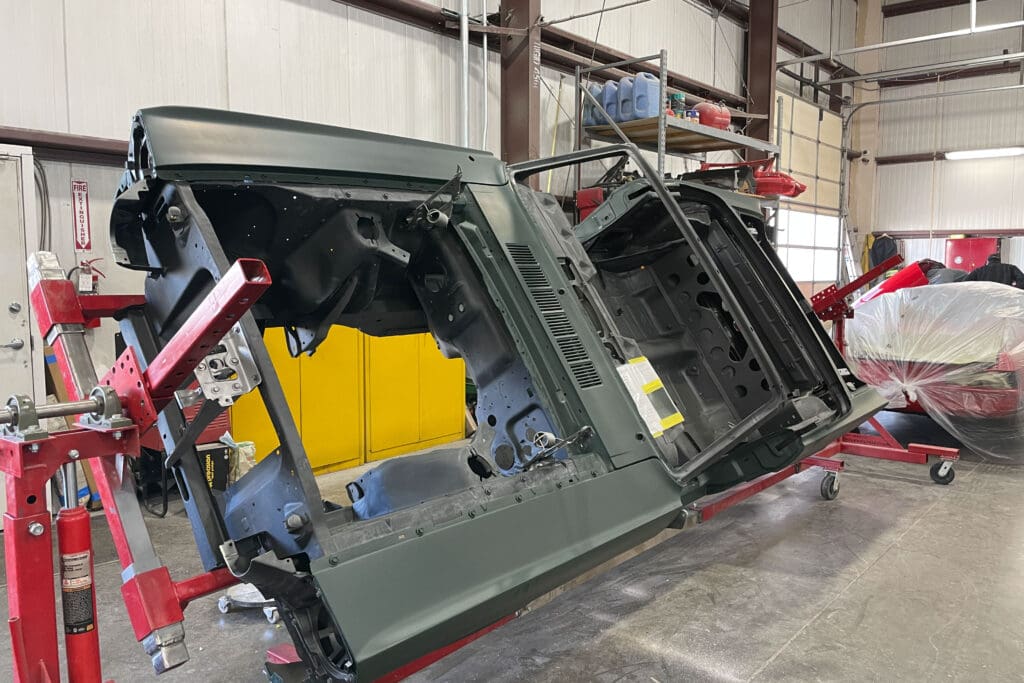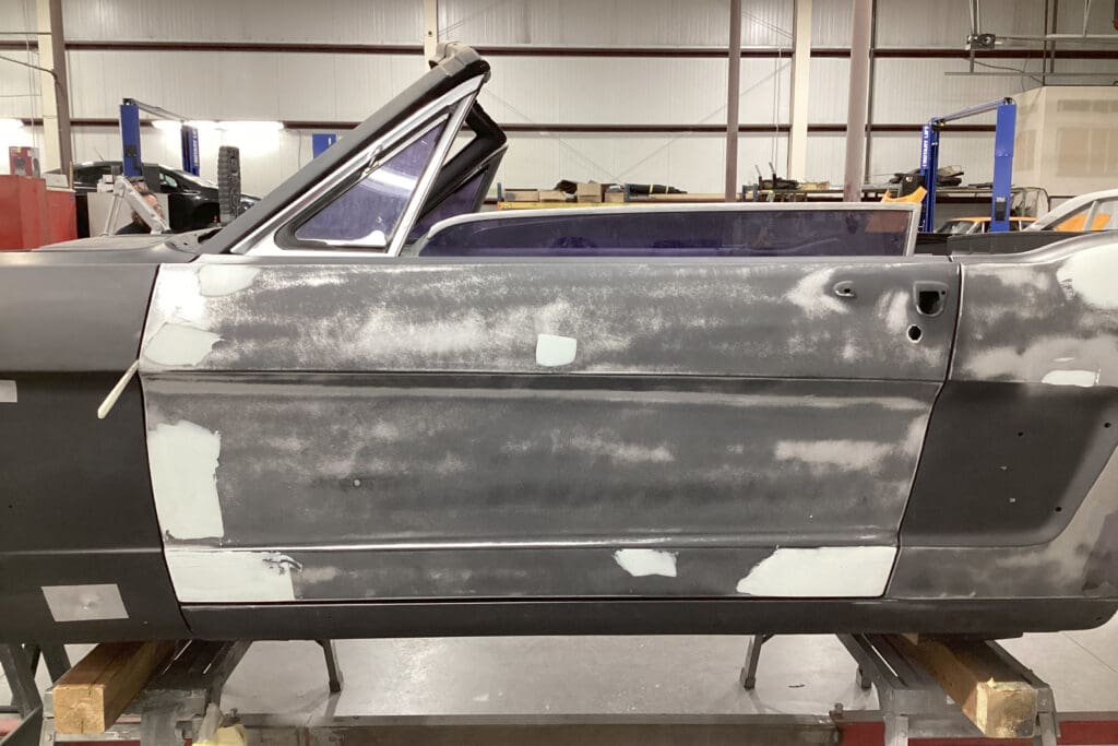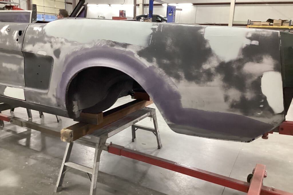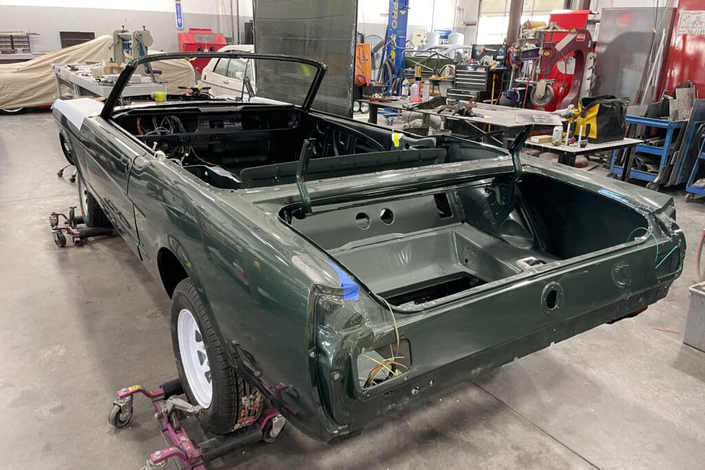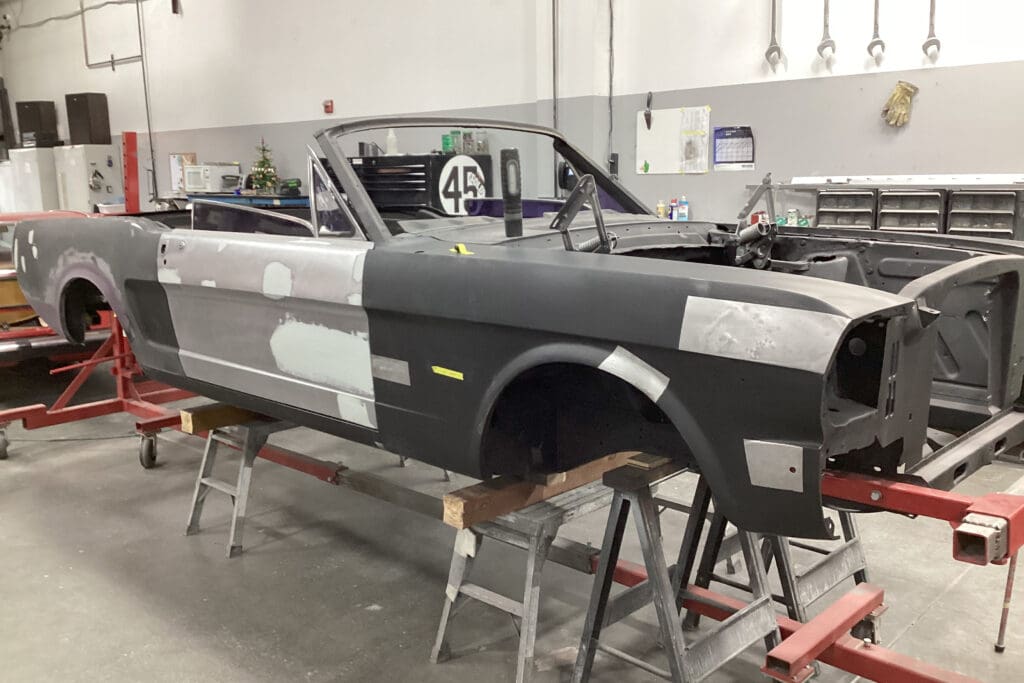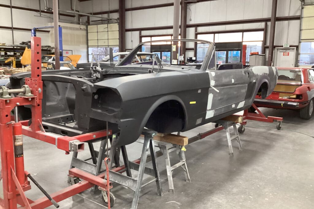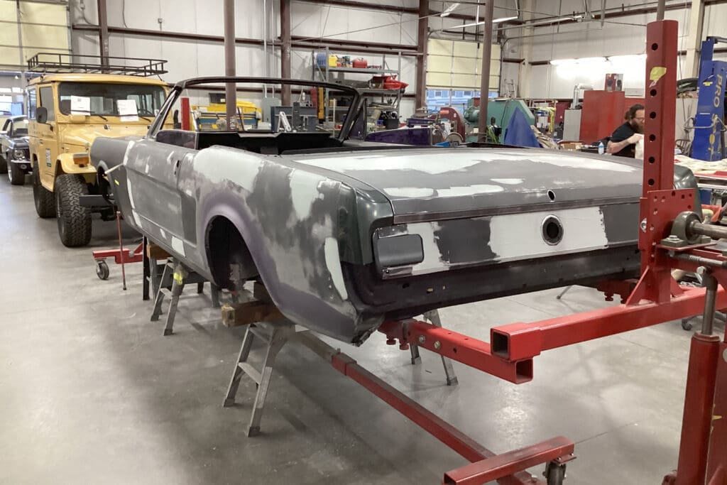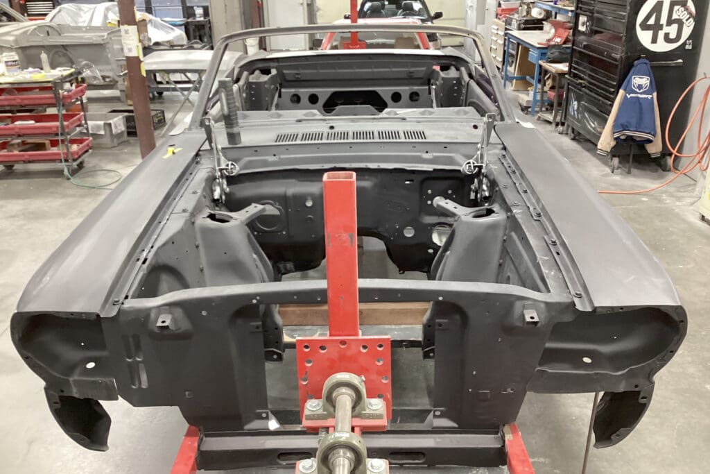 The device that you see the Mustang on in early stages is called a rotisserie. Just like a roasting chicken, this classic Mustang restoration takes place on a spinning axis. That makes it much easier to access and work on all parts. It’s also why these are called ‘rotisserie’ restorations.