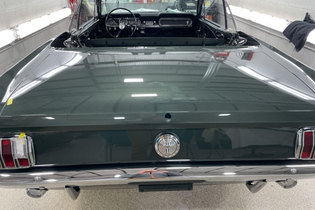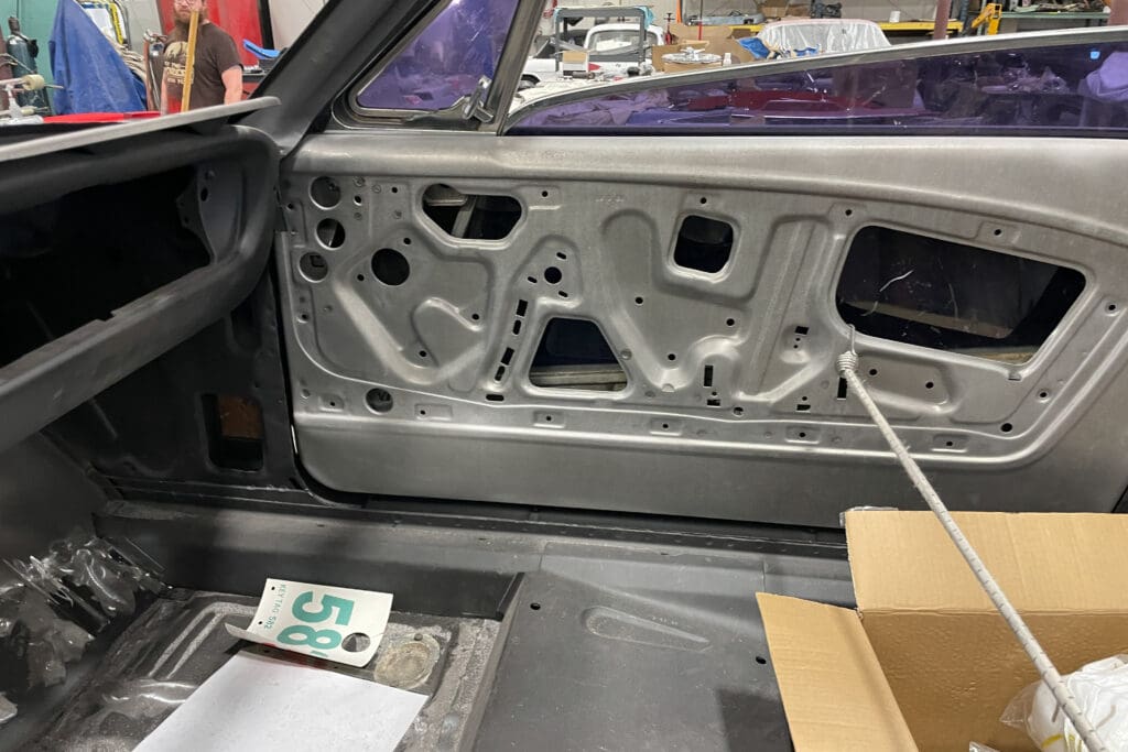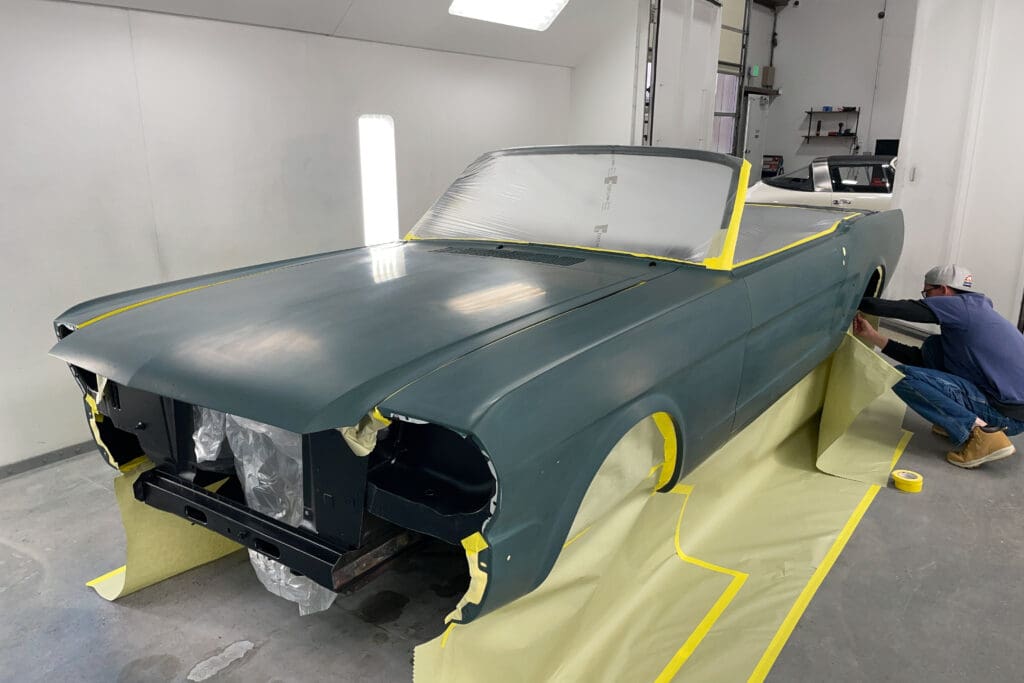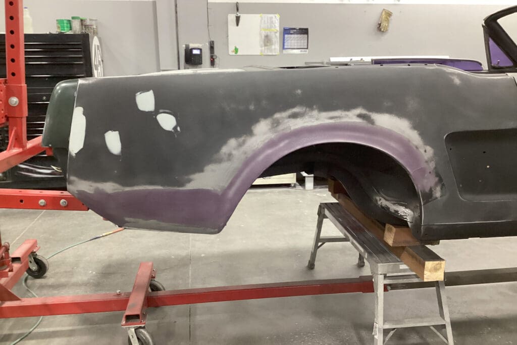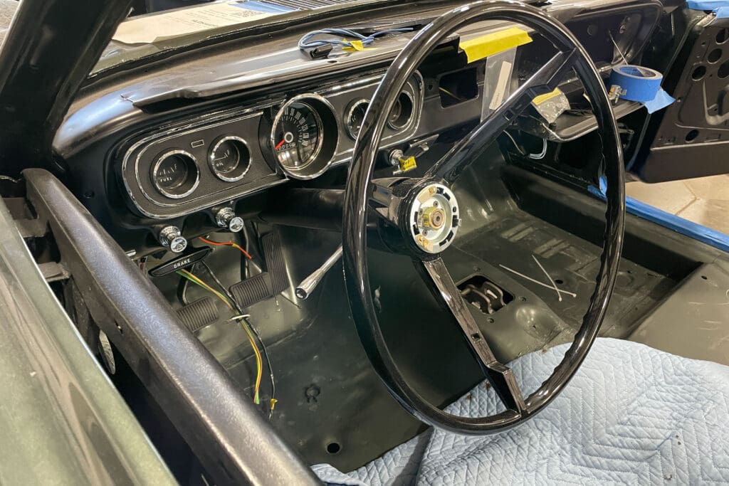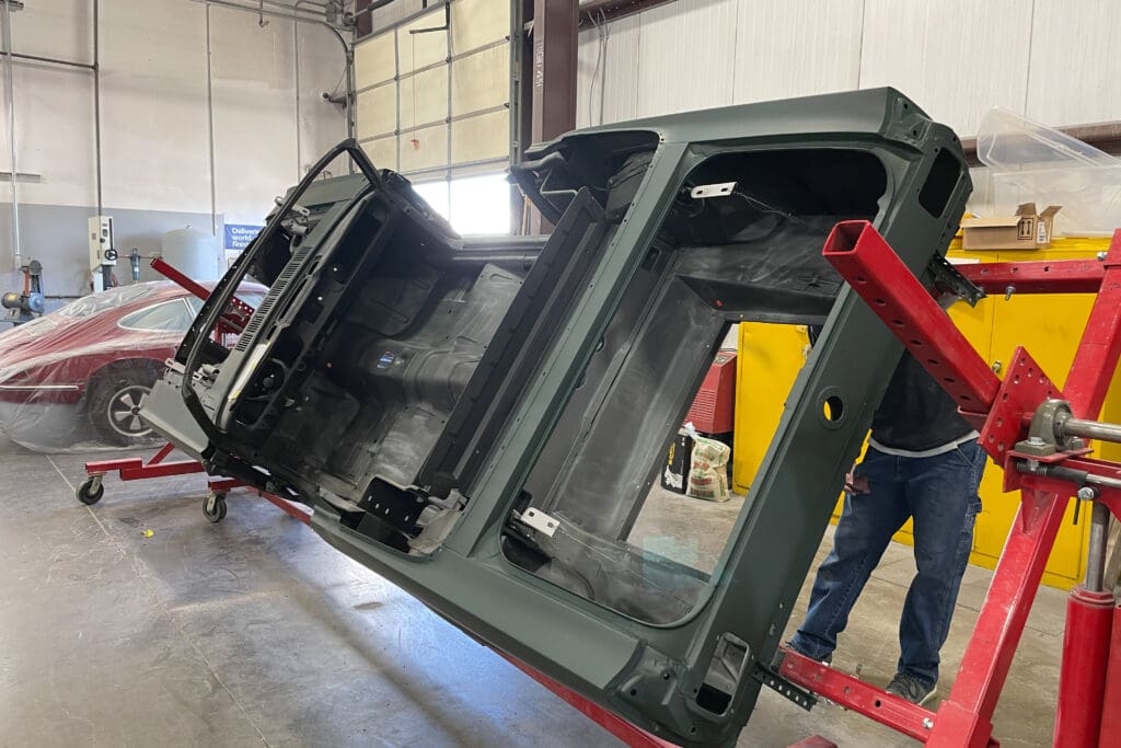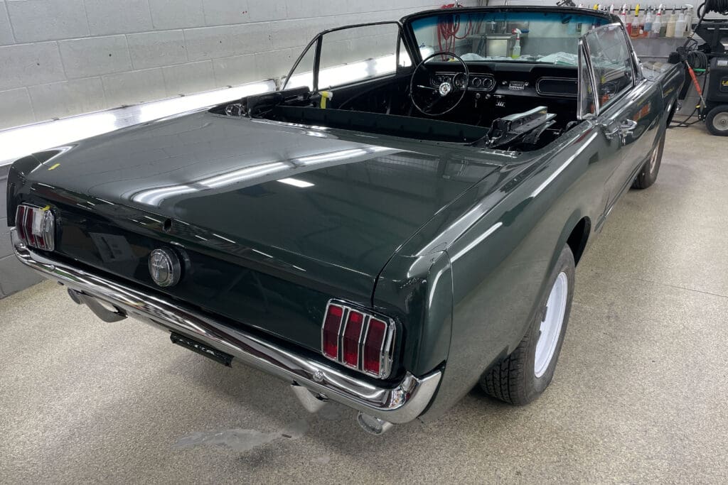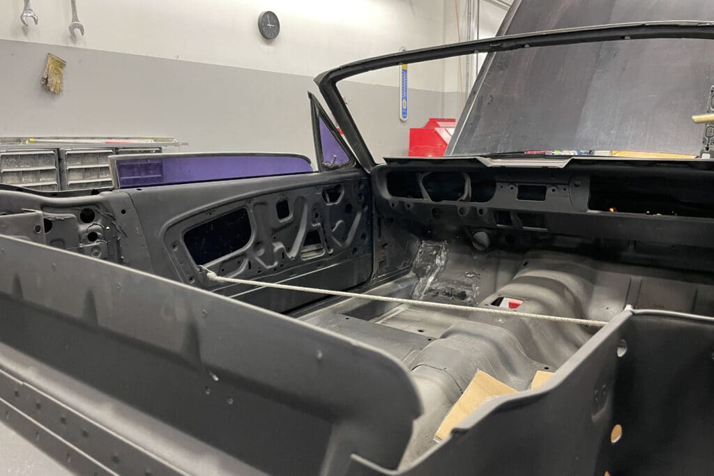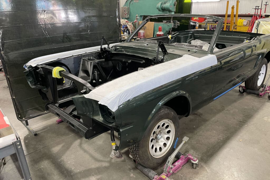 The device that you see the Mustang on in early stages is called a rotisserie. Just like a roasting chicken, this classic Mustang restoration takes place on a spinning axis. That makes it much easier to access and work on all parts. It’s also why these are called ‘rotisserie’ restorations.