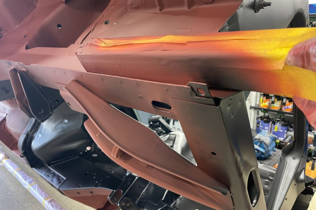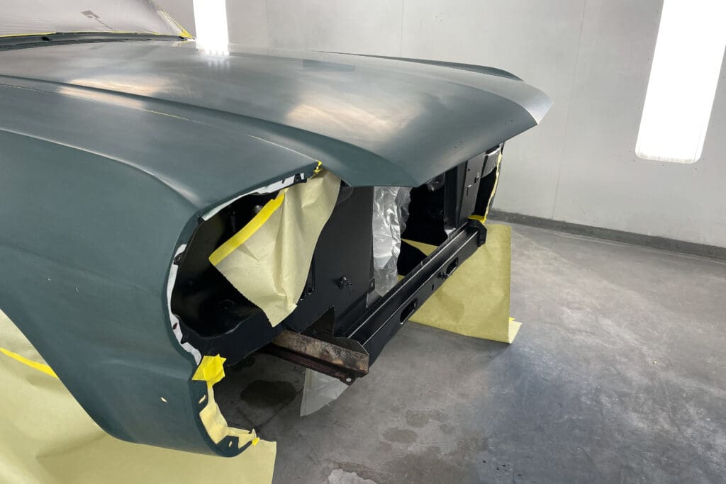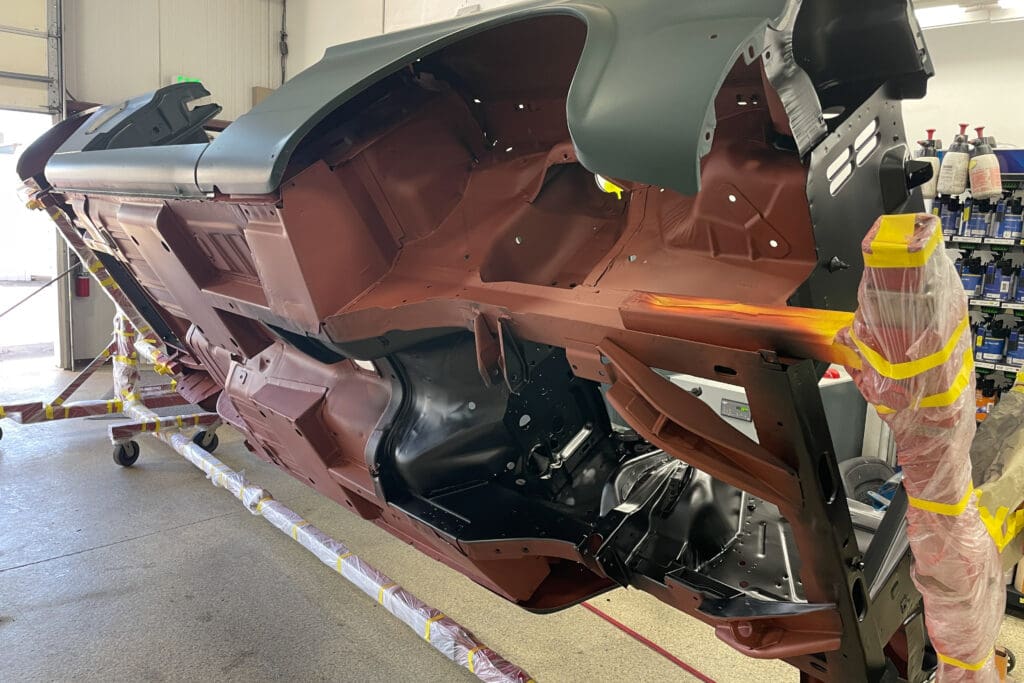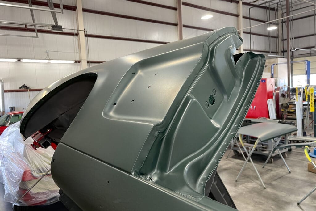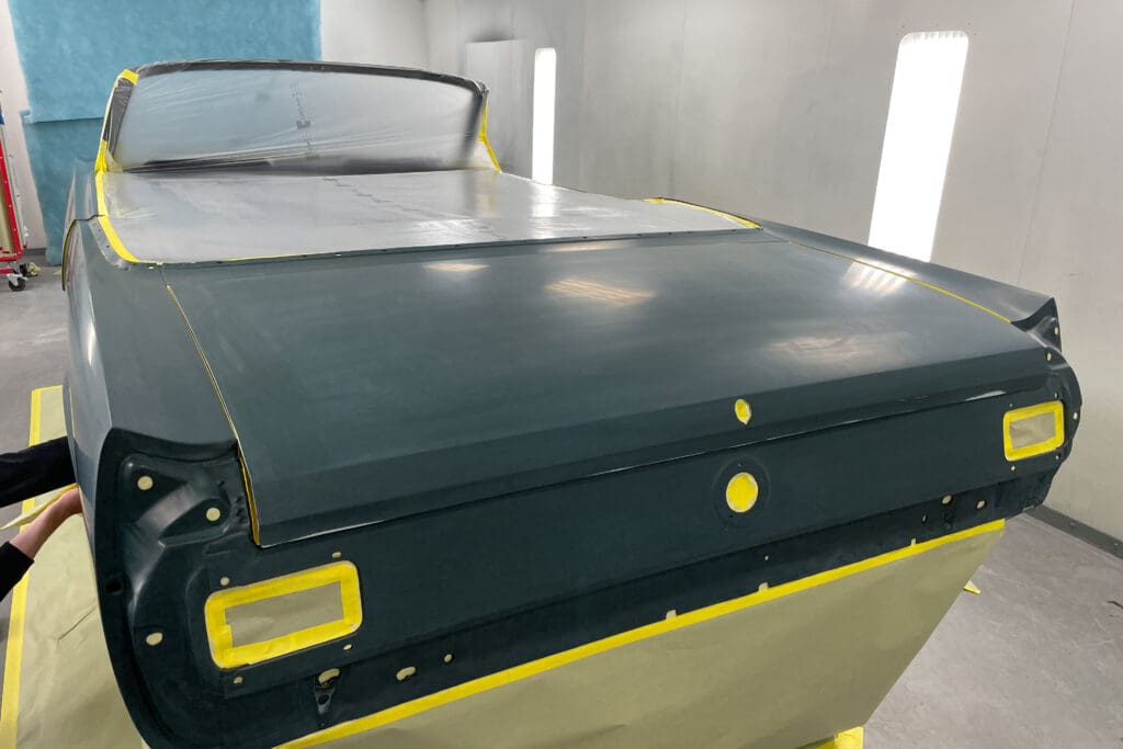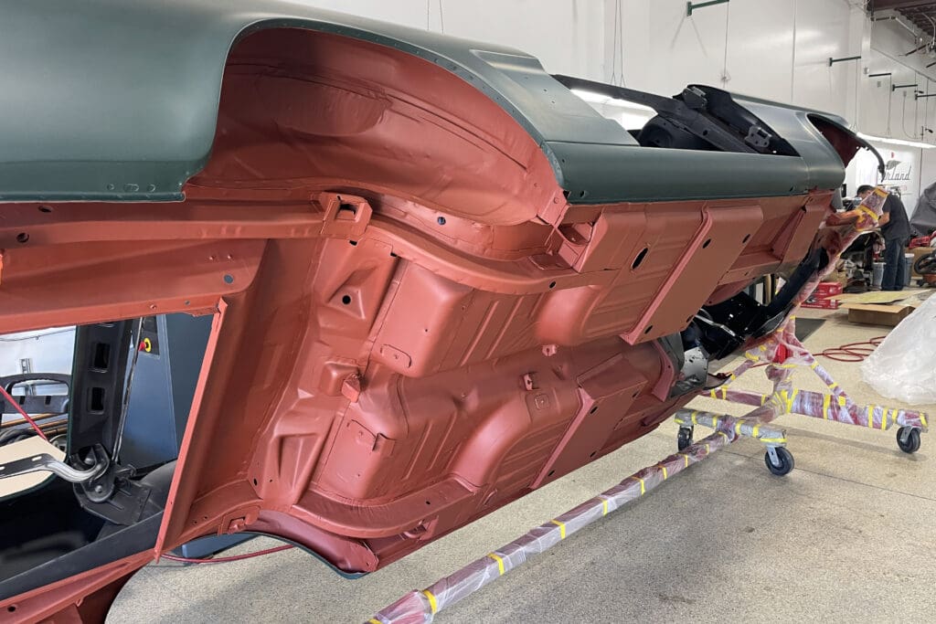 Next was media blasting down to bare metal. Our metal experts repaired, replaced and crafted the body so it could receive a first coat of color matching primer. We then sprayed the bottom in factory-correct red oxide – even adding some overspray. Finally, we shot the final color of the car. Next was hours and hours of polishing.