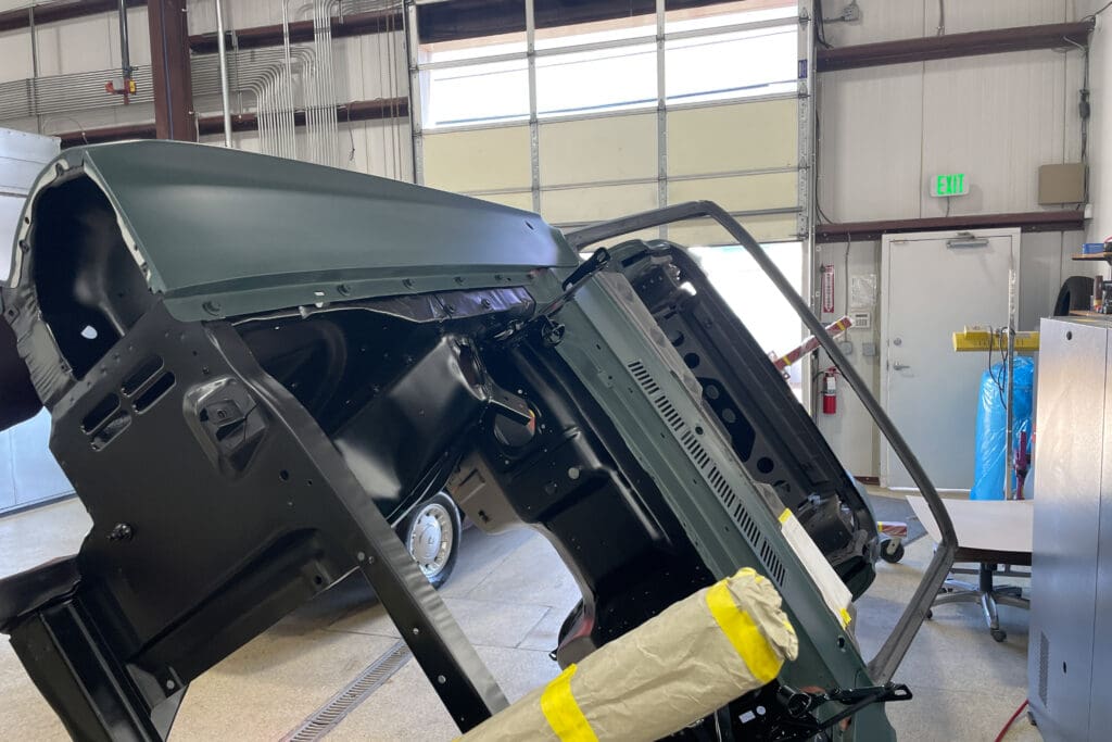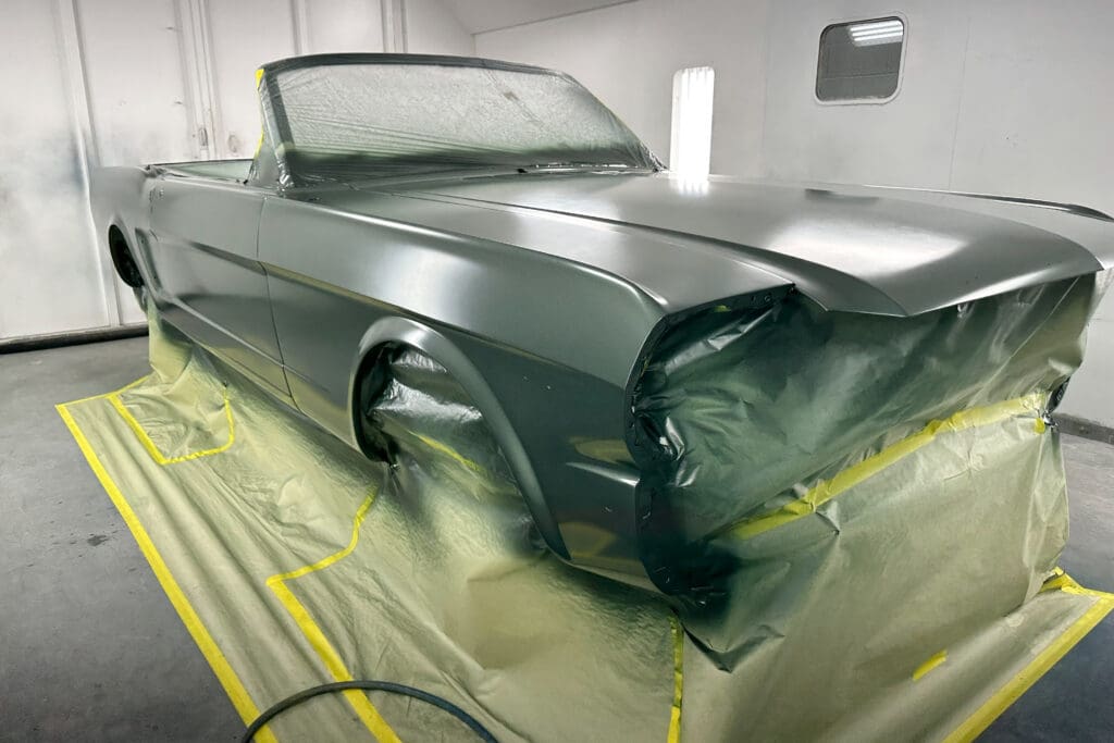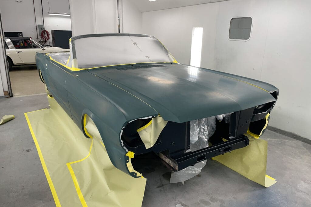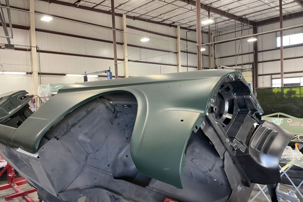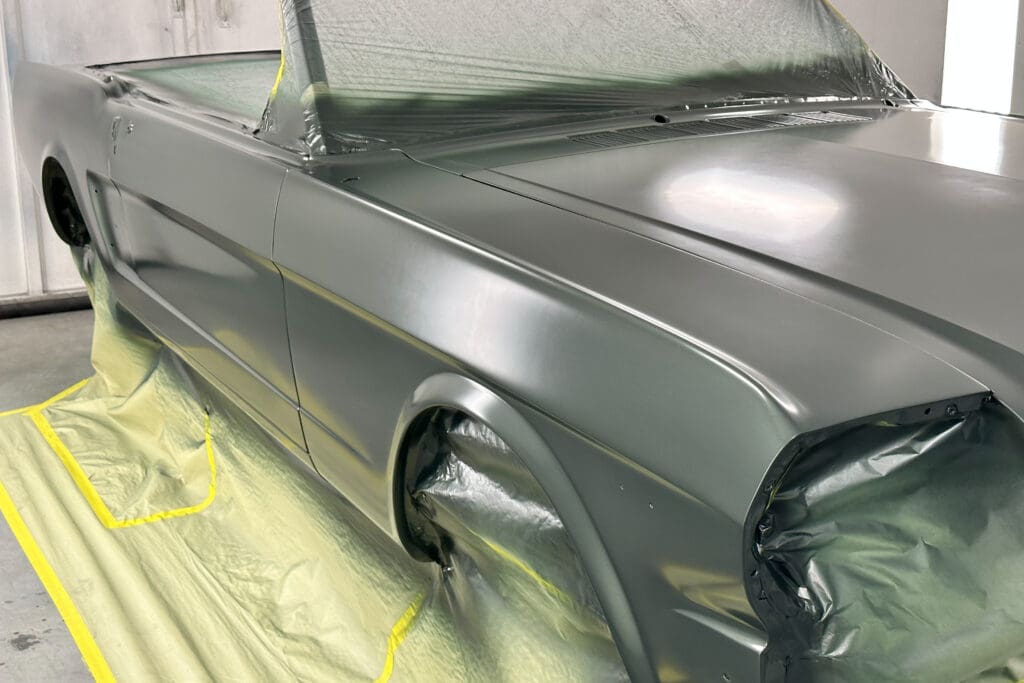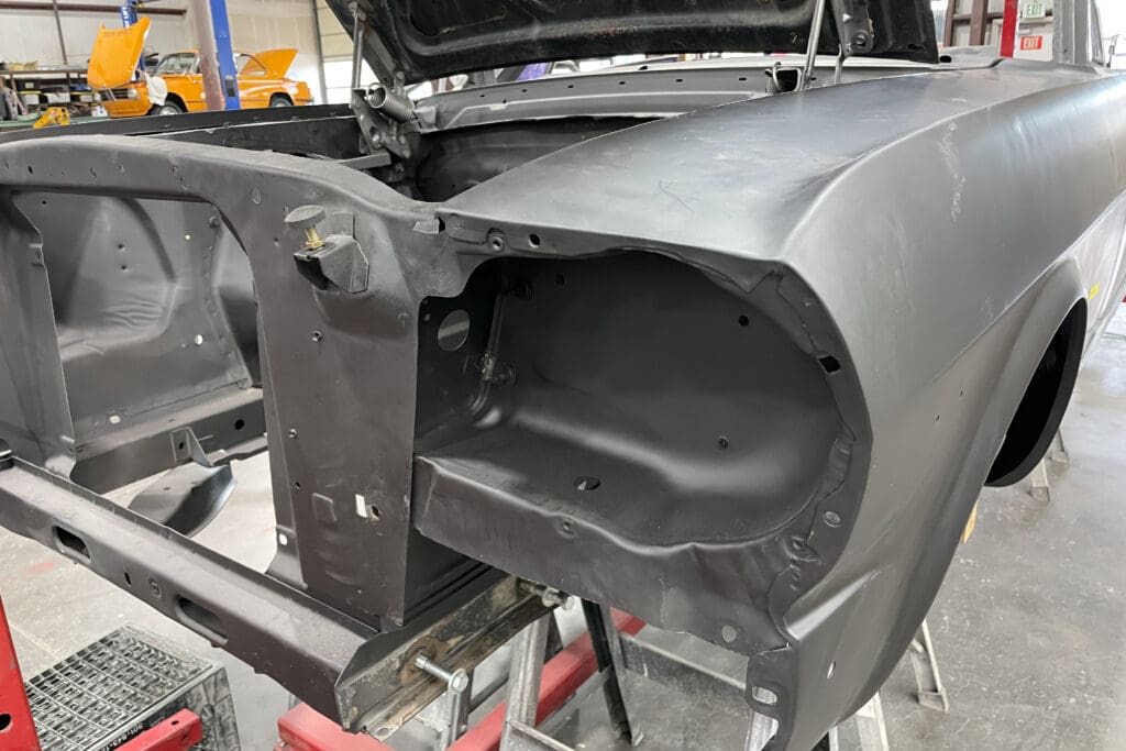 Next was media blasting down to bare metal. Our metal experts repaired, replaced and crafted the body so it could receive a first coat of color matching primer. We then sprayed the bottom in factory-correct red oxide – even adding some overspray. Finally, we shot the final color of the car. Next was hours and hours of polishing.