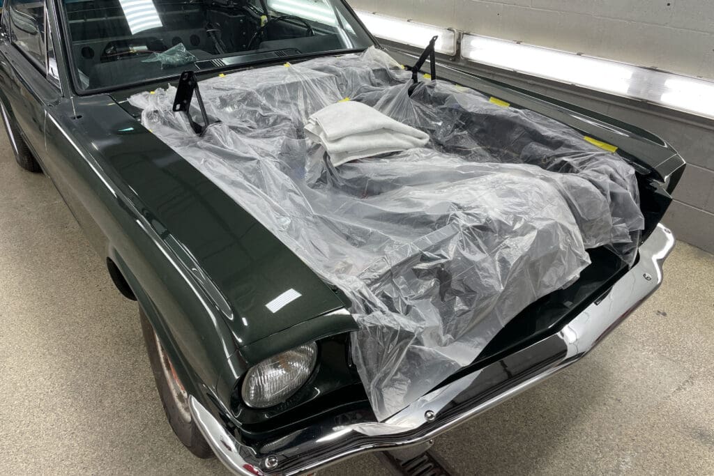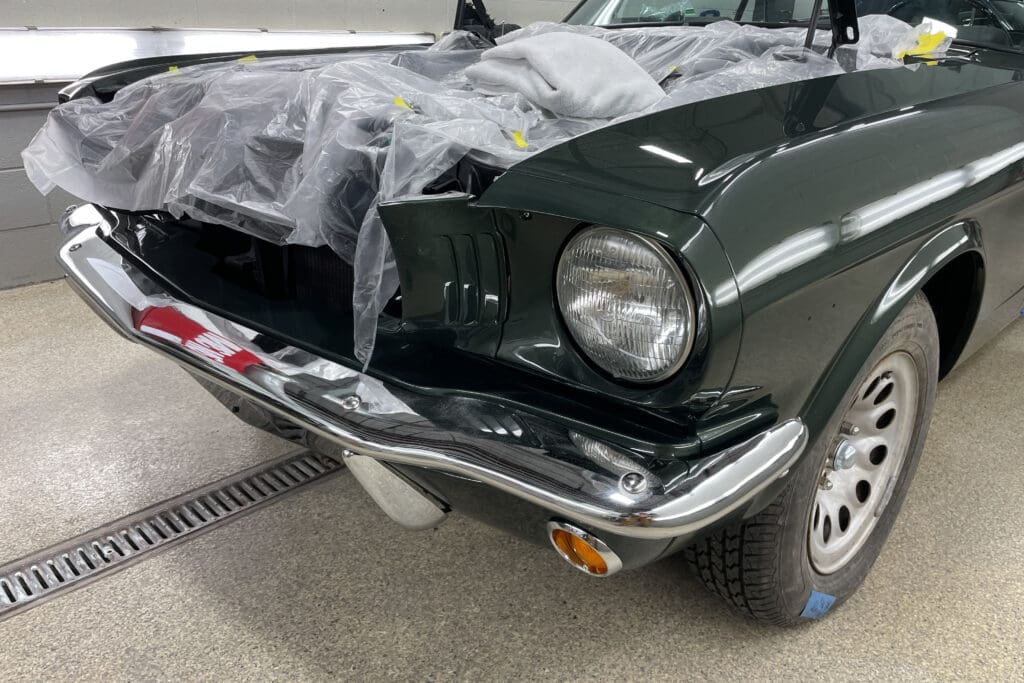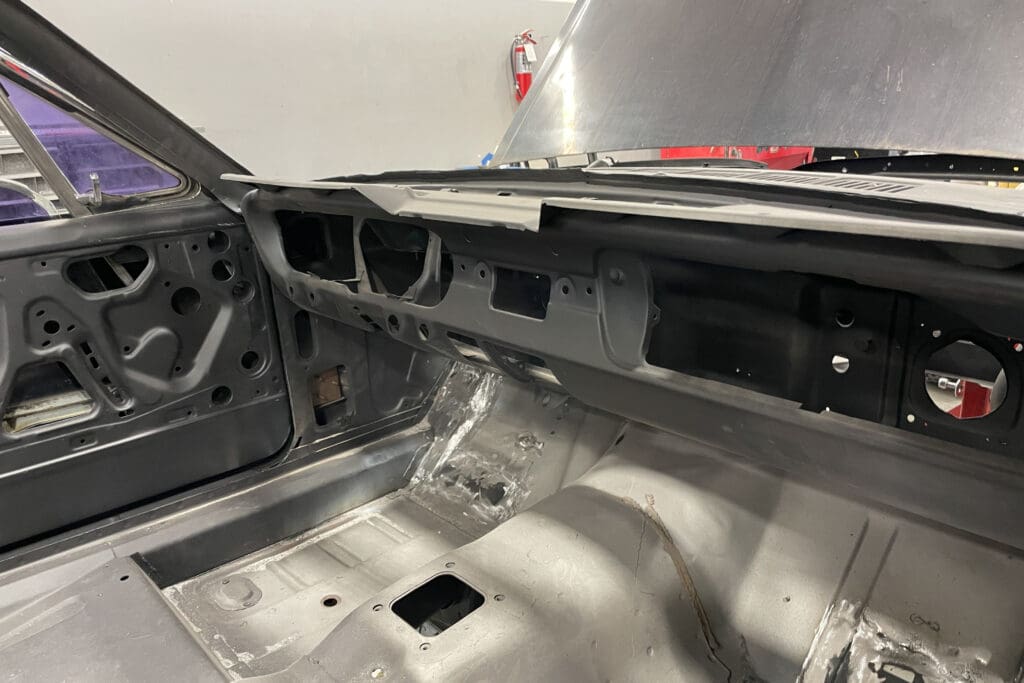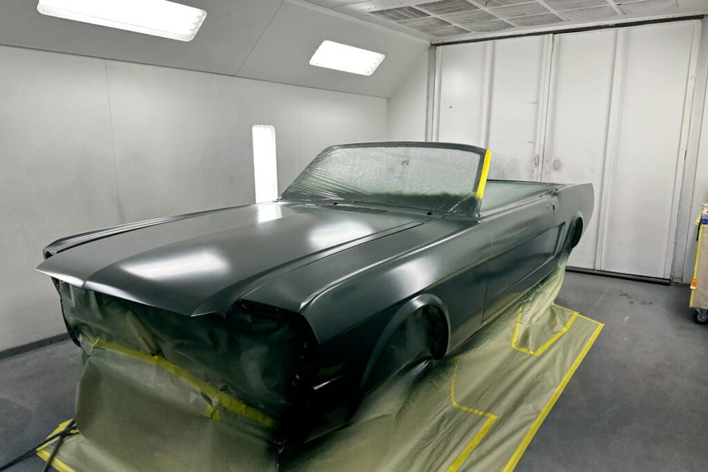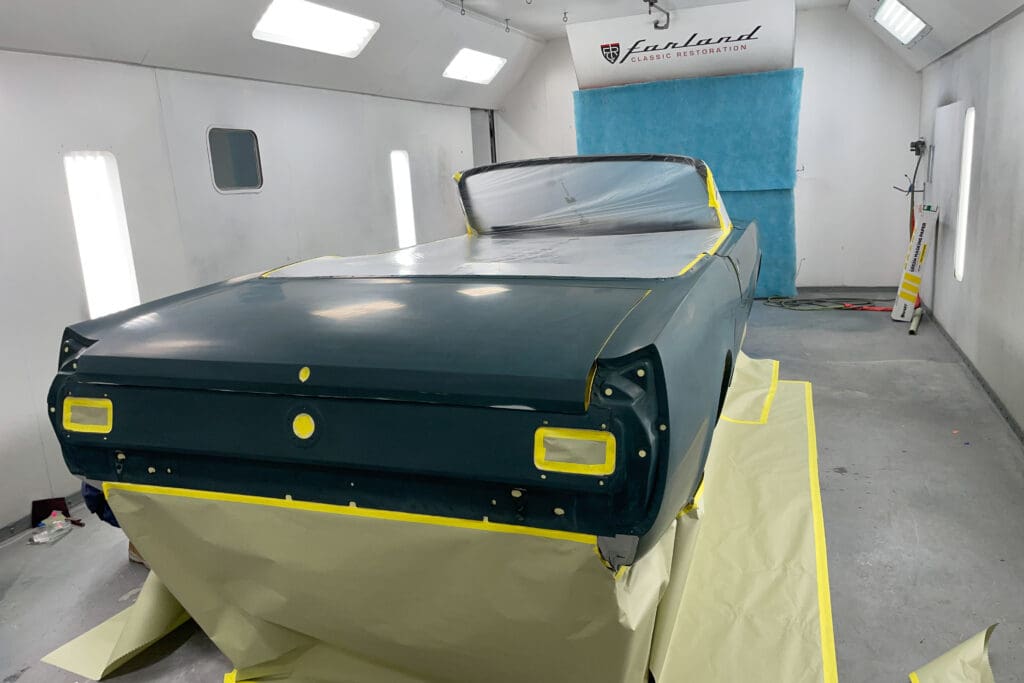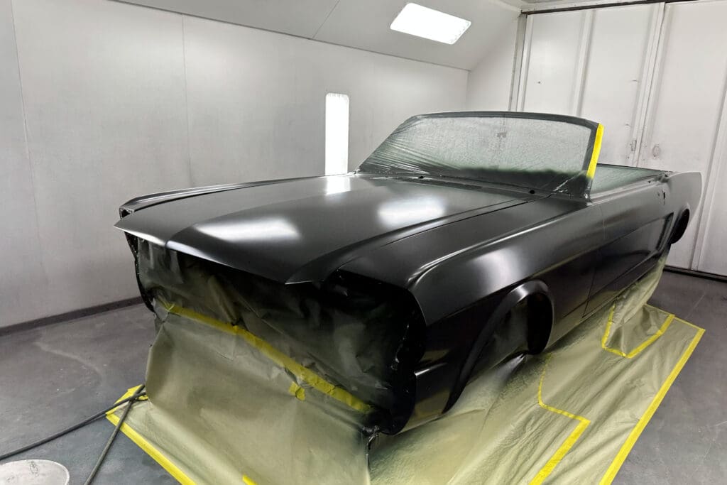 Next was media blasting down to bare metal. Our metal experts repaired, replaced and crafted the body so it could receive a first coat of color matching primer. We then sprayed the bottom in factory-correct red oxide – even adding some overspray. Finally, we shot the final color of the car. Next was hours and hours of polishing.