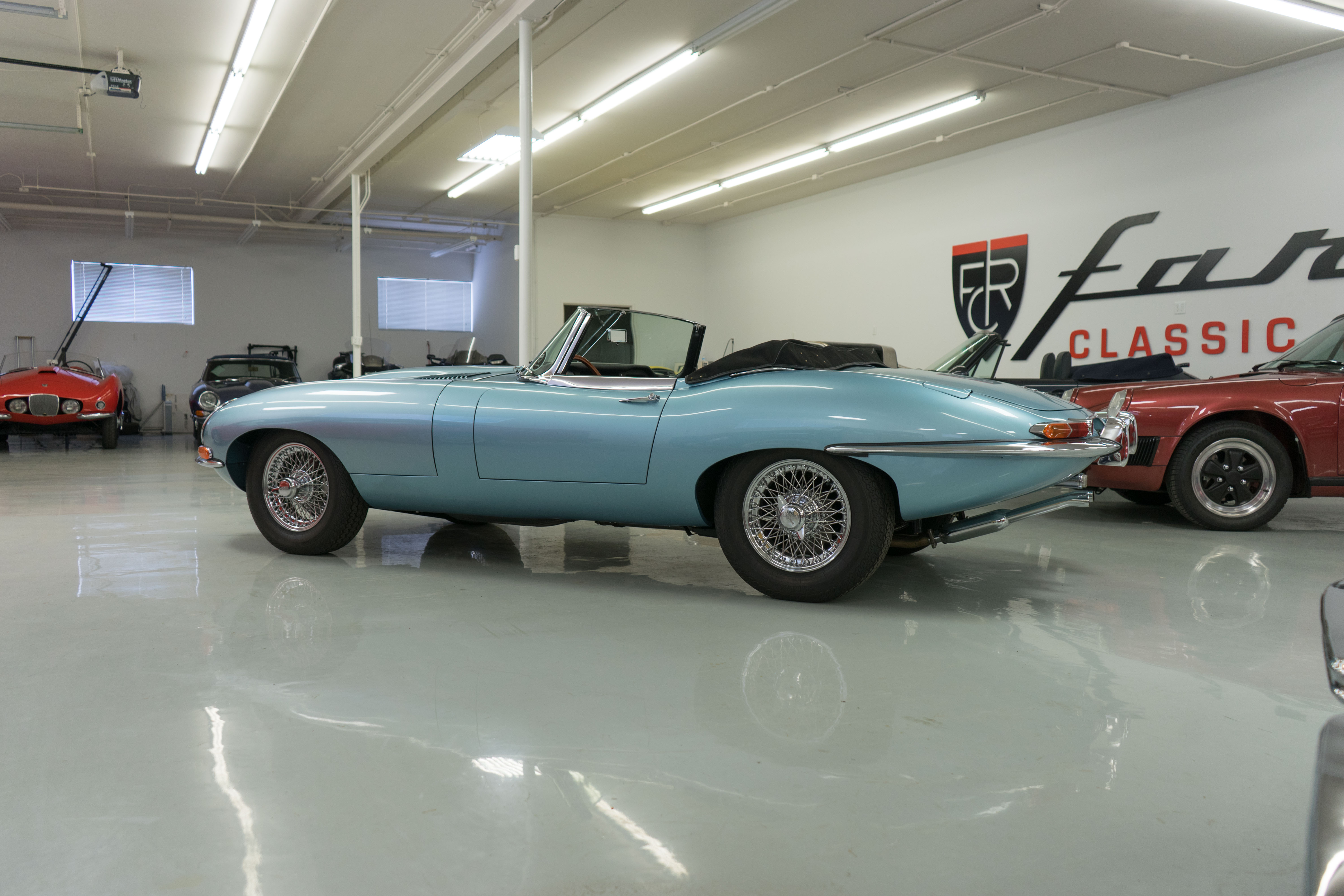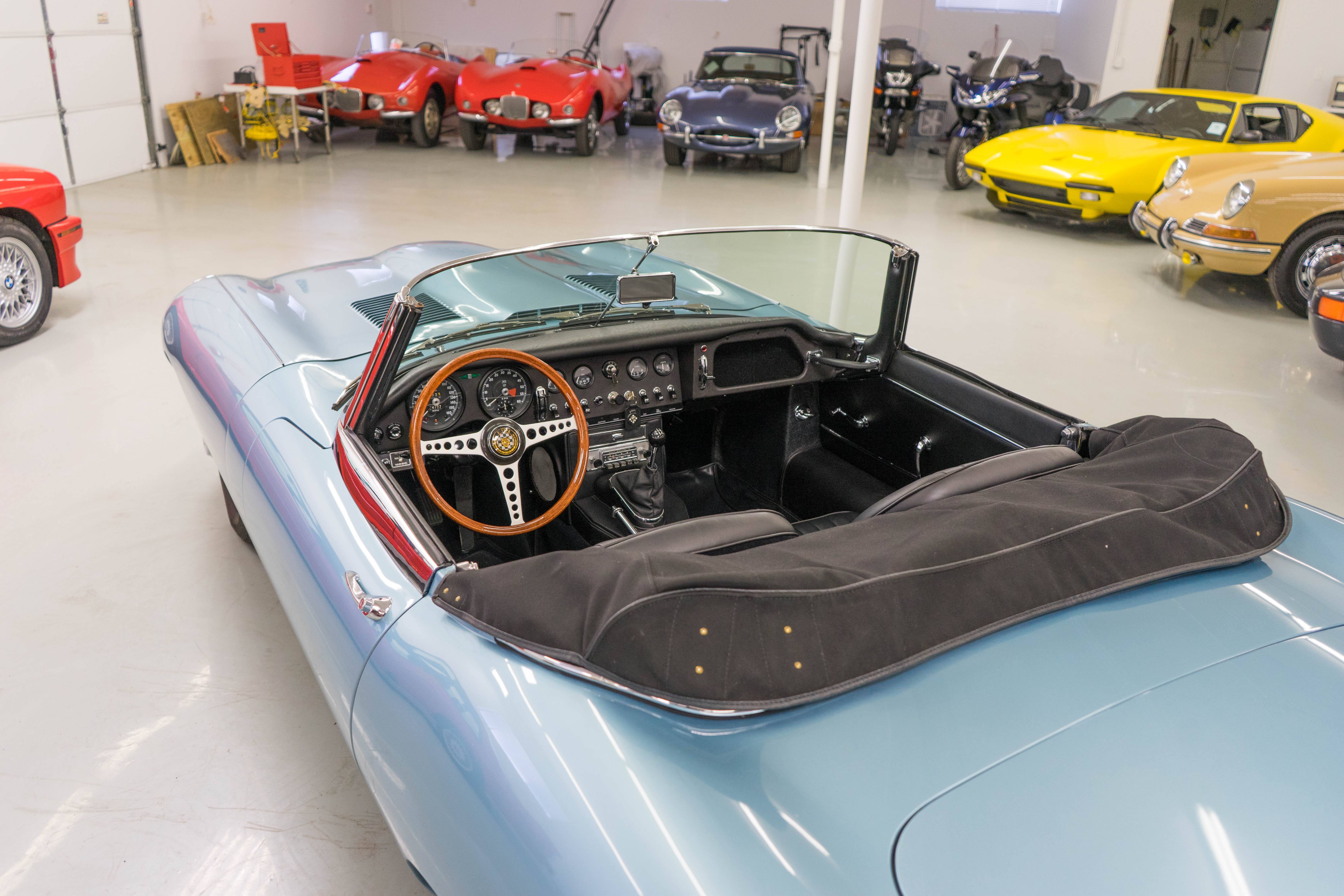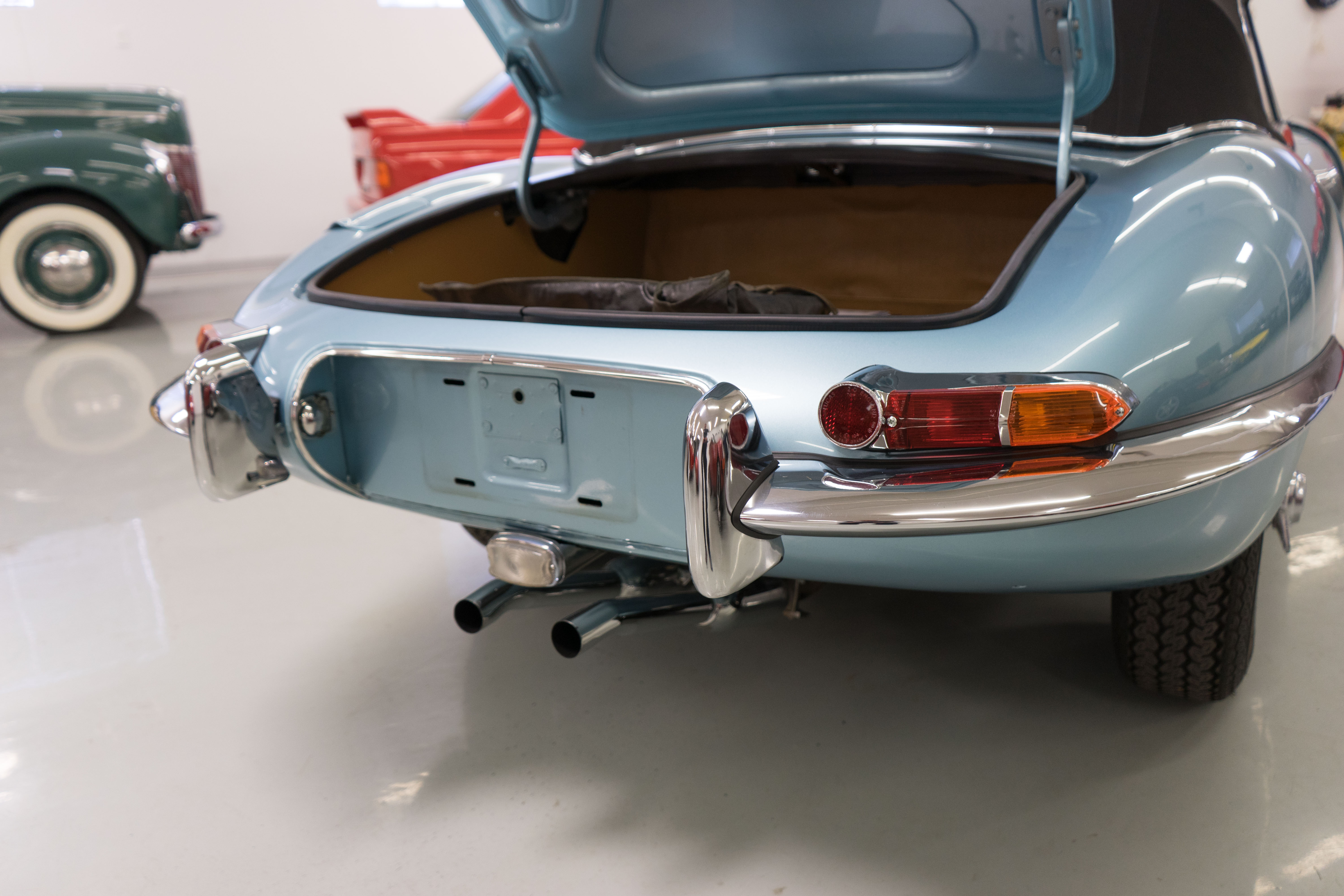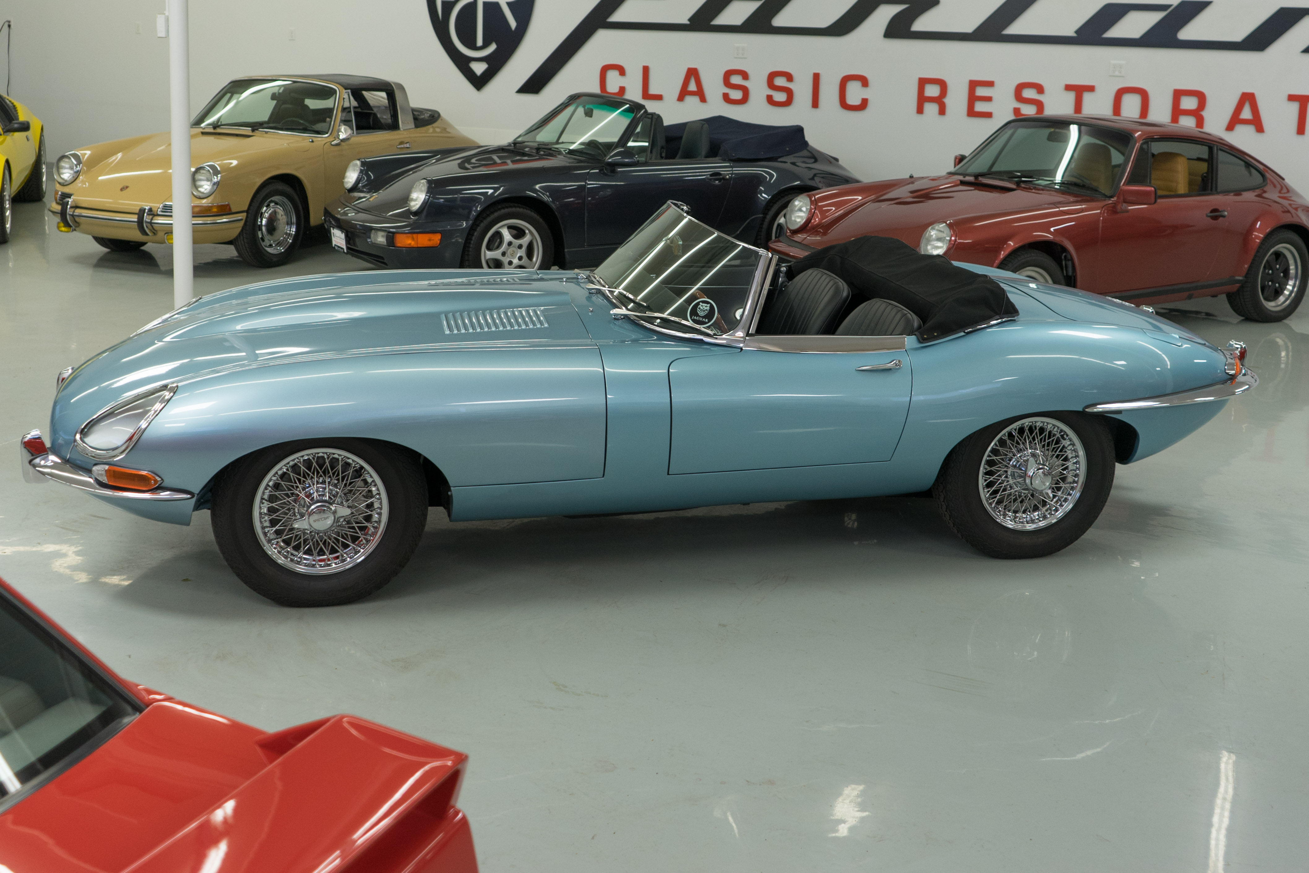 Beautifully restored E-Type roadster that has consistently scored near 100 points in JCNA concours events. Coming to us out of 49-year local ownership, the car is spectacular in its original ‘Opalescent Silver Blue Metallic’ color, as documented by the Jaguar Heritage Trust Certificate. The original engine and cylinder head numbers match the certificate and the car has its original owner’s books, tool set and many included extras.