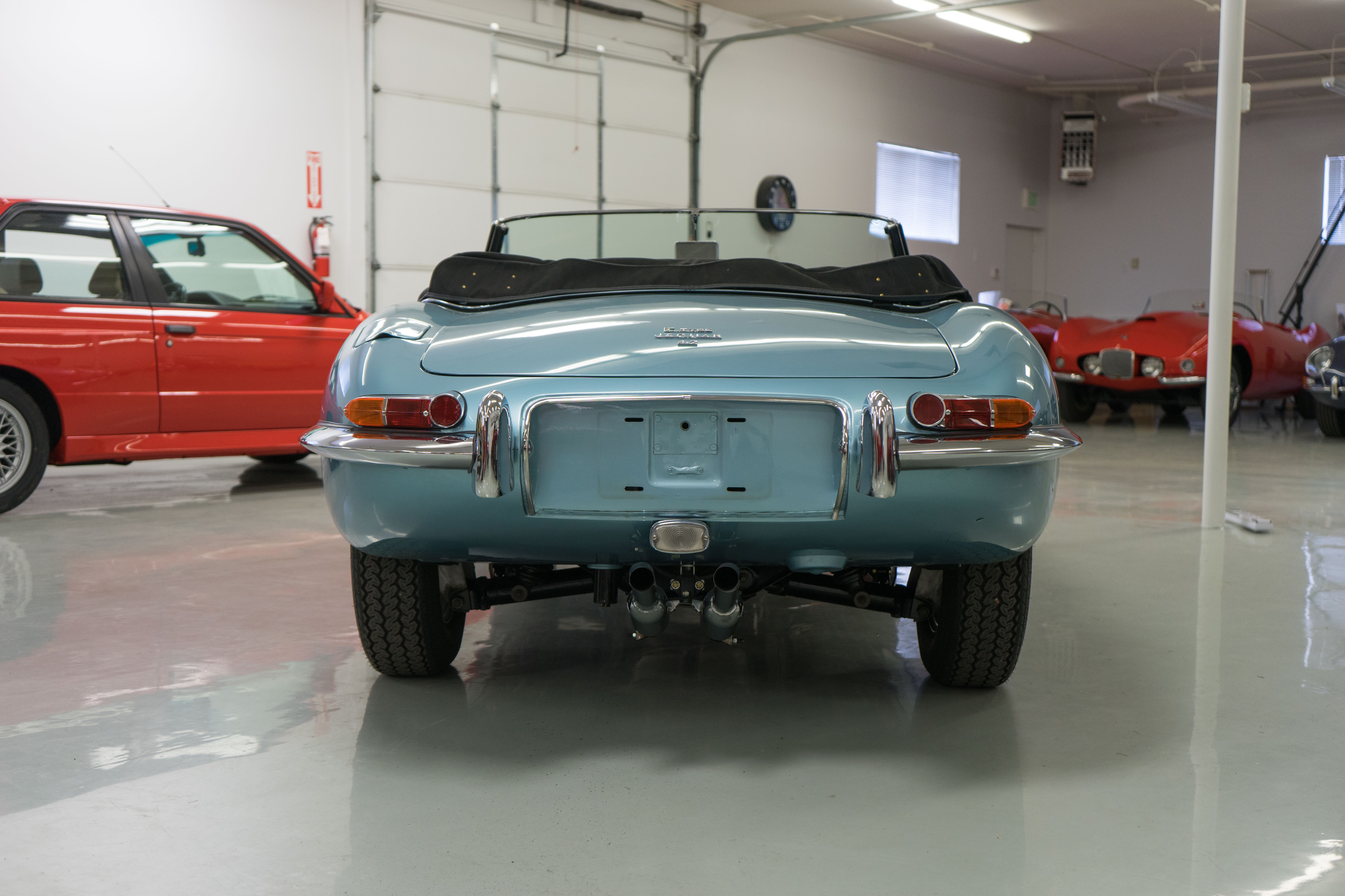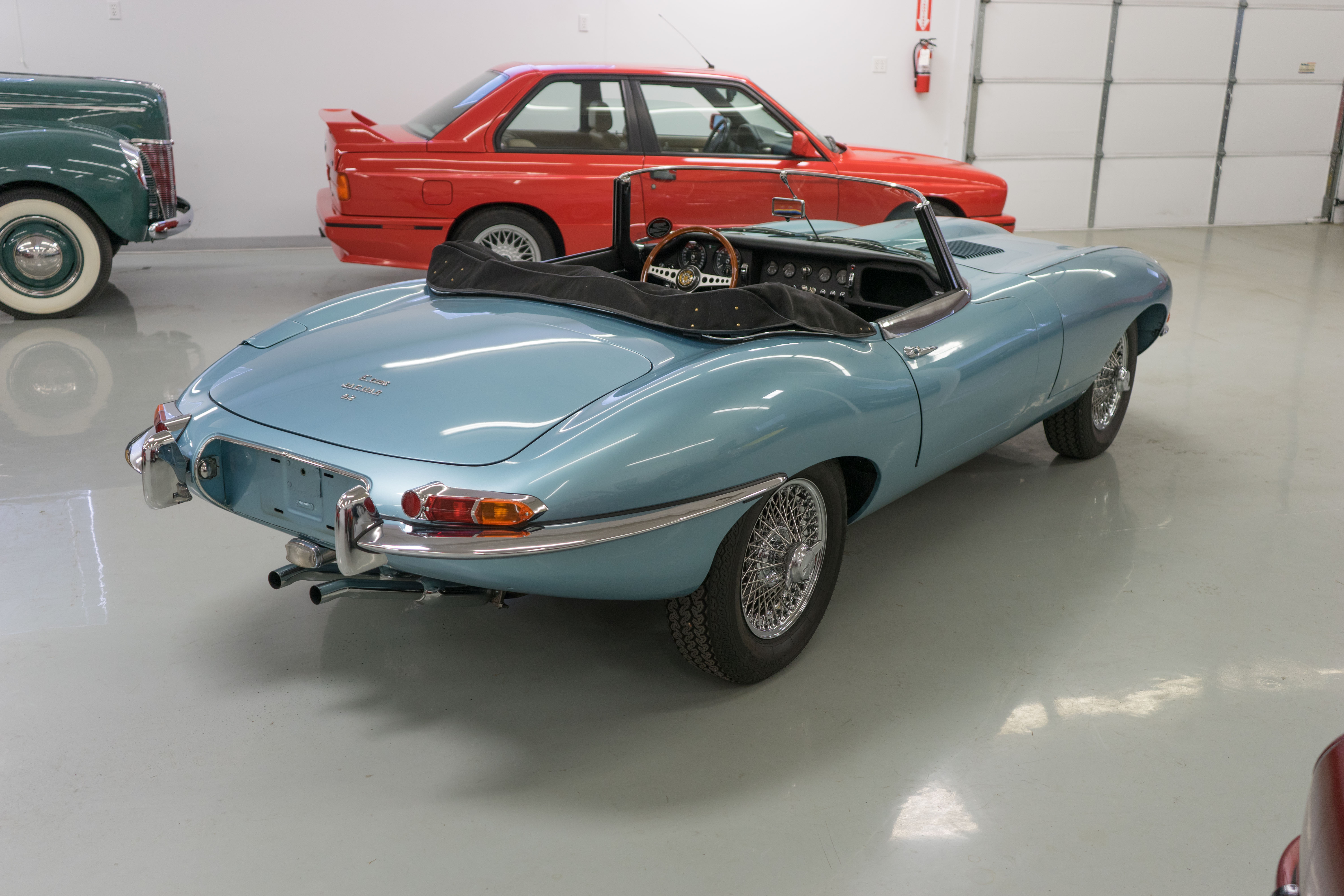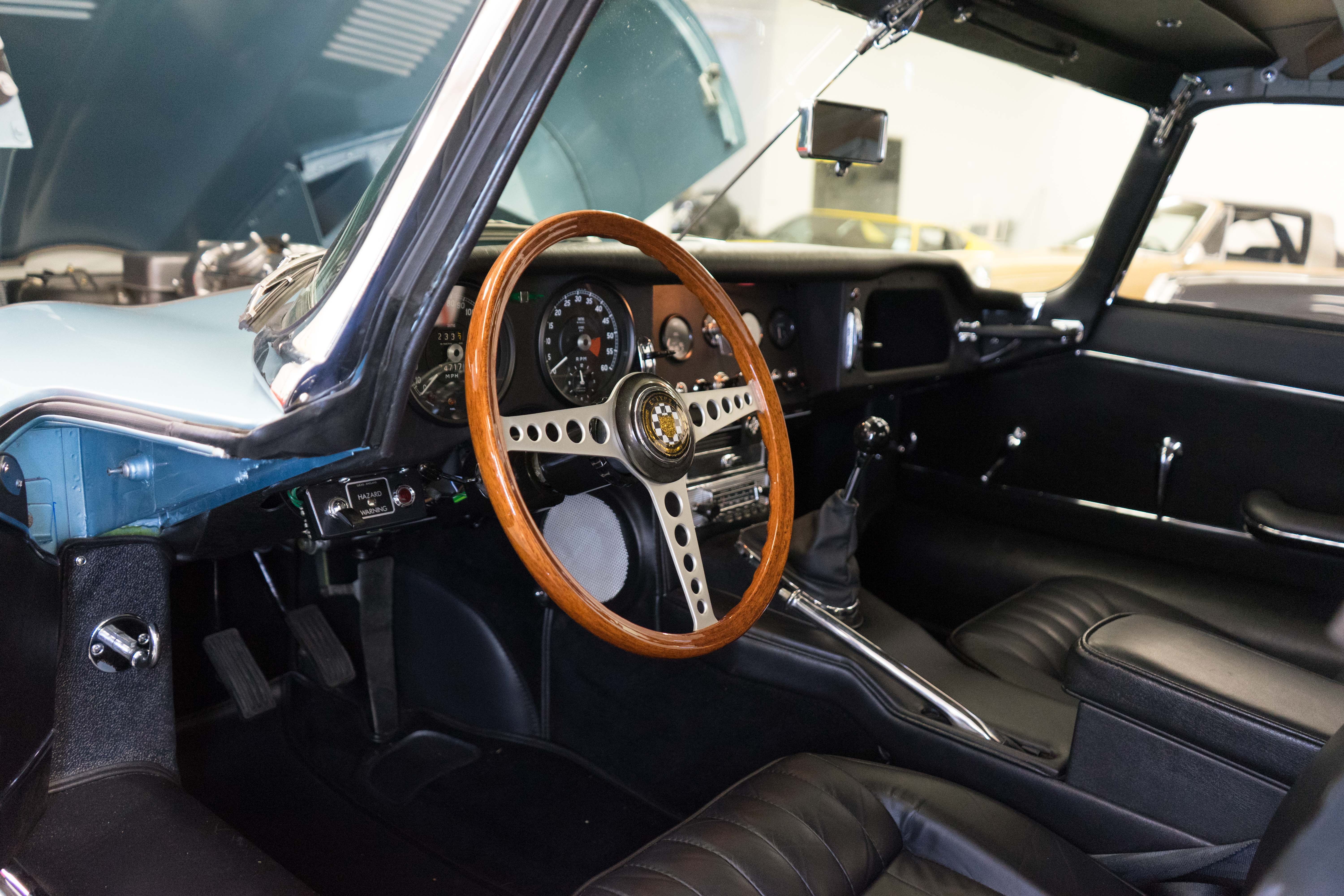 Beautifully restored E-Type roadster that has consistently scored near 100 points in JCNA concours events. Coming to us out of 49-year local ownership, the car is spectacular in its original ‘Opalescent Silver Blue Metallic’ color, as documented by the Jaguar Heritage Trust Certificate. The original engine and cylinder head numbers match the certificate and the car has its original owner’s books, tool set and many included extras.