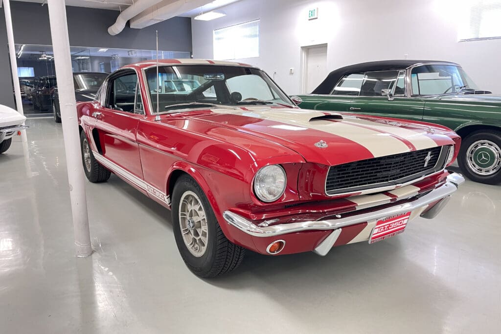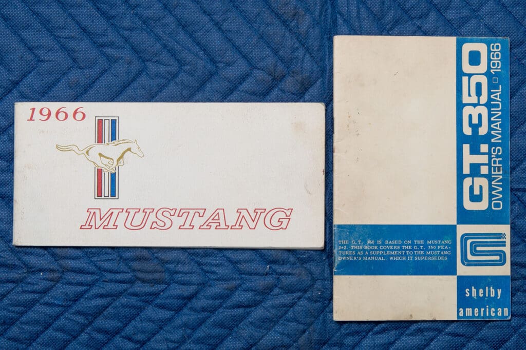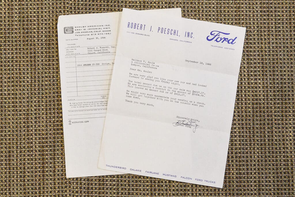 (Photo note – the first few photos of this Shelby GT350 are from our showroom, shot Oct 14th. Other pics are from documentation a while back, just FYI.) True Shelby GT350! This is NOT some ‘tribute’ Shelby made up out of some old Mustang! This is the 3rd from LAST 1966 built in the hangar at LAX (before the unobtainable convertibles.) What’s more this Shelby has incredible documentation. It’s listed in the Shelby America Directory 1966 Edition. We have the original Shelby window sticker & equipment list, plus a full accounting of owners back to the fellow who bought it new in Lompoc, CA via classic Cali ‘Pink Slips’. In fact, the car lived in SoCal its whole life before joining a Colorado collection eight years ago. The car is listed in the Shelby American Register and was autographed by Carroll years ago.