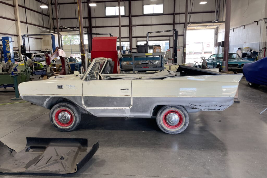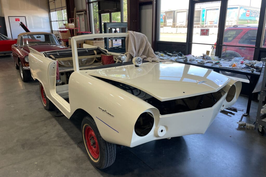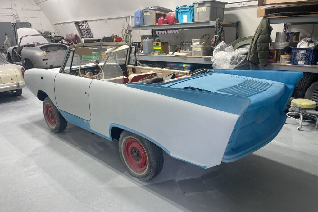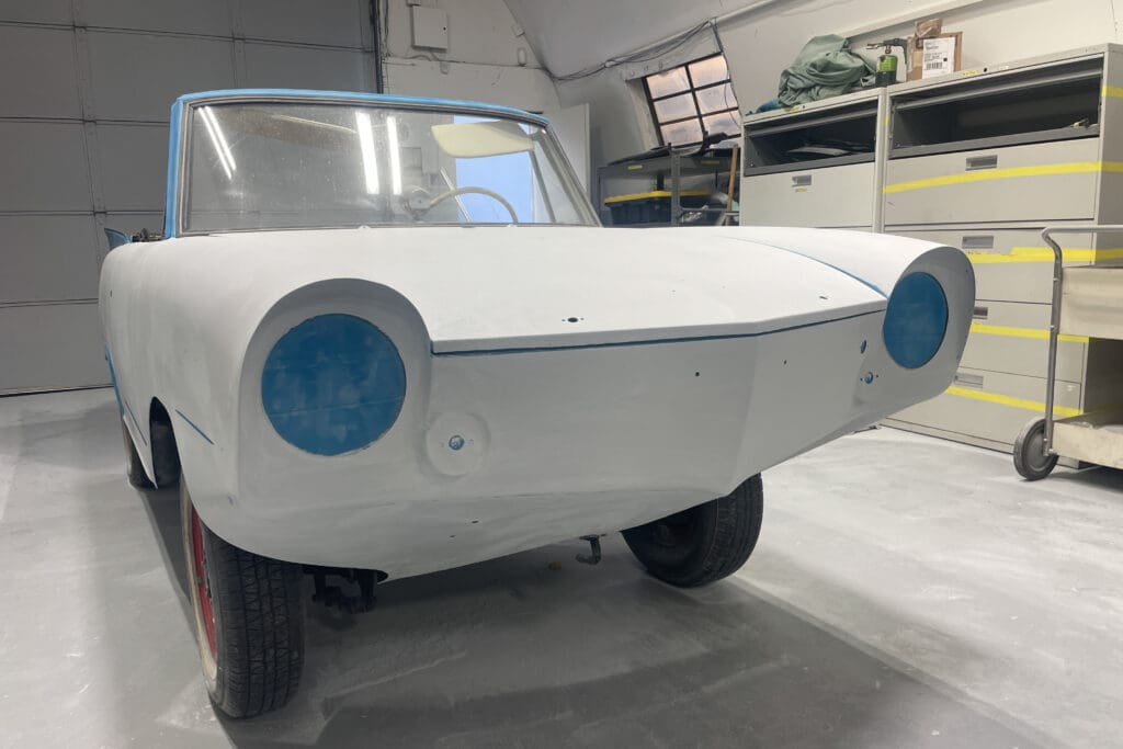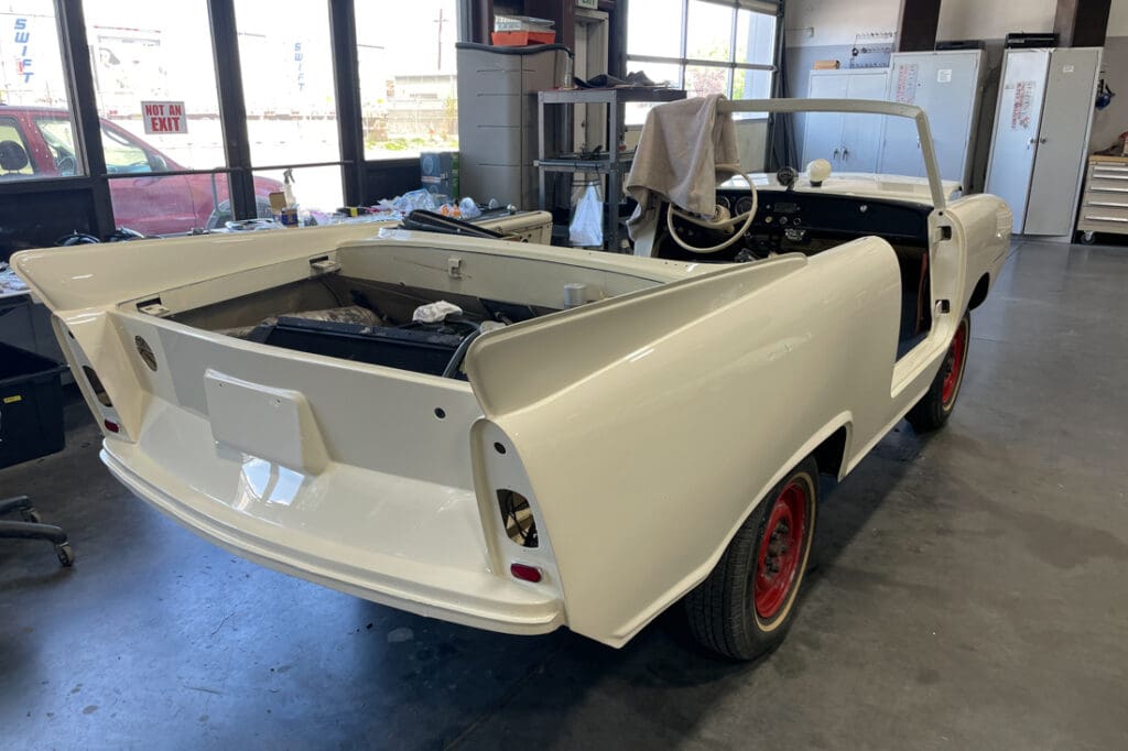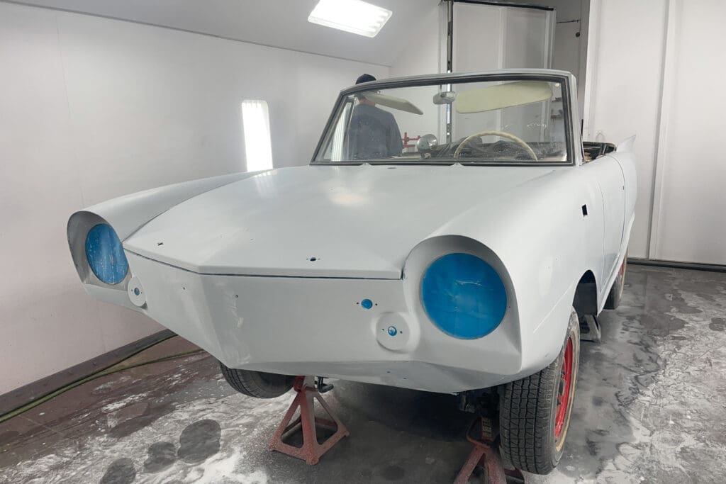 As the pictures show this classic Amphicar 770 had clearly spent some time in the water! Our customer has asked us to perform necessary rust repairs followed by body work and fresh paint. Our skilled metal man completed the rust repairs and final paintwork is also now completed. Reassembly is currently in progress.