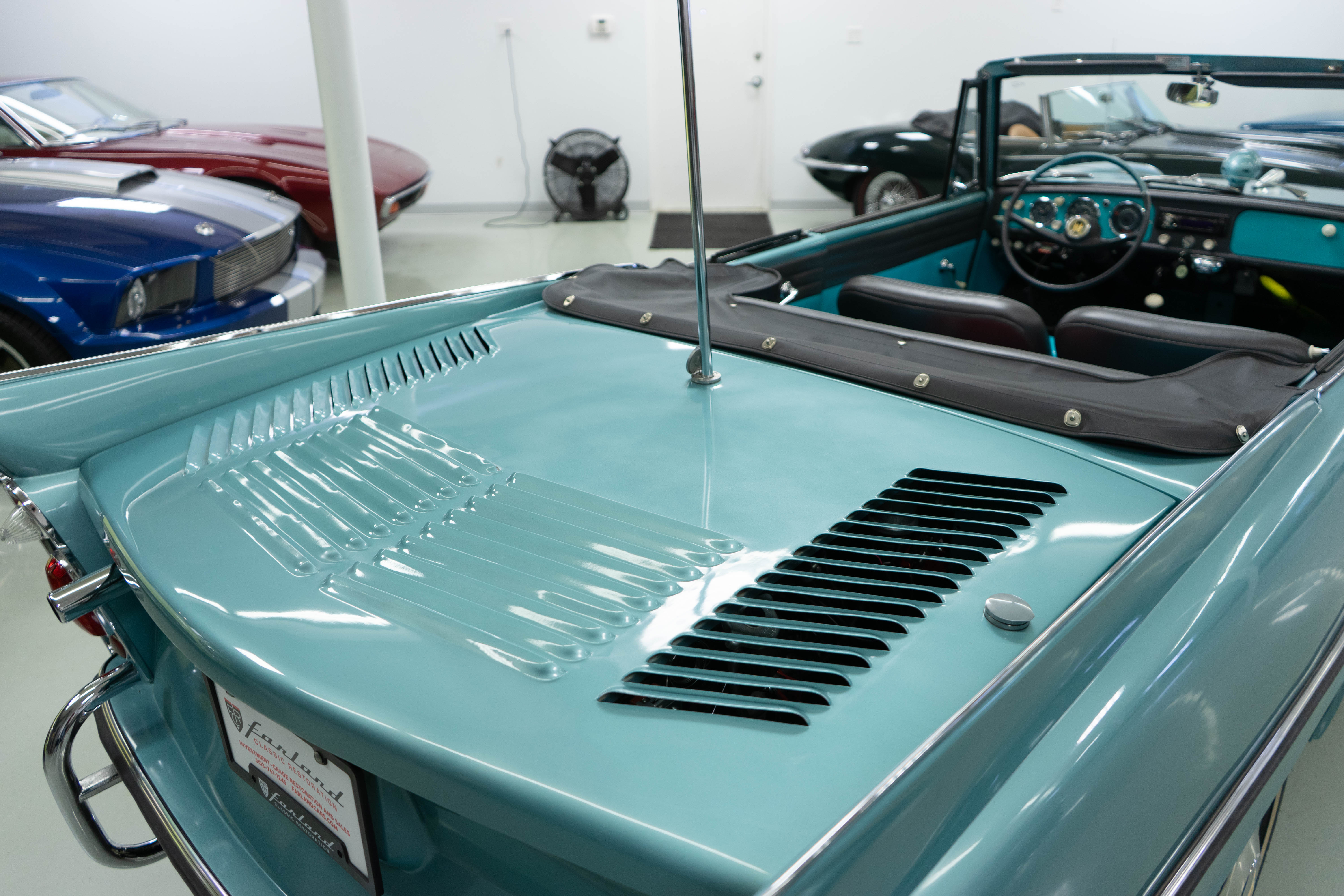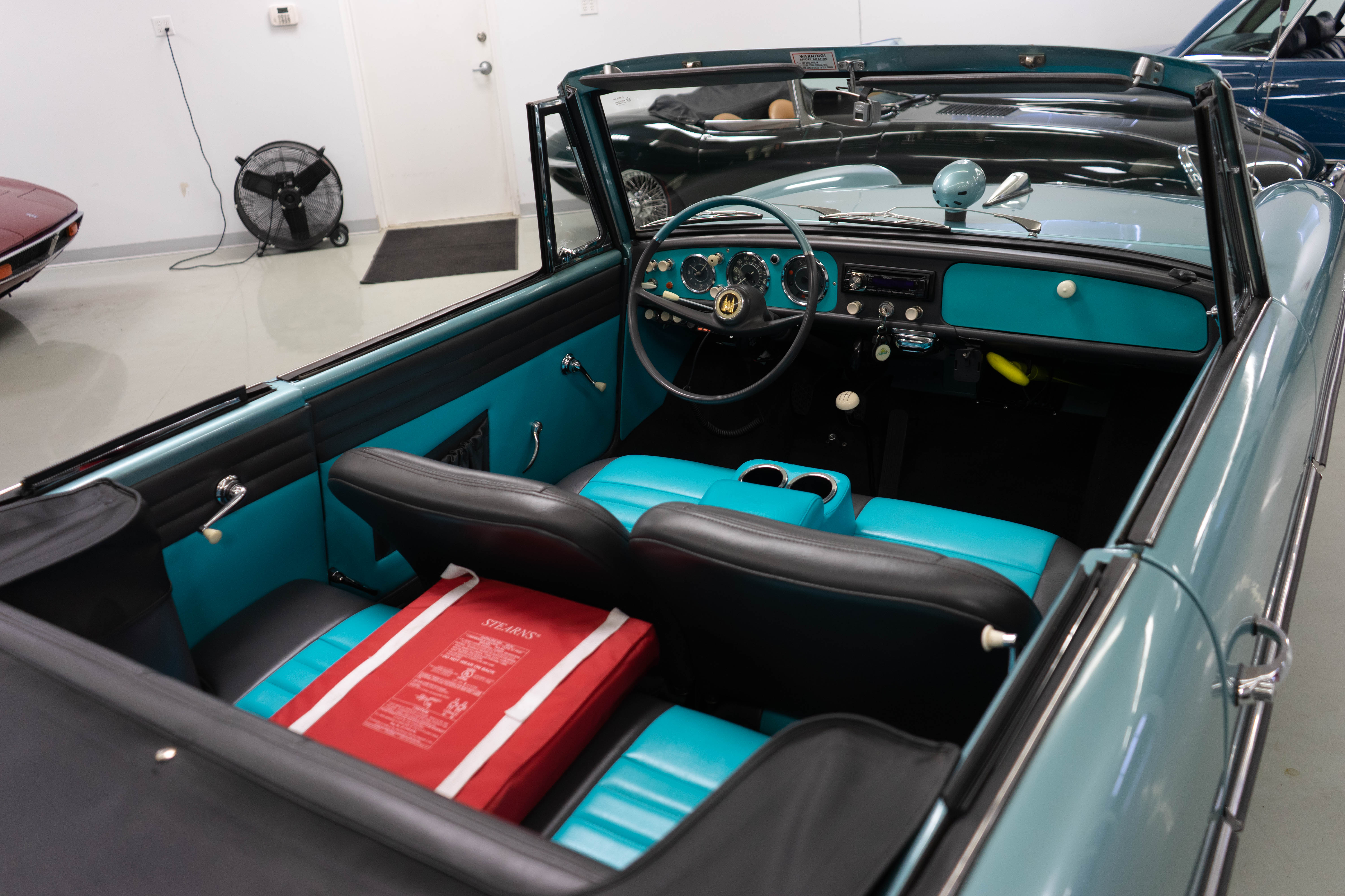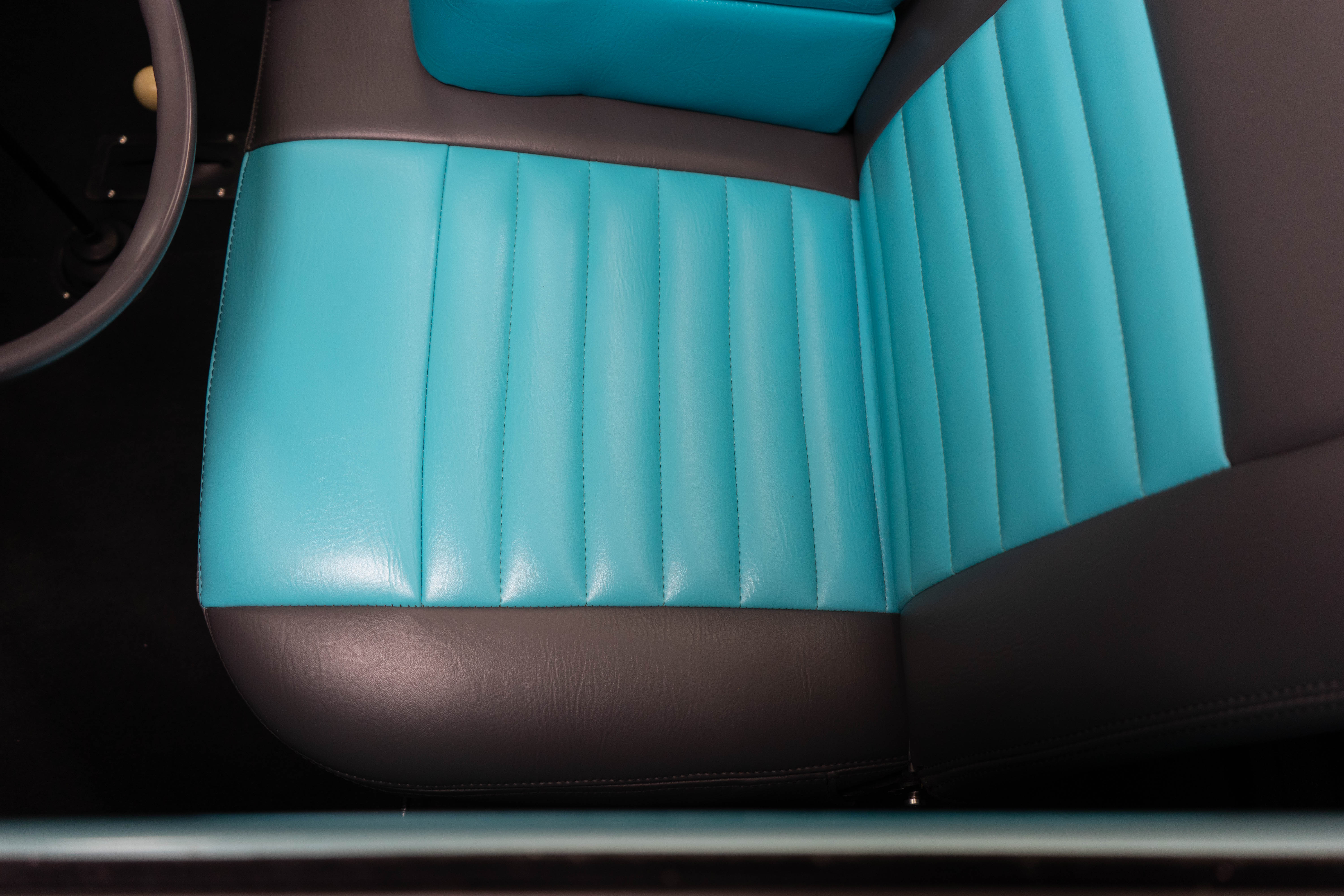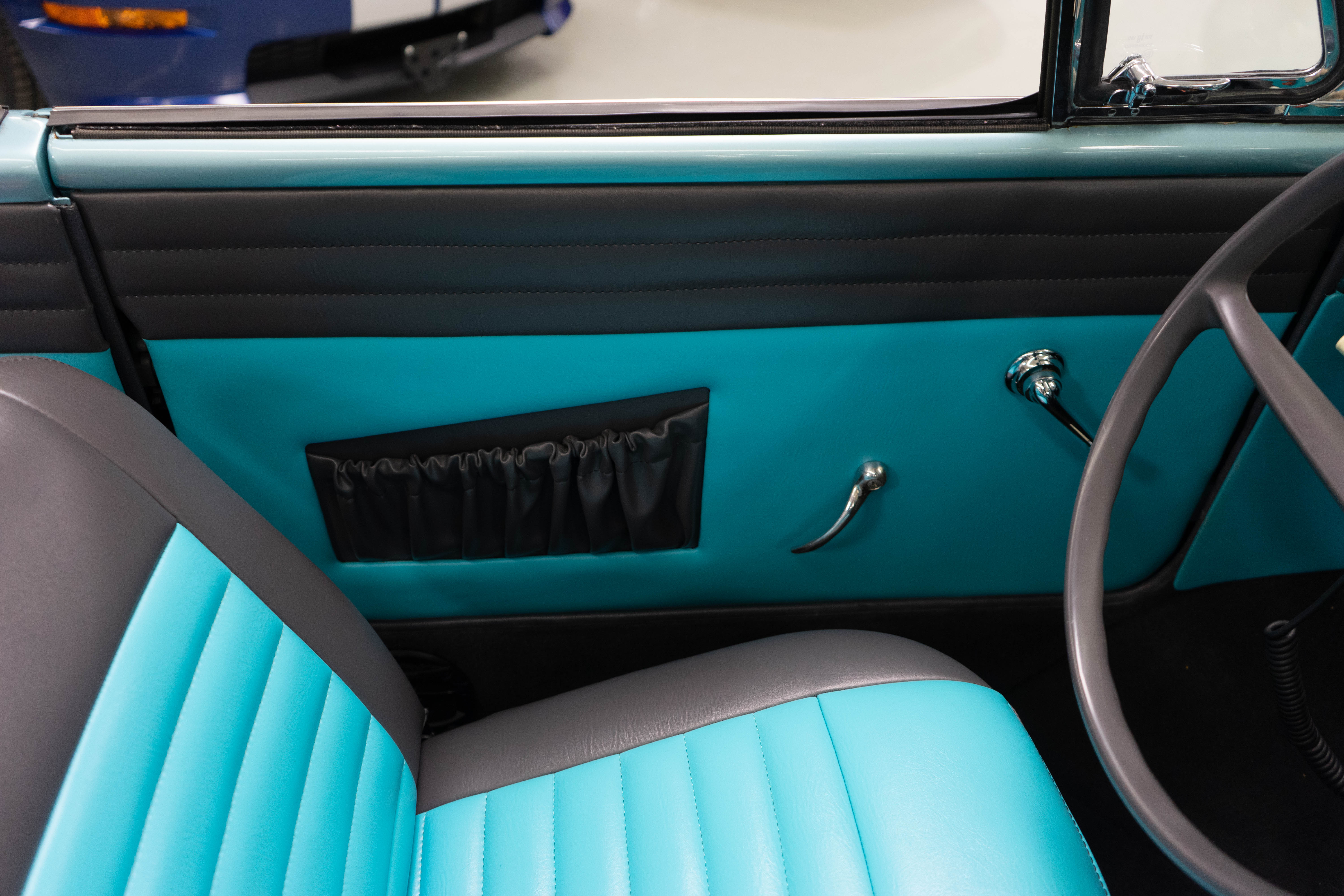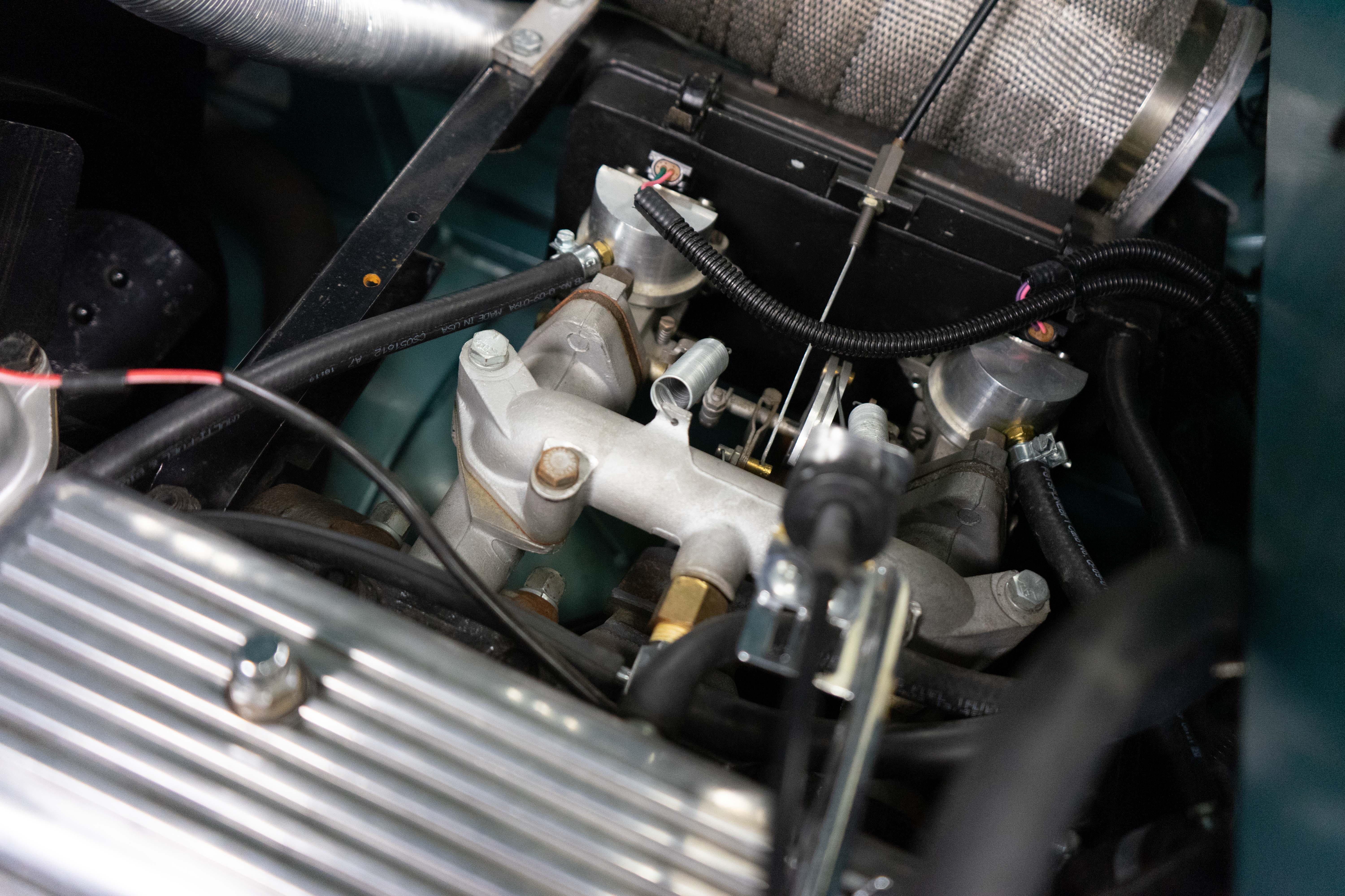 All of the typical full-restoration boxes were checked, with engine, suspension, brakes, drivetrain & electrics all refurbished. The solid hull was stripped to metal and refinished in this beautiful aqua green, with an all-new matching two-tone interior and new convertible top. The engine has been upgraded with fuel injection and numerous other new technologies have been added, like a marine band radio for when you’re out of sight of land, modern sound system, improved cooling with supplemental fans, upgraded alternator and nice touches like the finned aluminum valve cover.