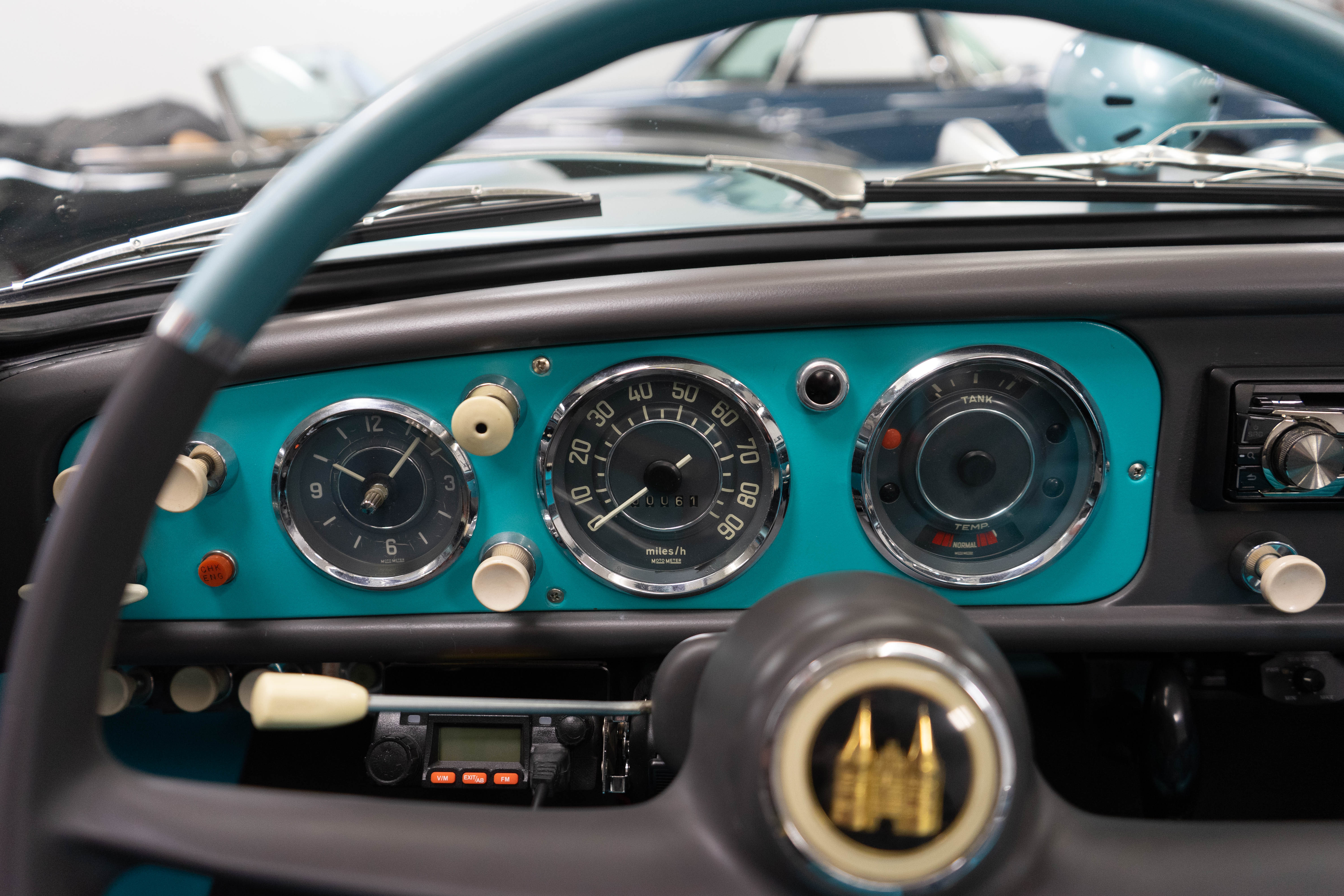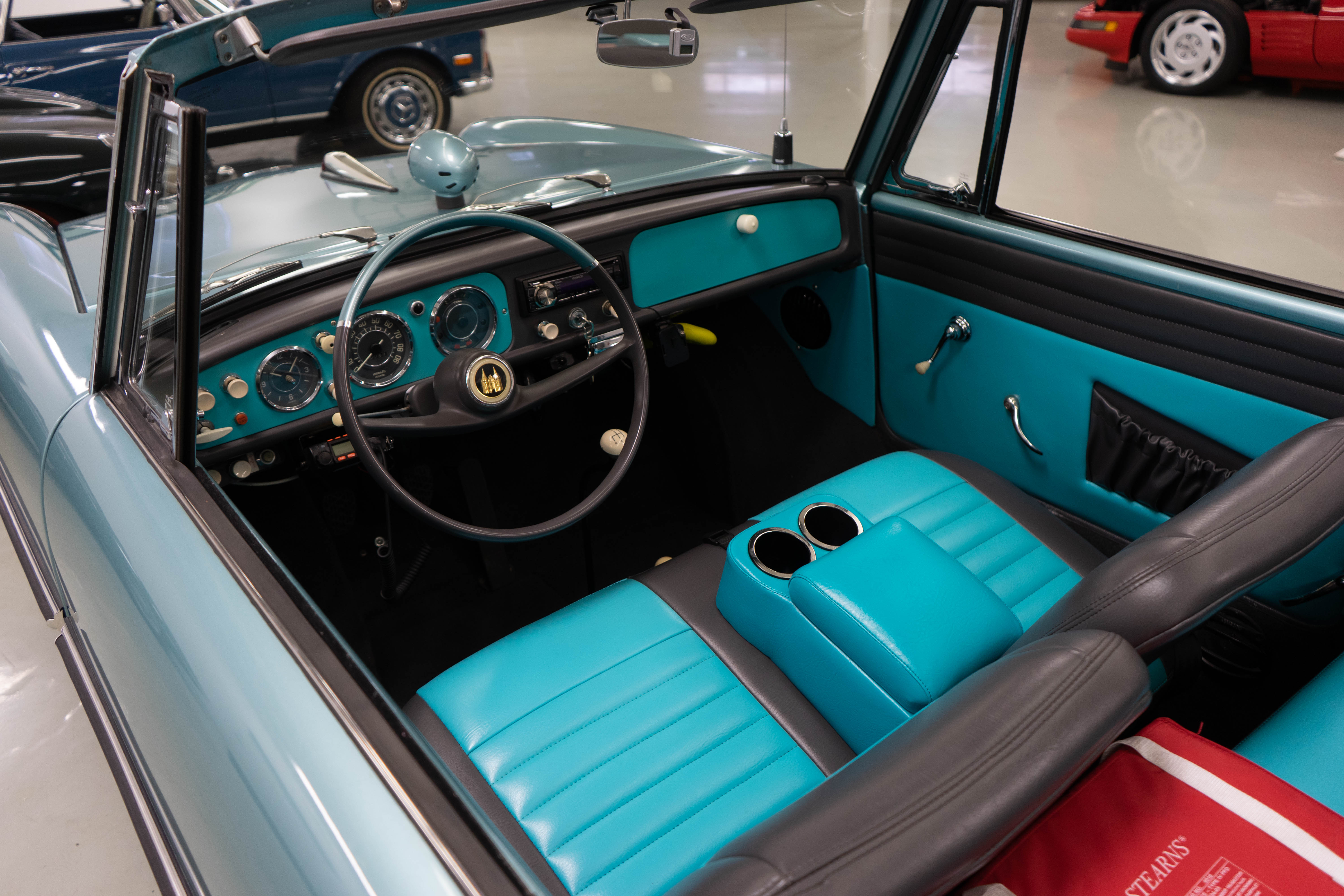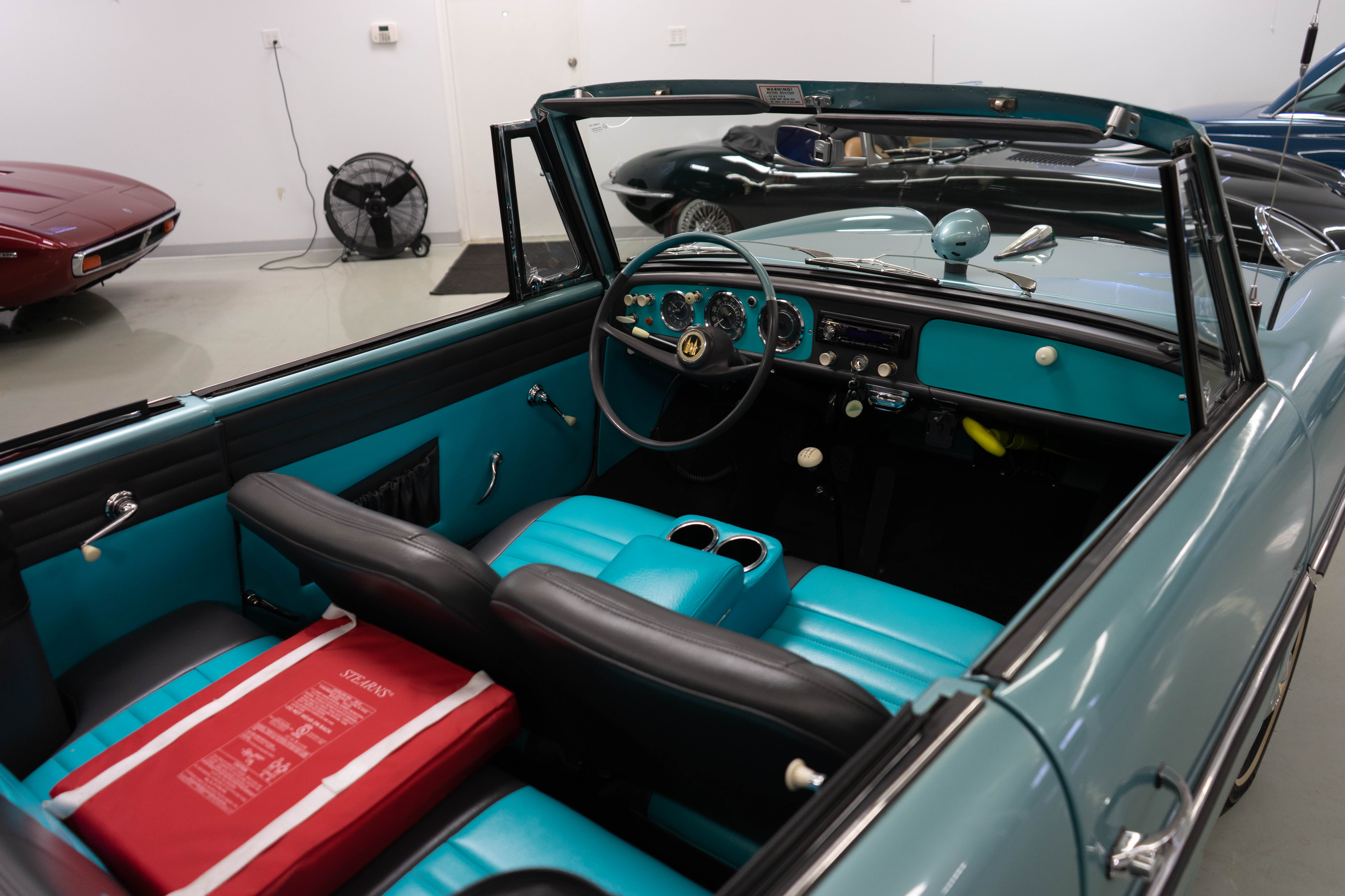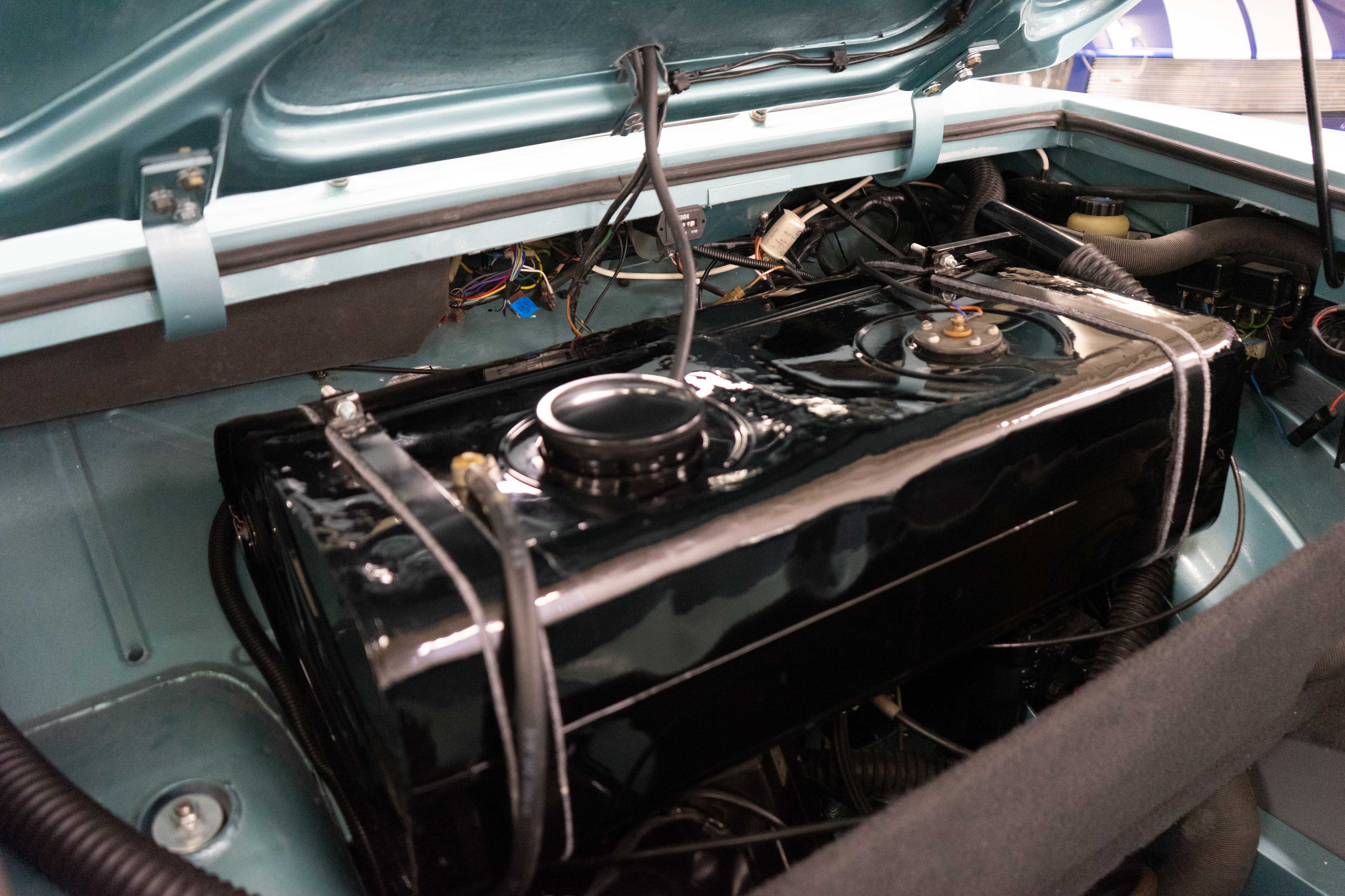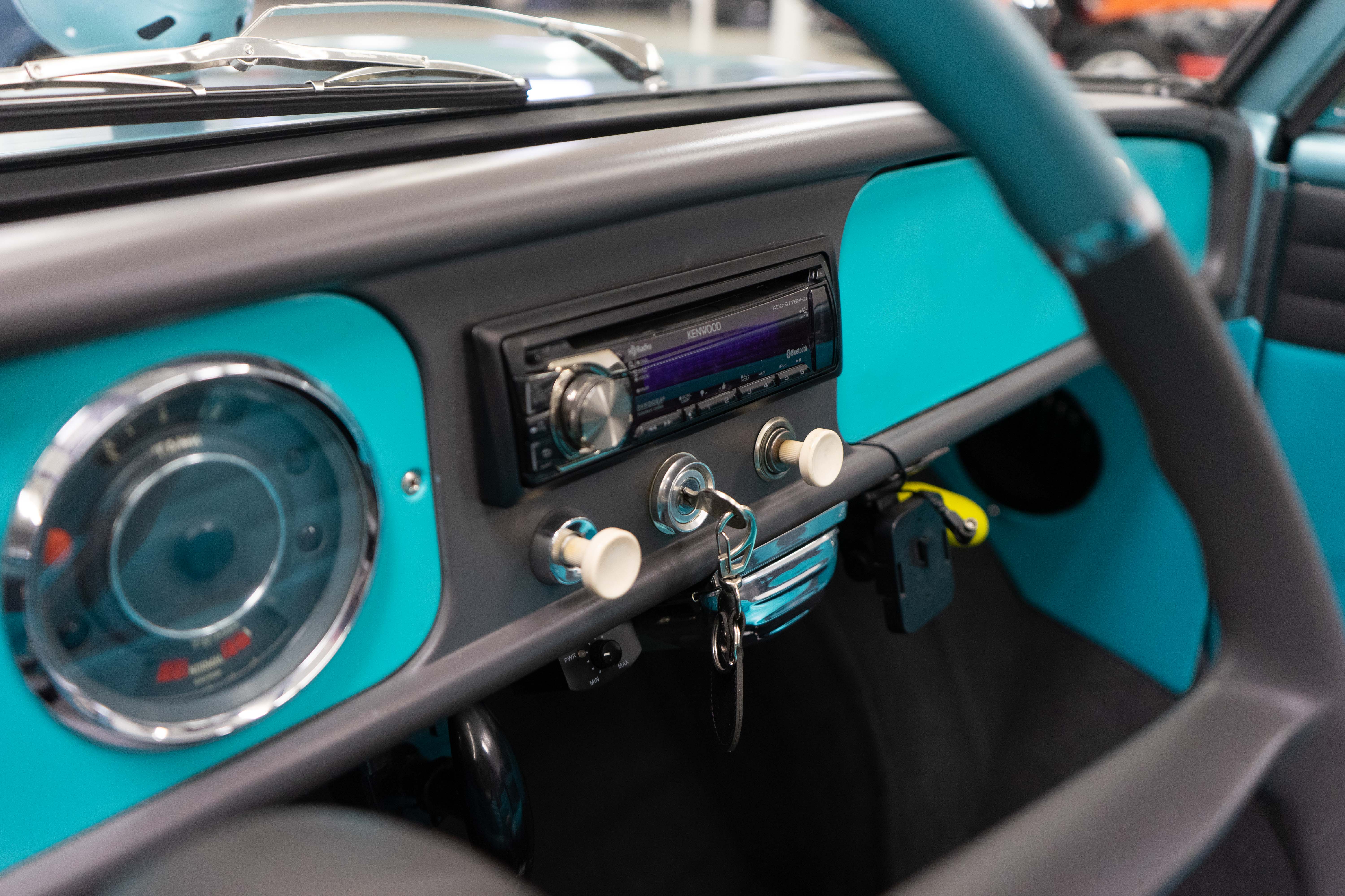 All of the typical full-restoration boxes were checked, with engine, suspension, brakes, drivetrain & electrics all refurbished. The solid hull was stripped to metal and refinished in this beautiful aqua green, with an all-new matching two-tone interior and new convertible top. The engine has been upgraded with fuel injection and numerous other new technologies have been added, like a marine band radio for when you’re out of sight of land, modern sound system, improved cooling with supplemental fans, upgraded alternator and nice touches like the finned aluminum valve cover.