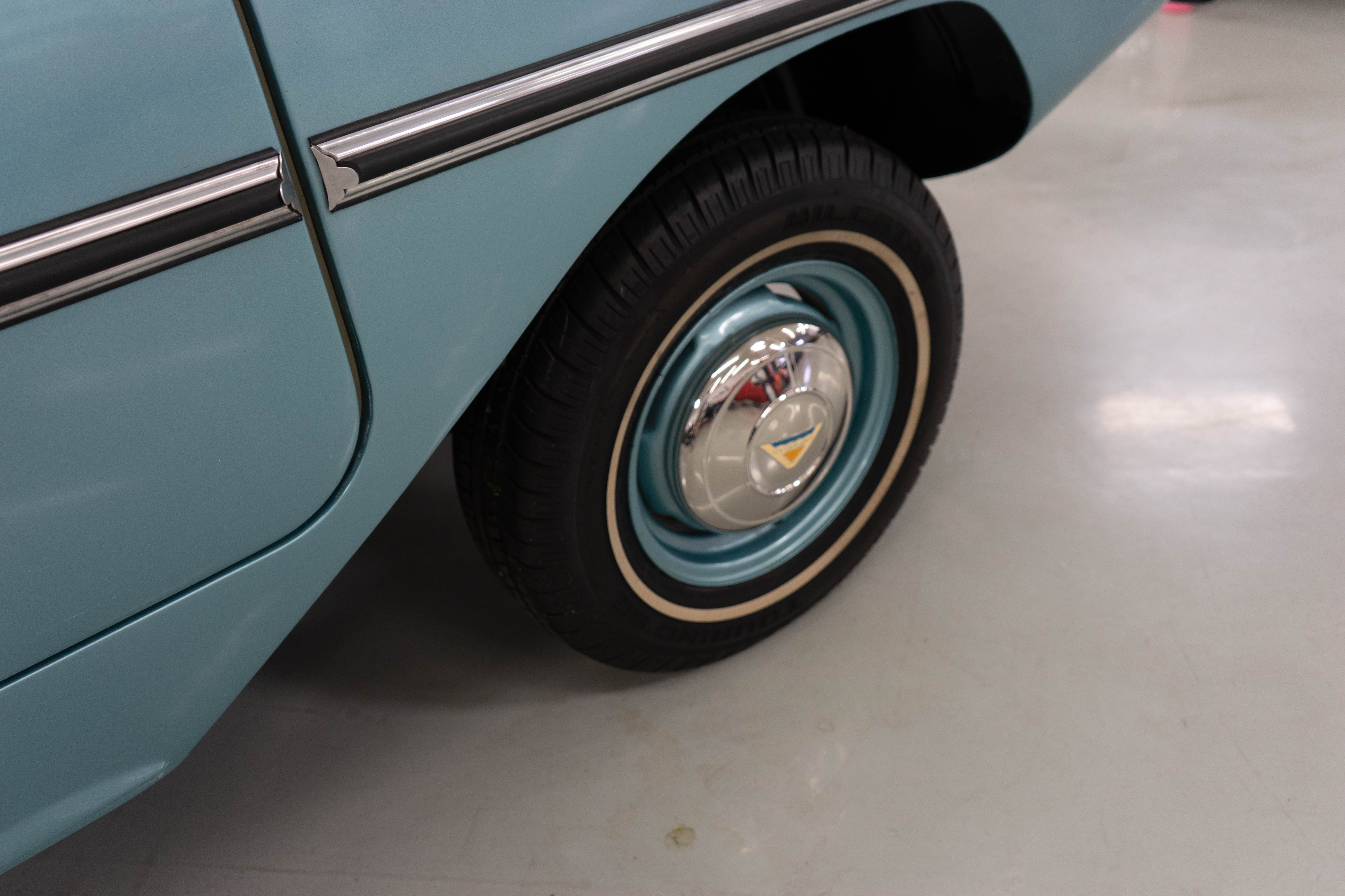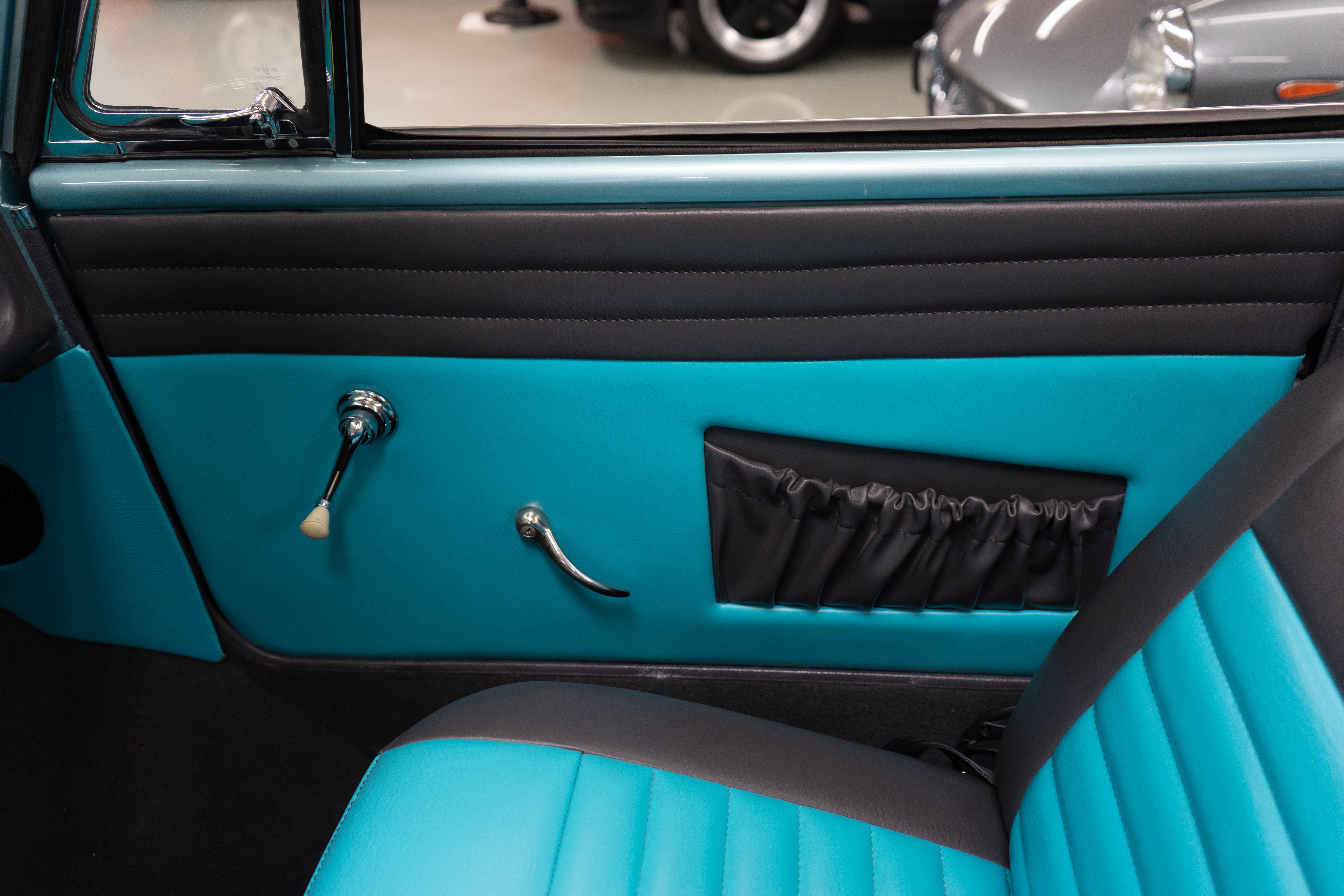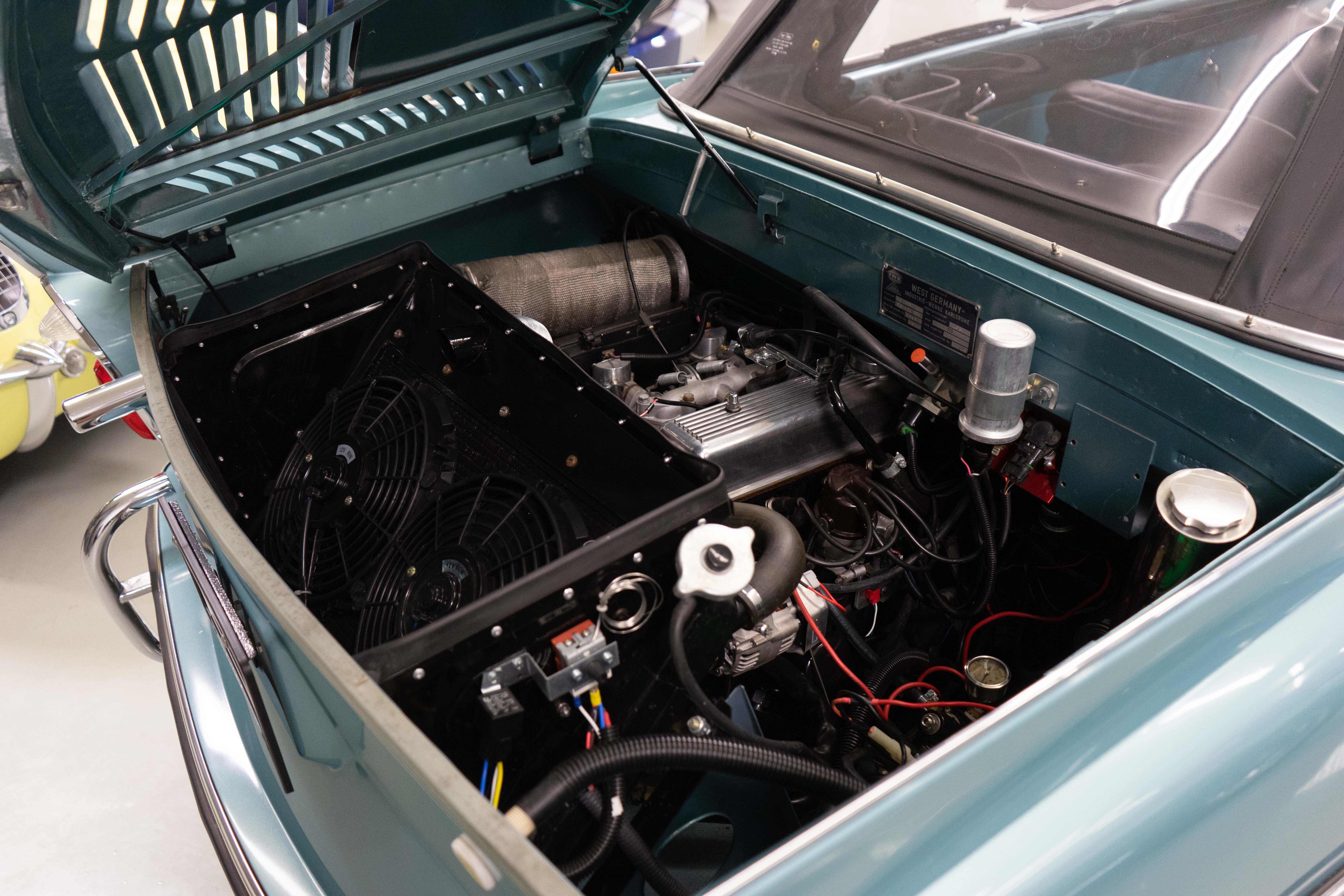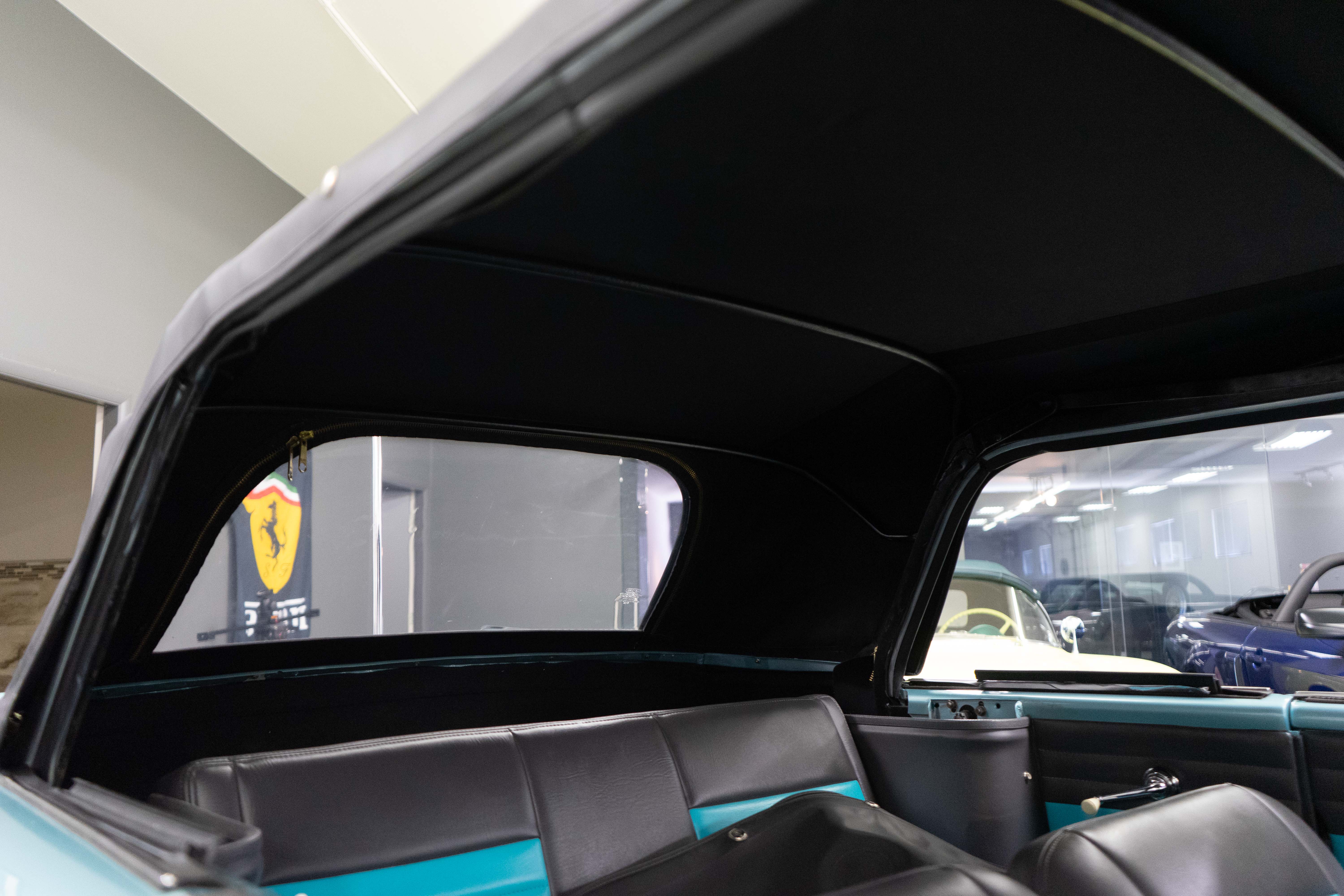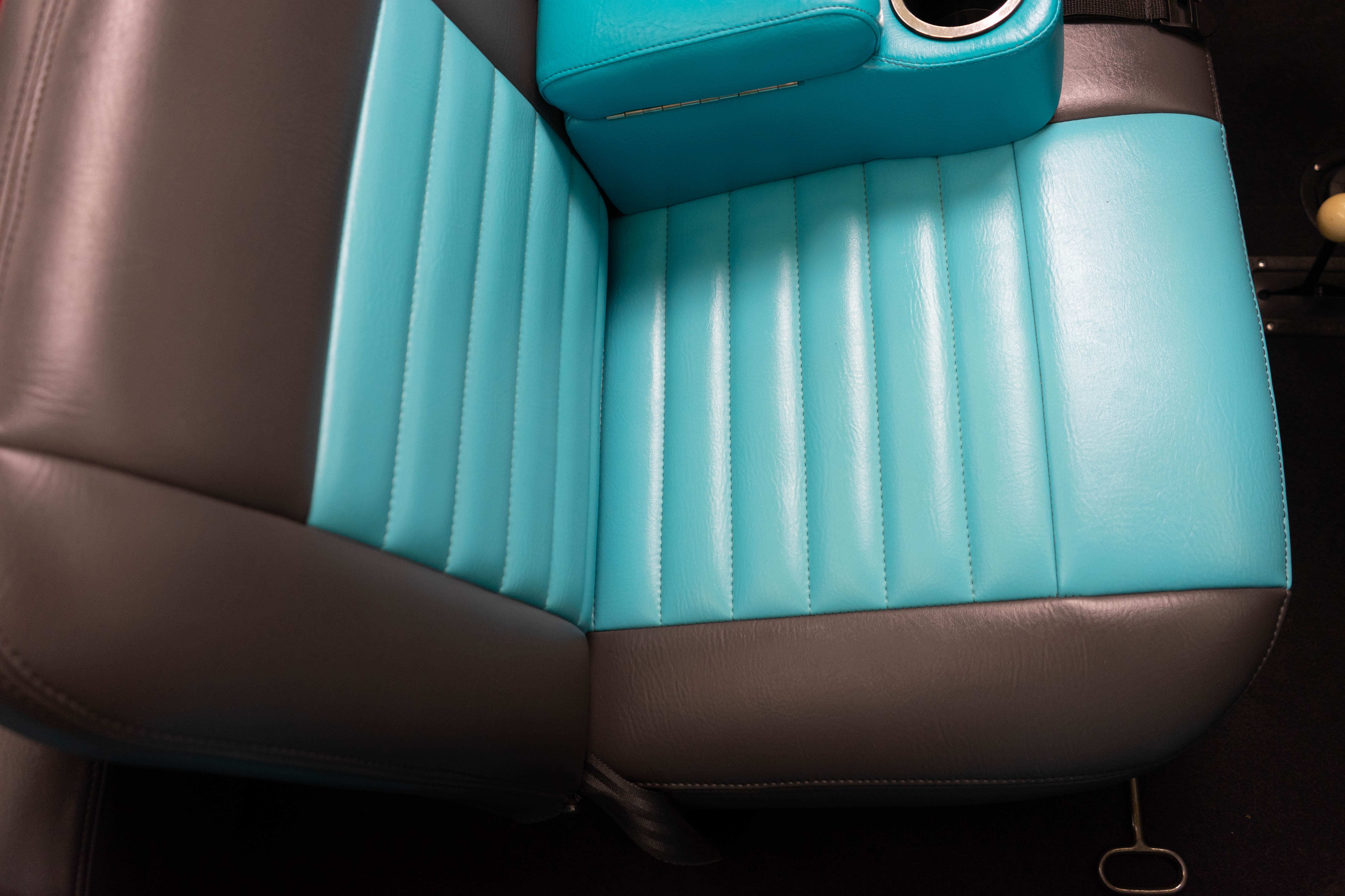 All of the typical full-restoration boxes were checked, with engine, suspension, brakes, drivetrain & electrics all refurbished. The solid hull was stripped to metal and refinished in this beautiful aqua green, with an all-new matching two-tone interior and new convertible top. The engine has been upgraded with fuel injection and numerous other new technologies have been added, like a marine band radio for when you’re out of sight of land, modern sound system, improved cooling with supplemental fans, upgraded alternator and nice touches like the finned aluminum valve cover.