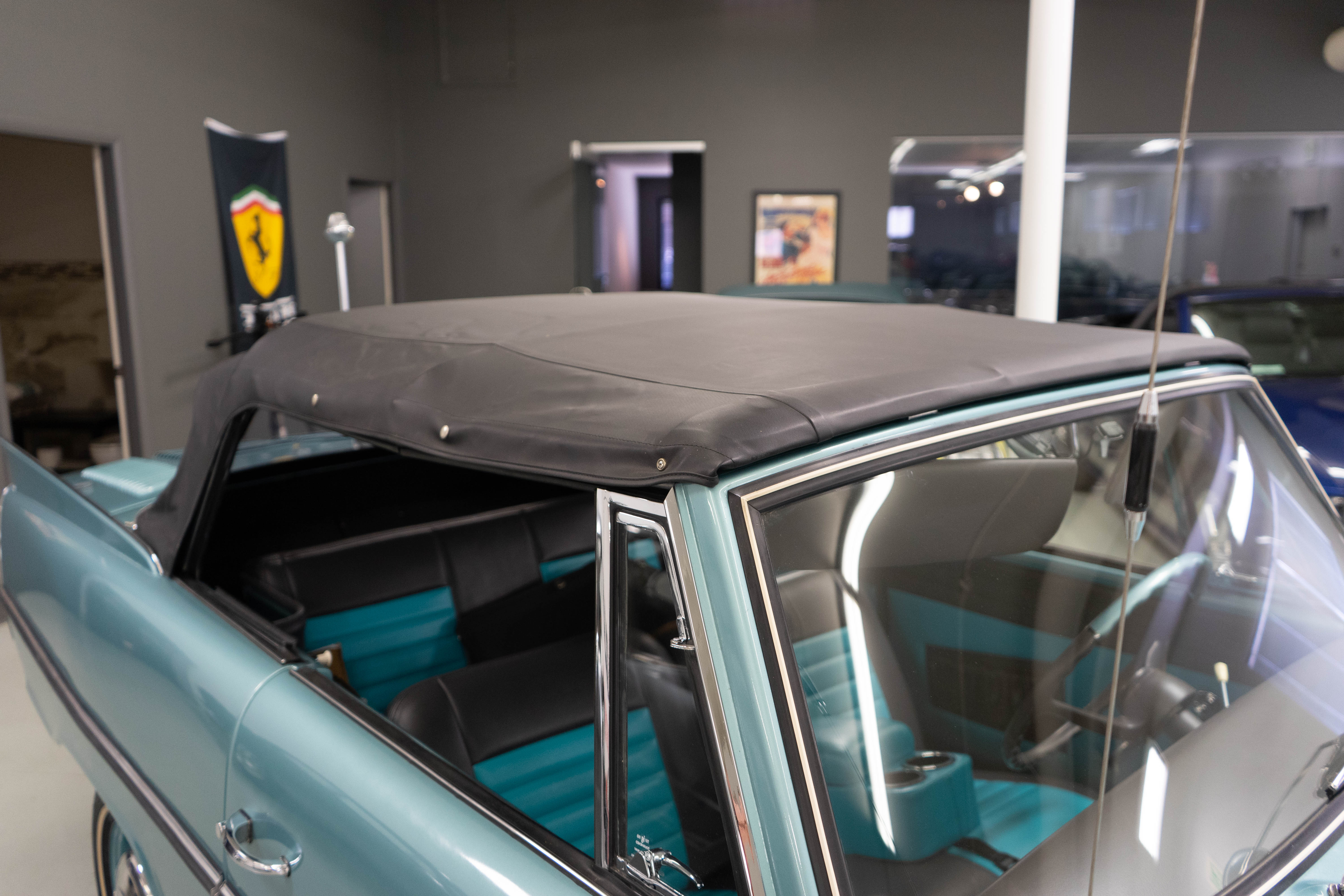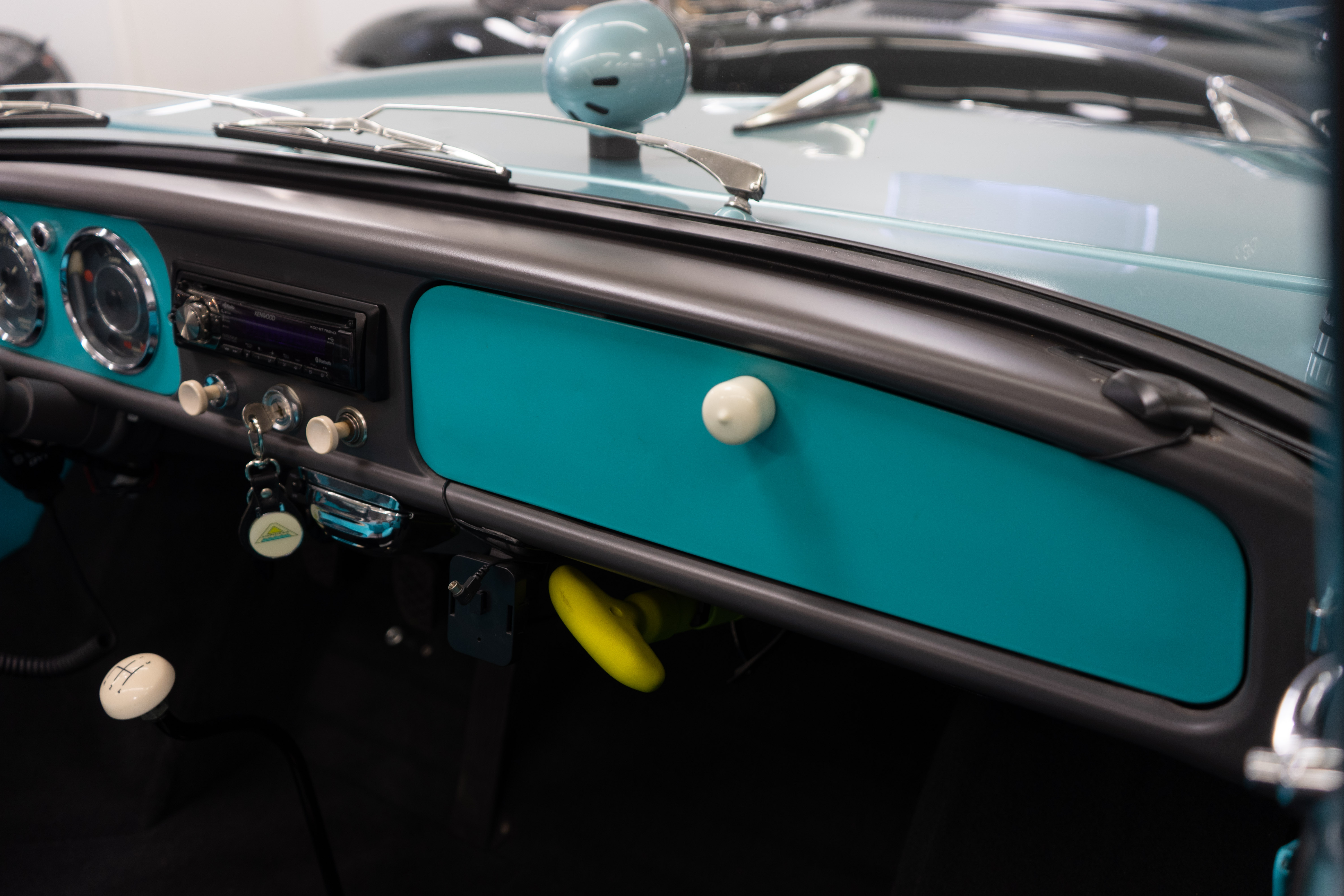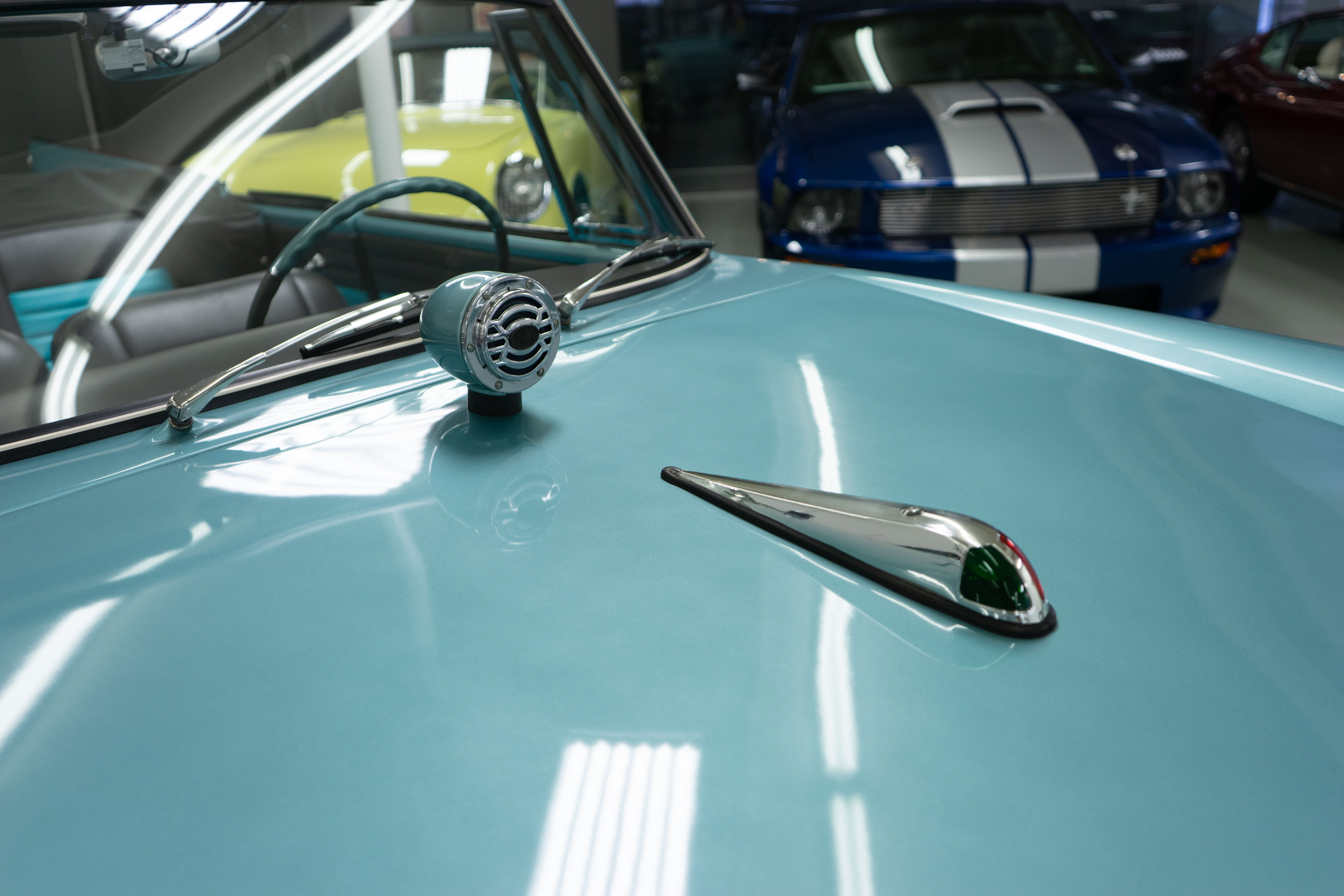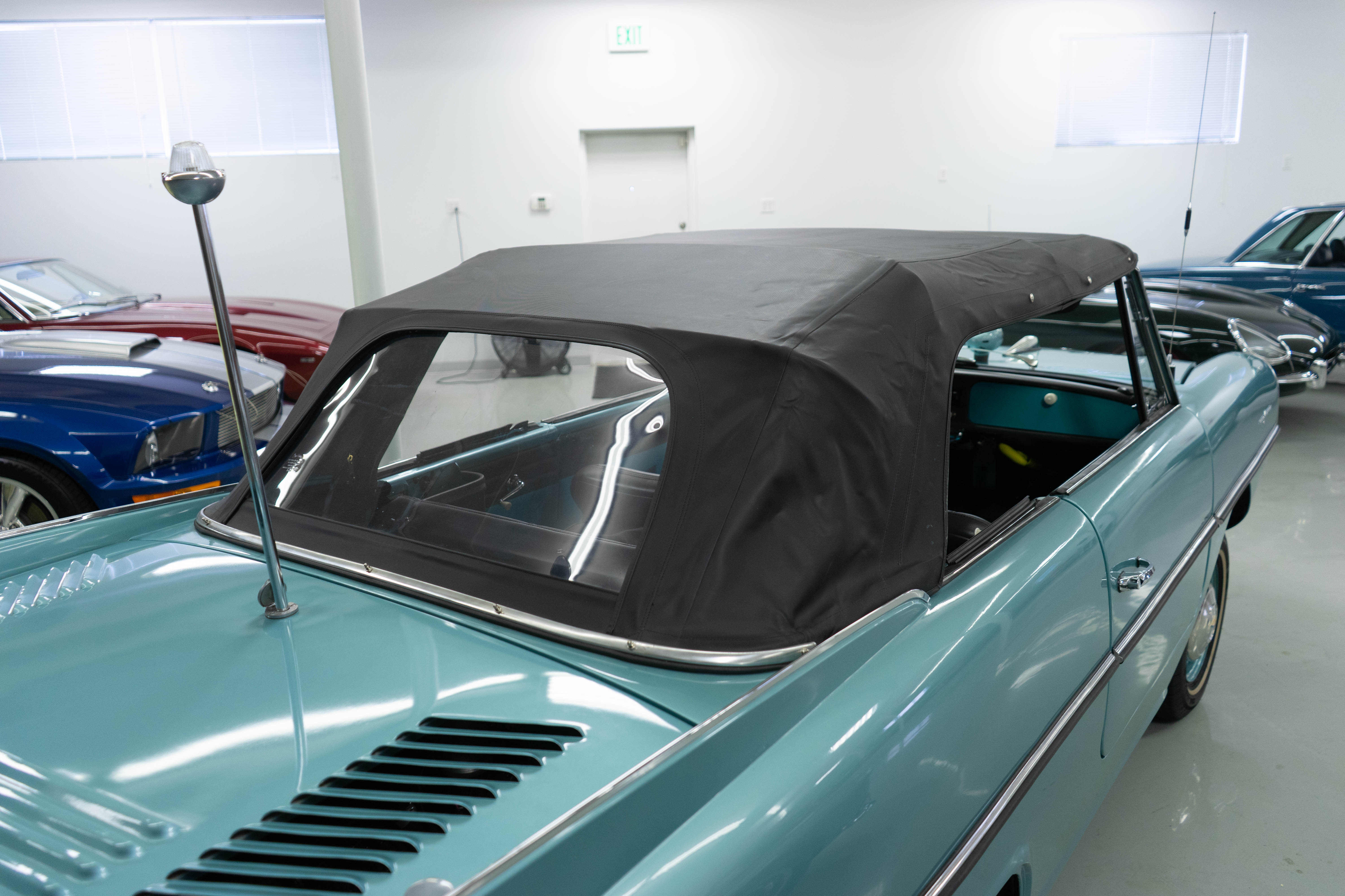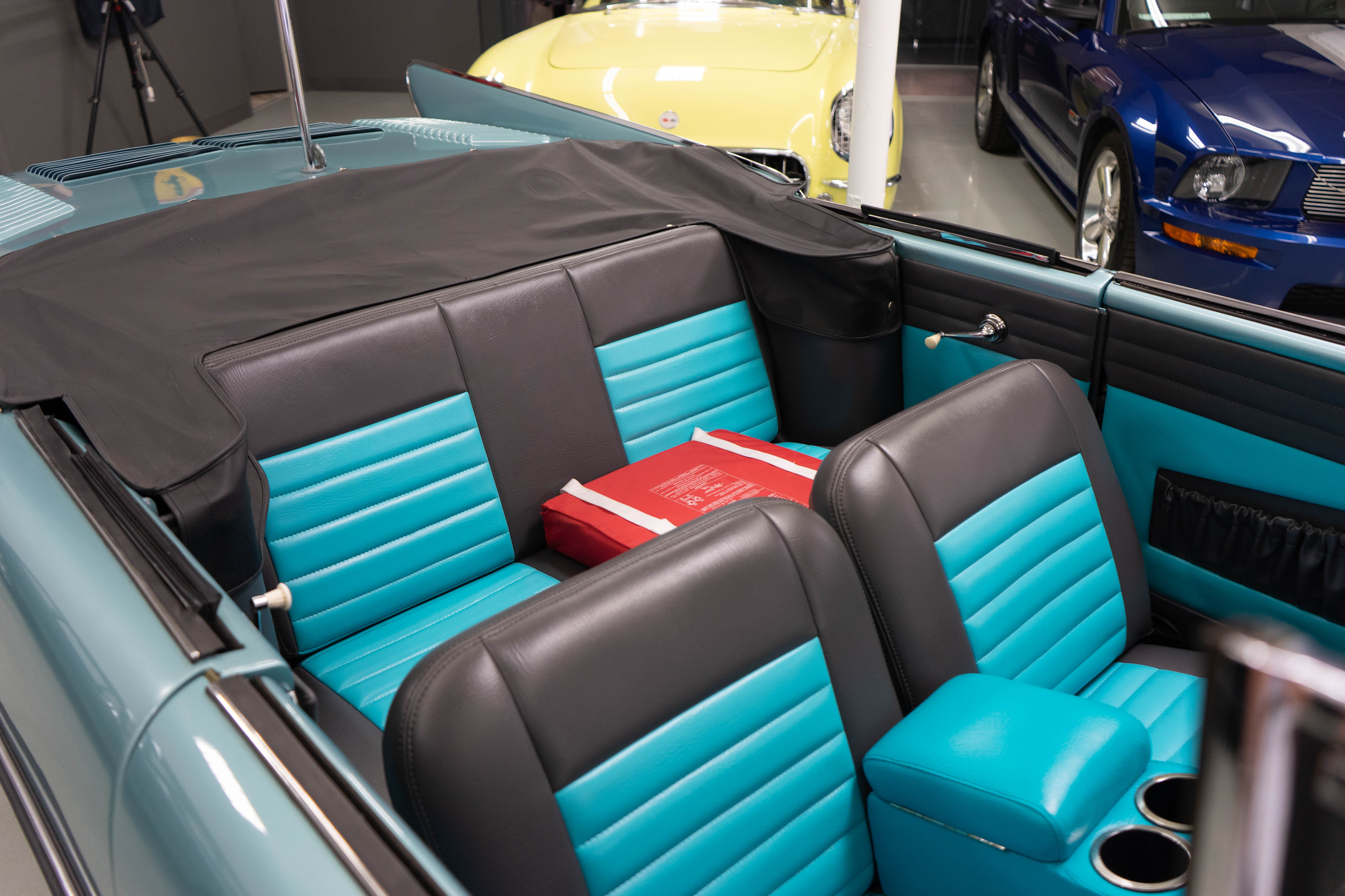 All of the typical full-restoration boxes were checked, with engine, suspension, brakes, drivetrain & electrics all refurbished. The solid hull was stripped to metal and refinished in this beautiful aqua green, with an all-new matching two-tone interior and new convertible top. The engine has been upgraded with fuel injection and numerous other new technologies have been added, like a marine band radio for when you’re out of sight of land, modern sound system, improved cooling with supplemental fans, upgraded alternator and nice touches like the finned aluminum valve cover.
