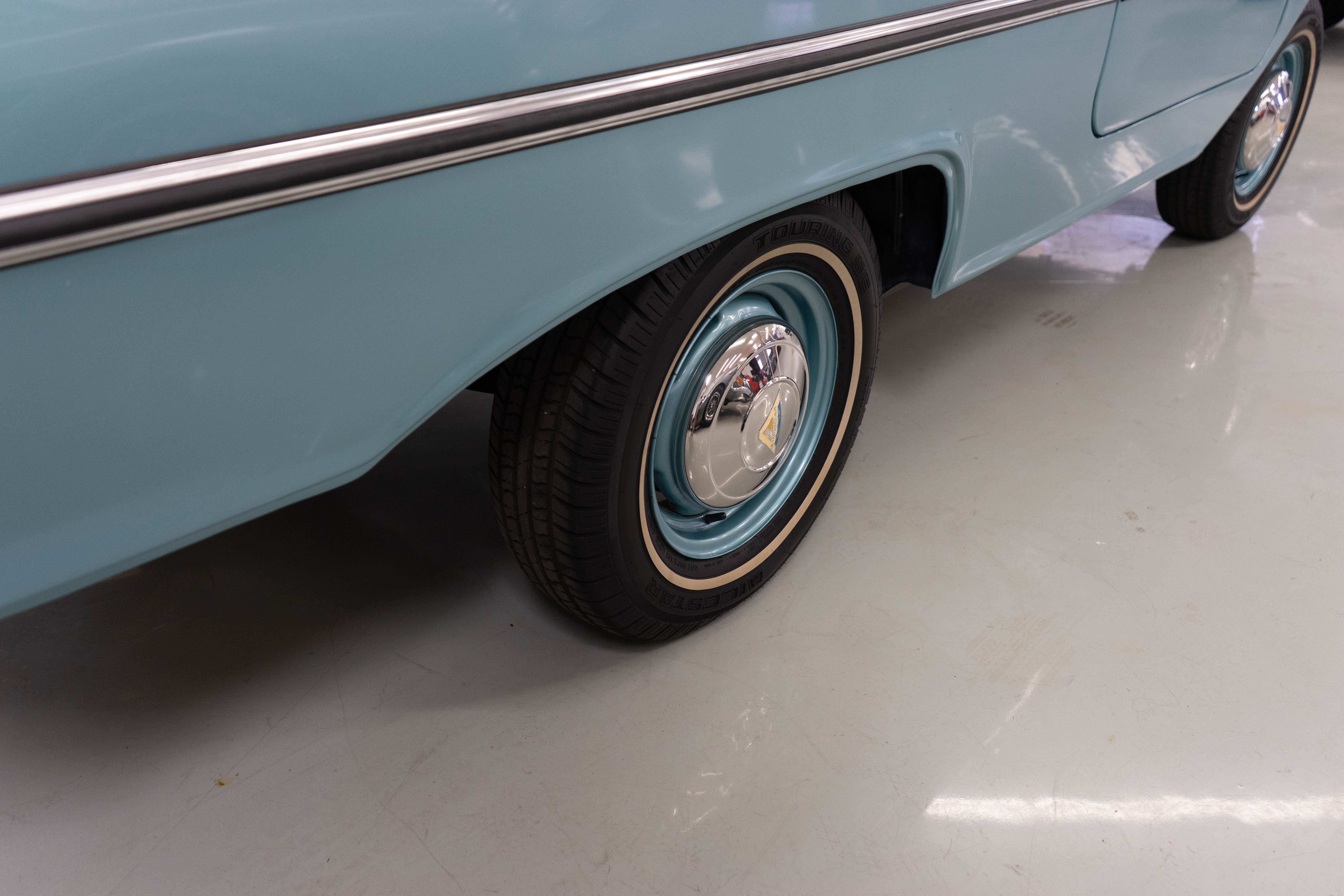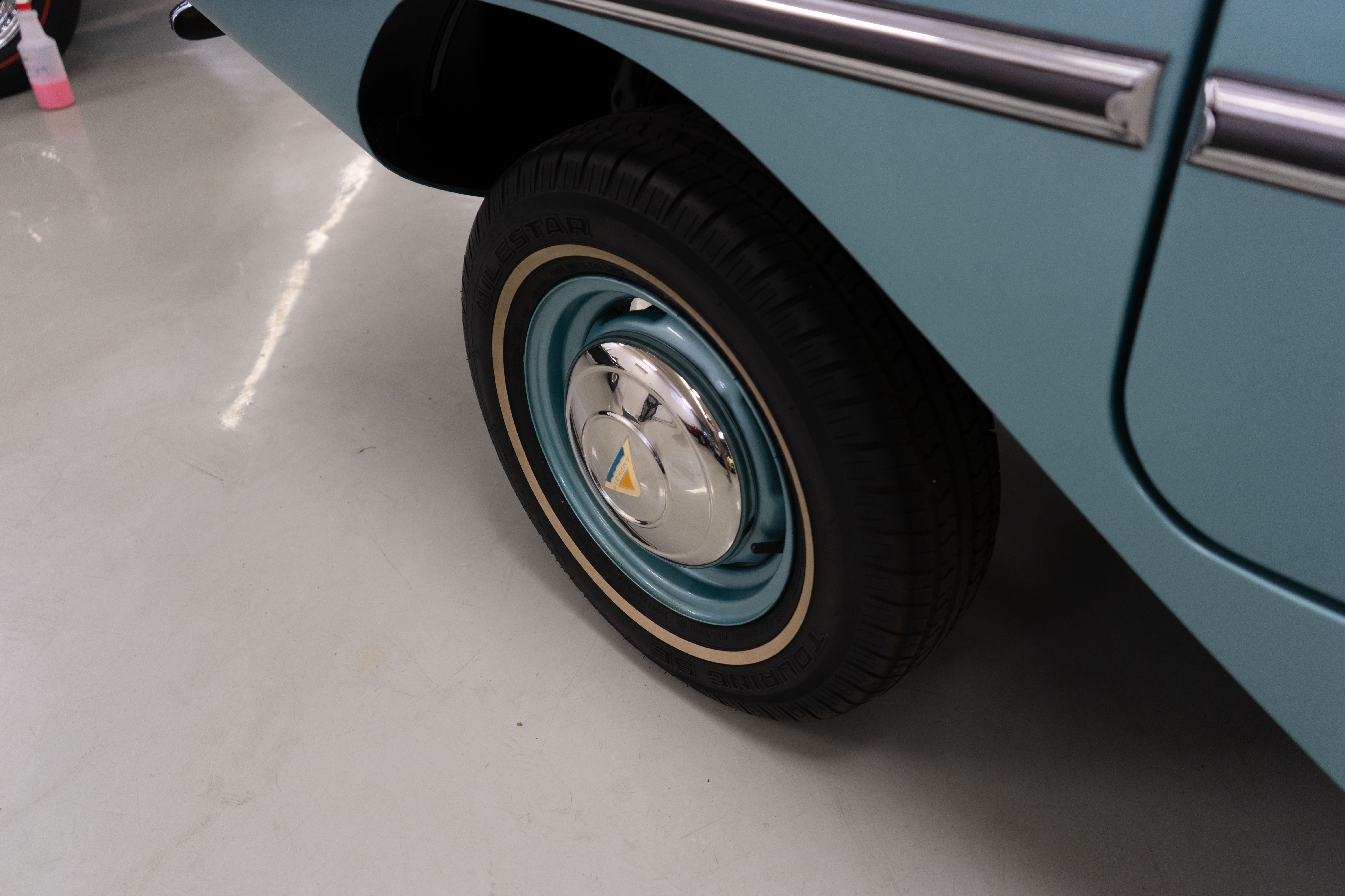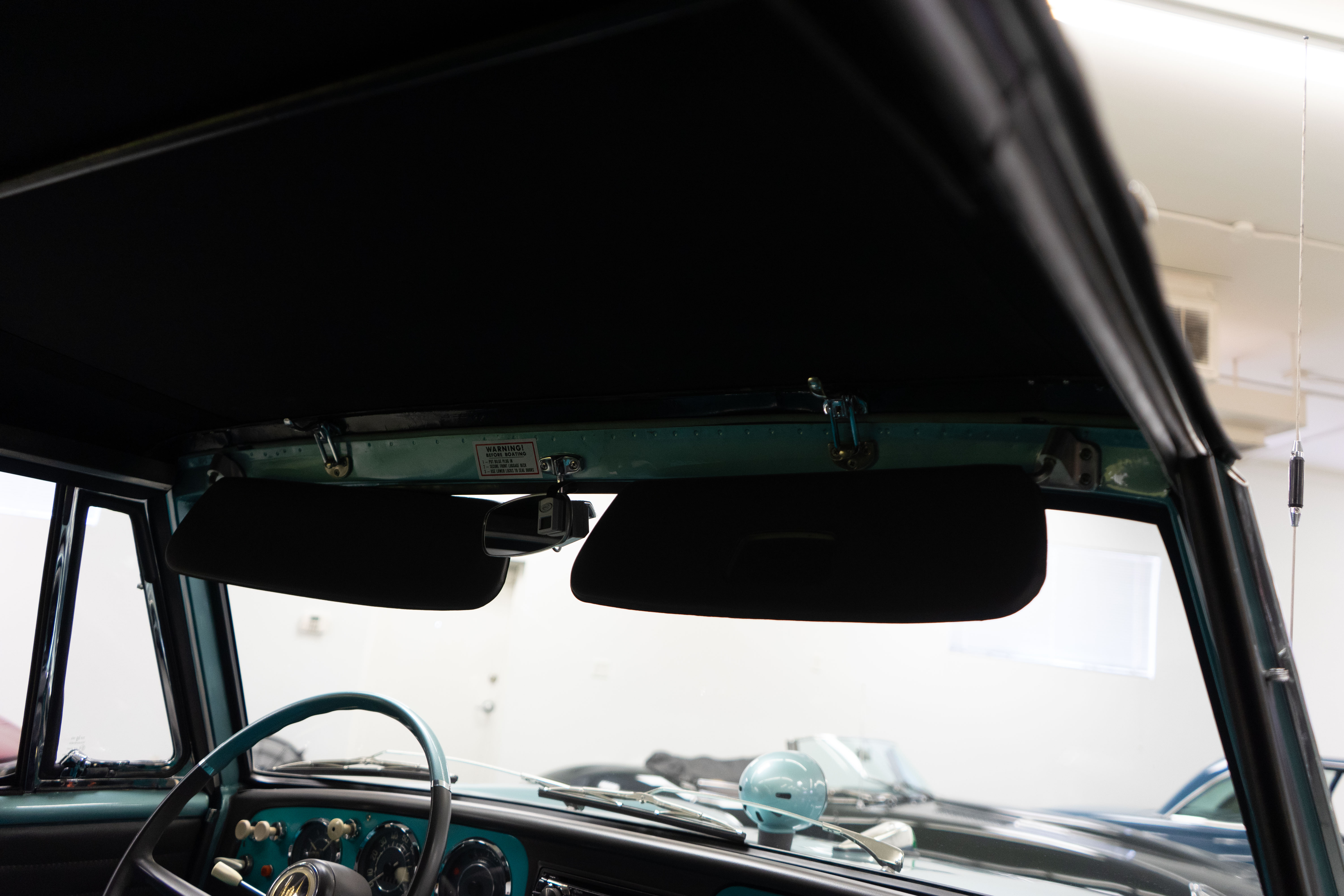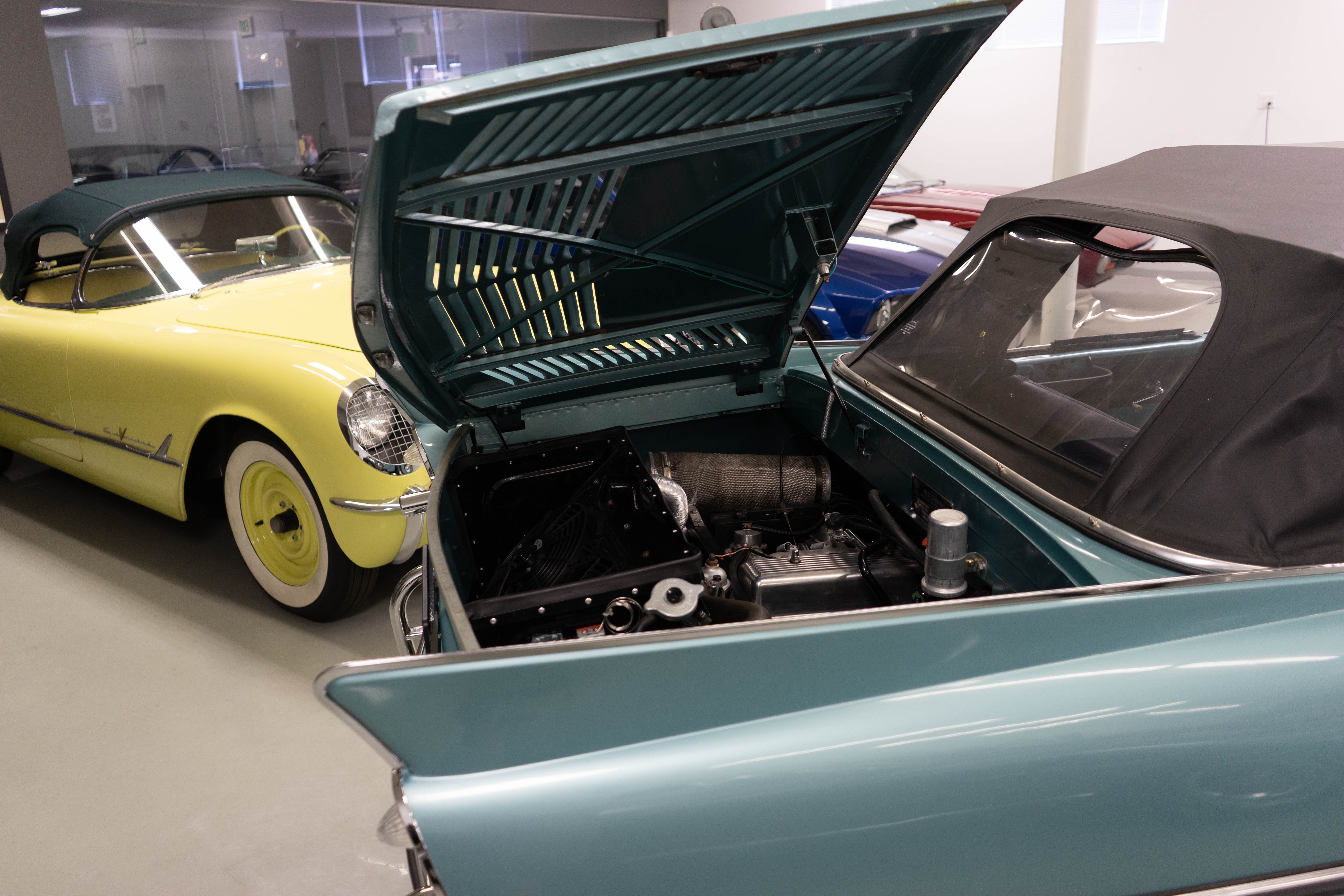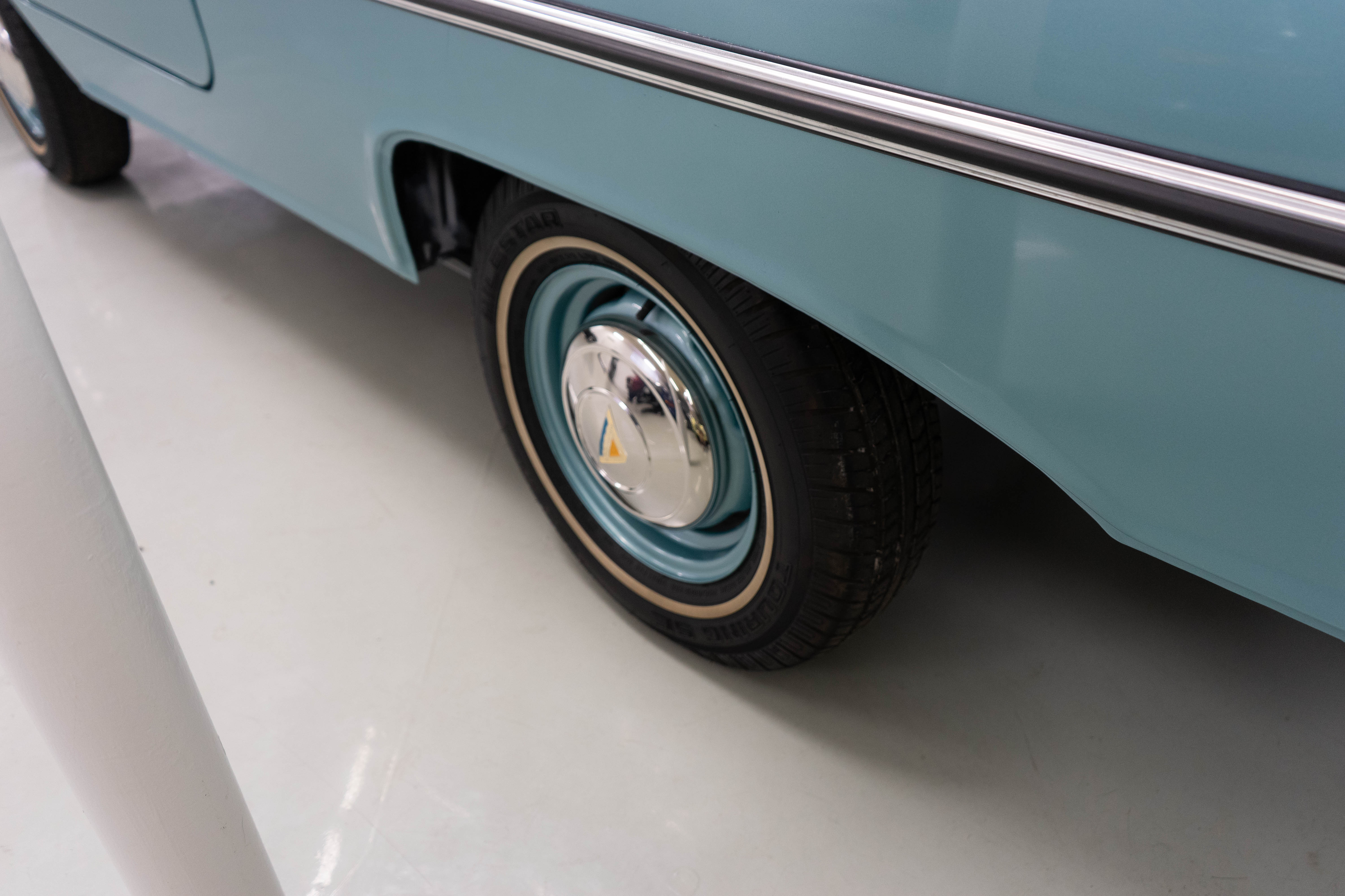 All of the typical full-restoration boxes were checked, with engine, suspension, brakes, drivetrain & electrics all refurbished. The solid hull was stripped to metal and refinished in this beautiful aqua green, with an all-new matching two-tone interior and new convertible top. The engine has been upgraded with fuel injection and numerous other new technologies have been added, like a marine band radio for when you’re out of sight of land, modern sound system, improved cooling with supplemental fans, upgraded alternator and nice touches like the finned aluminum valve cover.