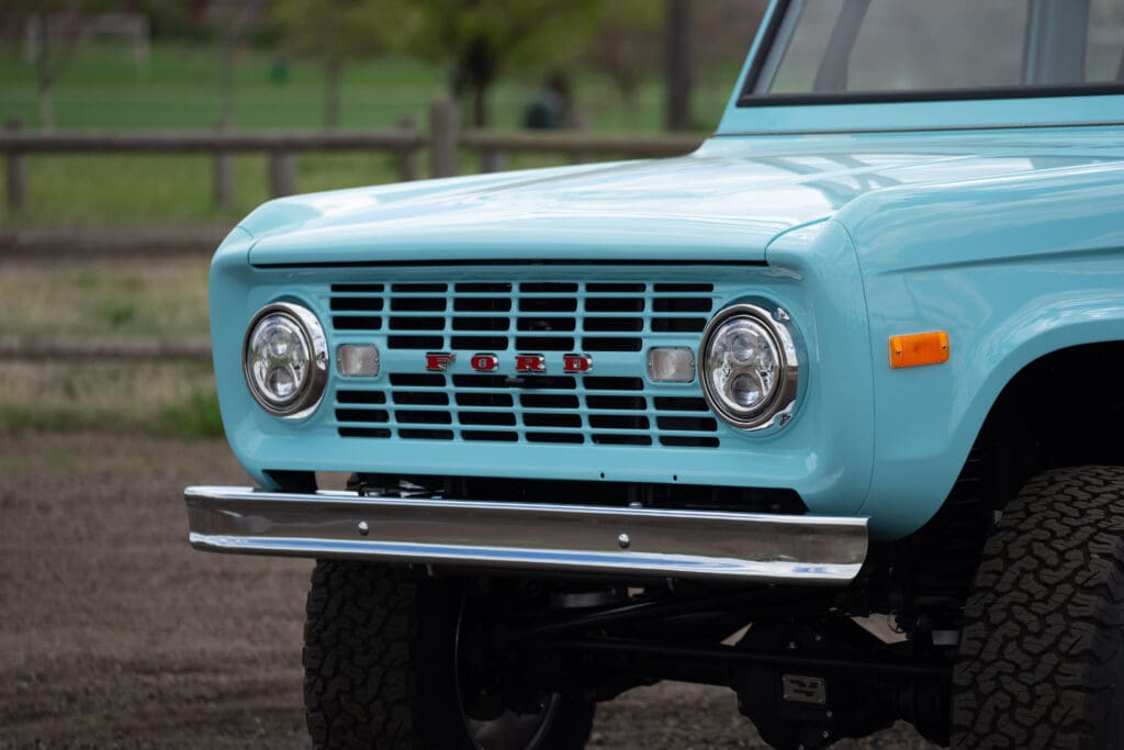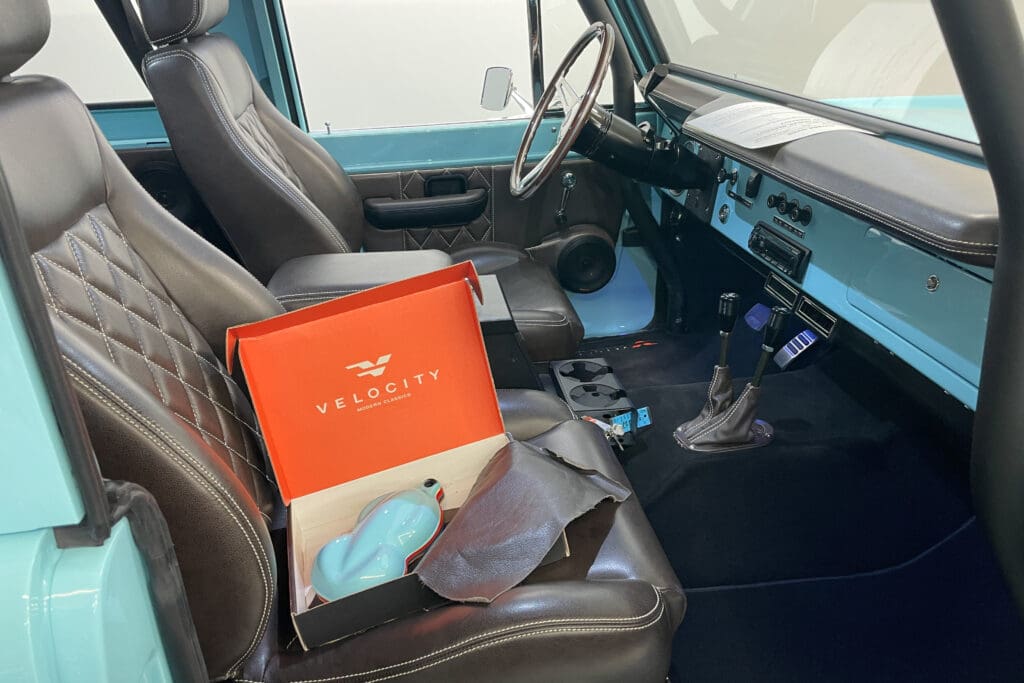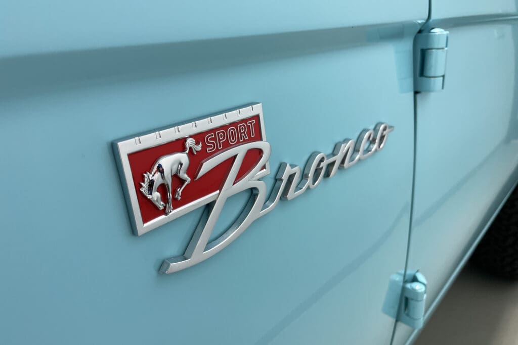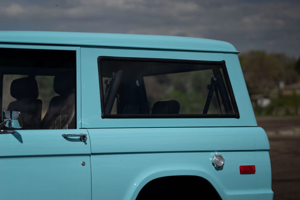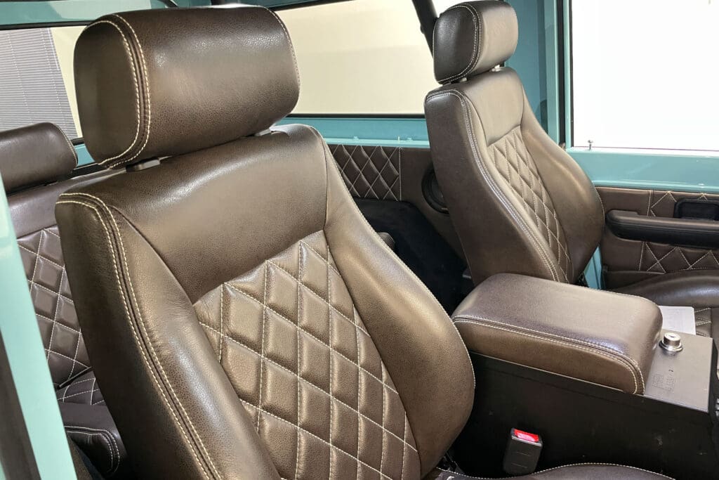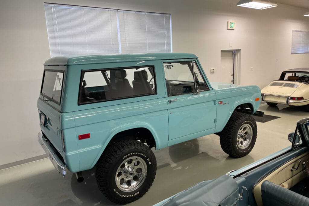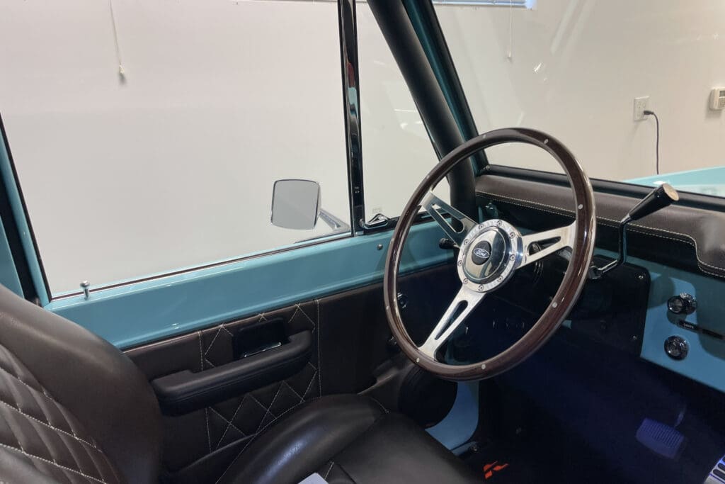 This iconic vintage SUV boasts not only its classic charm but also modern power and performance enhancements. Under the hood roars a potent Coyote Gen 3 engine, a modern 5.0L 32-valve DOHC V-8 powerhouse featuring Direct and Port Fuel Injection, Ti-VCT (Twin Independent Variable Camshaft Timing), high-flow cylinder heads, and a heightened compression ratio to deliver robust power and efficiency. Paired with a Ford 6R80 6-speed, automatic transmission and an Atlas military-grade transfer case, this Bronco offers a driving experience that combines nostalgic aesthetics with contemporary power and versatility. Every detail of this restoration has been carefully considered, from its rugged exterior (painted in its original Ford Frost Turquoise) to its finely appointed custom interior, ensuring both style and substance. A custom-spec’d roll cage features seat belt anchors for all four seats, as well as a highway-sturdy safari top, should you choose to remove the hard top