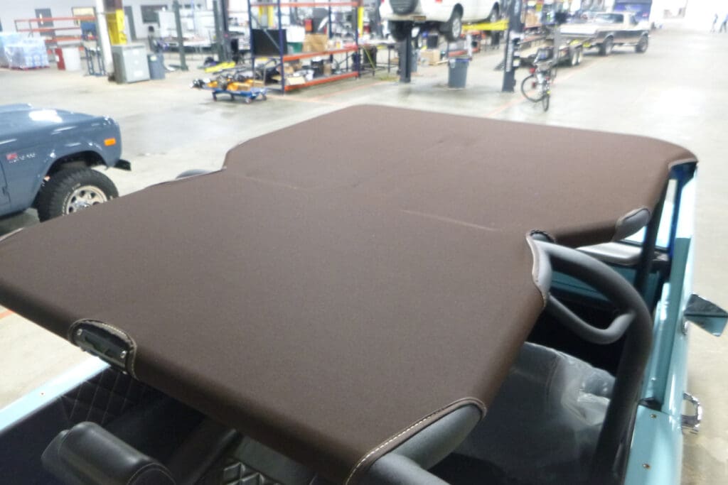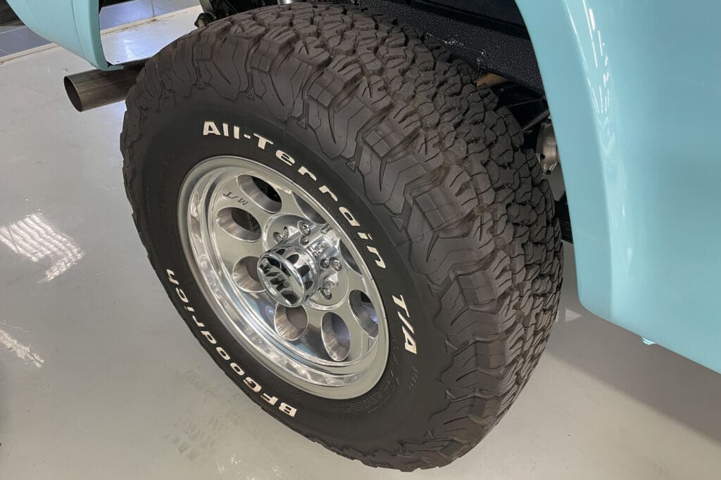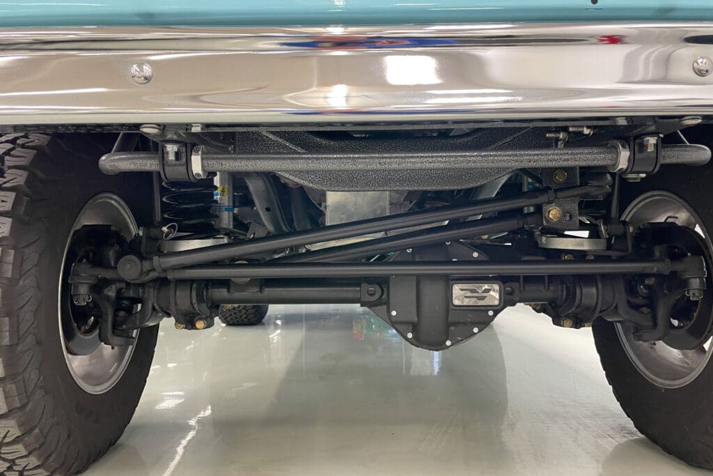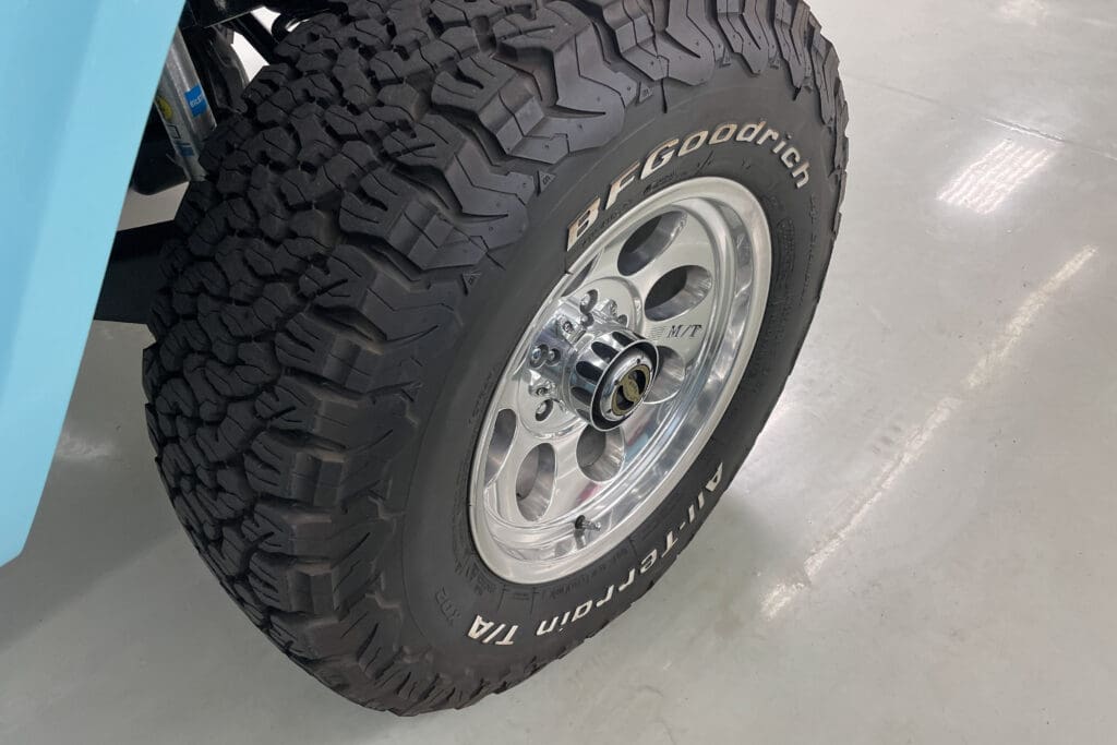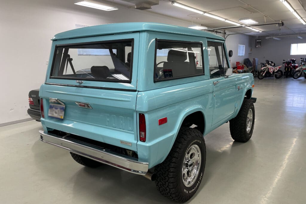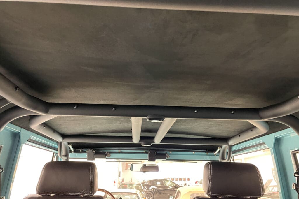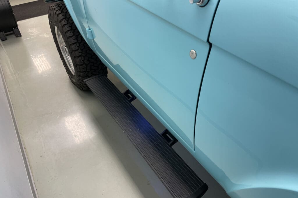 This iconic vintage SUV boasts not only its classic charm but also modern power and performance enhancements. Under the hood roars a potent Coyote Gen 3 engine, a modern 5.0L 32-valve DOHC V-8 powerhouse featuring Direct and Port Fuel Injection, Ti-VCT (Twin Independent Variable Camshaft Timing), high-flow cylinder heads, and a heightened compression ratio to deliver robust power and efficiency. Paired with a Ford 6R80 6-speed, automatic transmission and an Atlas military-grade transfer case, this Bronco offers a driving experience that combines nostalgic aesthetics with contemporary power and versatility. Every detail of this restoration has been carefully considered, from its rugged exterior (painted in its original Ford Frost Turquoise) to its finely appointed custom interior, ensuring both style and substance. A custom-spec’d roll cage features seat belt anchors for all four seats, as well as a highway-sturdy safari top, should you choose to remove the hard top