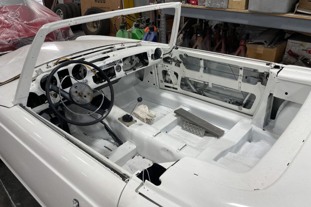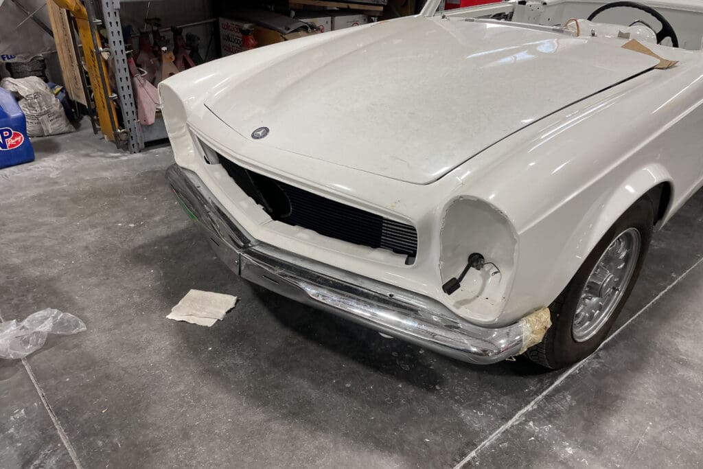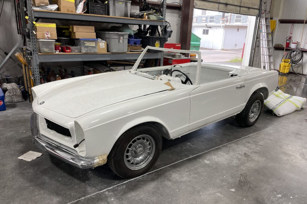 This 1967 Mercedes Benz 230SL shows off a previous repaint in white, but otherwise shows pretty good bones. When it came in the car had plenty of extra parts that our team has begun to document. Our shop owner, Jack, picked this one up for our team to address a few larger issues before we get this classic ready to go up for sale in the showroom. Keep an eye out for this Classic Benz coming soon!