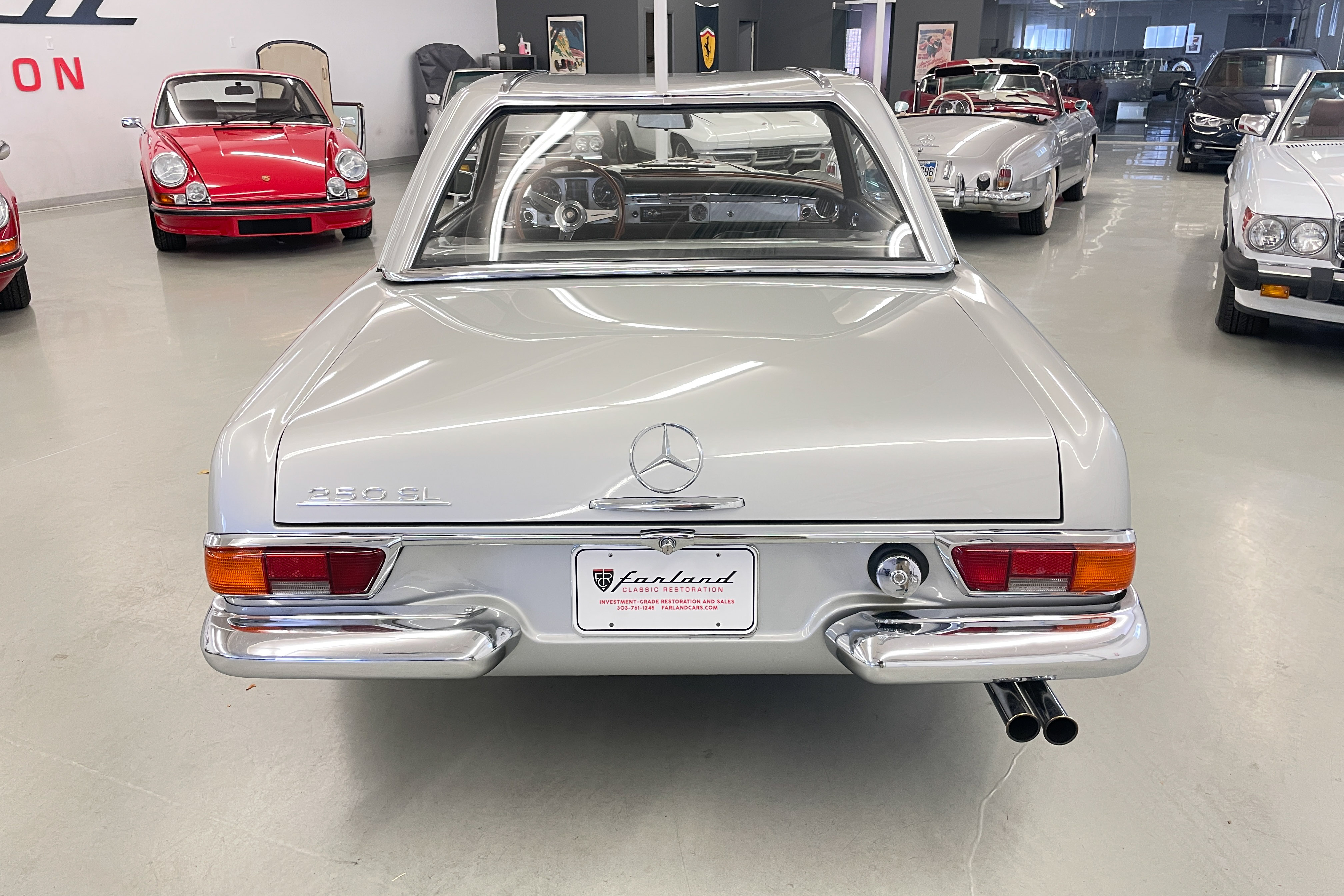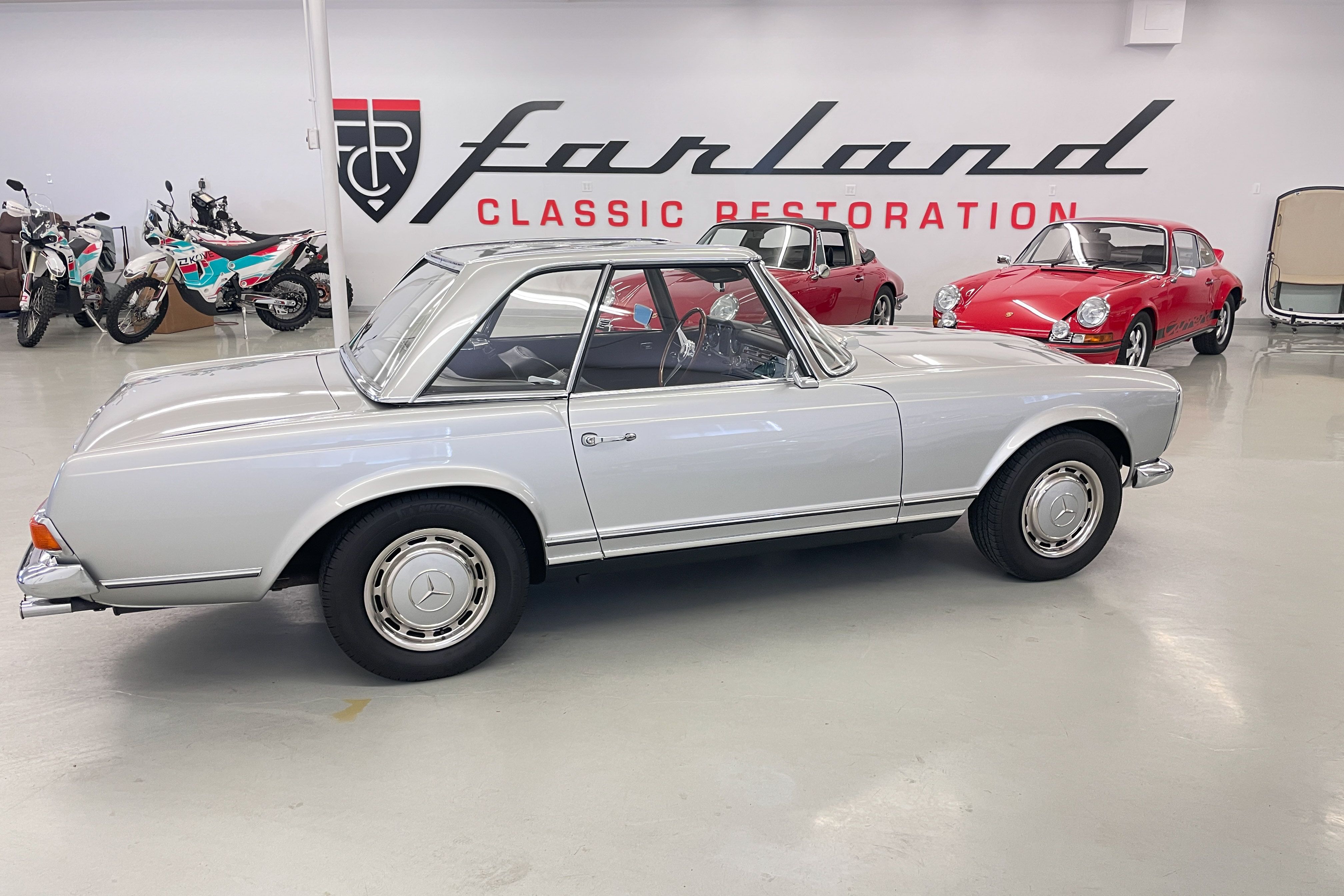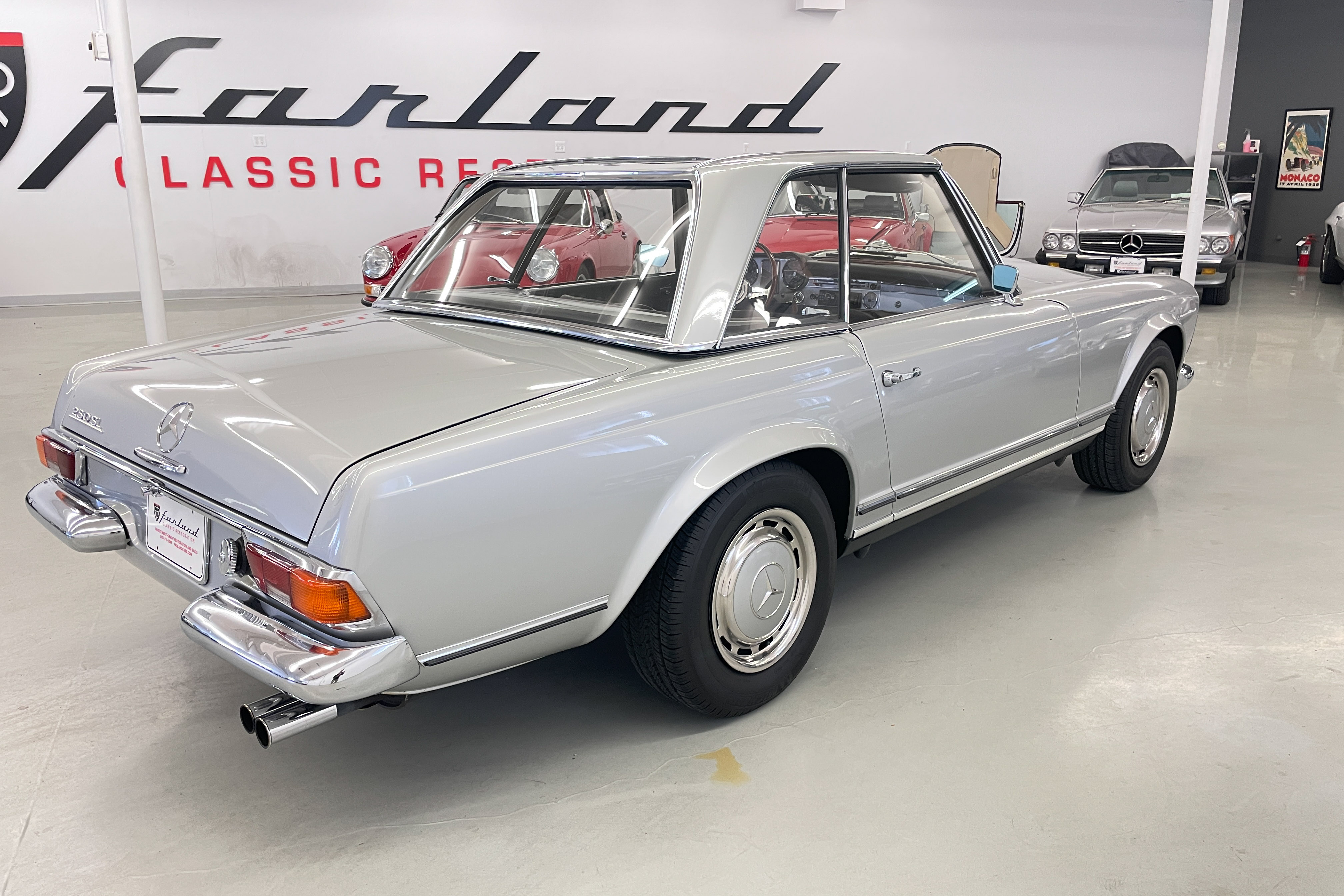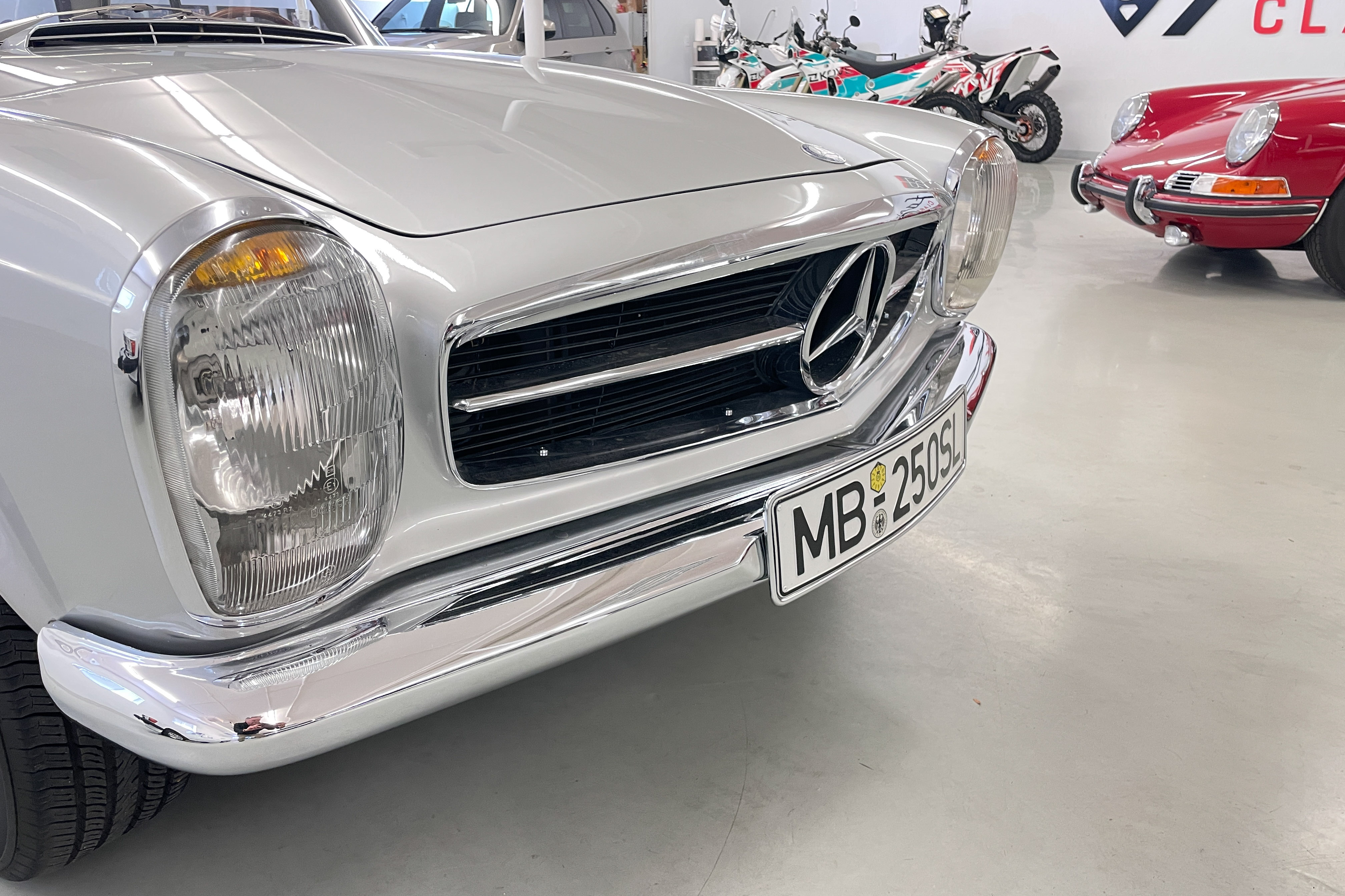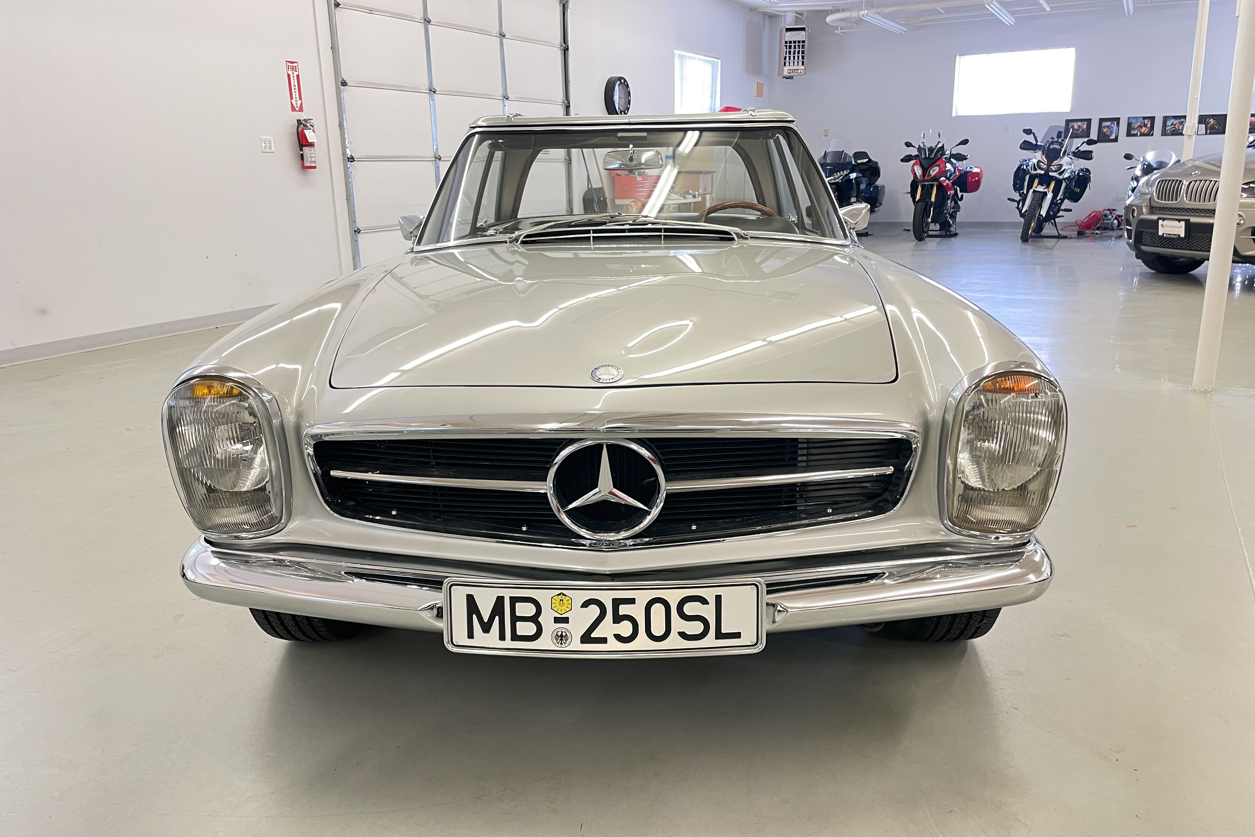 We consider this car a really nice driver-level example because it runs like a top, has great paint, interior & mechanical condition. The bodywork is straight and rust free with excellent chrome, too. The manual 4-speed is a big plus and is far more fun to drive than the automatics so often found in these 113 cars. Originally built in Signal Red, it was comprehensively changed to Silver before even leaving Germany. During its restoration years ago—a restoration that was engine-out, so even the engine compartment looks right. And it still has the original ‘notches’ in the front fenders!