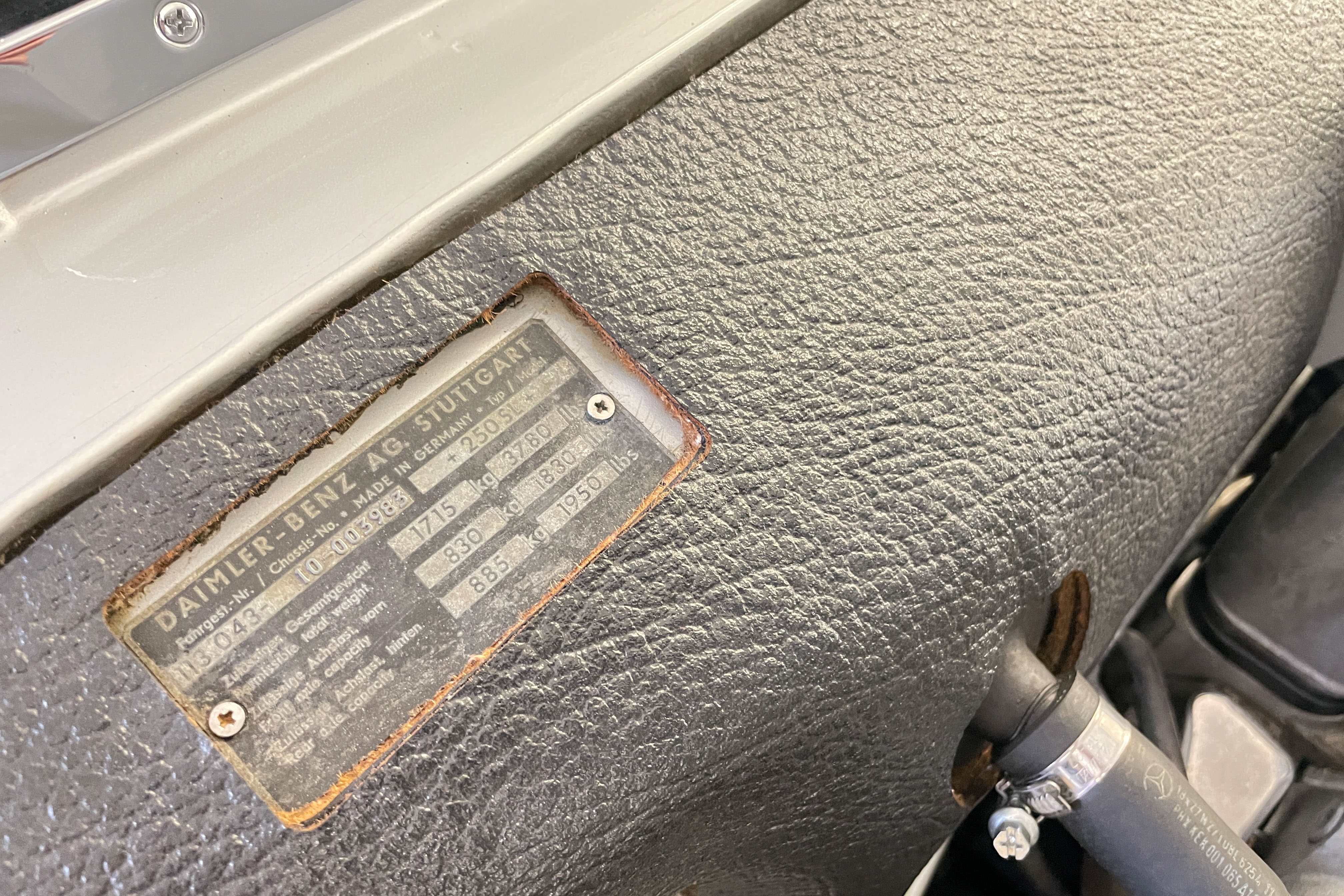 Along with all wear-related components—like exhaust, brakes, etc—the car was upgraded with new glass, suspension rebuild, inertia-reel seatbelts and novel extras like heated seats (!) in genuine leather—not MB-Tex—and a modern stereo system. Also included is an official Mercedes data certificate (“Zertifikat”) that shows the engine is the original one and that the car was fitted with a limited-slip diff along with other options.