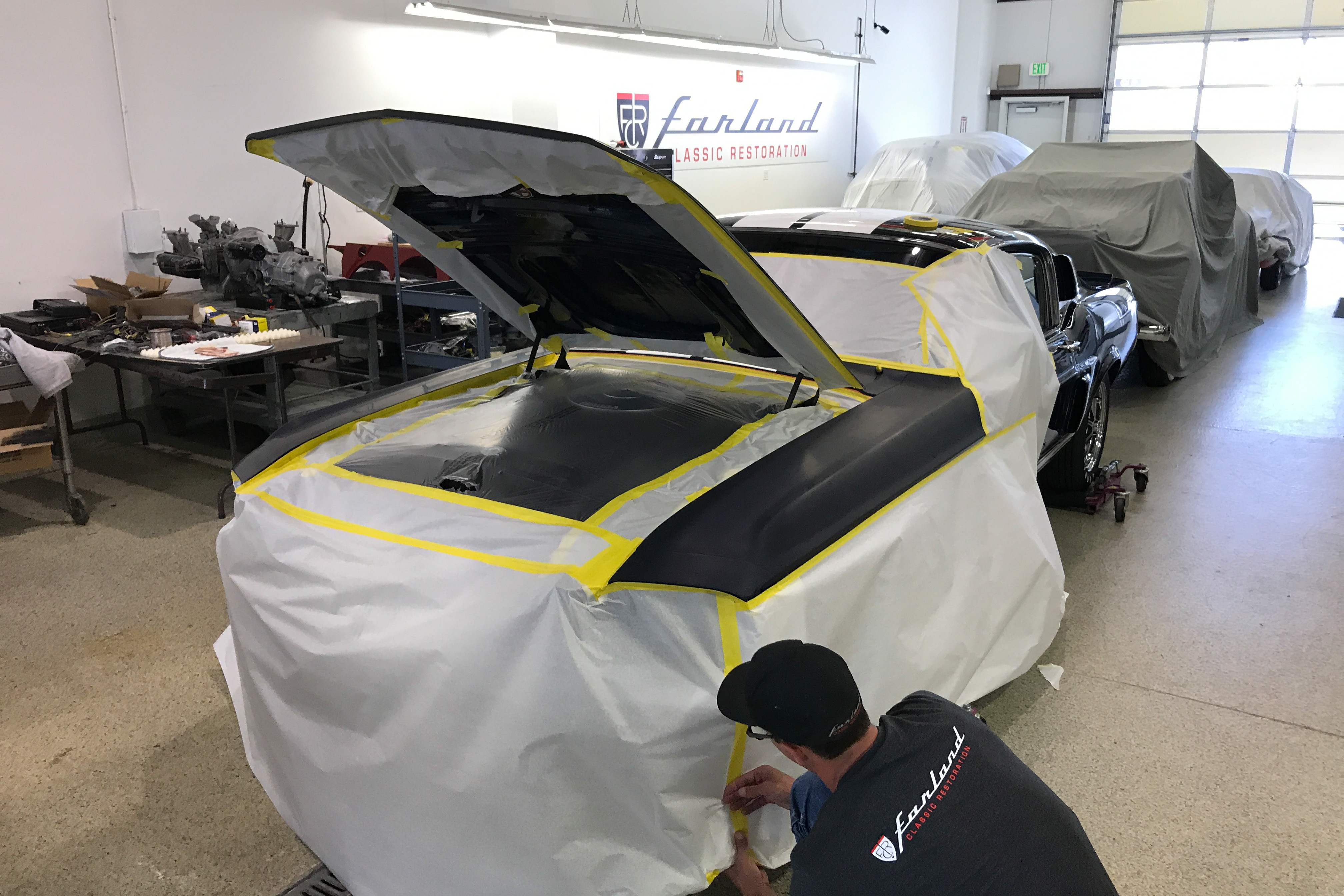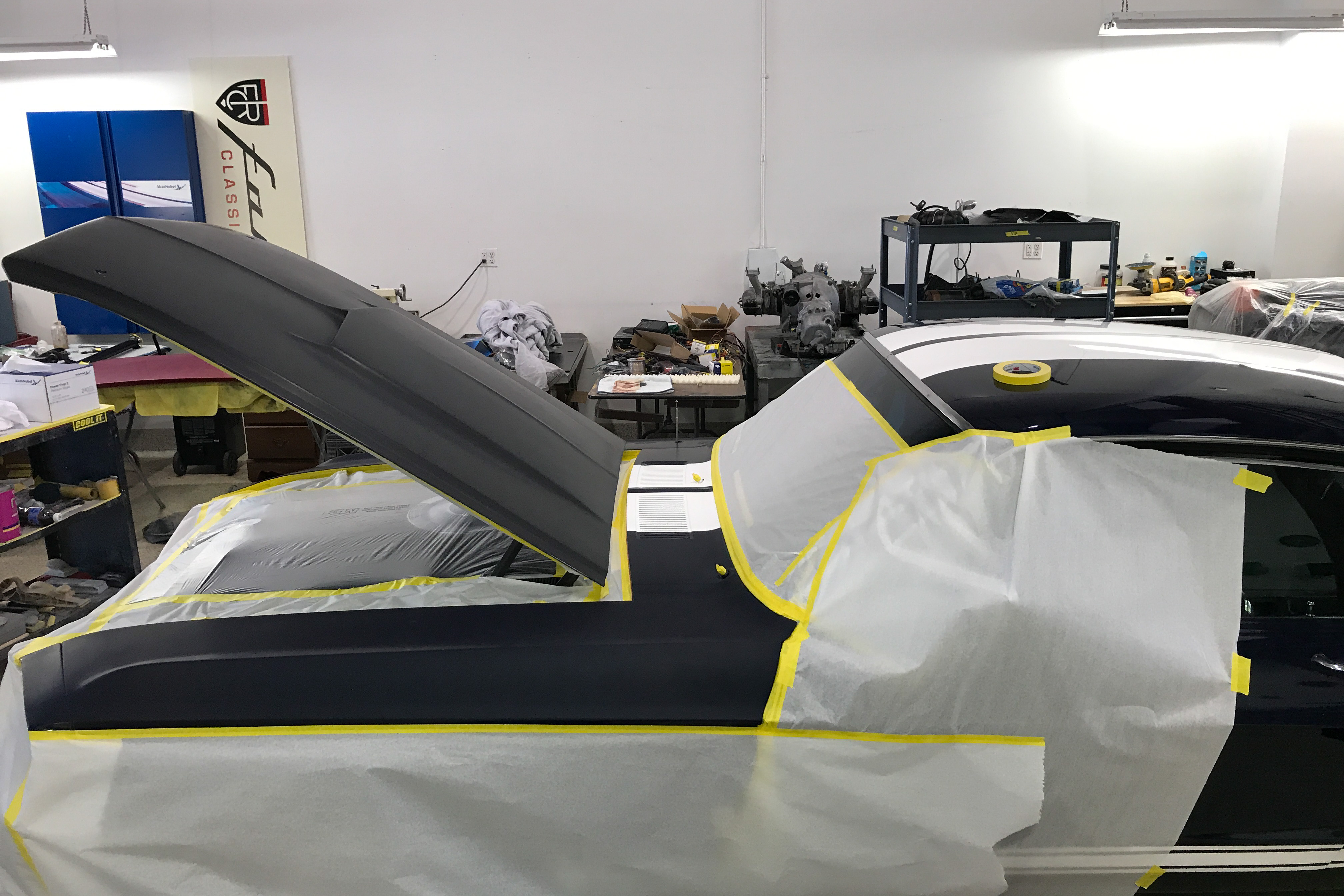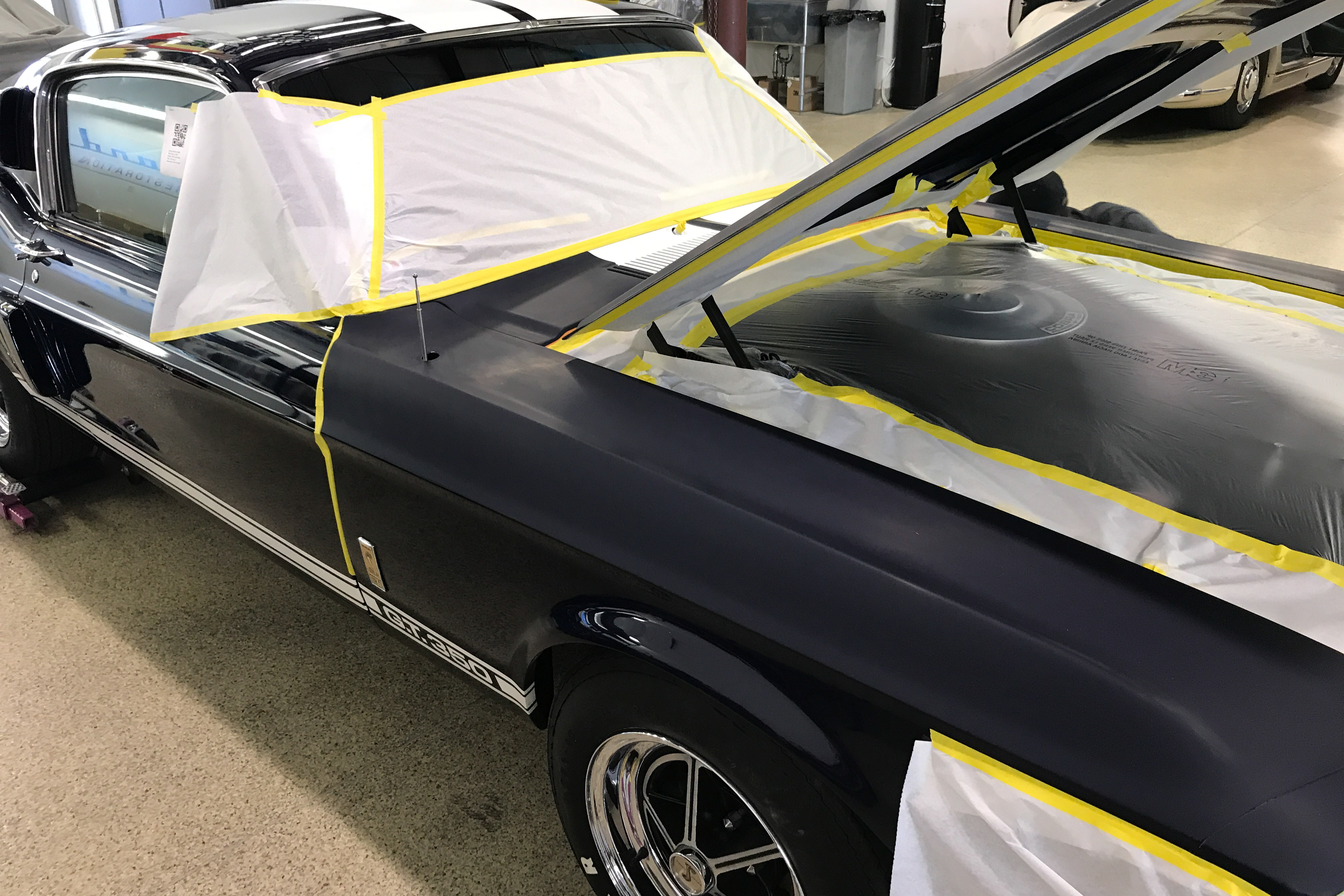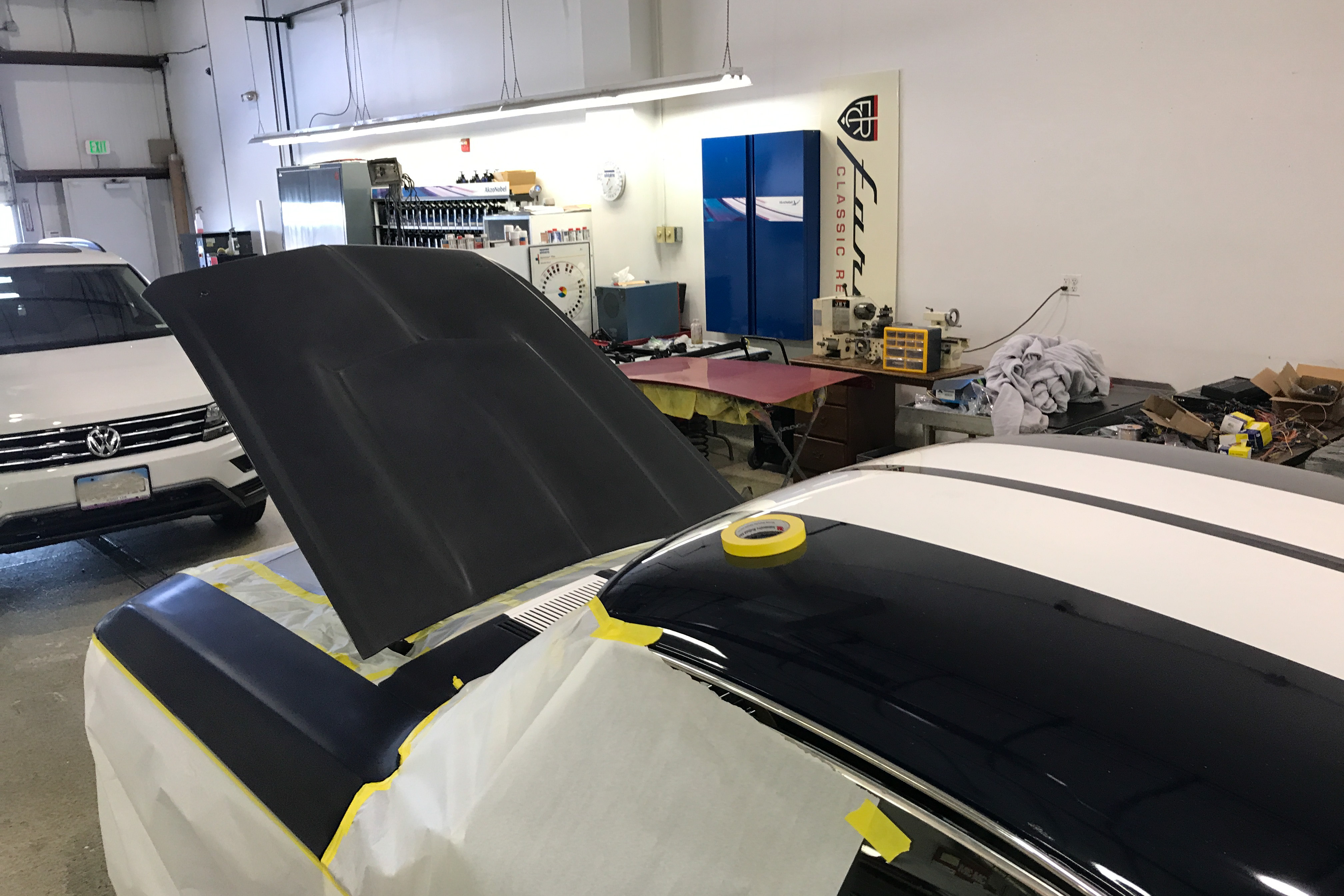 Our body crew had a close look at the hood and stripe area. We removed the previous stripe, matched the paint and re-sprayed the area. Then we re-striped the hood. The result was a seamless match. Now this Shelby is back on the street.