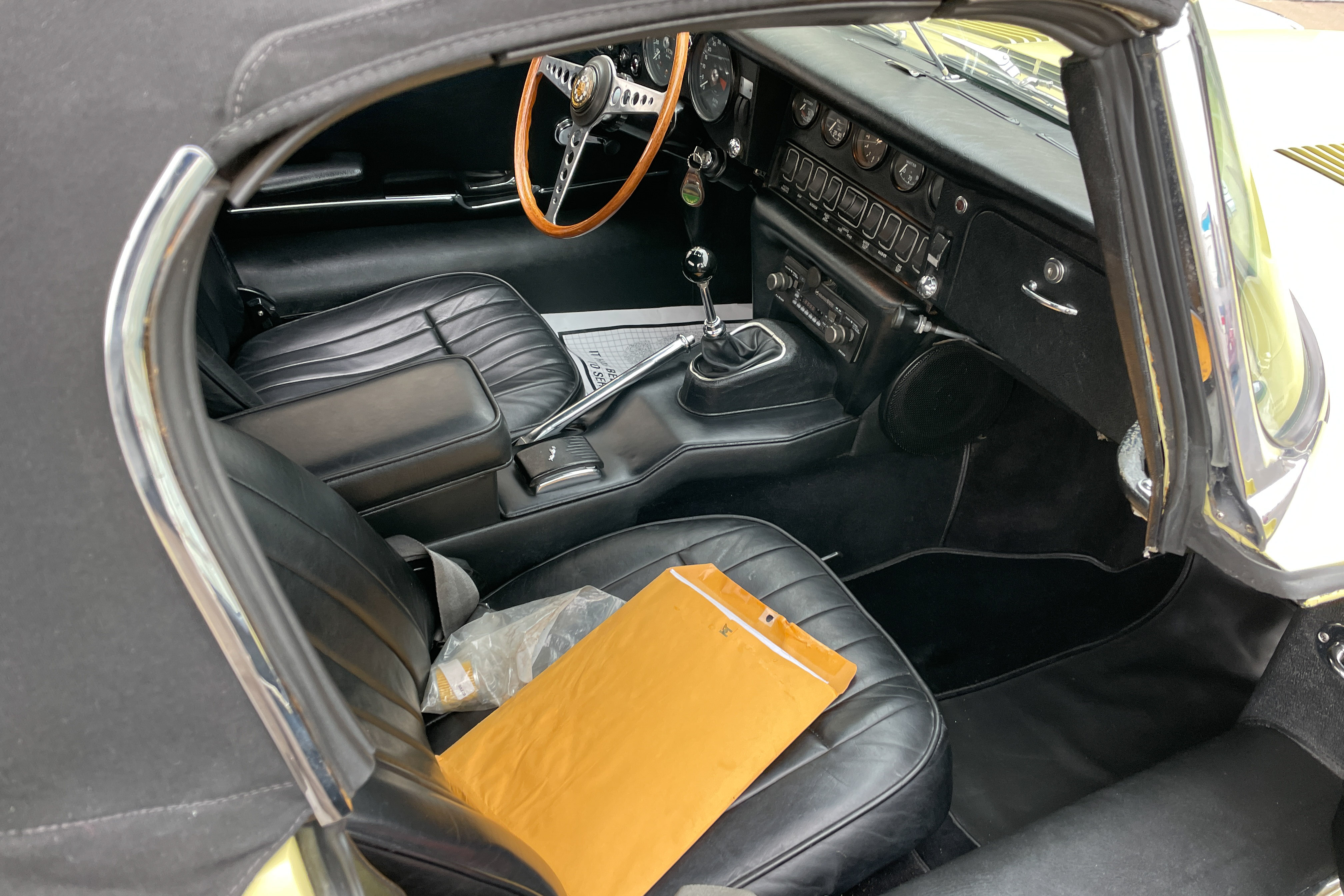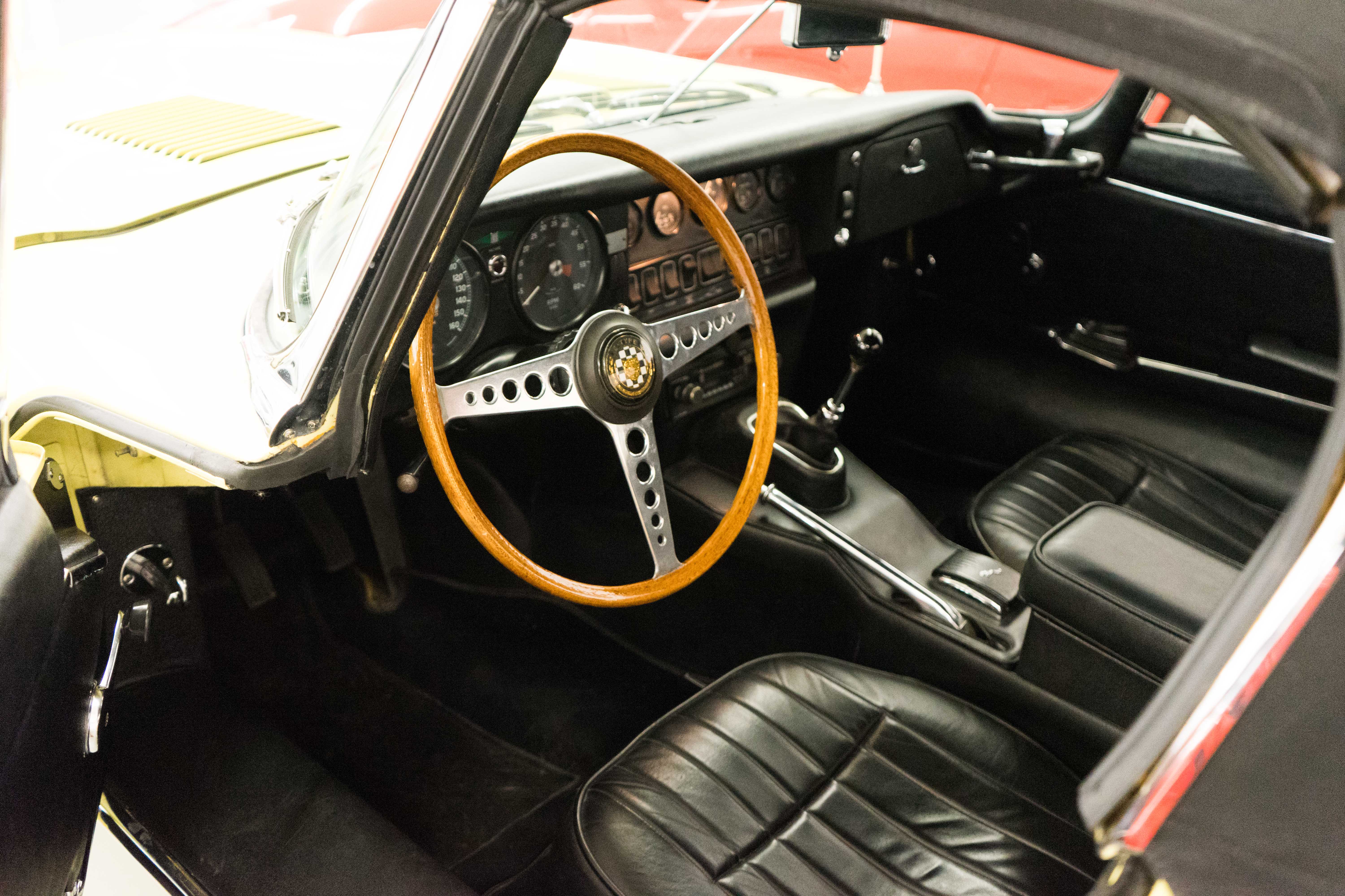 Everybody knows all that, but late in 1967, as Jaguar was transitioning to the Series II version, they made a small number of cars that used up the old components—the small-grille-opening hood (but with open head lights) and the slender turn signals. These unicorns are called the ‘Series 1.5’ and appeal to Jaguar buffs because they have the great original ‘look,’ but not the price premium the first cars command.This is one of those early 1968 Series “1.5” E-types.