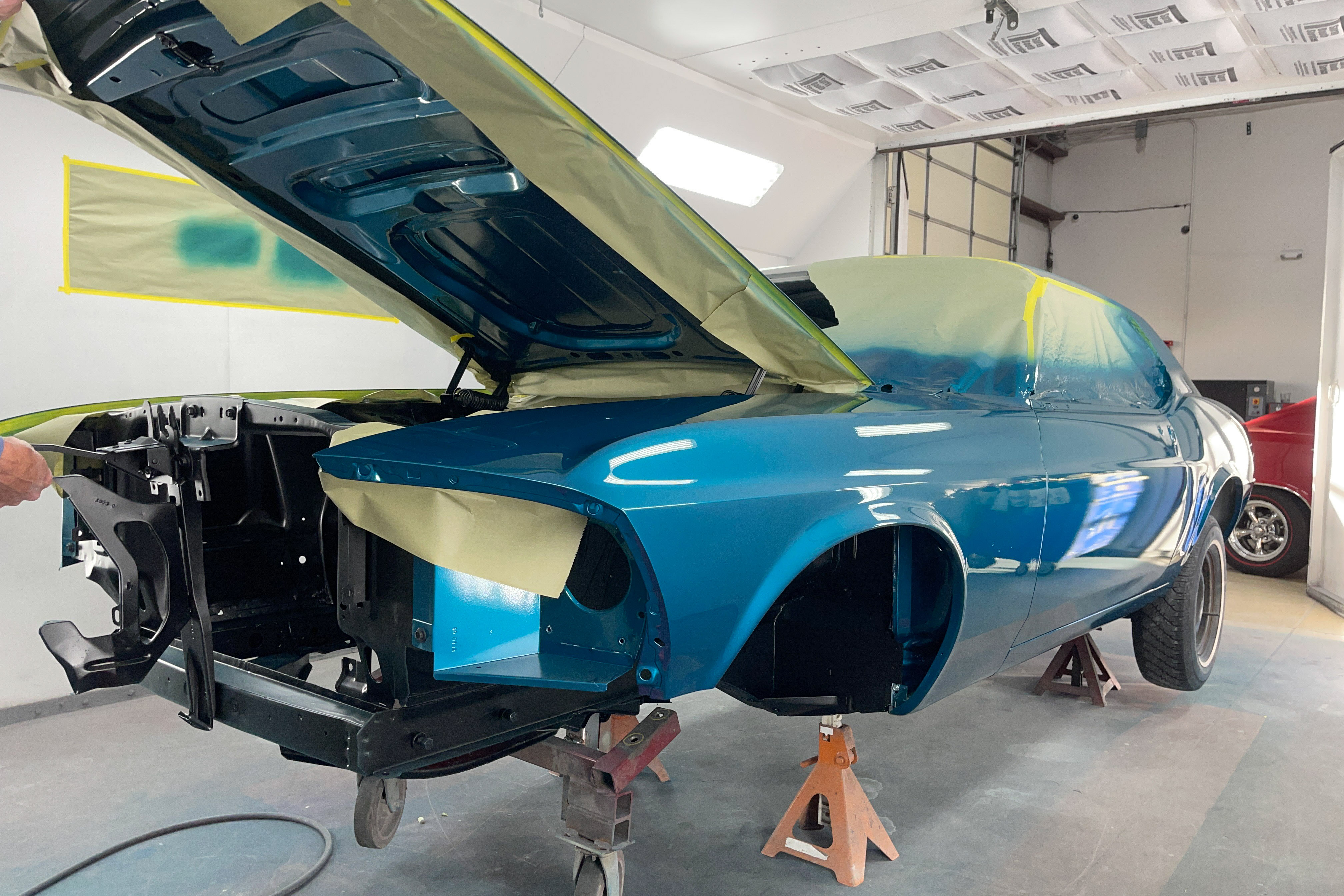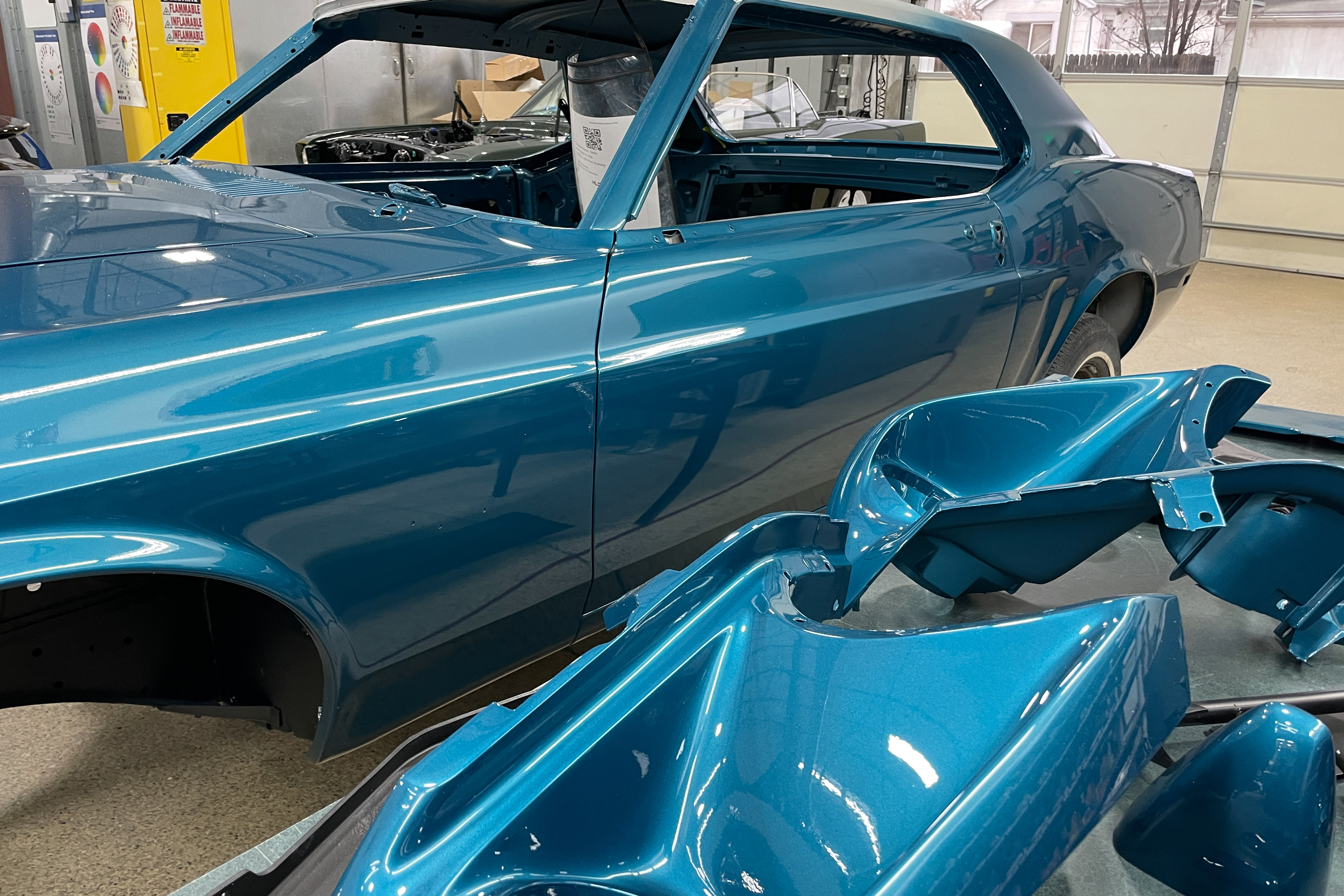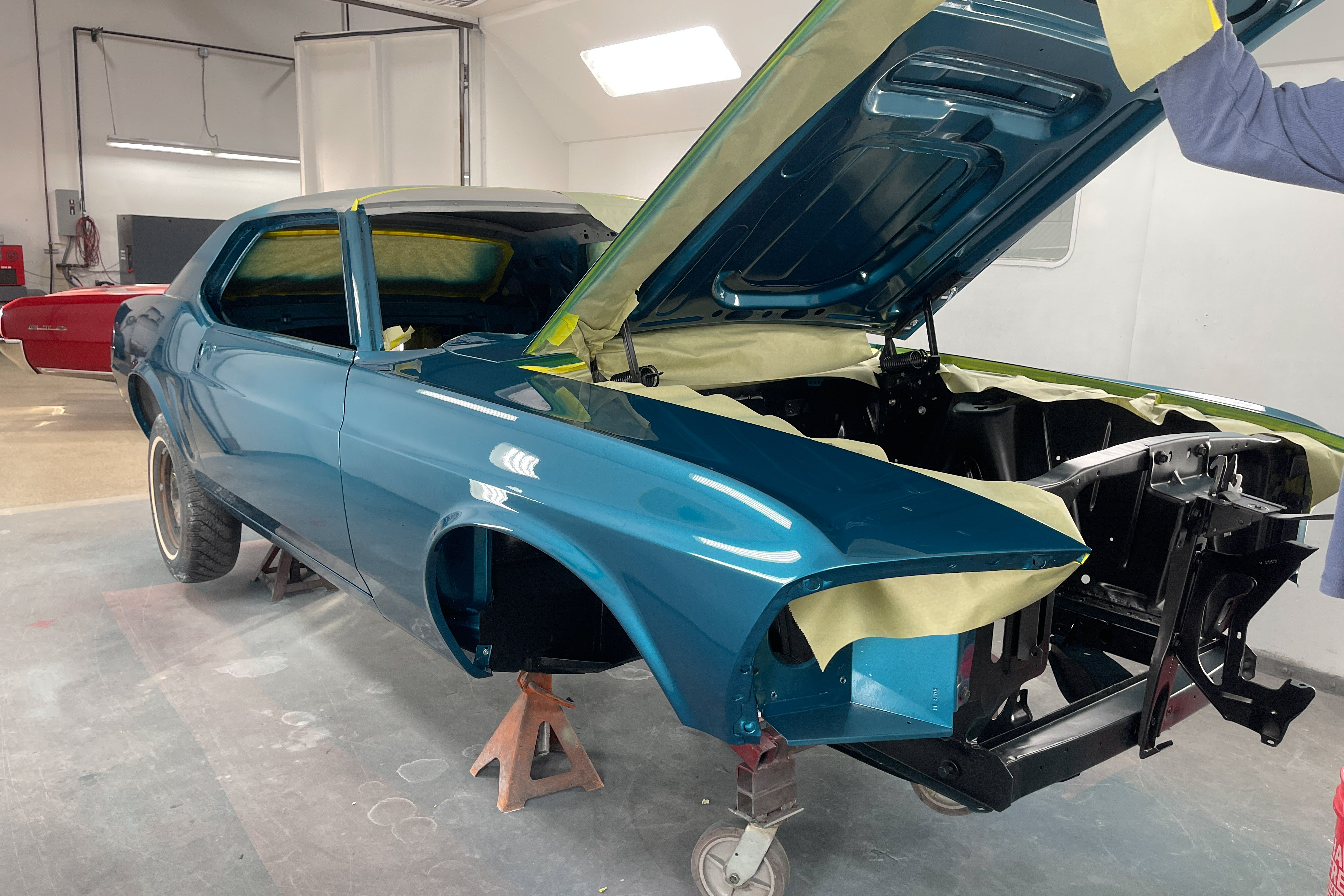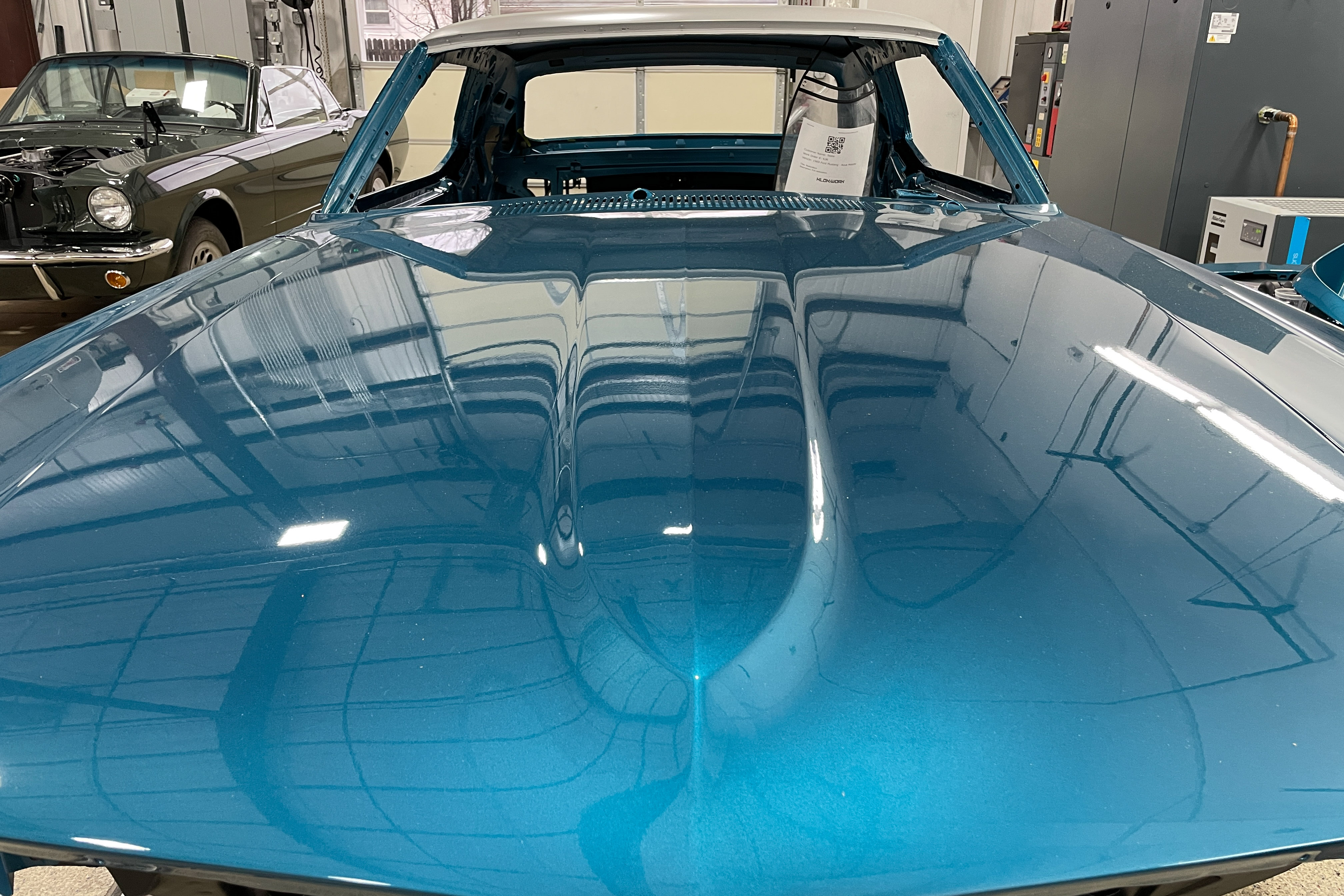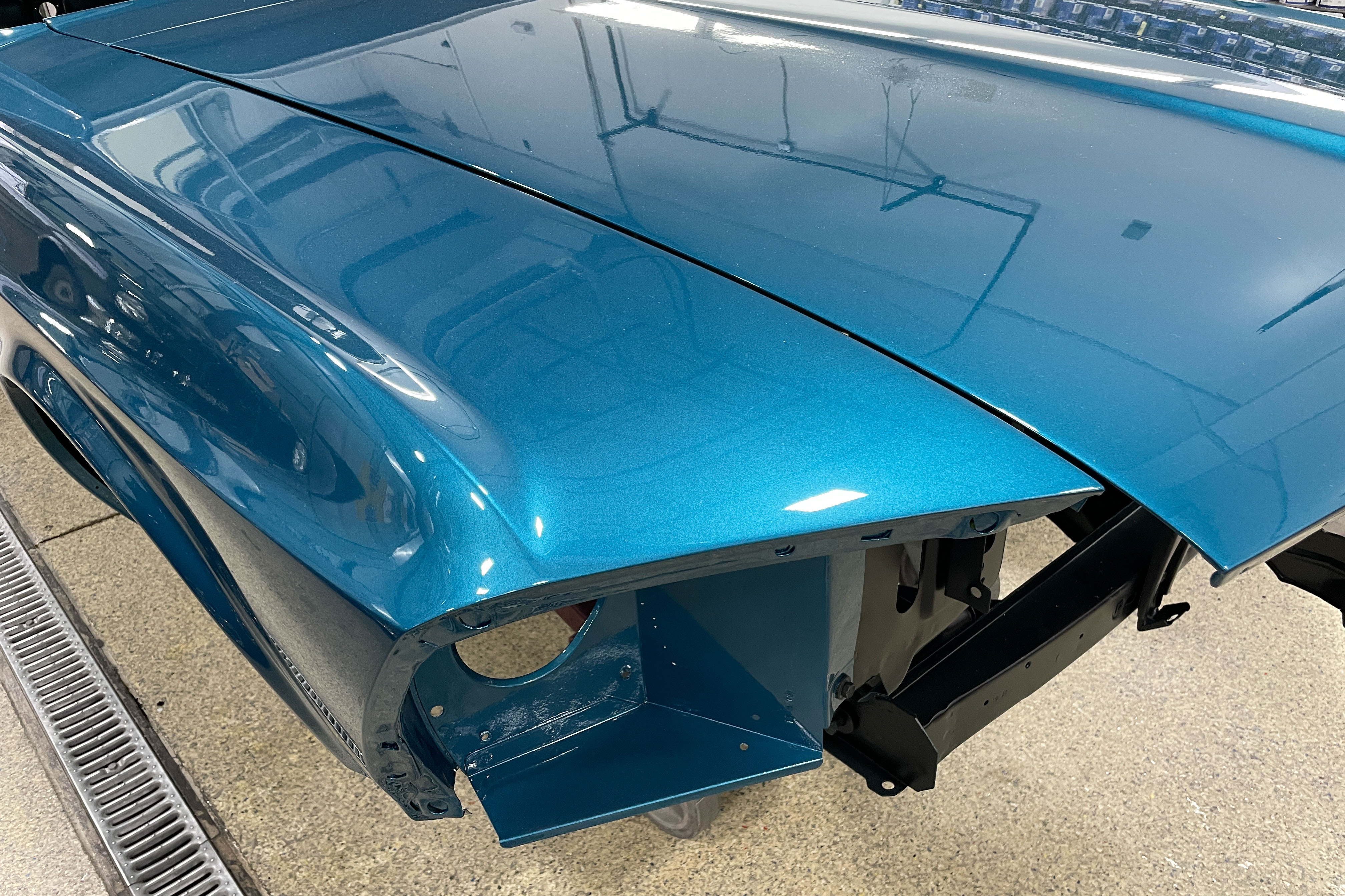This example came to us as a rolling chassis – ready for media blasting, bodywork and paint. We have completed extensive rust repairs and other body damage. Then was more work with primer. Finally, we have applied the first coats of Metallic Teal paint and clear coat. You’ll notice the top was not painted. The factory spec’d vinyl roof with be applied instead.