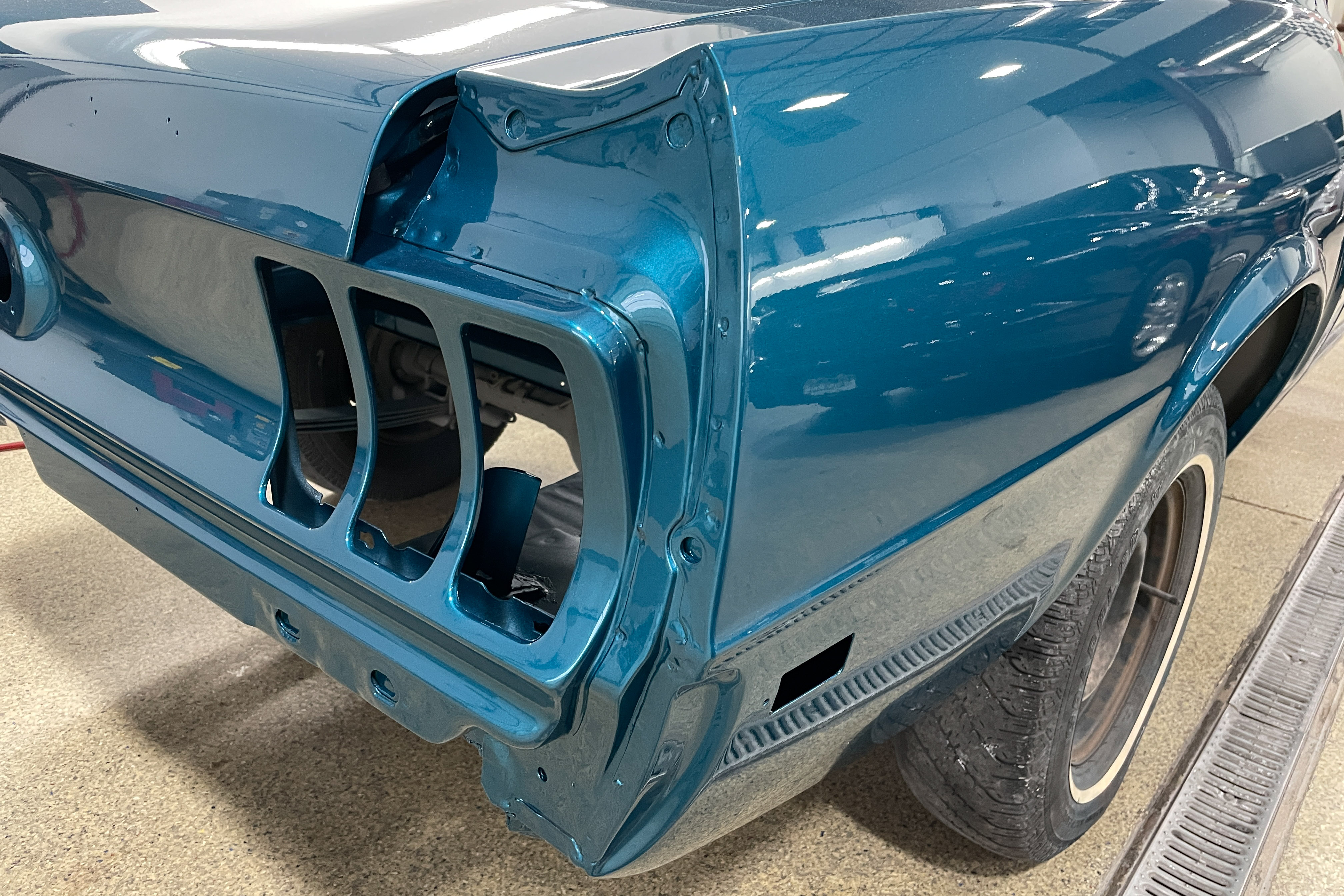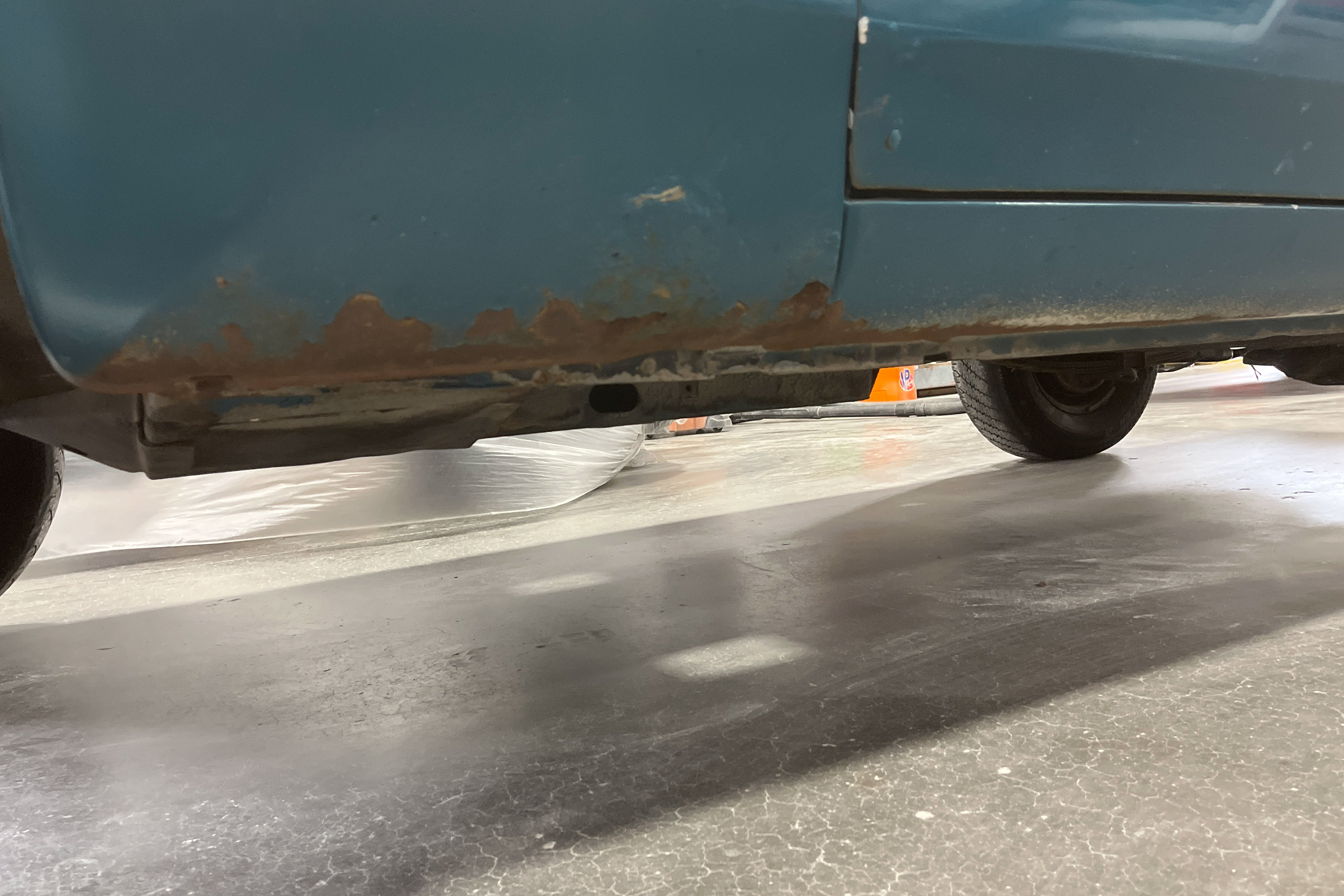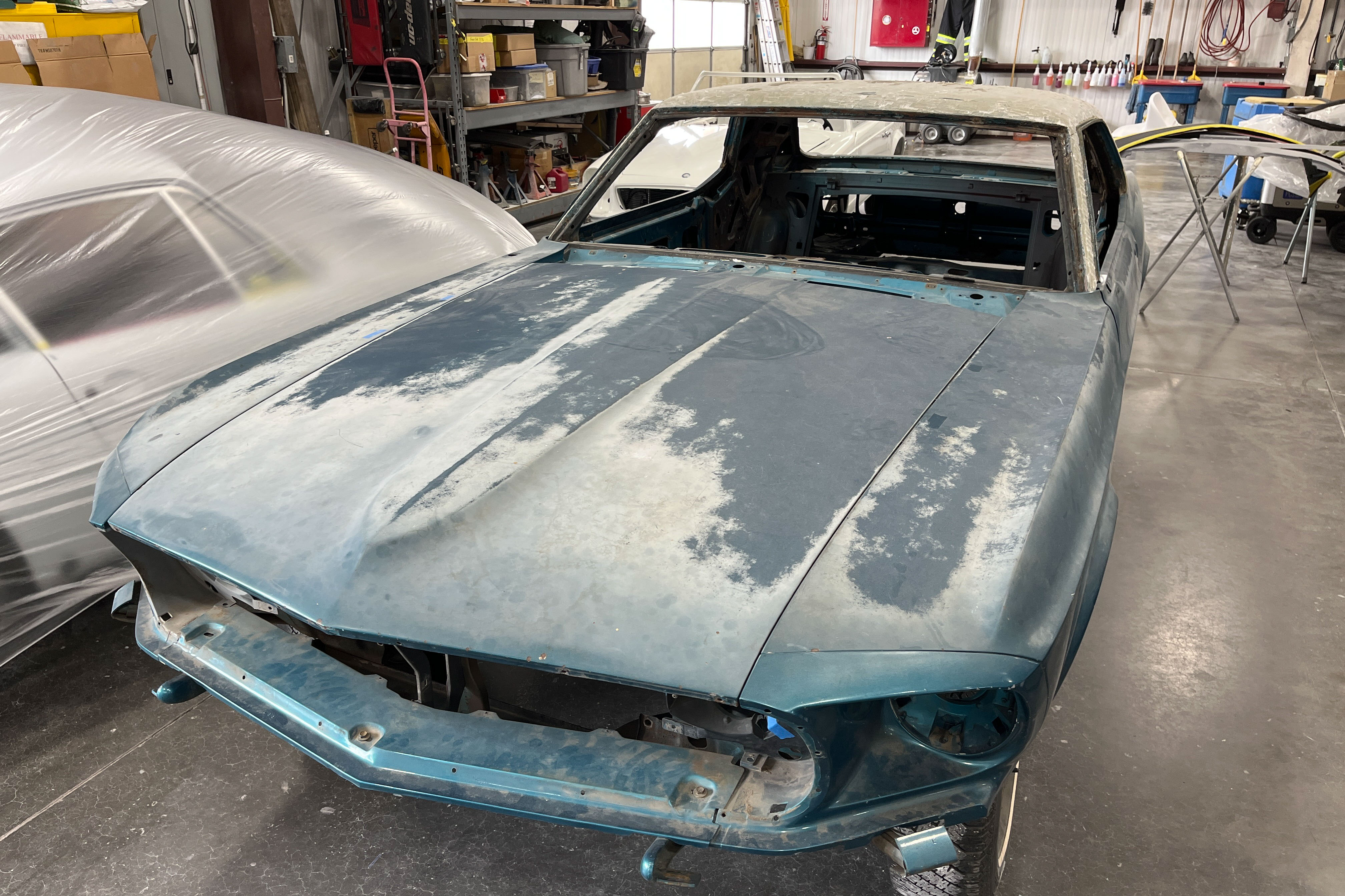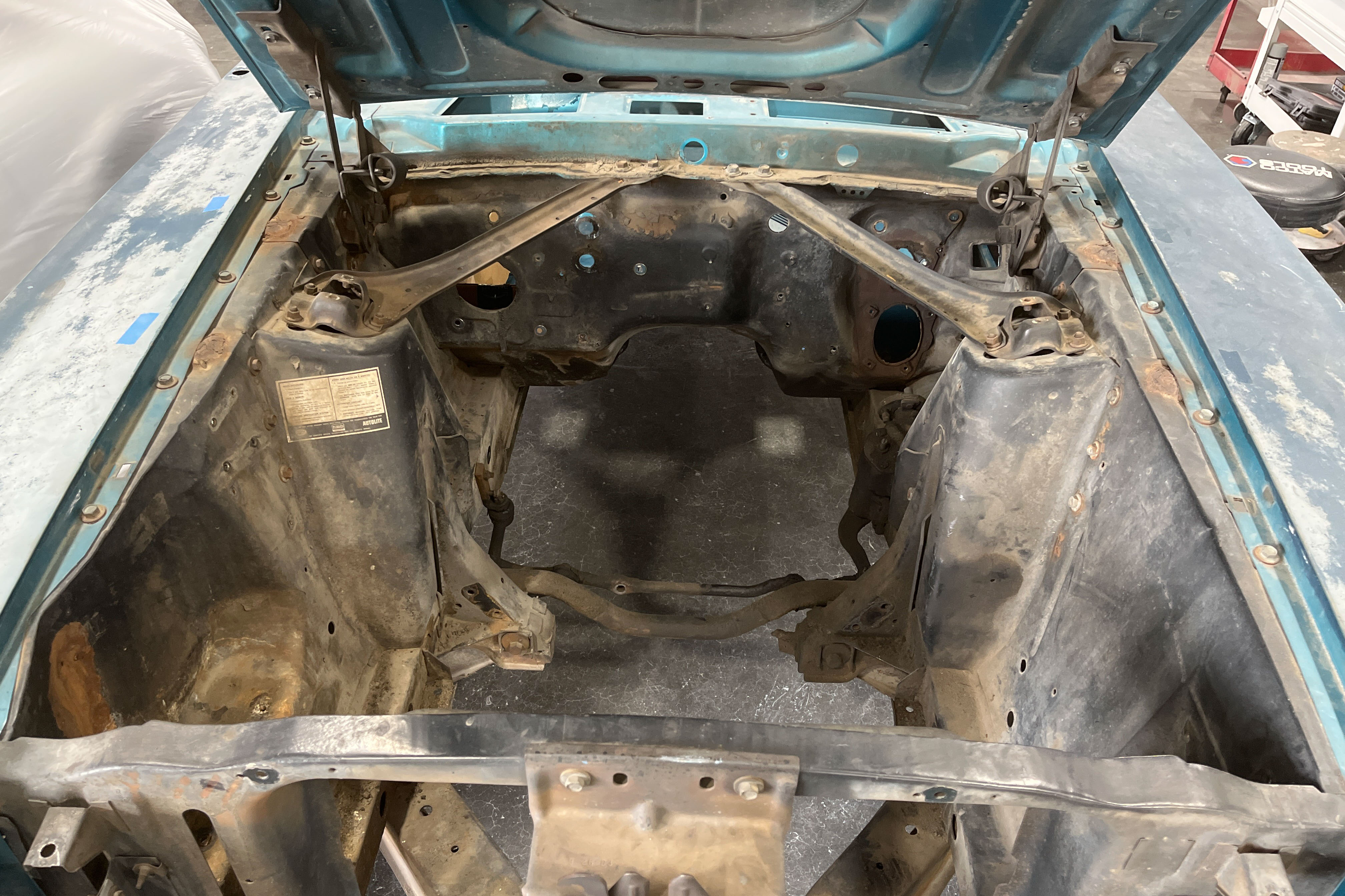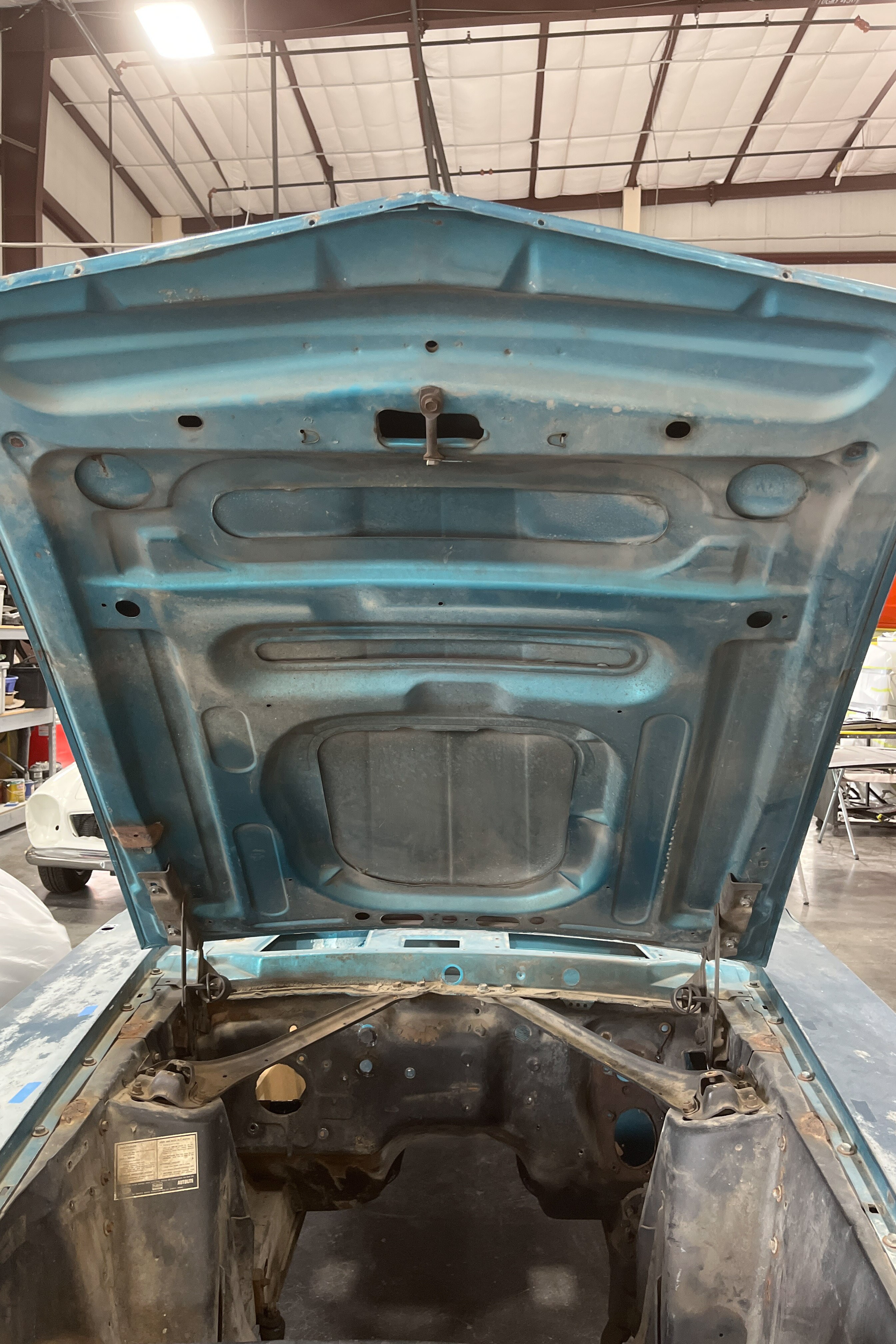 This example came to us as a rolling chassis – ready for media blasting, bodywork and paint. We have completed extensive rust repairs and other body damage. Then was more work with primer. Finally, we have applied the first coats of Metallic Teal paint and clear coat. You’ll notice the top was not painted. The factory spec’d vinyl roof with be applied instead.