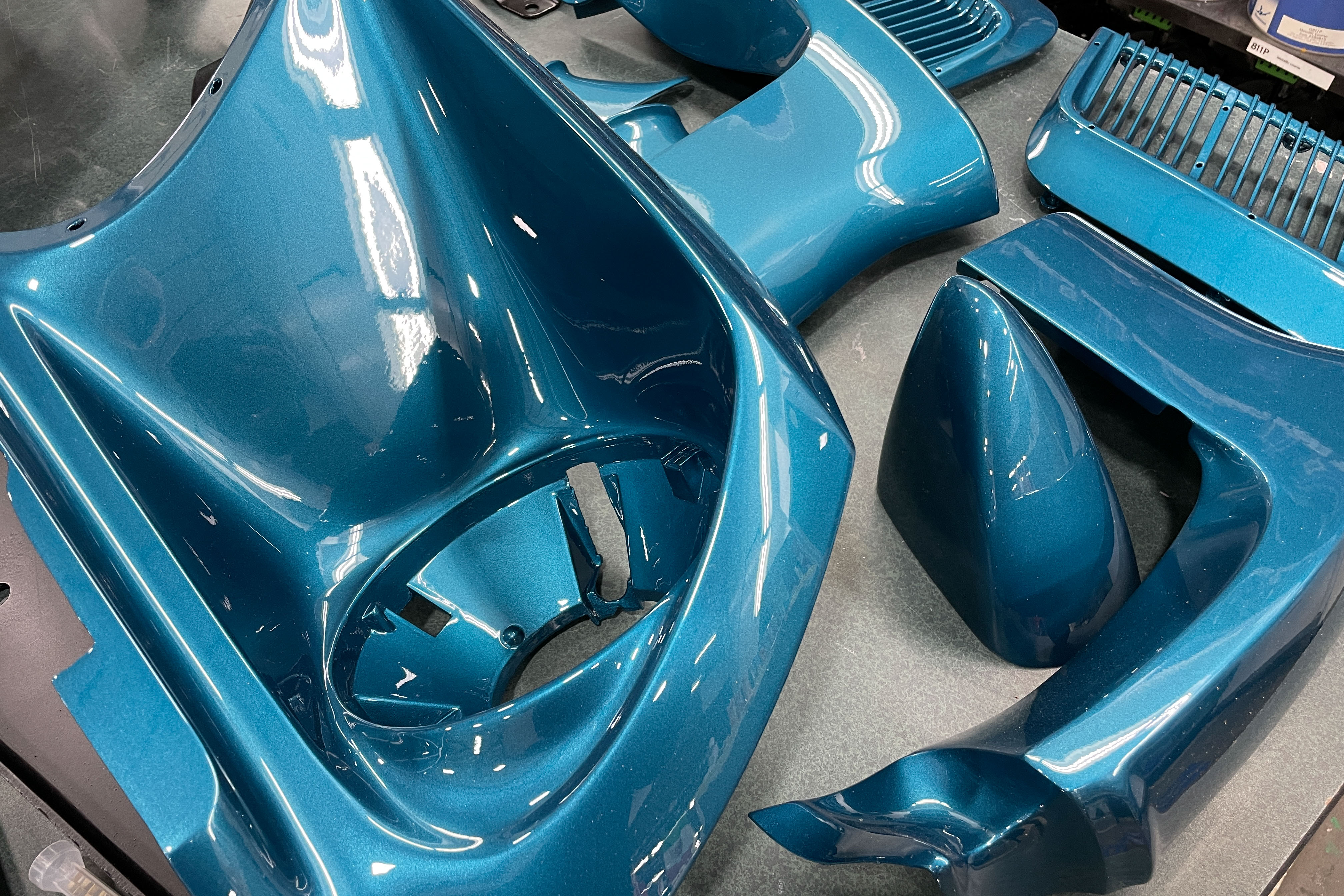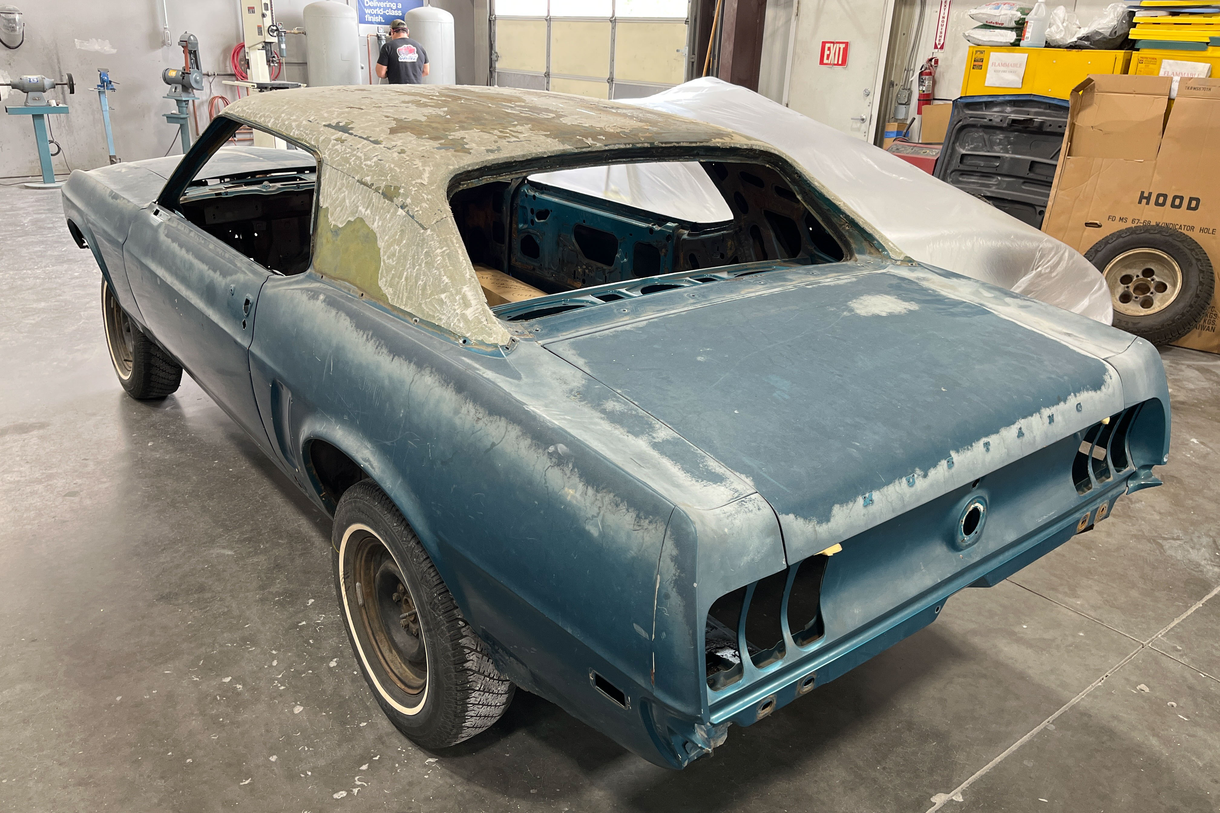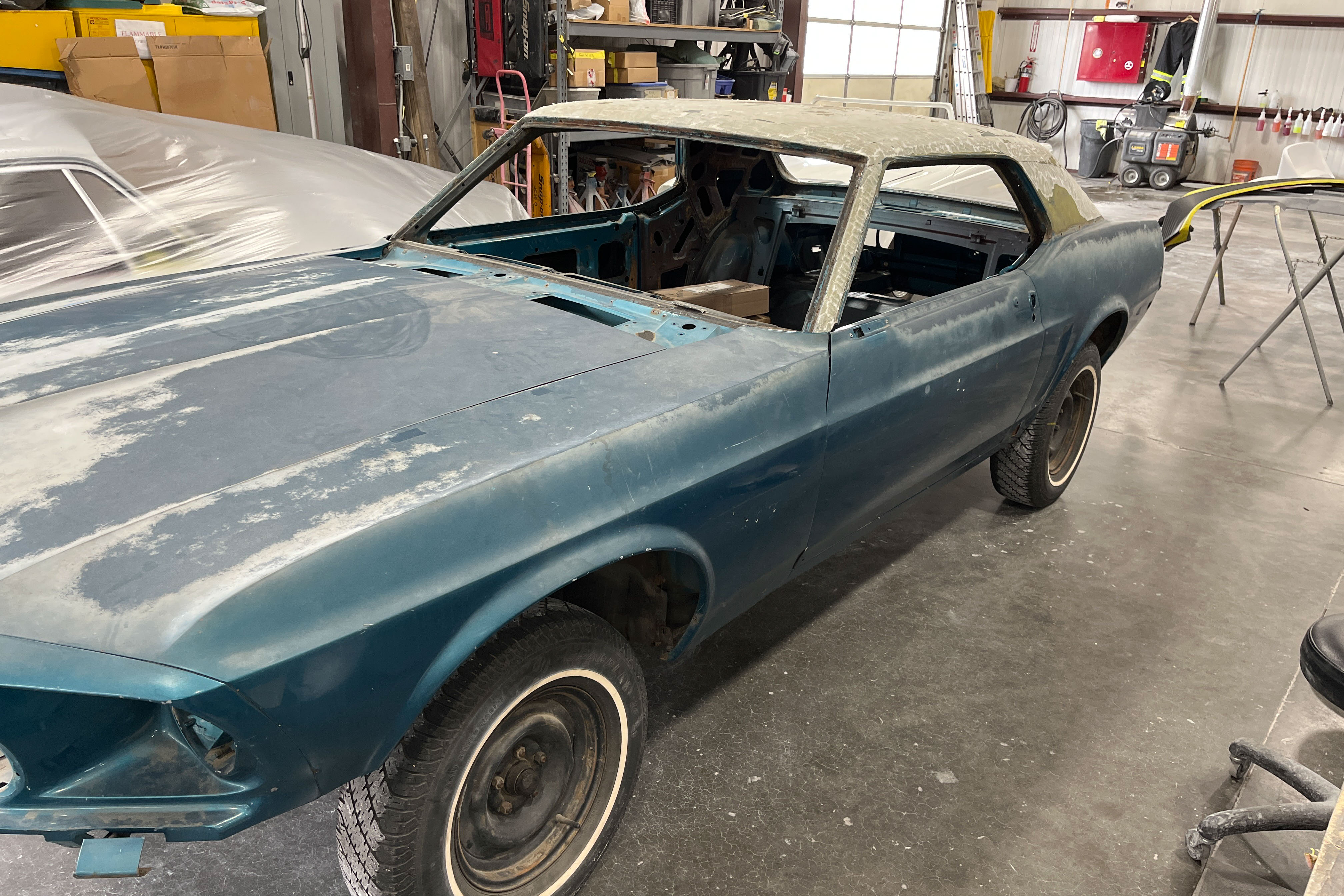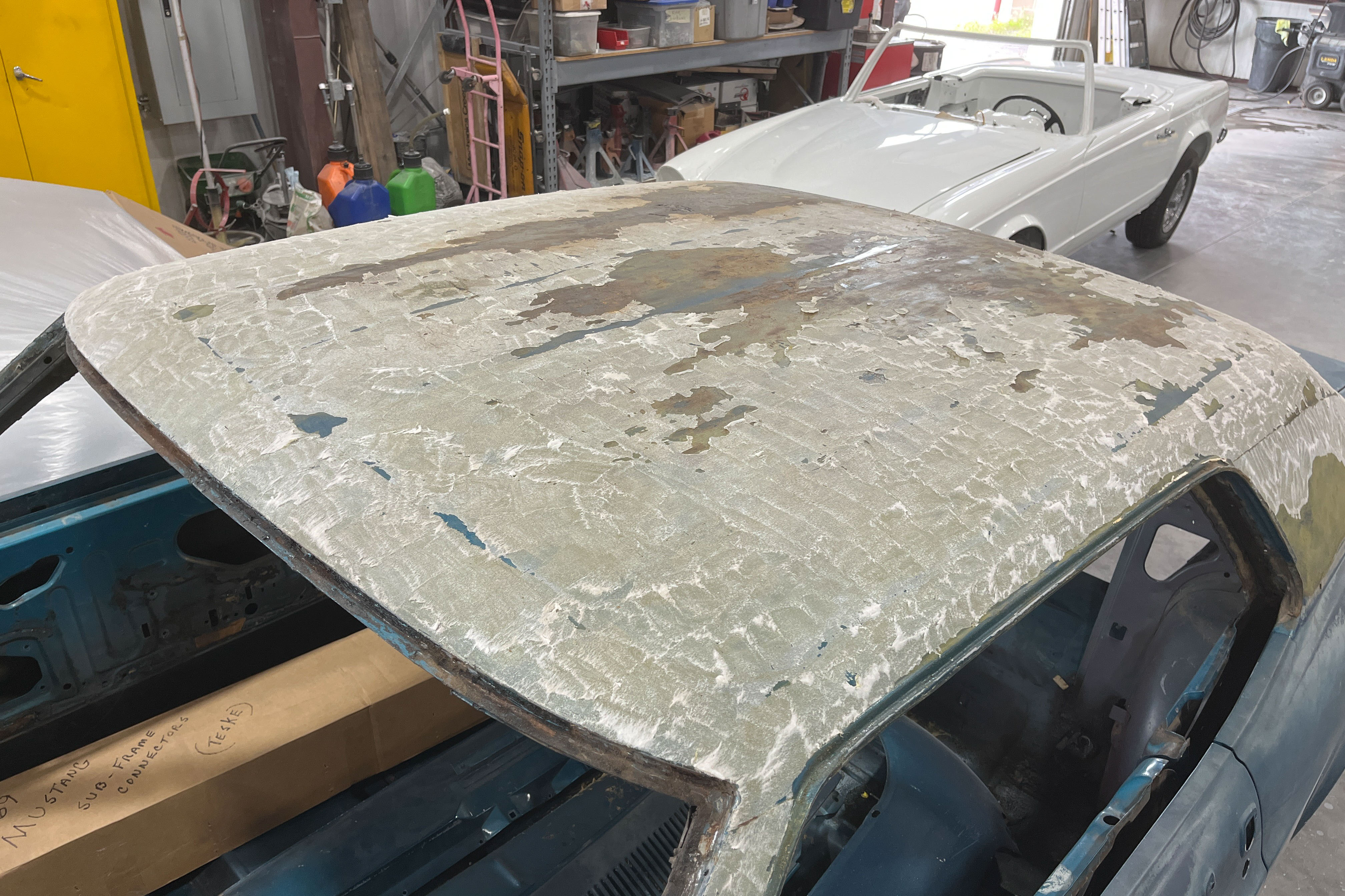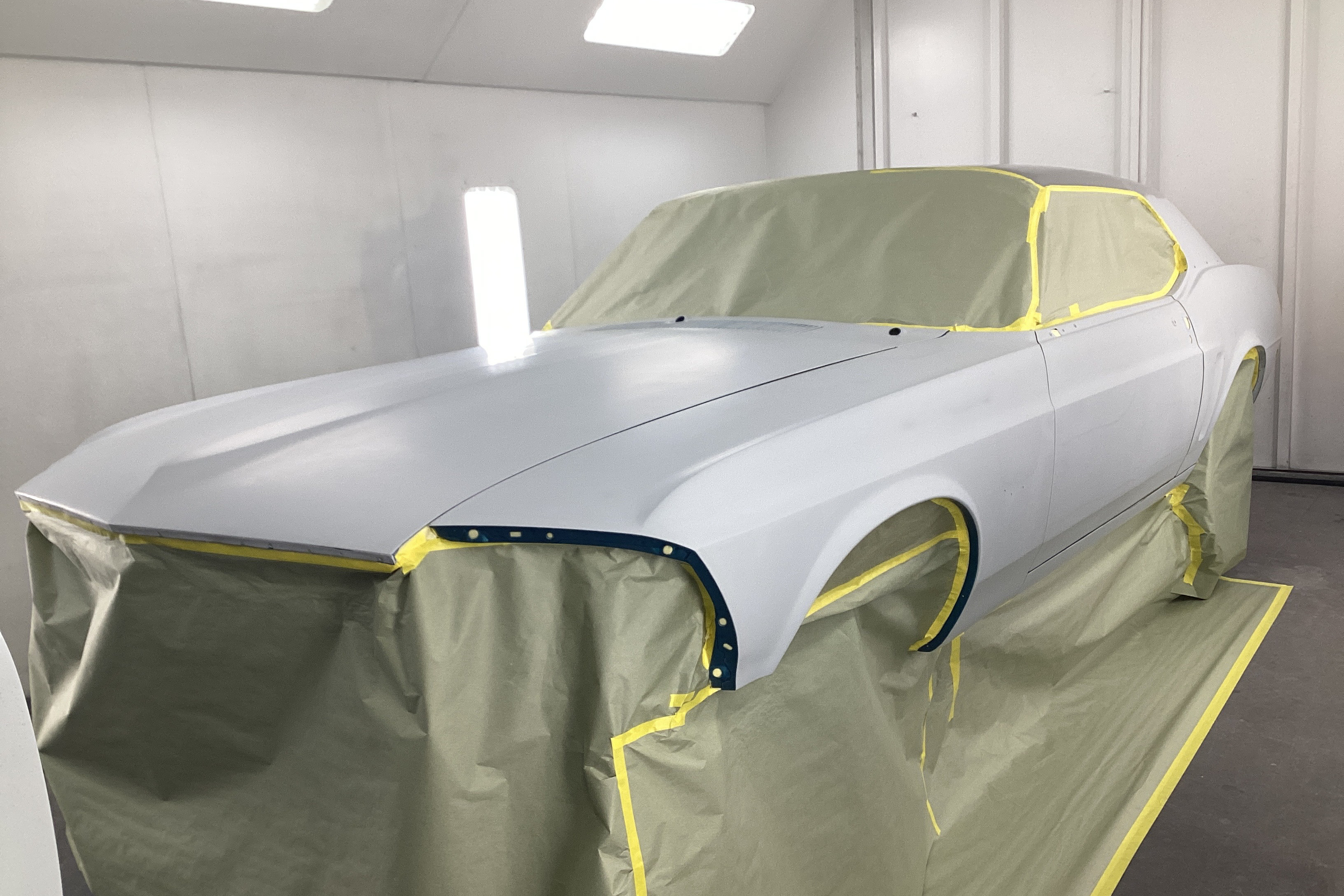 This example came to us as a rolling chassis – ready for media blasting, bodywork and paint. We have completed extensive rust repairs and other body damage. Then was more work with primer. Finally, we have applied the first coats of Metallic Teal paint and clear coat. You’ll notice the top was not painted. The factory spec’d vinyl roof with be applied instead.