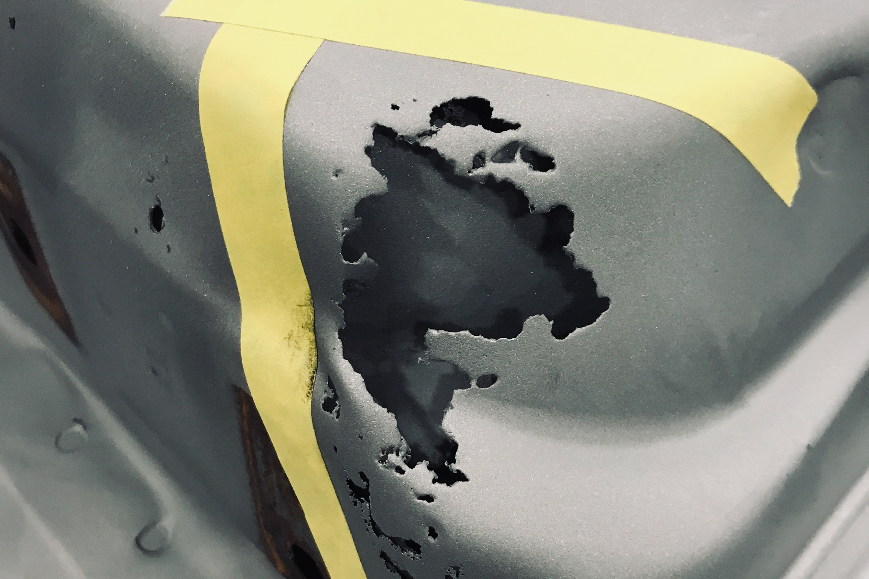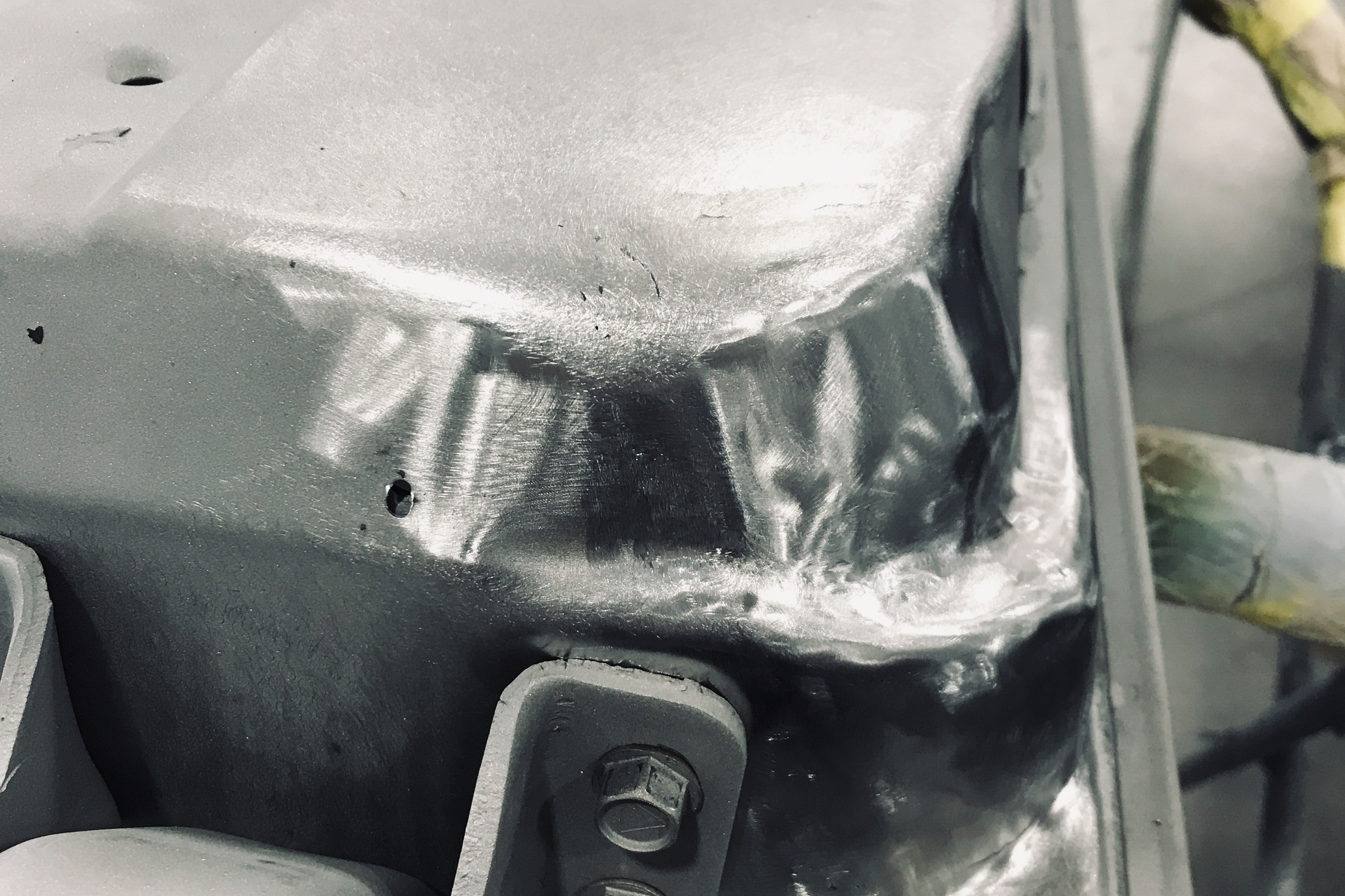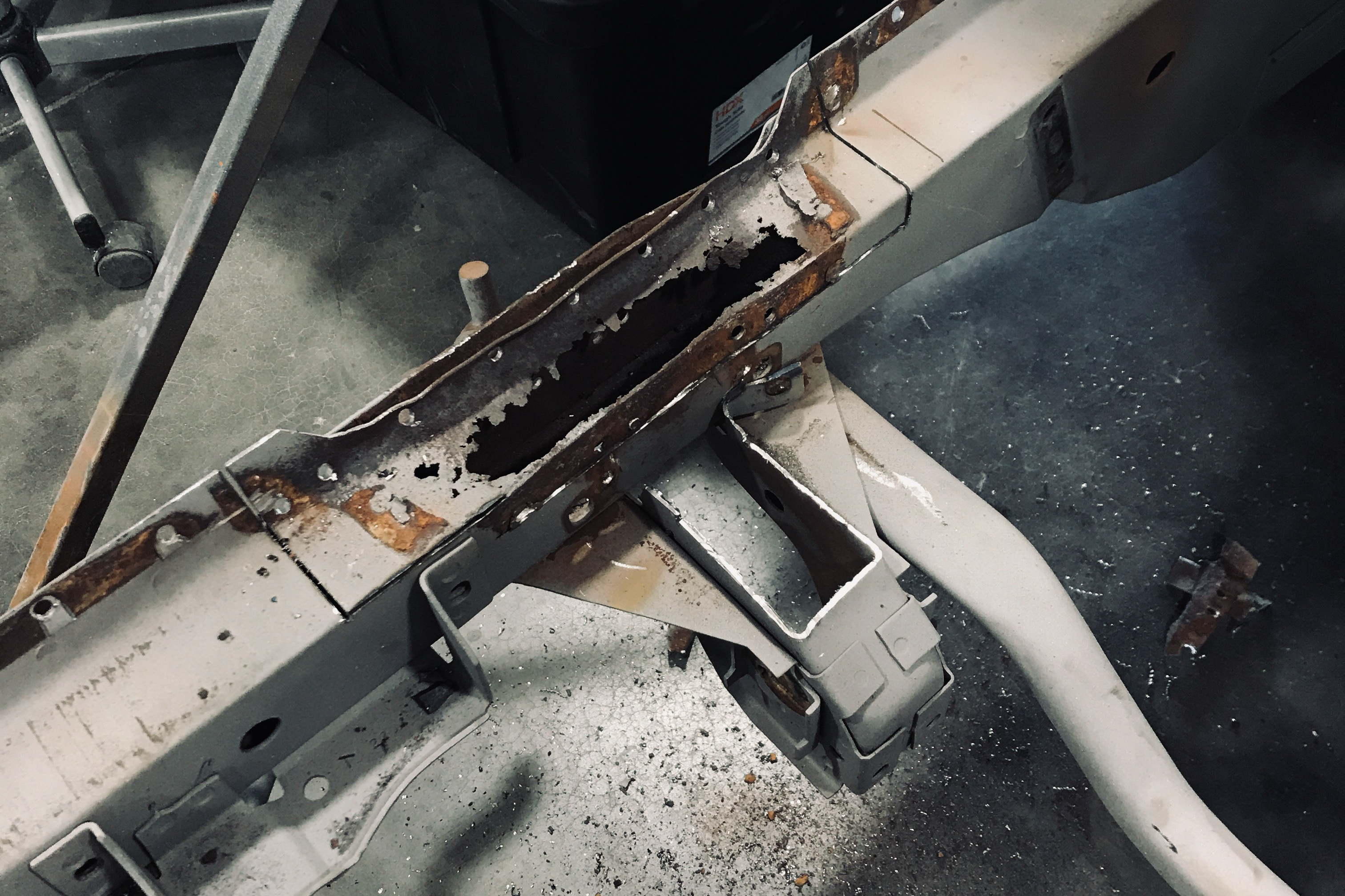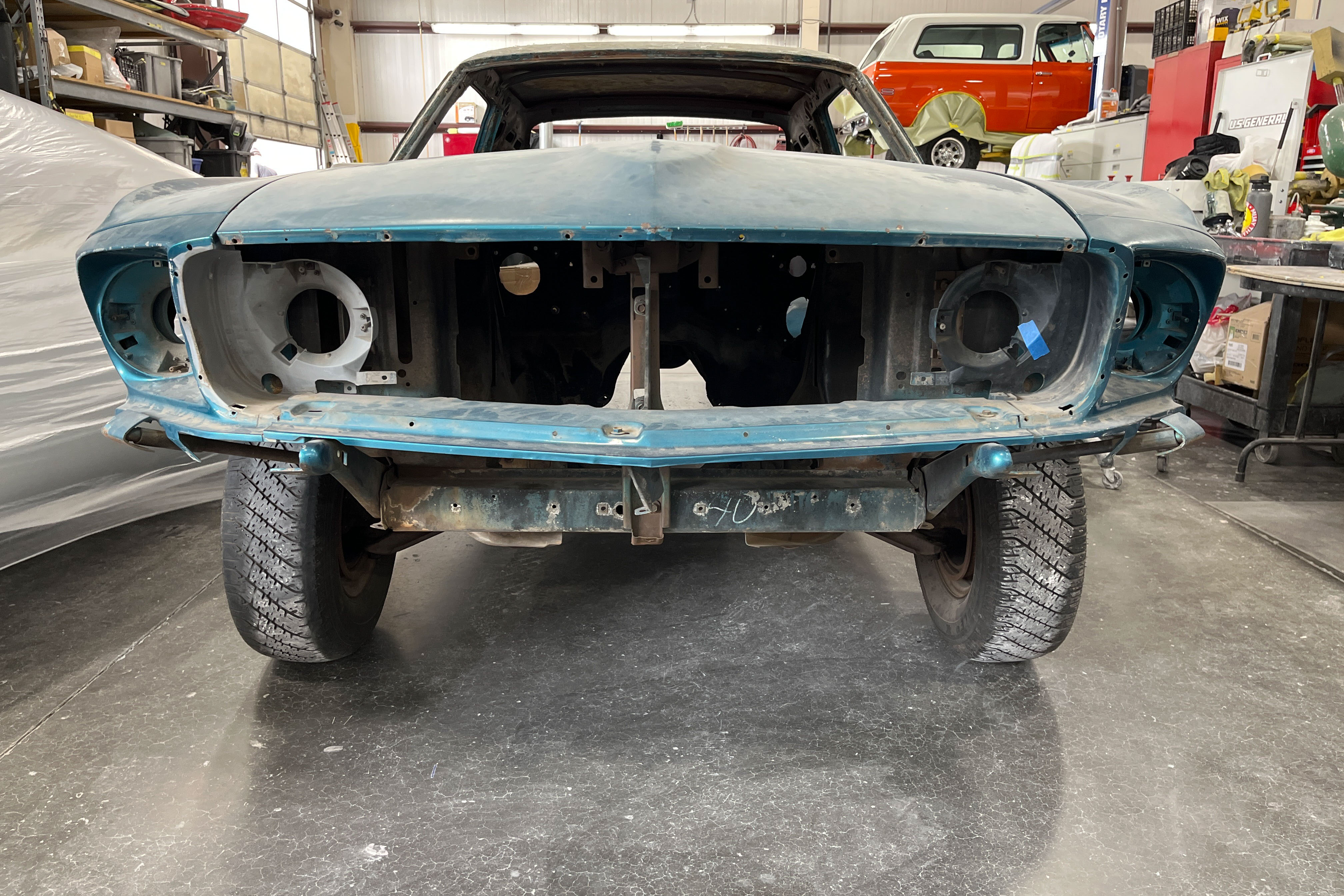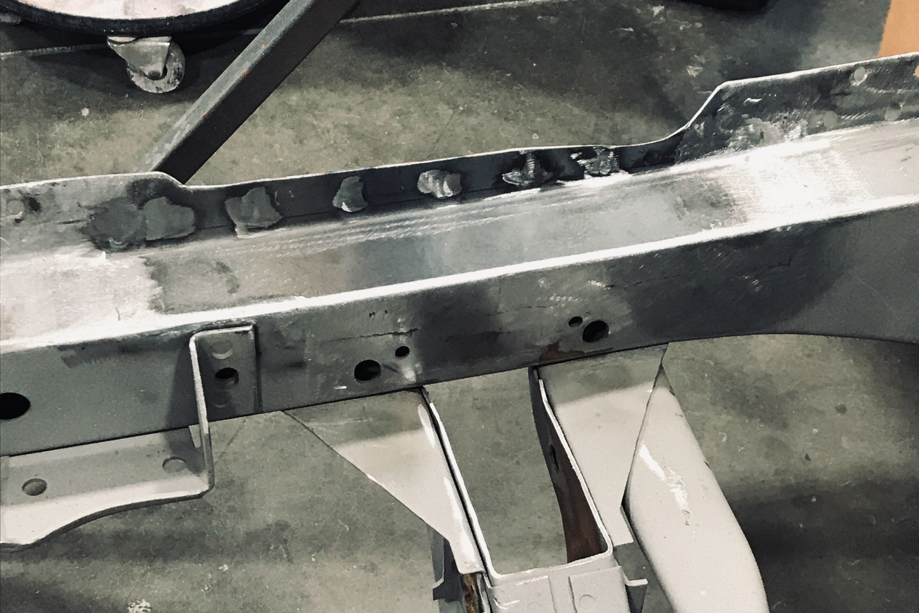 This example came to us as a rolling chassis – ready for media blasting, bodywork and paint. We have completed extensive rust repairs and other body damage. Then was more work with primer. Finally, we have applied the first coats of Metallic Teal paint and clear coat. You’ll notice the top was not painted. The factory spec’d vinyl roof with be applied instead.