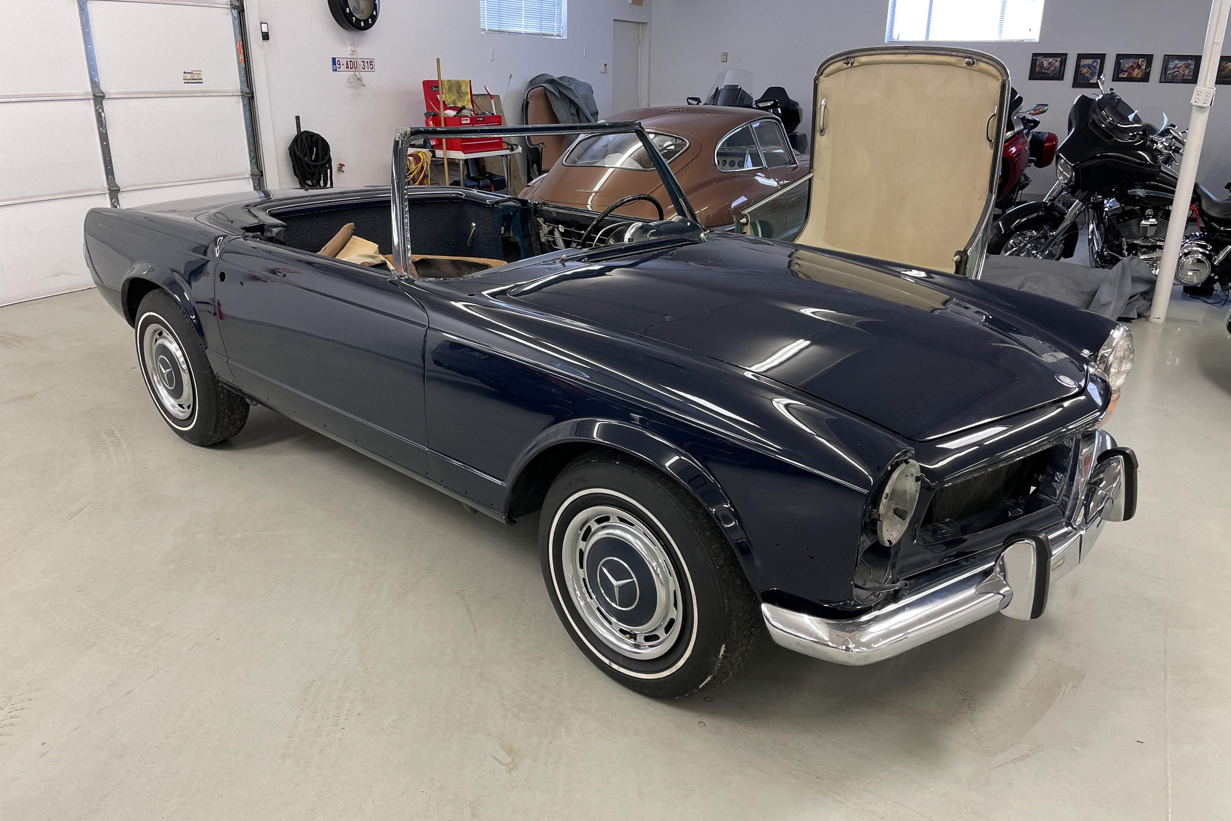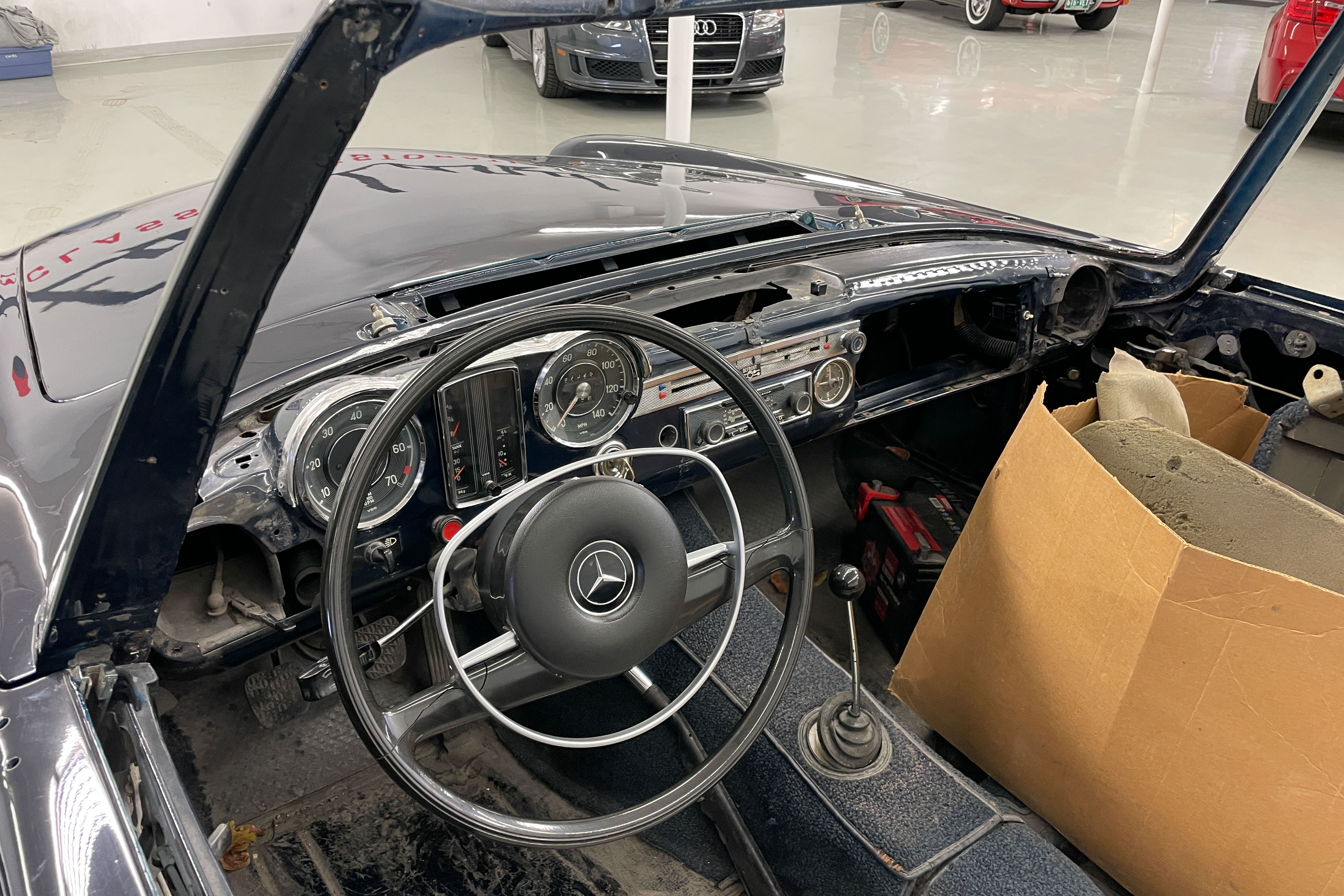 This outstanding 1969 Mercedes-Benz 280 SL is a true gem waiting to be restored to its former glory. This is a prime candidate for an experienced, at-home restorer. With a big dose of sweat equity, and some excellent, available parts, this could become a great driver-quality 280SL. The car has been well-preserved over the years and is ready for a new owner to bring it back to life. With its unique color combination of navy blue exterior and parchment interior, this 280 SL is a rare find that is sure to turn heads wherever it goes.