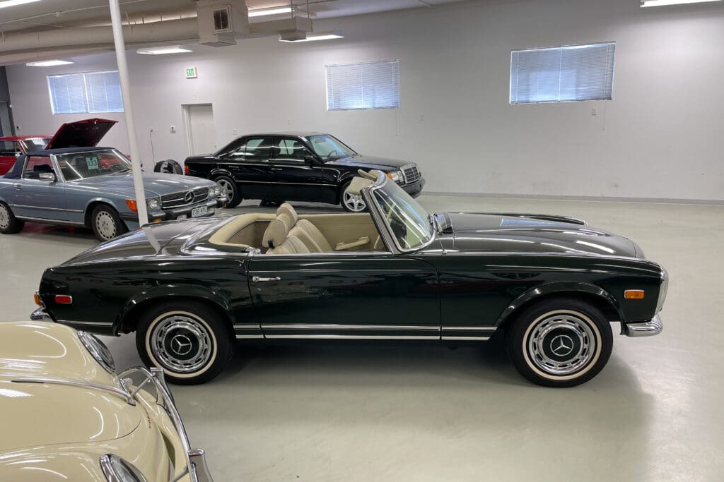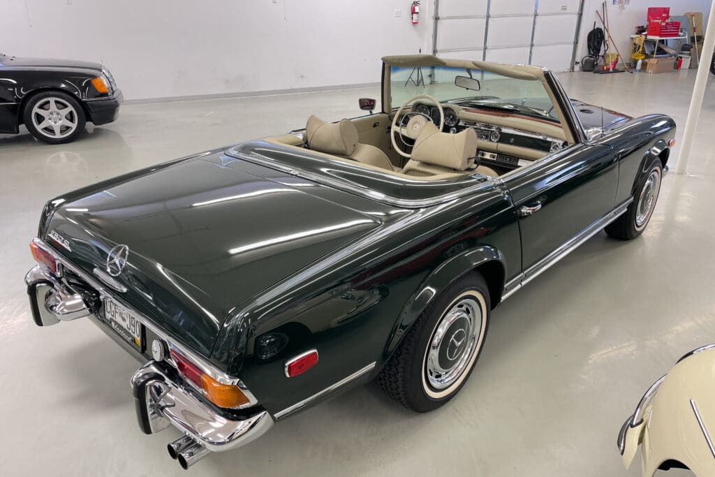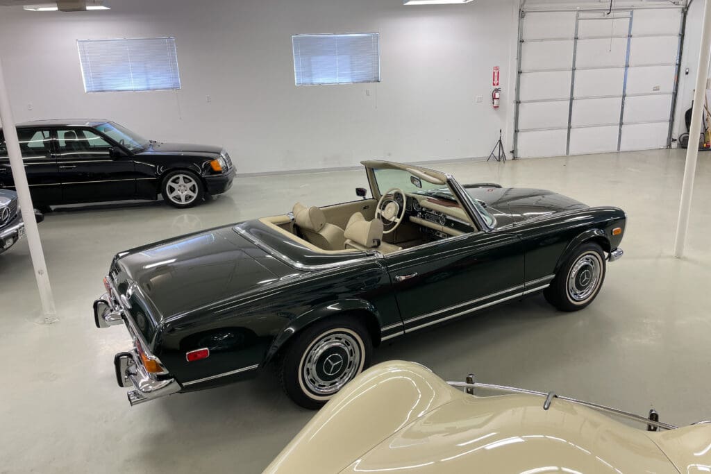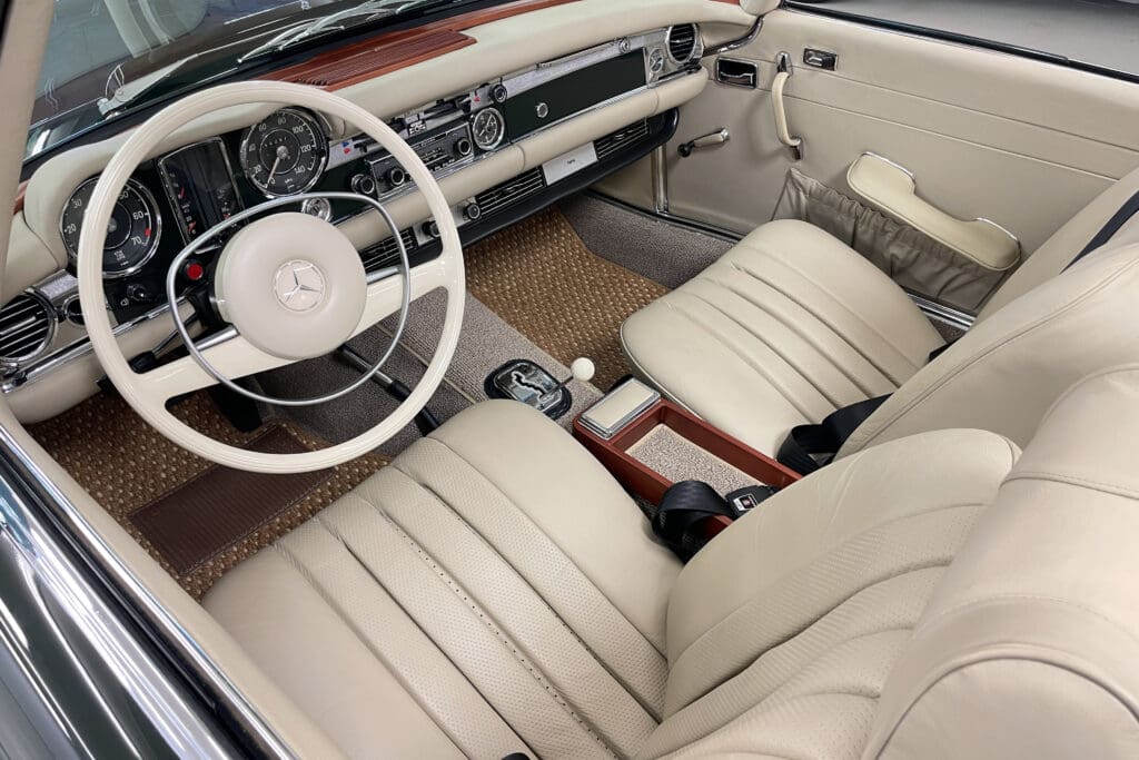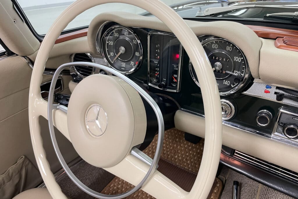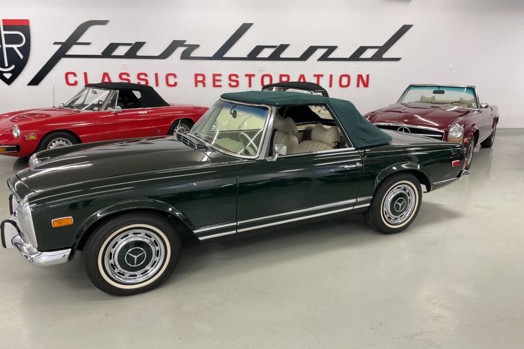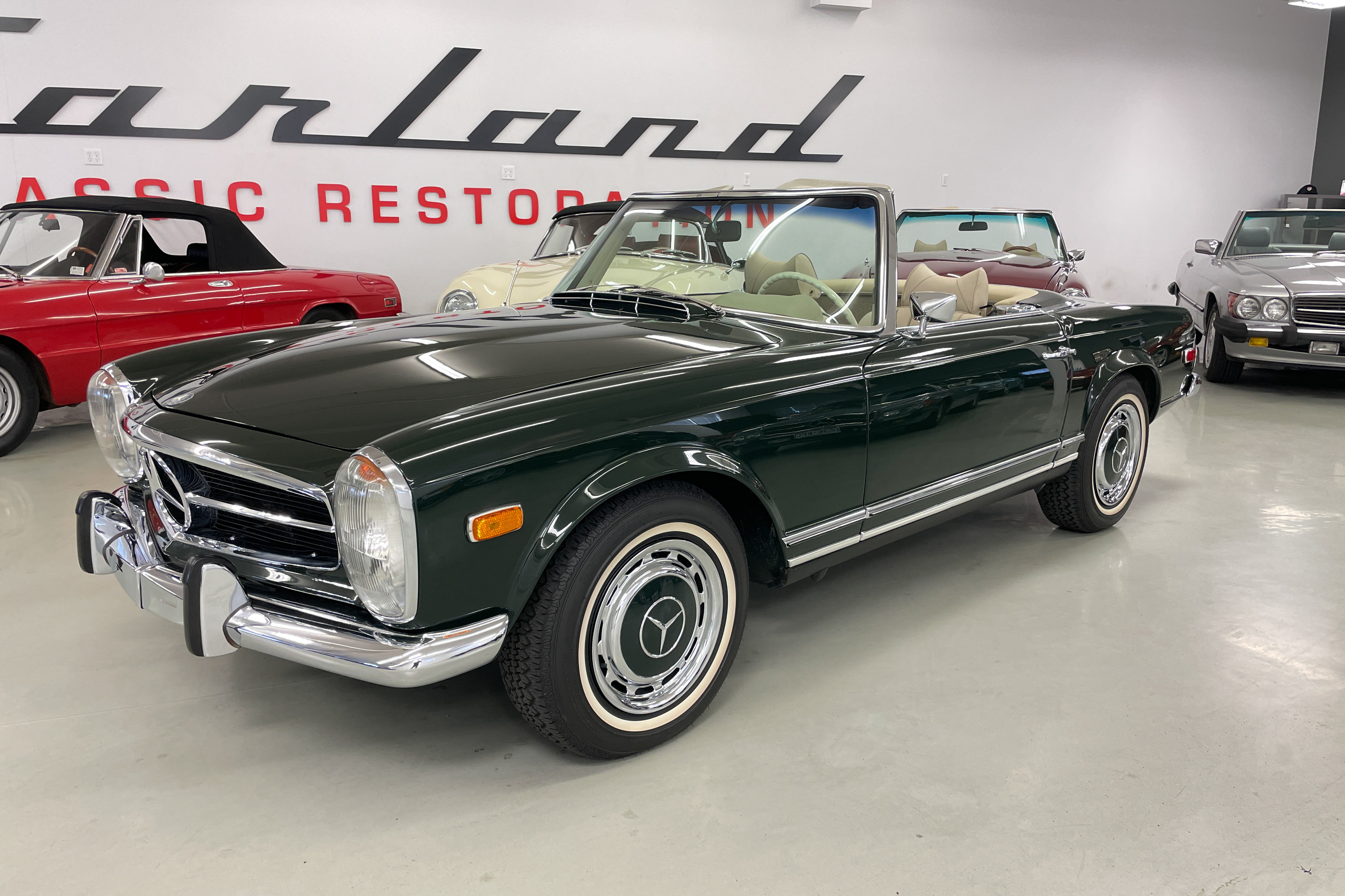 This is one of the nicest classic Mercedes-Benz 113-series cars we’ve had in a very long time. These are also known as Pagodas – in the 230SL, 250SL and 280SL family. A very solid original car, this example was professionally restored several years ago and used very little since. Finished in its original color—Dark Olive Green—that looks spectacular with the all-new Parchment interior (done in leather, not MB Tex). The new convertible top is also matching olive green, plus we have the factory hardtop. Every aspect of the car was refreshed to make it an extremely high-level car, but still one you can drive and enjoy.