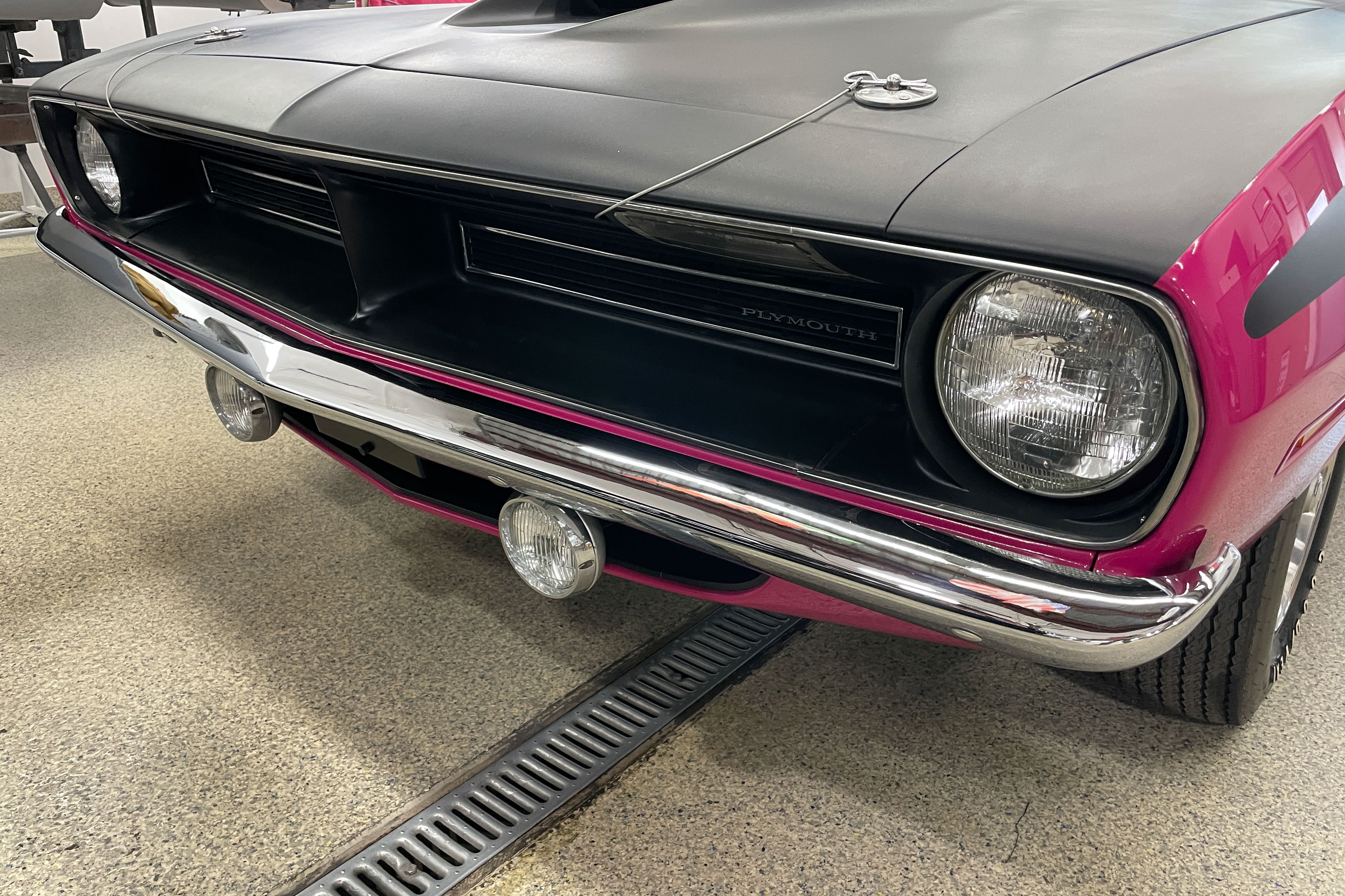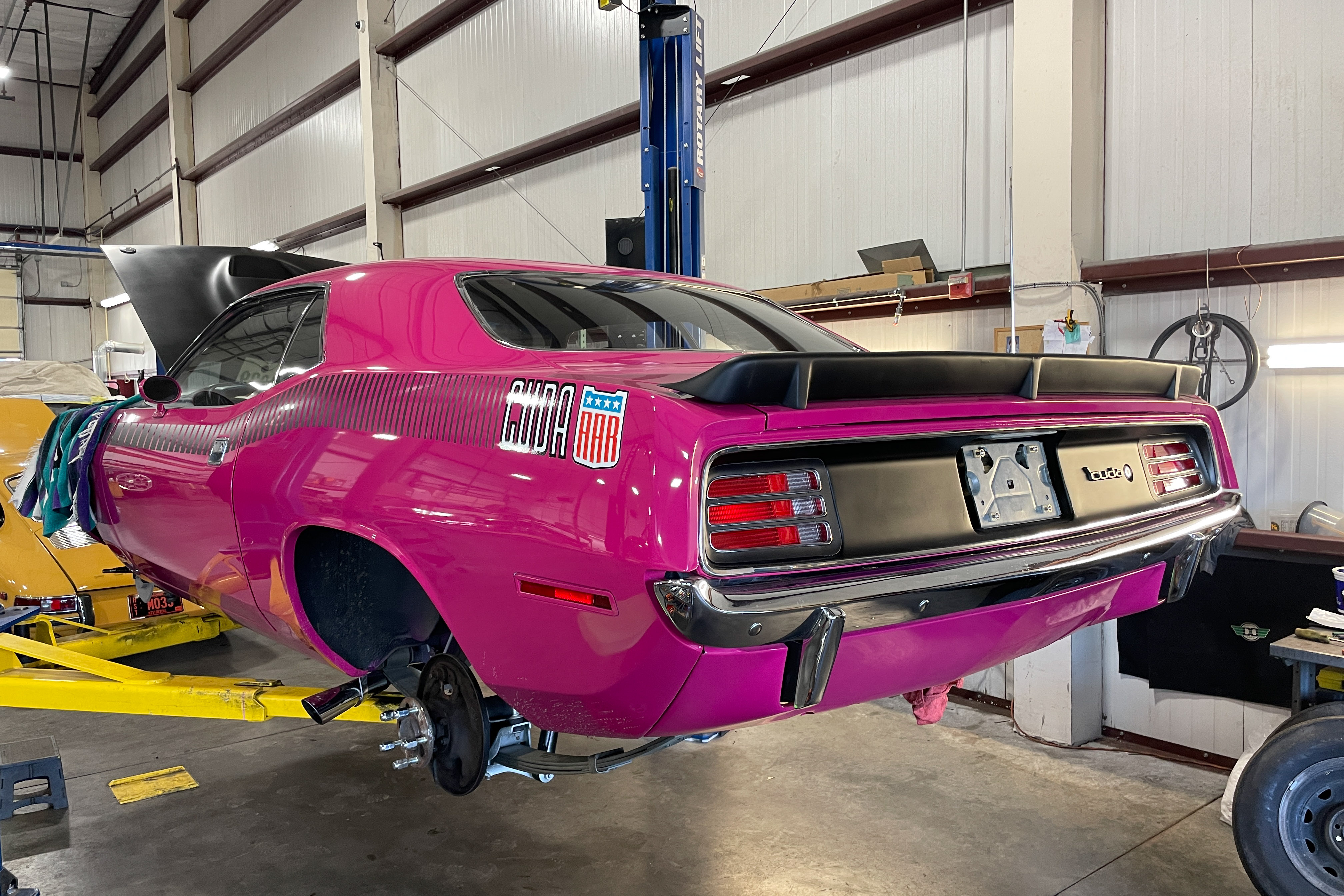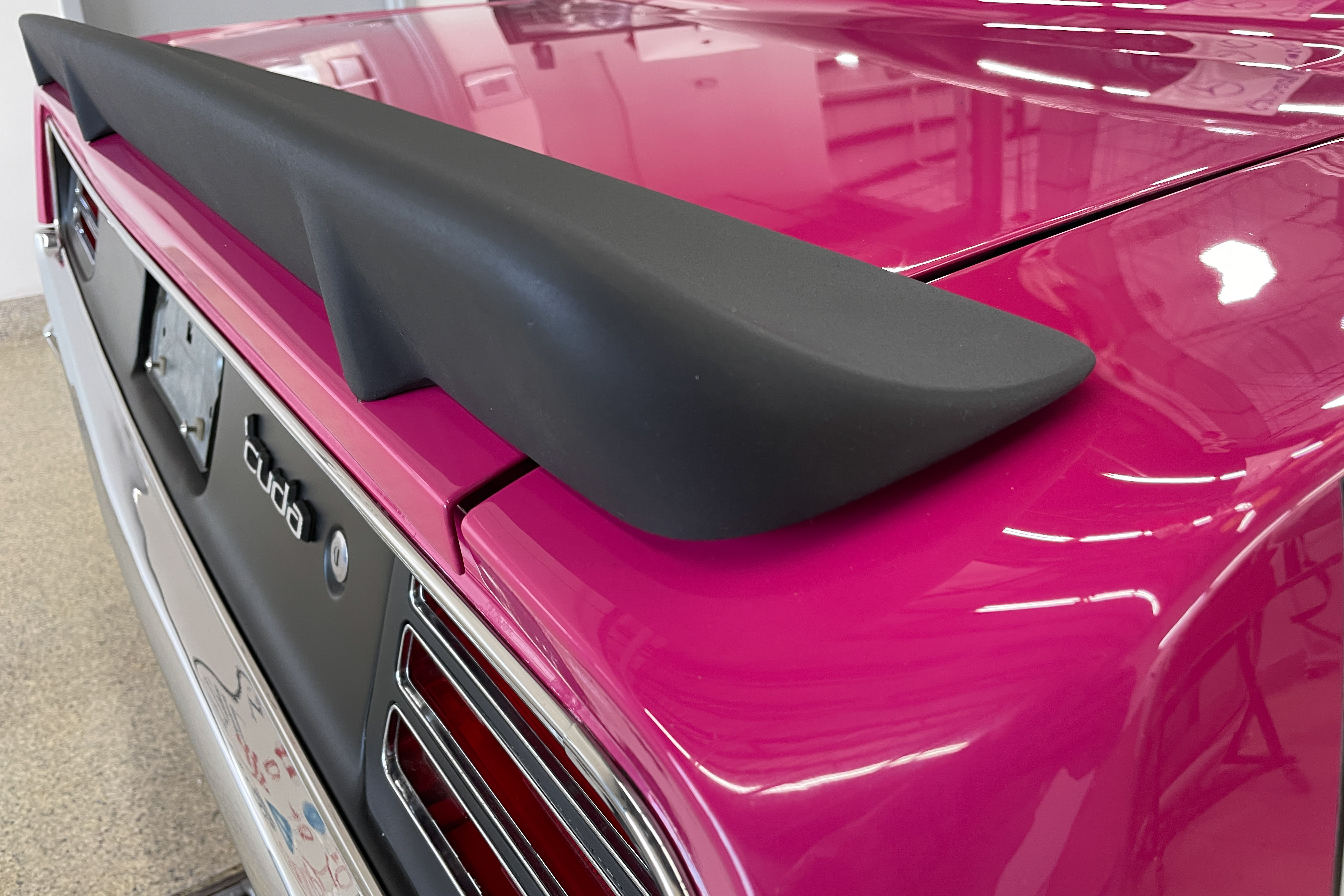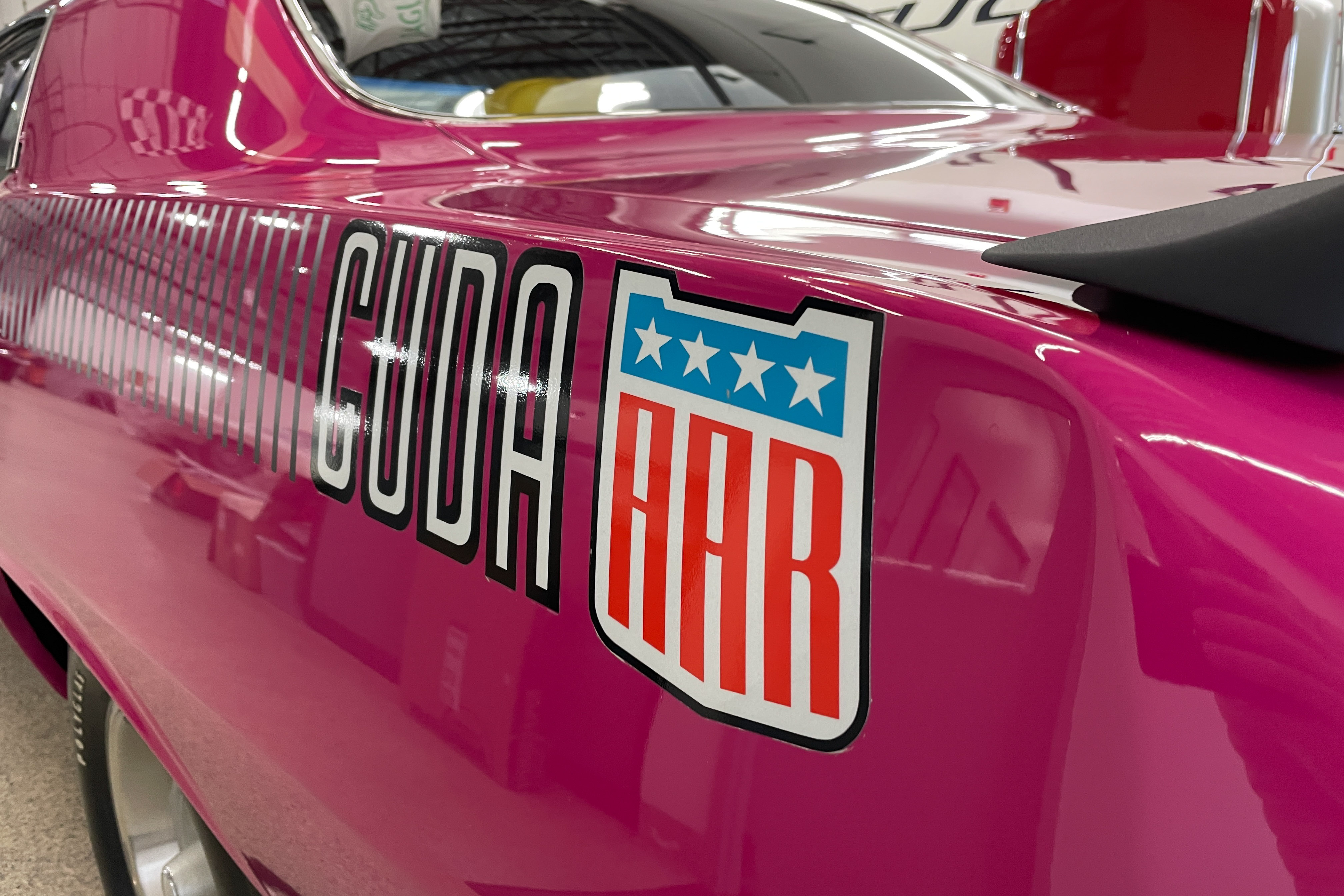 We’re not worthy! OK, we are. This is a true AAR ‘Cuda. Mopar’s Holy Grail. We did a bit of cosmetic work on the front spoiler and rear. Also just a bit of mechanical – fluids, etc. The car is pristine!