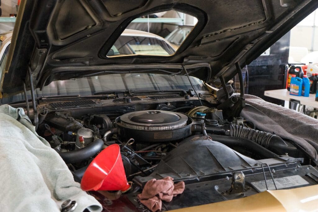 This car is a bit of a unicorn. It’s a true survivor. It may look a bit odd sitting amongst Porsches and Mercedes, but this is a collector’s dream. It’s completely original, and only has 19,000 or so miles. It’s the owner’s father’s car. He bought it new. Then it was stored for ever and ever. Now it’s at our shop for an assortment of things – mostly mechanical and refreshment.