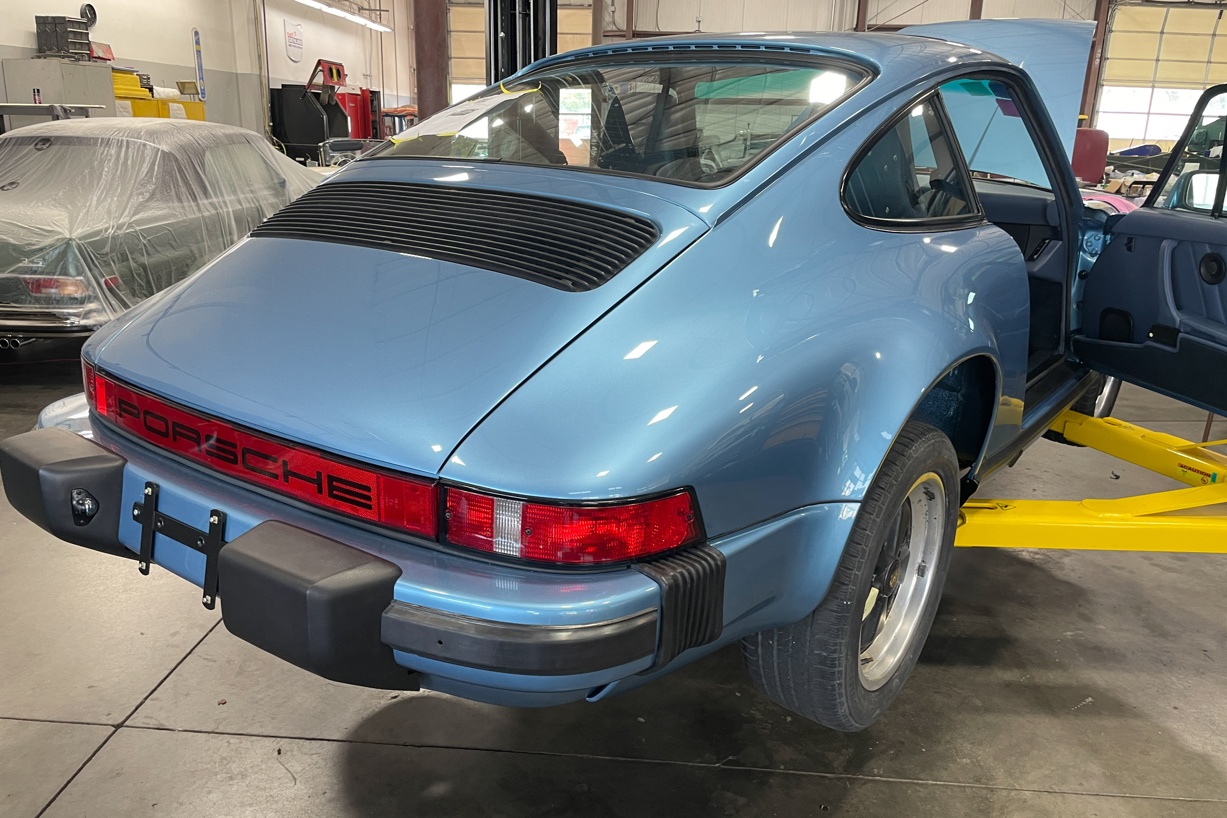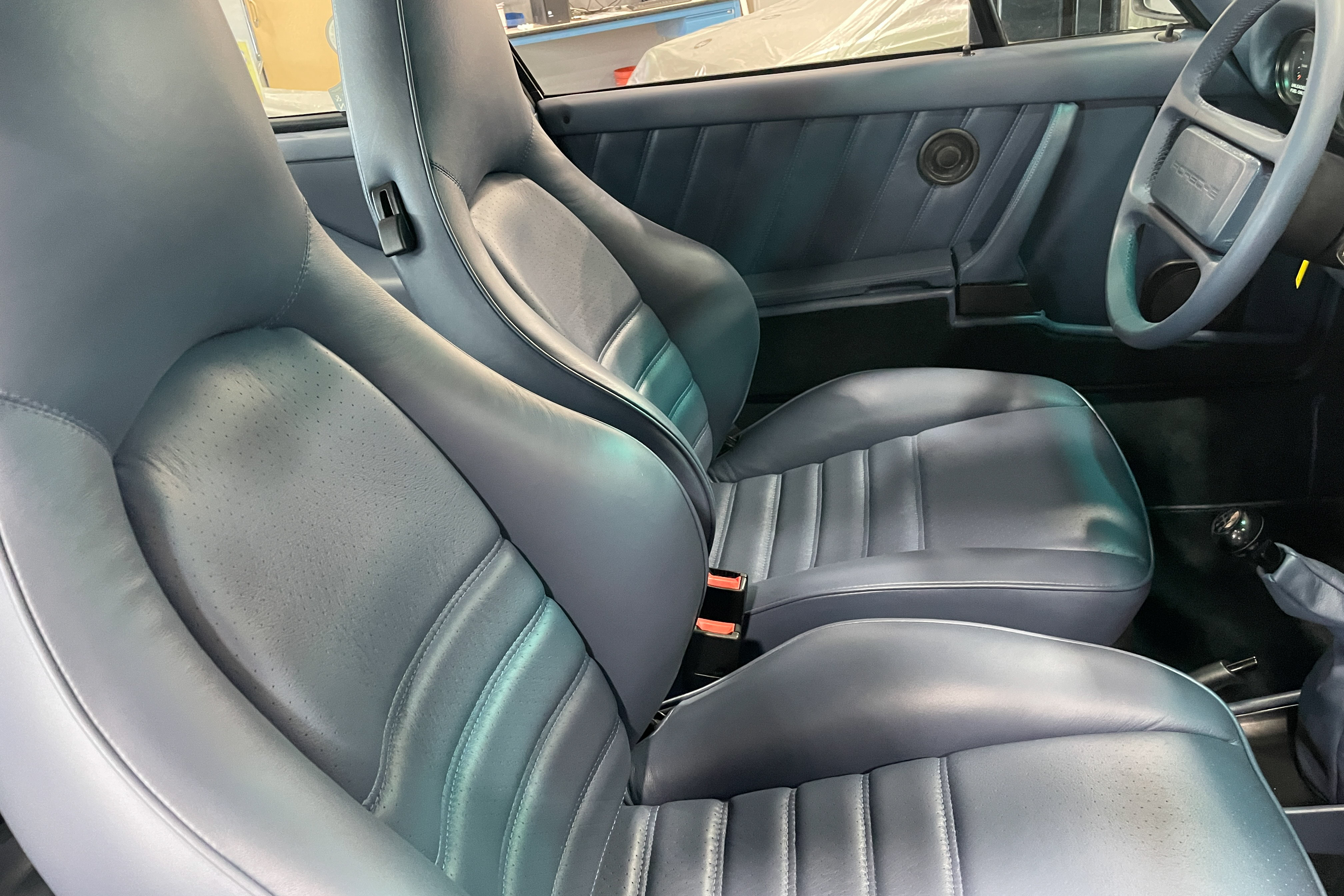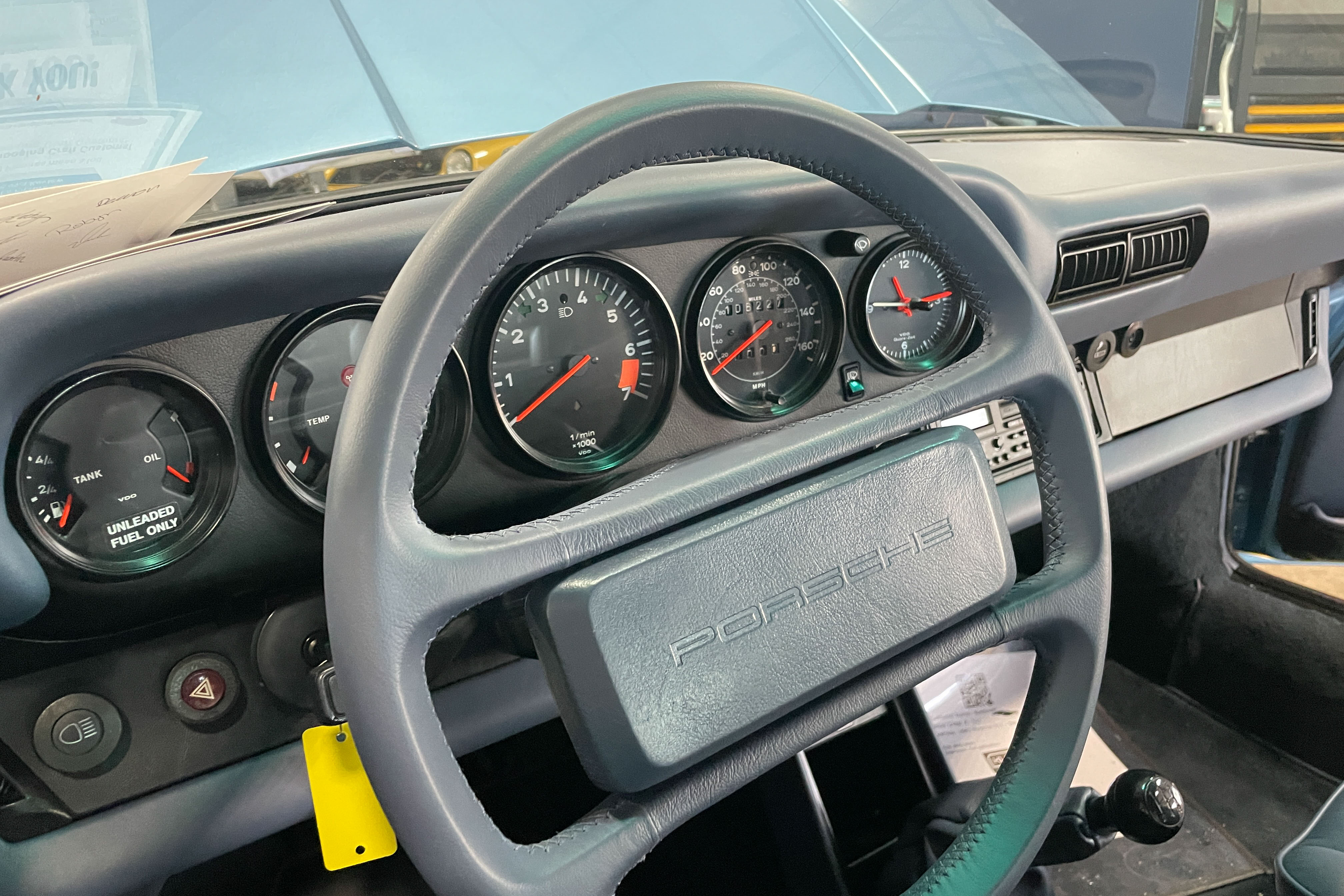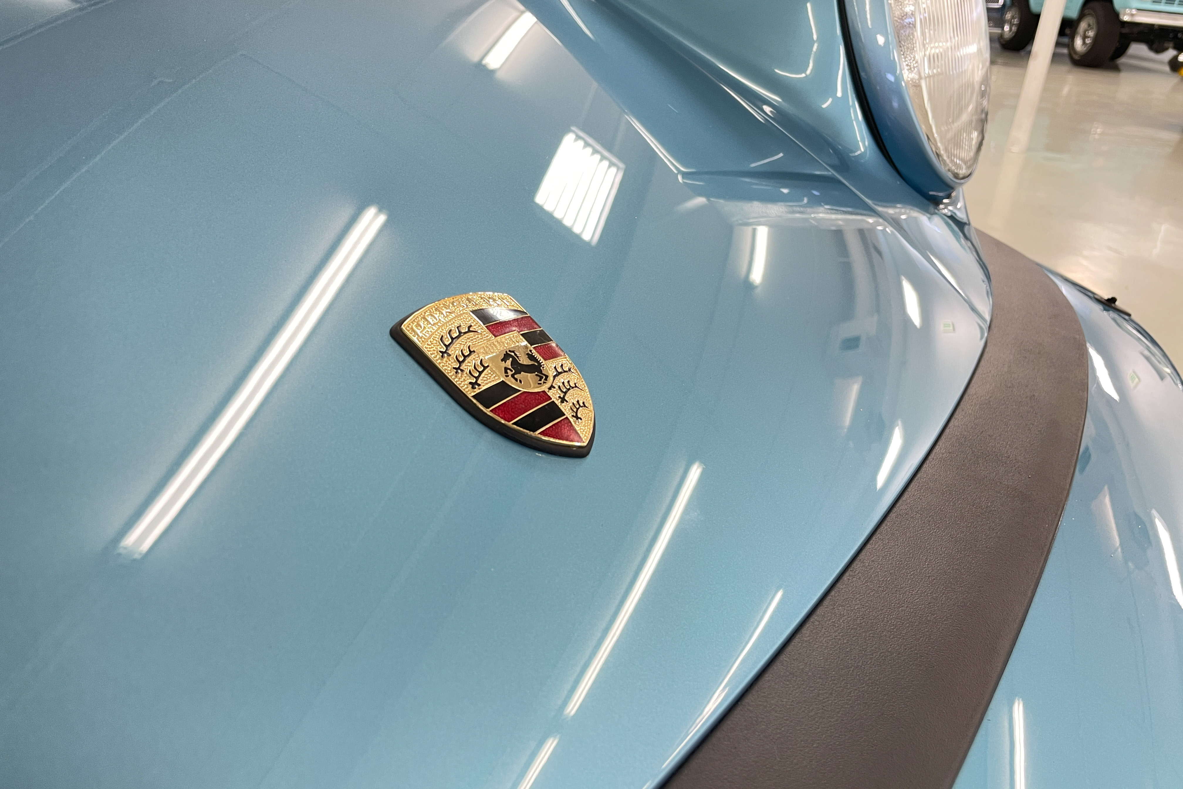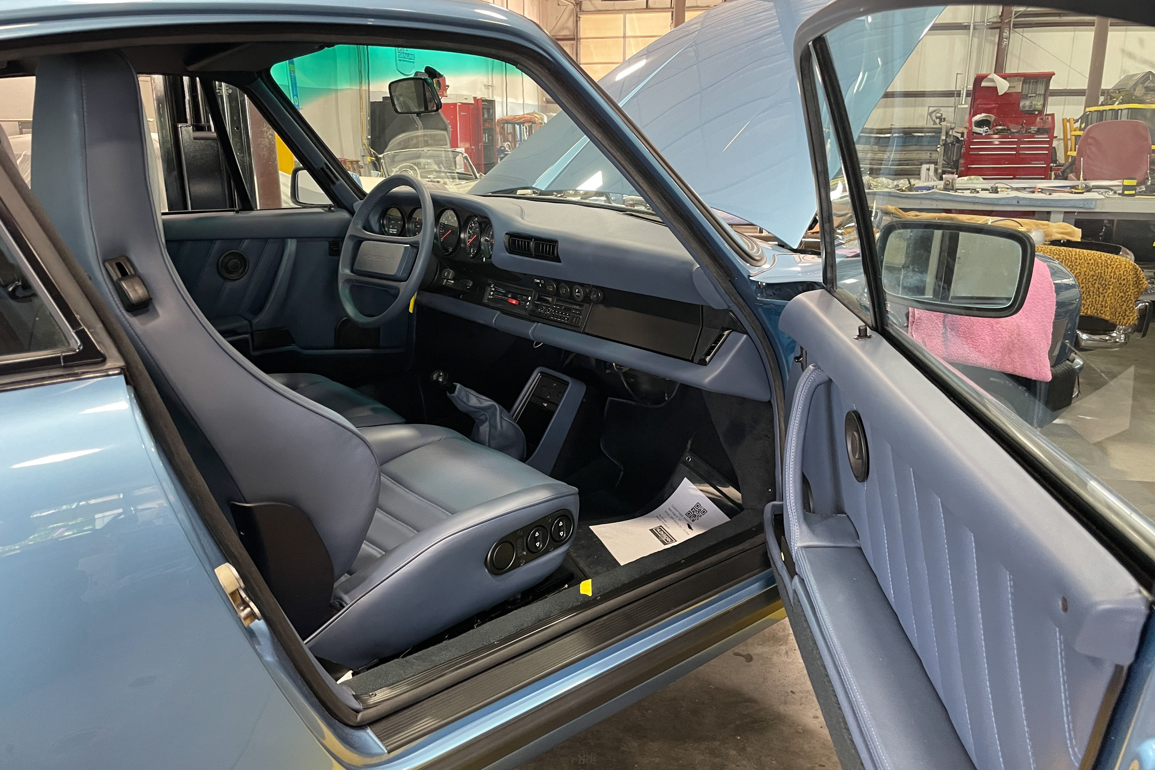 Next was extensive bodywork and metal. Followed by primer, paint, sanding, clear and more sanding. The Porsche factory Iris Blue came out great. Matching the exterior is a Porsche blue leather interior. Every last bit factory correct. There is endless detail work, especially on classic Porsche restorations. Also, remember that this car is going to Moment Motors in Texas to be converted to electric battery and motor. It’s already been there once – getting wiring in place and a lot more.