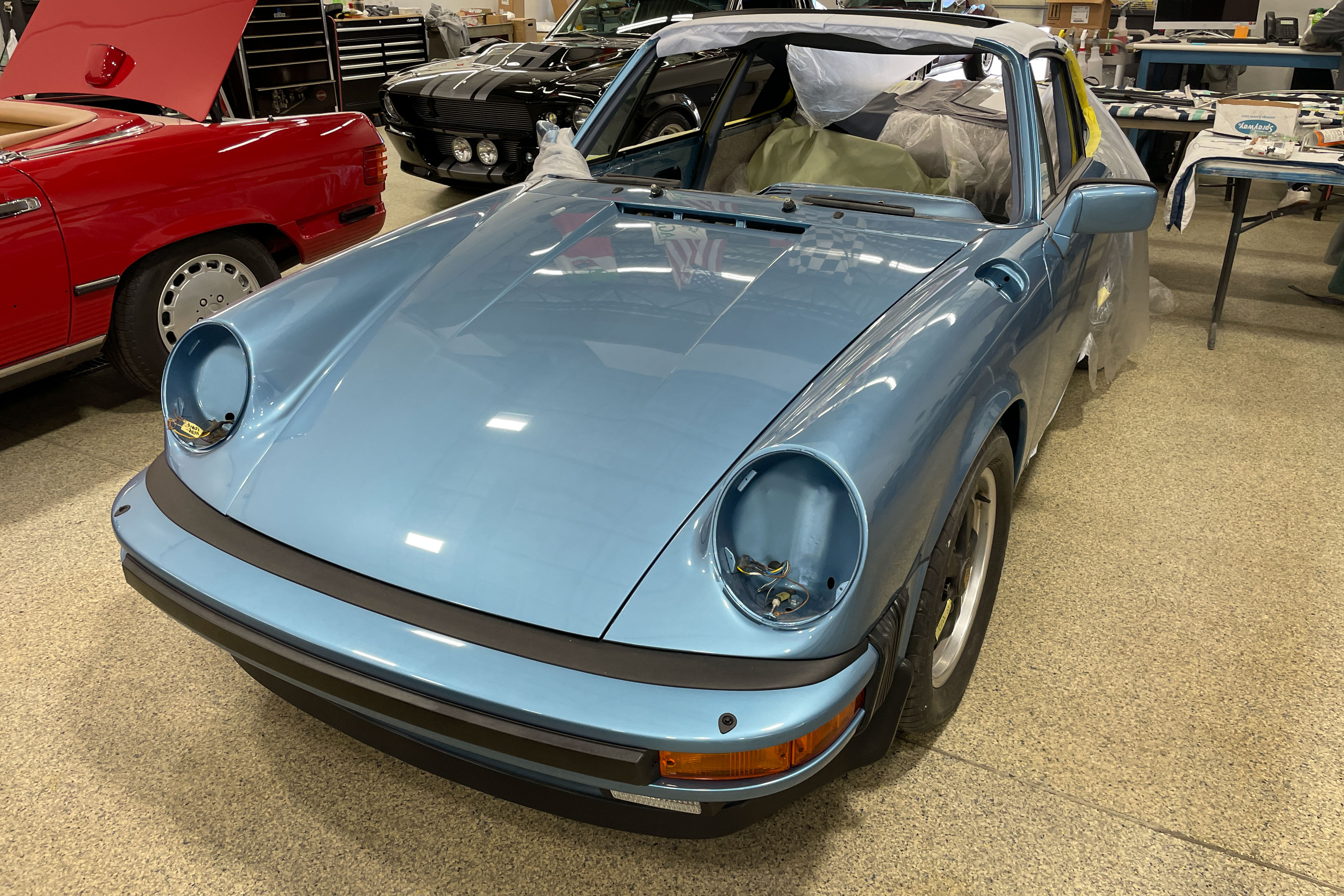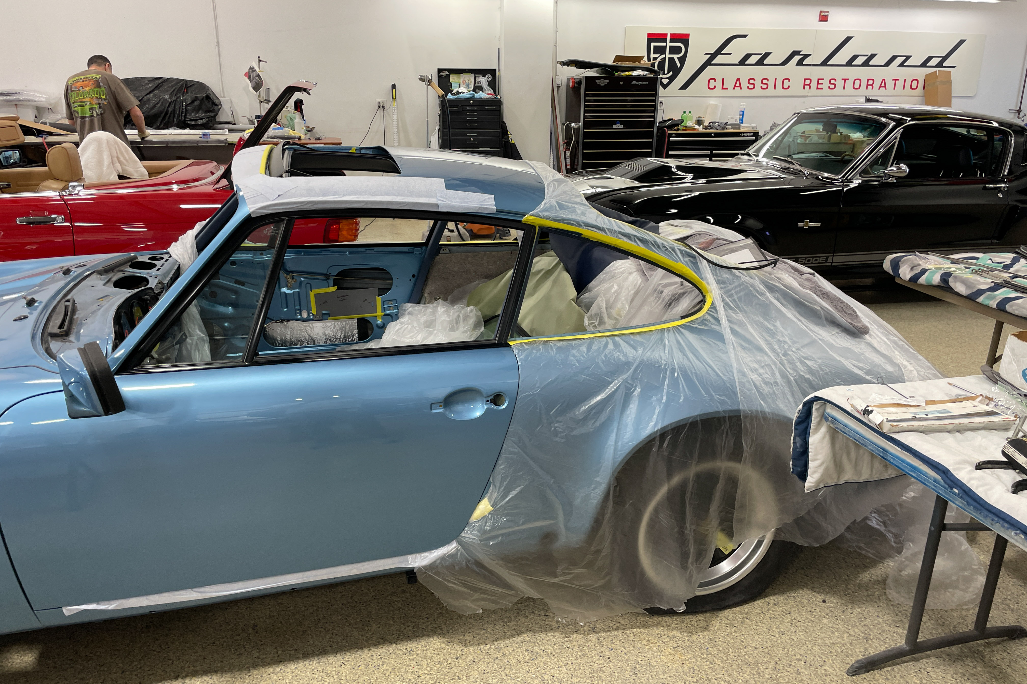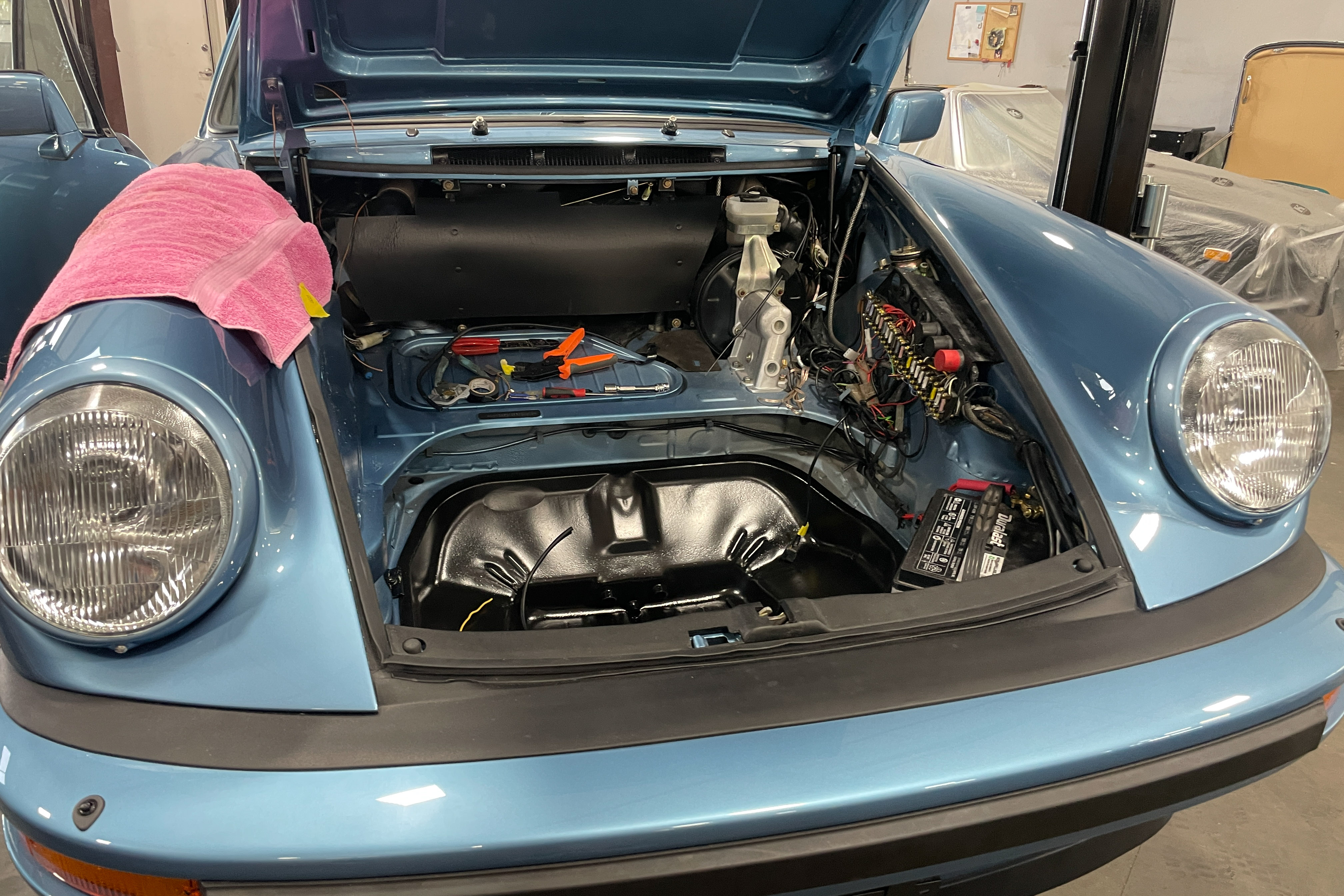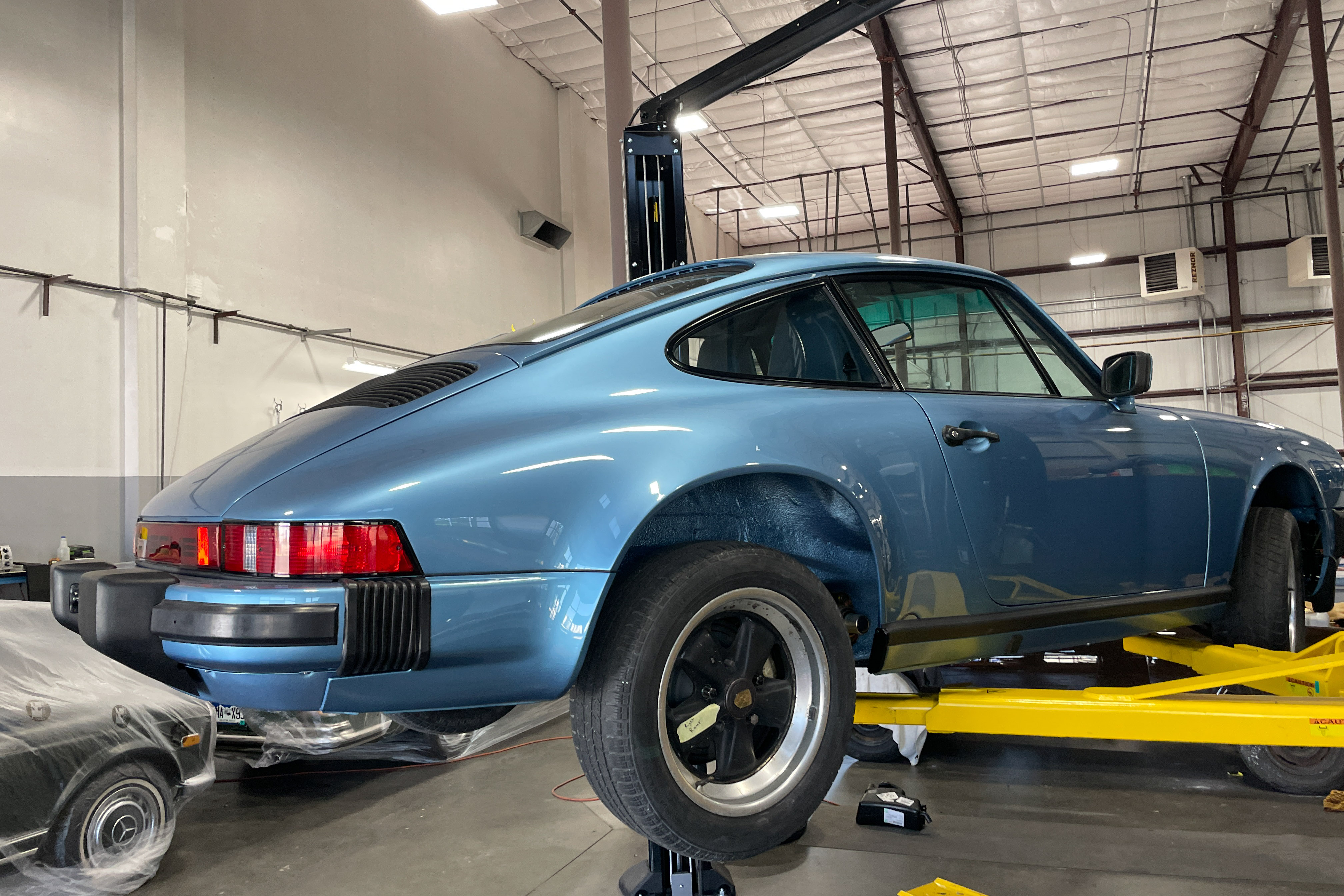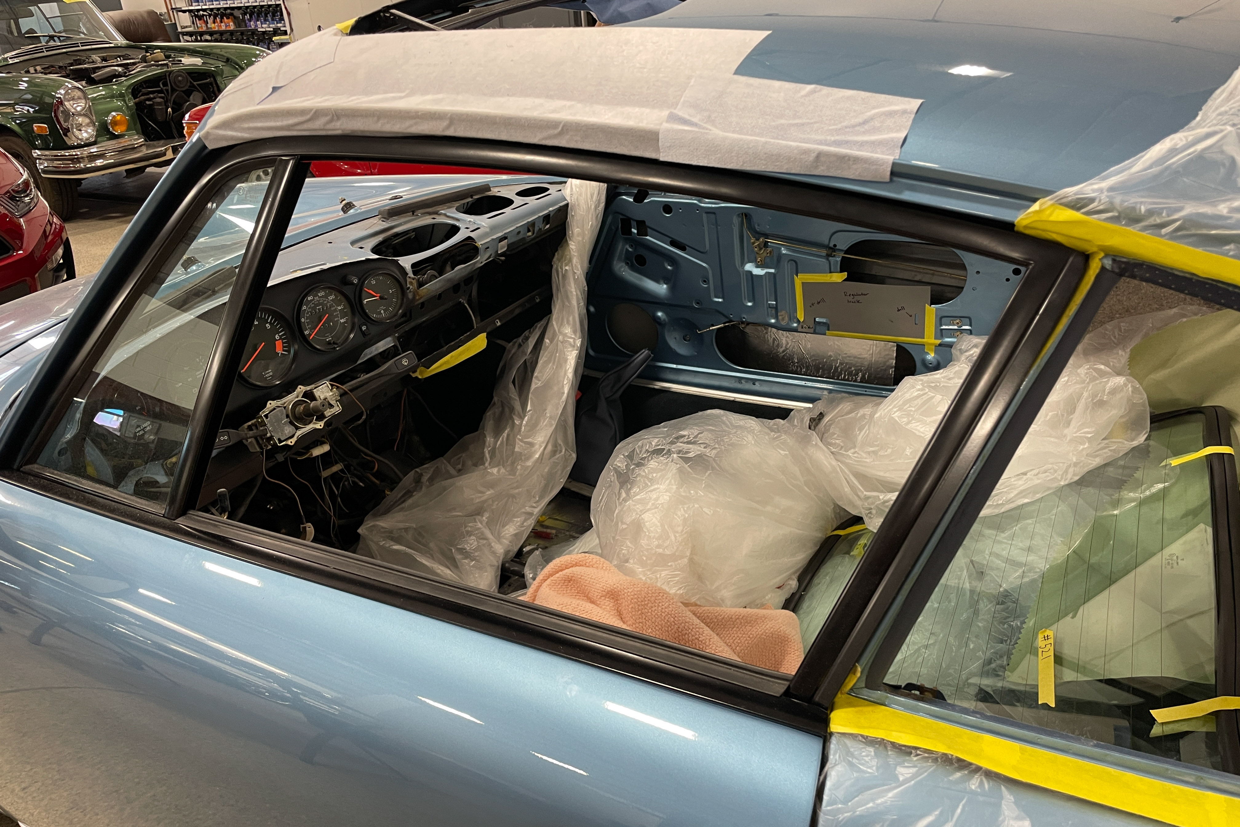 Next was extensive bodywork and metal. Followed by primer, paint, sanding, clear and more sanding. The Porsche factory Iris Blue came out great. Matching the exterior is a Porsche blue leather interior. Every last bit factory correct. There is endless detail work, especially on classic Porsche restorations. Also, remember that this car is going to Moment Motors in Texas to be converted to electric battery and motor. It’s already been there once – getting wiring in place and a lot more.