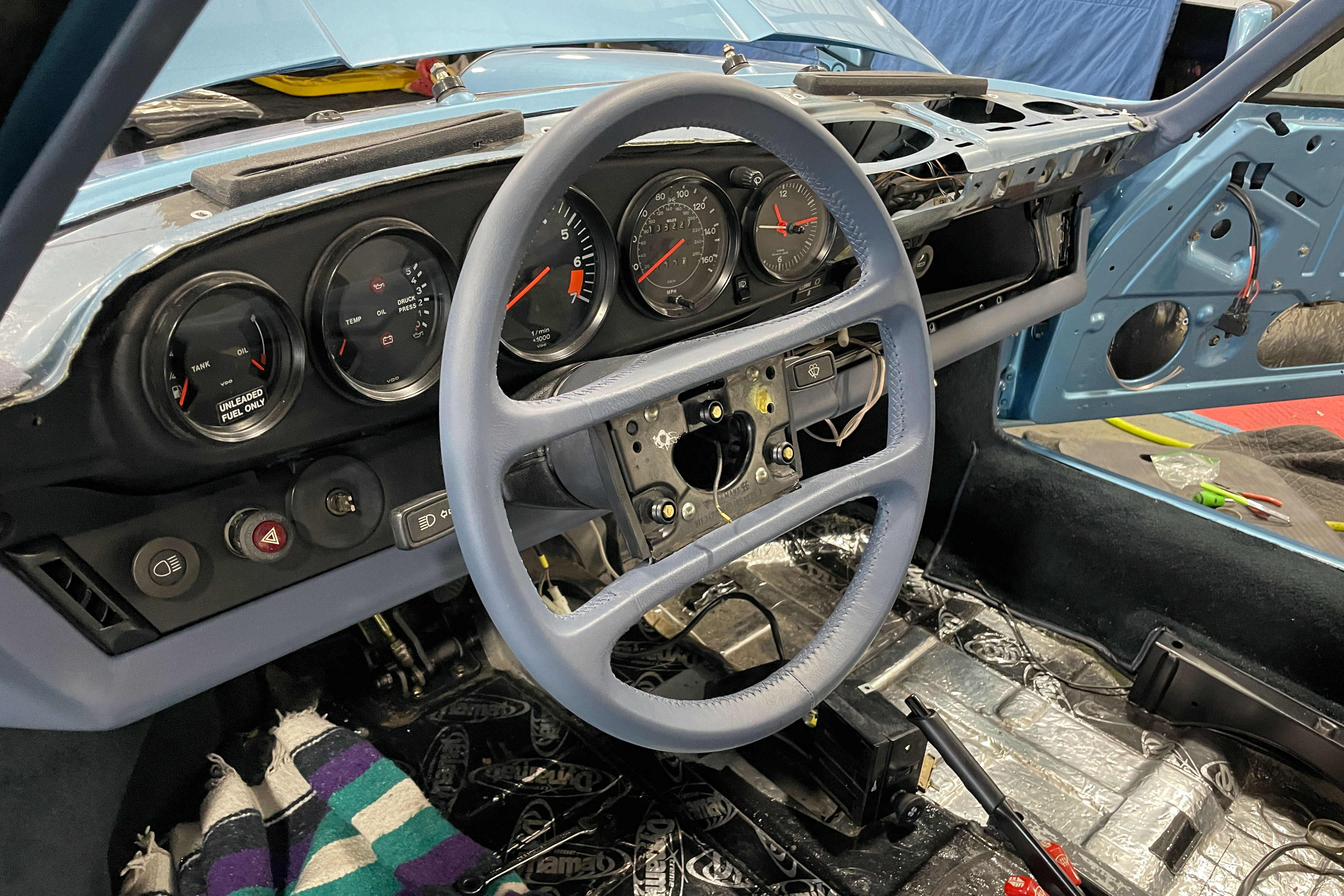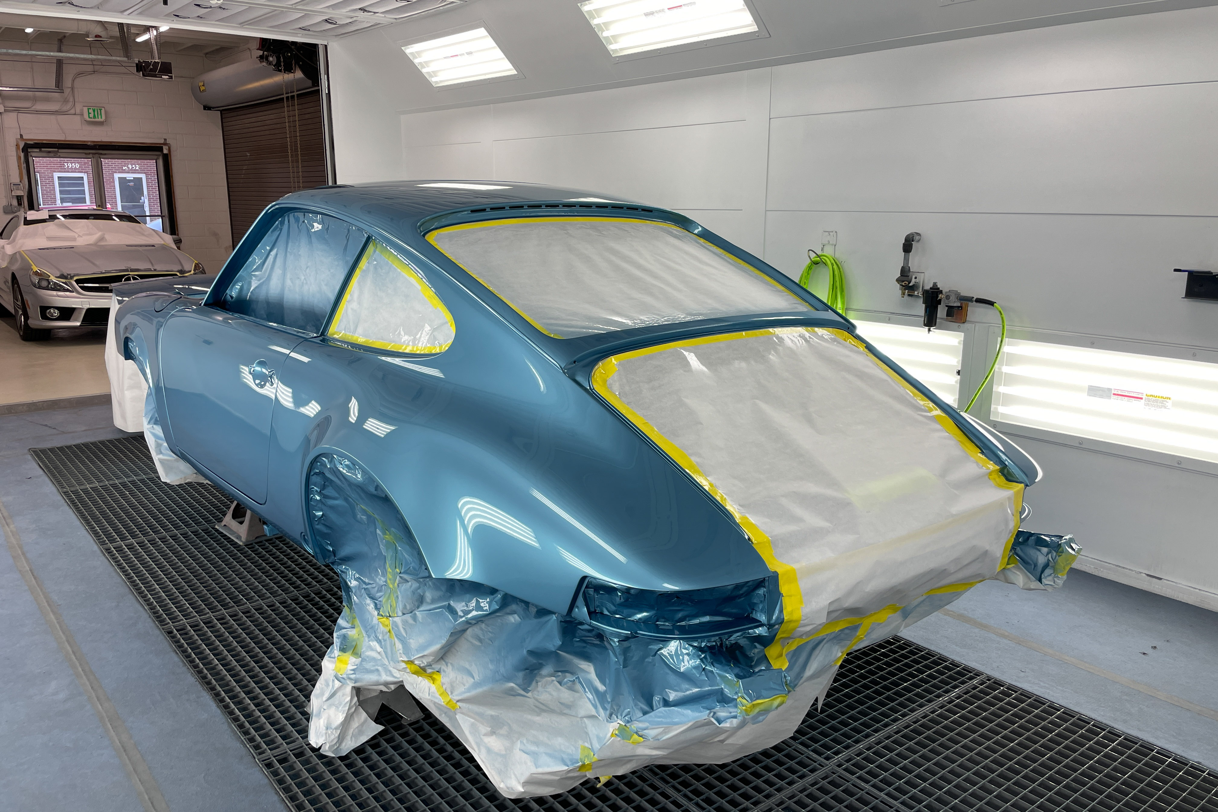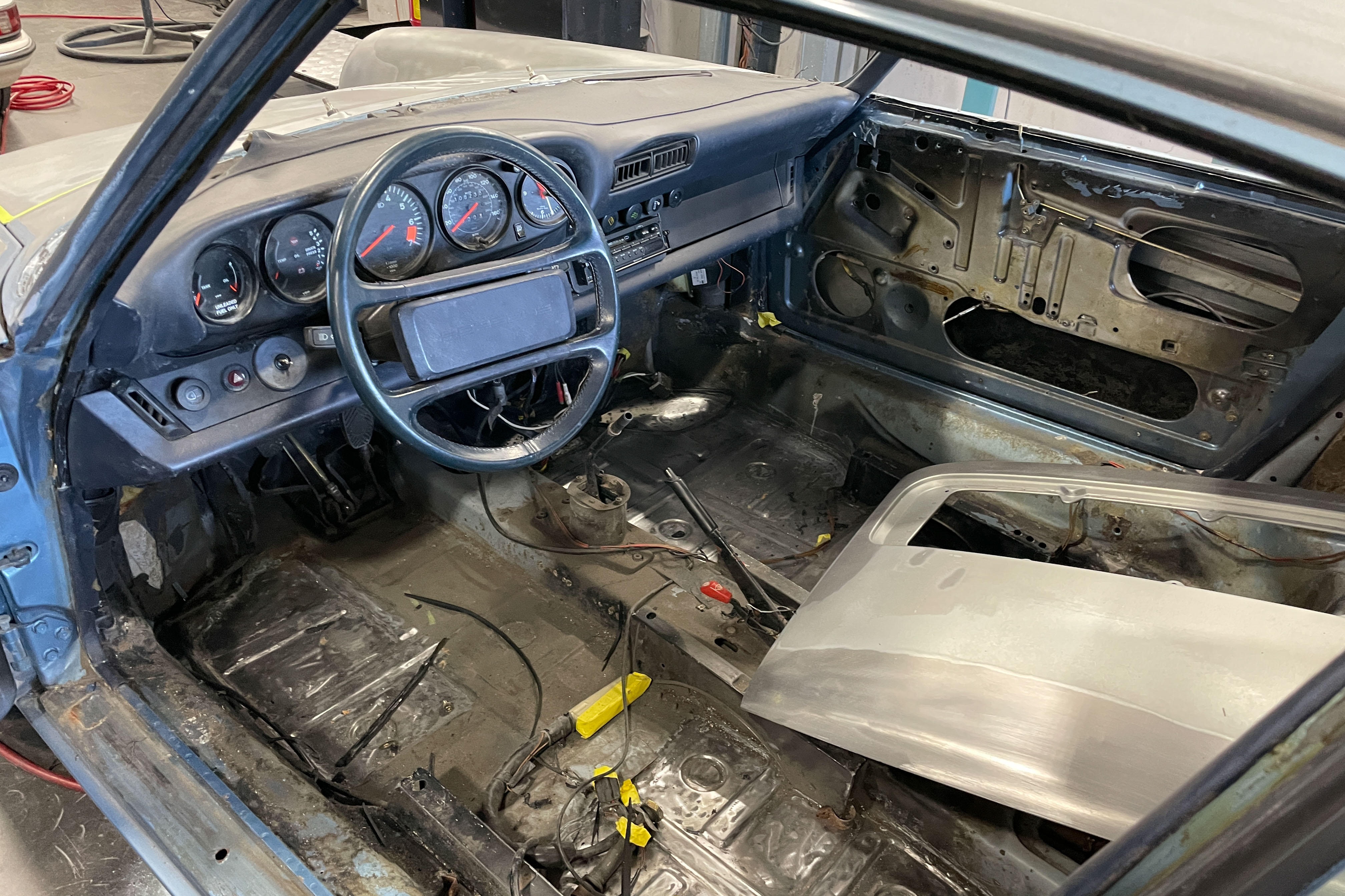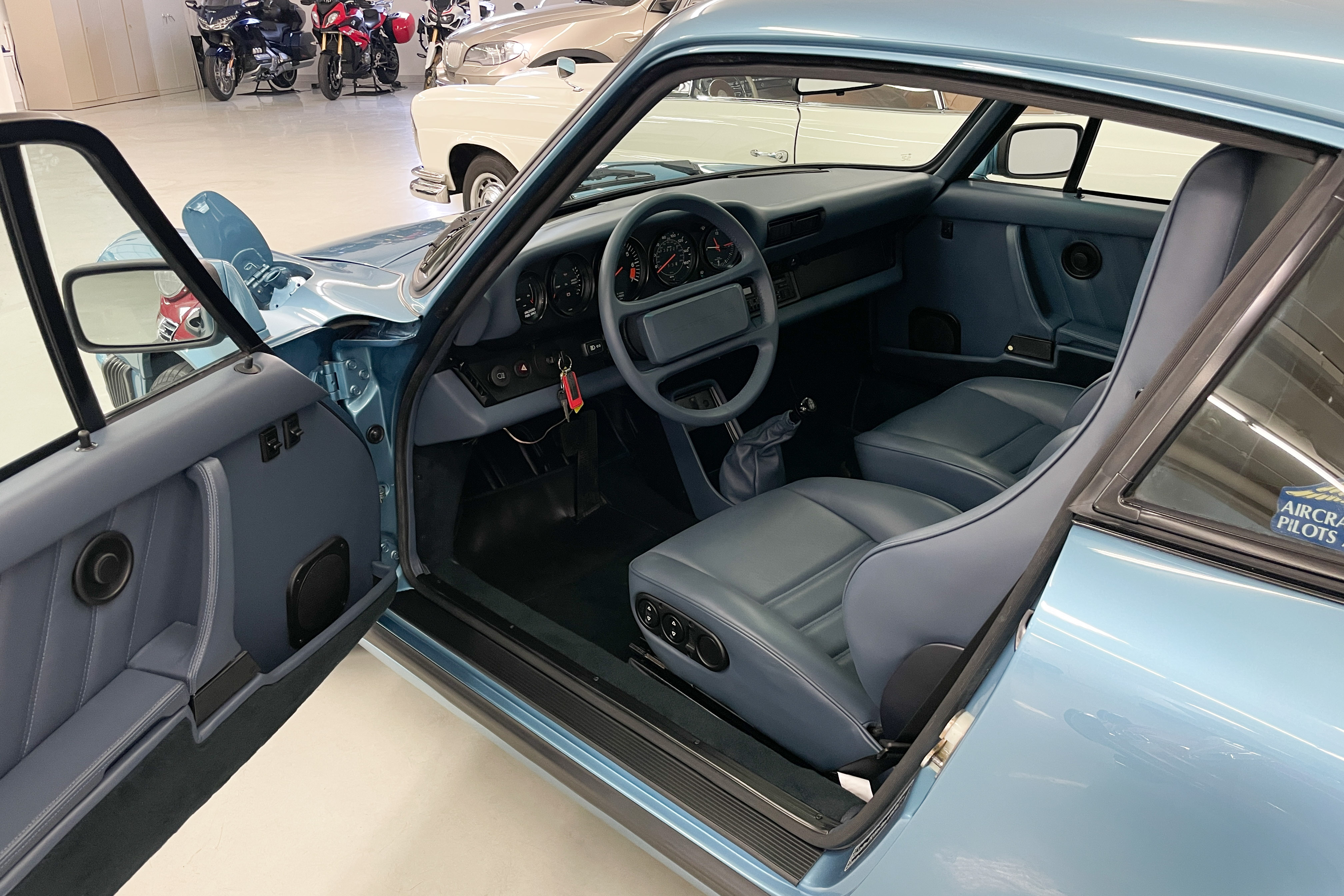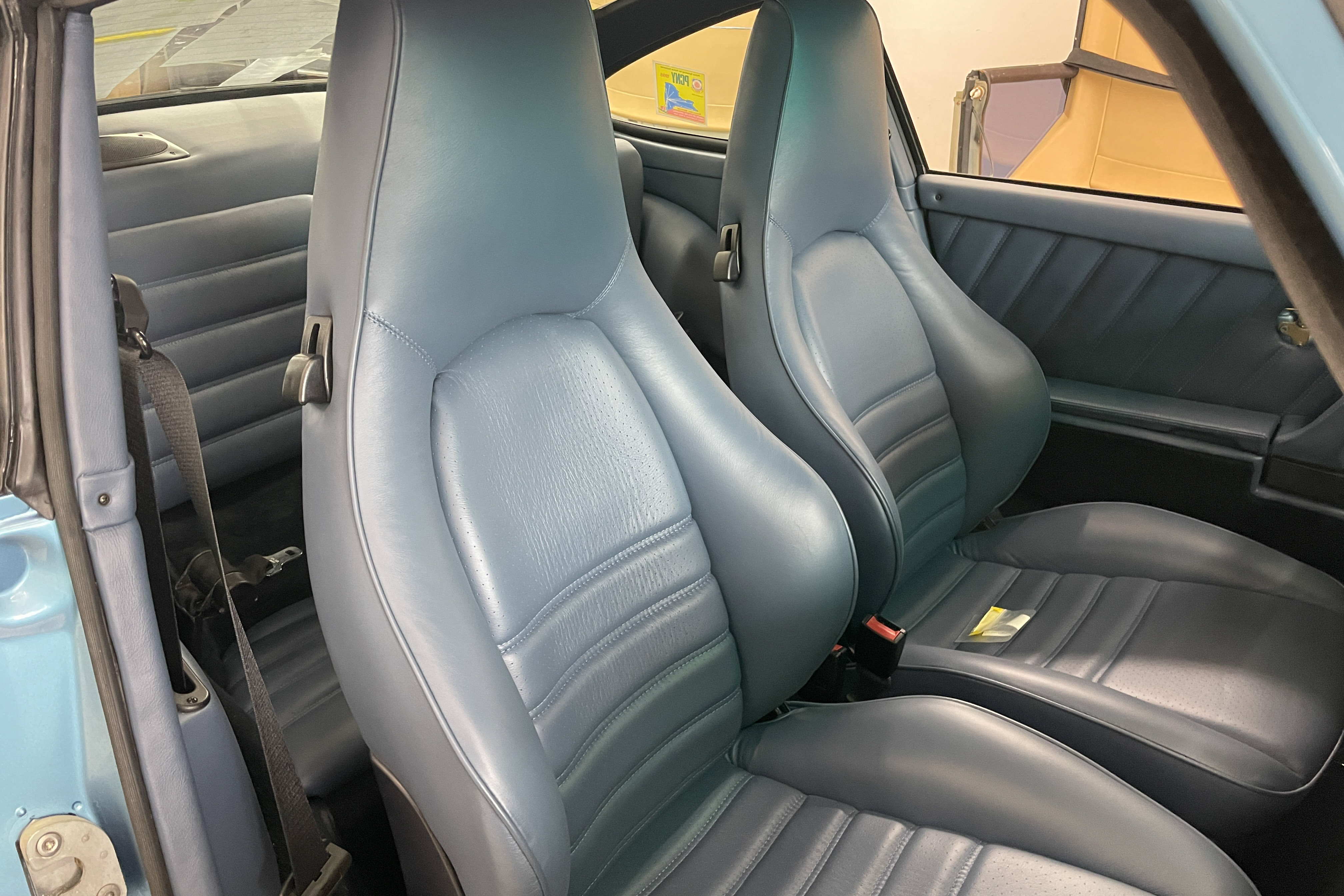 Next was extensive bodywork and metal. Followed by primer, paint, sanding, clear and more sanding. The Porsche factory Iris Blue came out great. Matching the exterior is a Porsche blue leather interior. Every last bit factory correct. There is endless detail work, especially on classic Porsche restorations. Also, remember that this car is going to Moment Motors in Texas to be converted to electric battery and motor. It’s already been there once – getting wiring in place and a lot more.