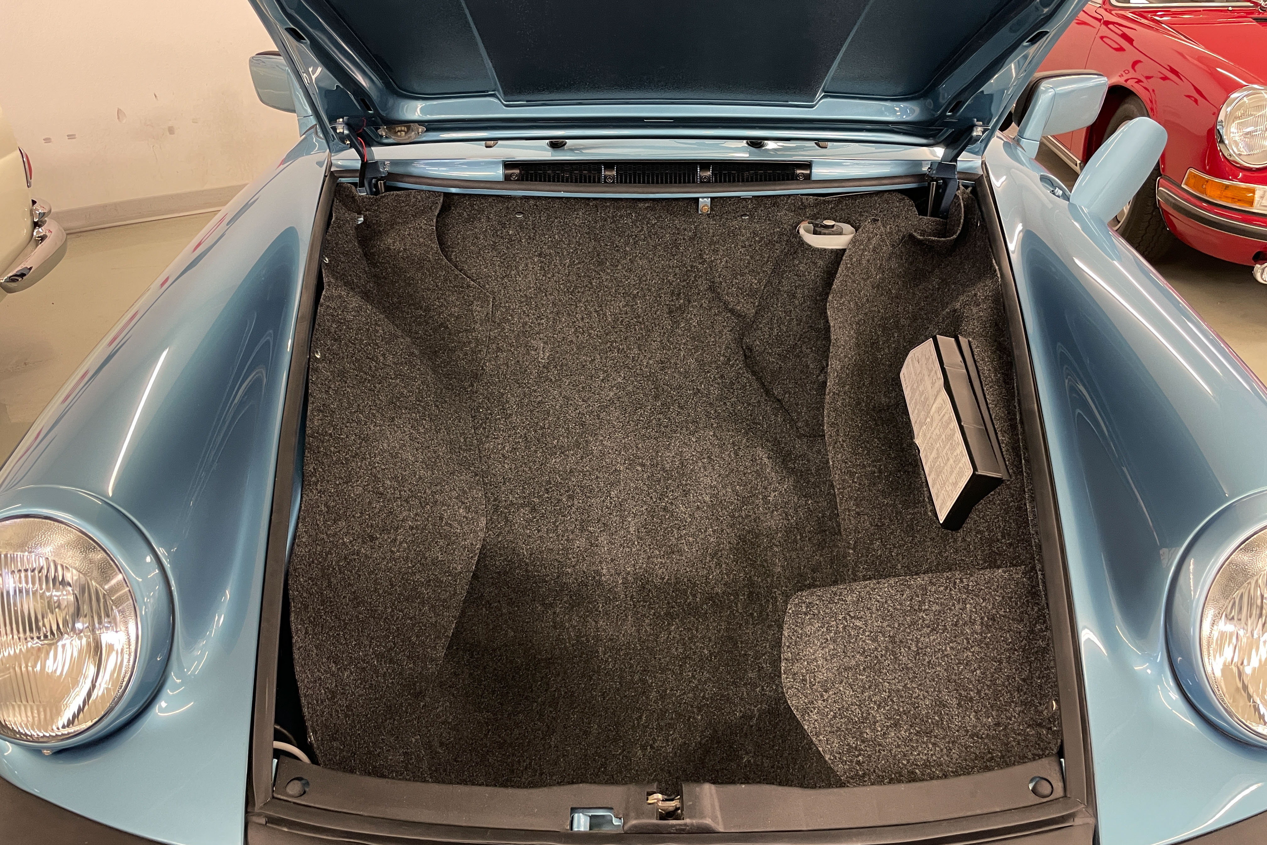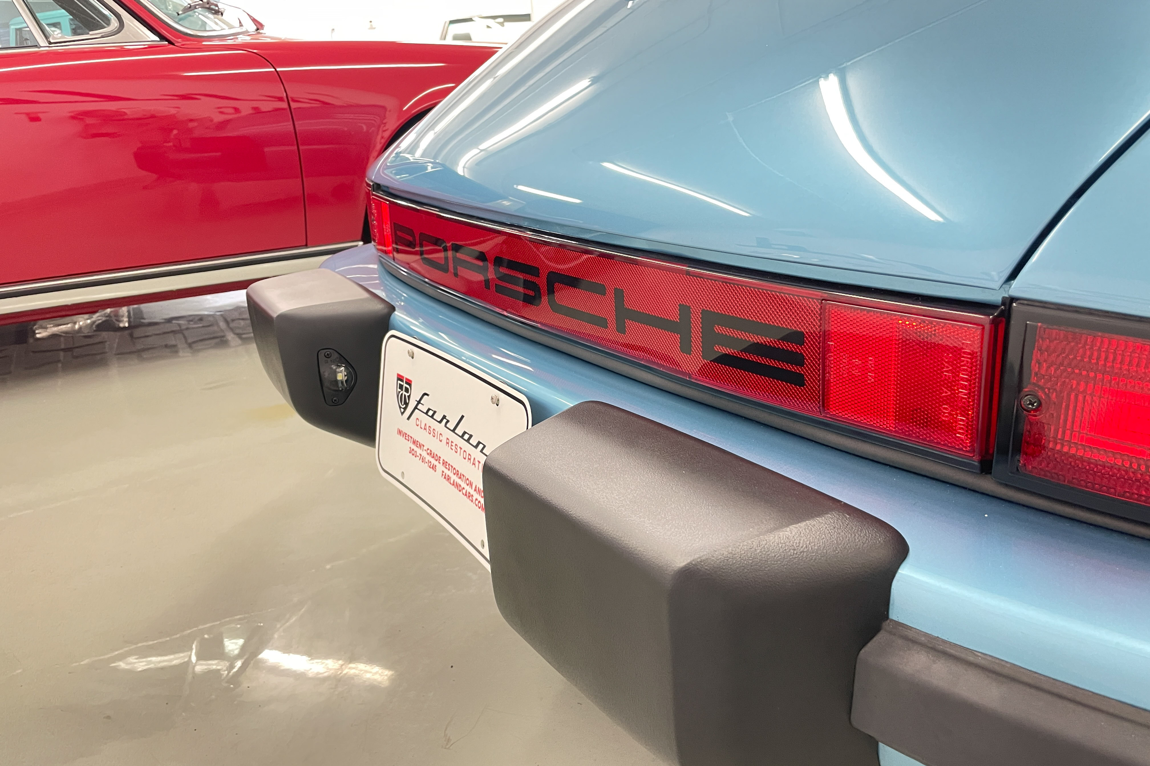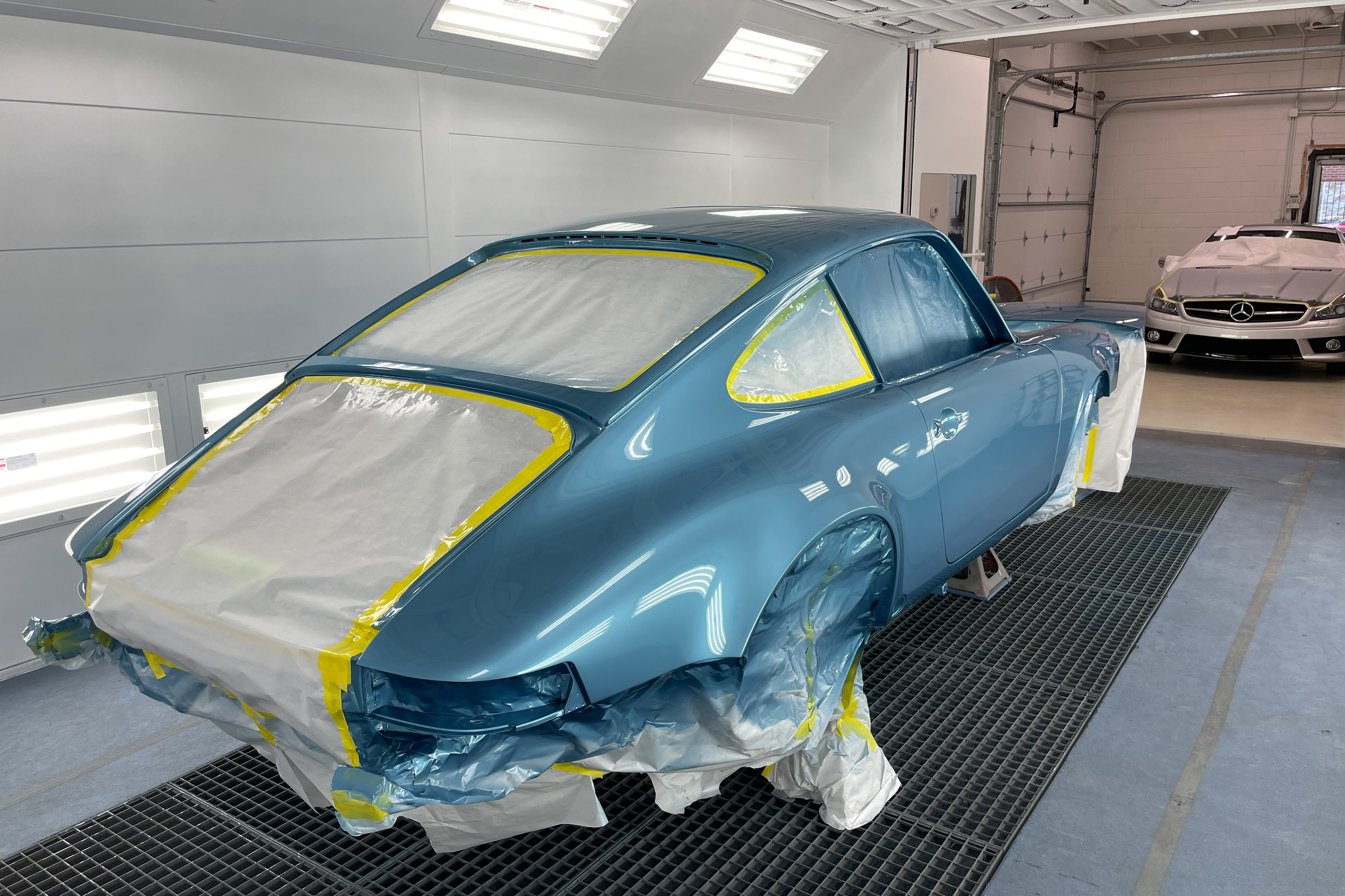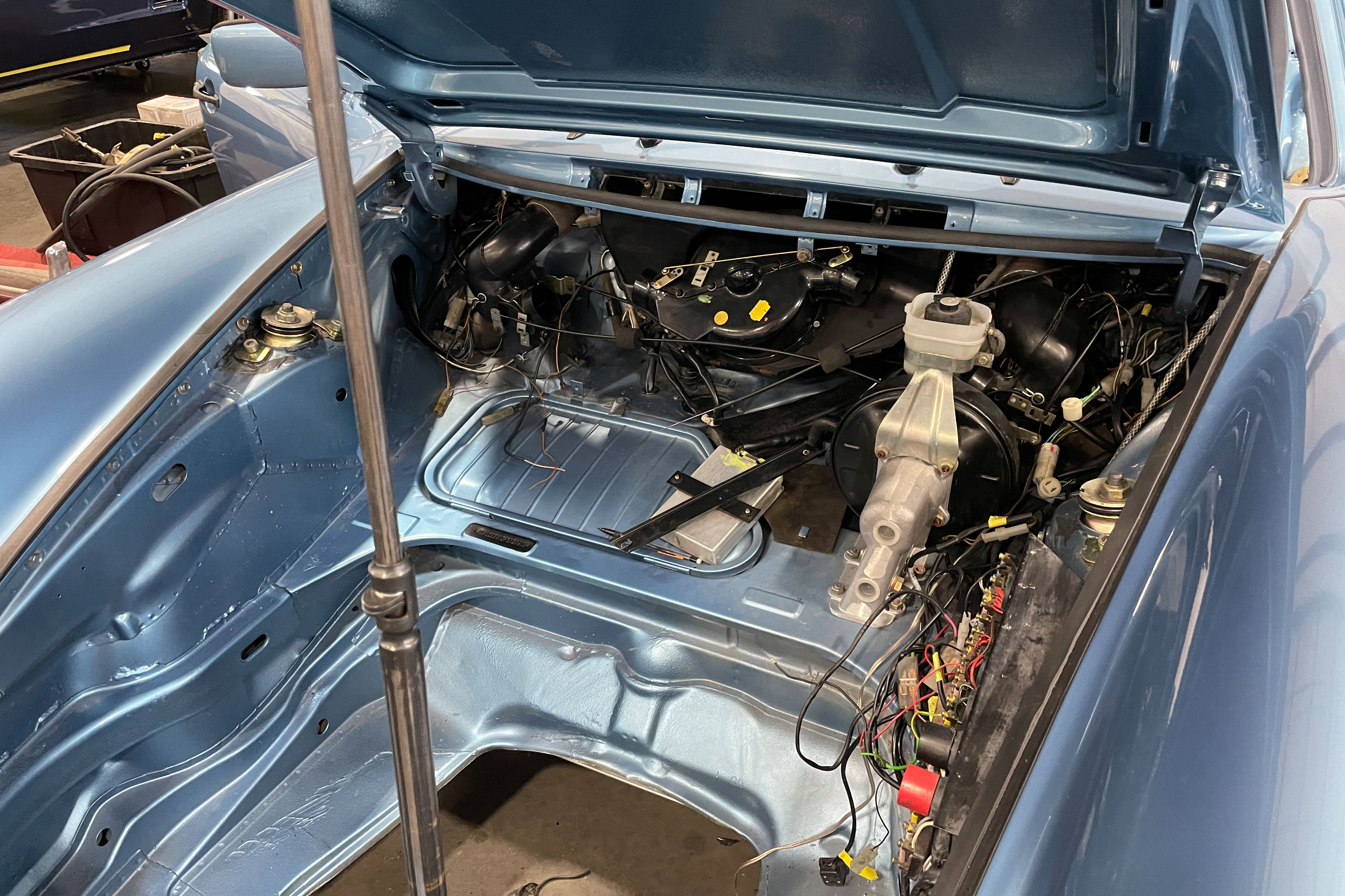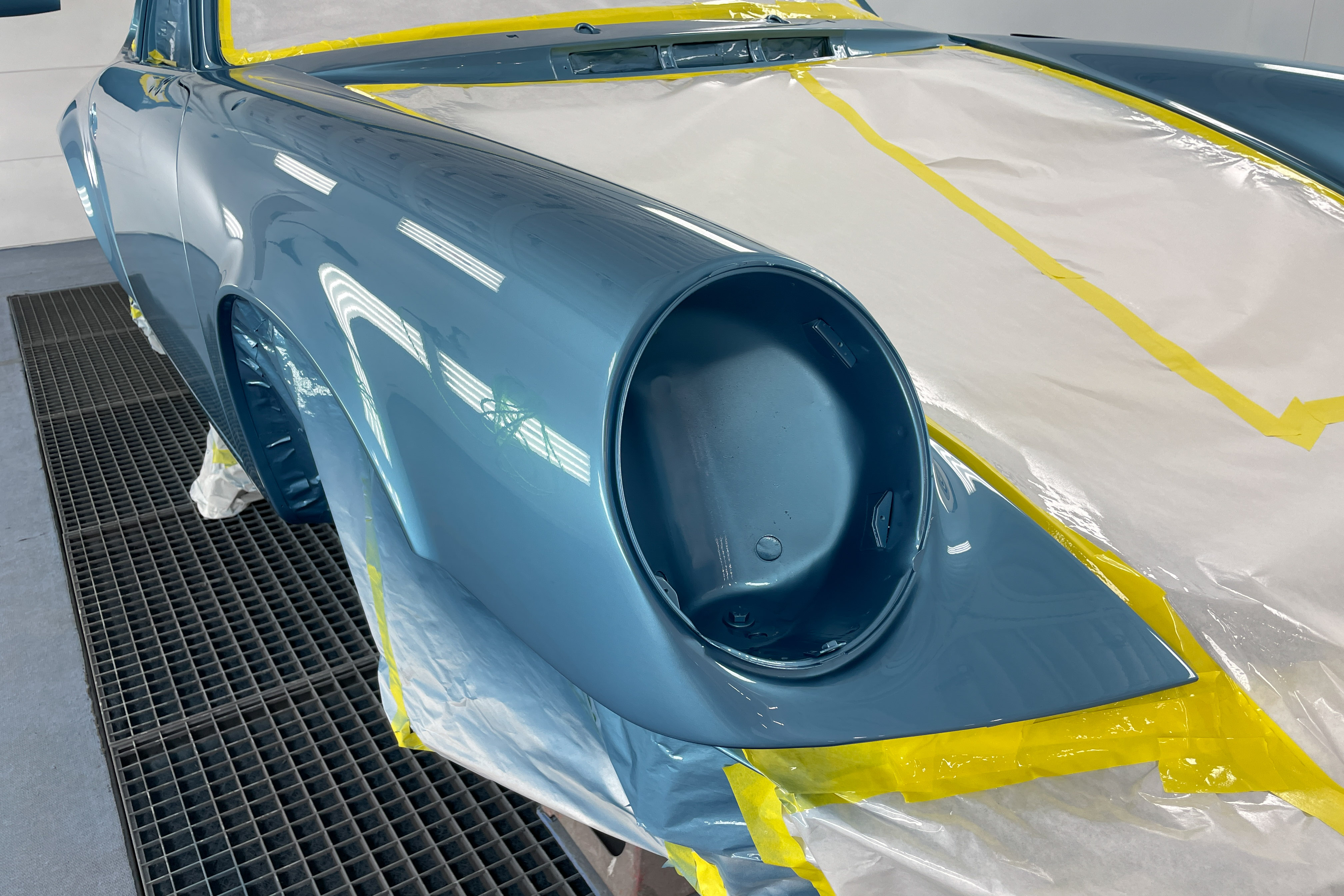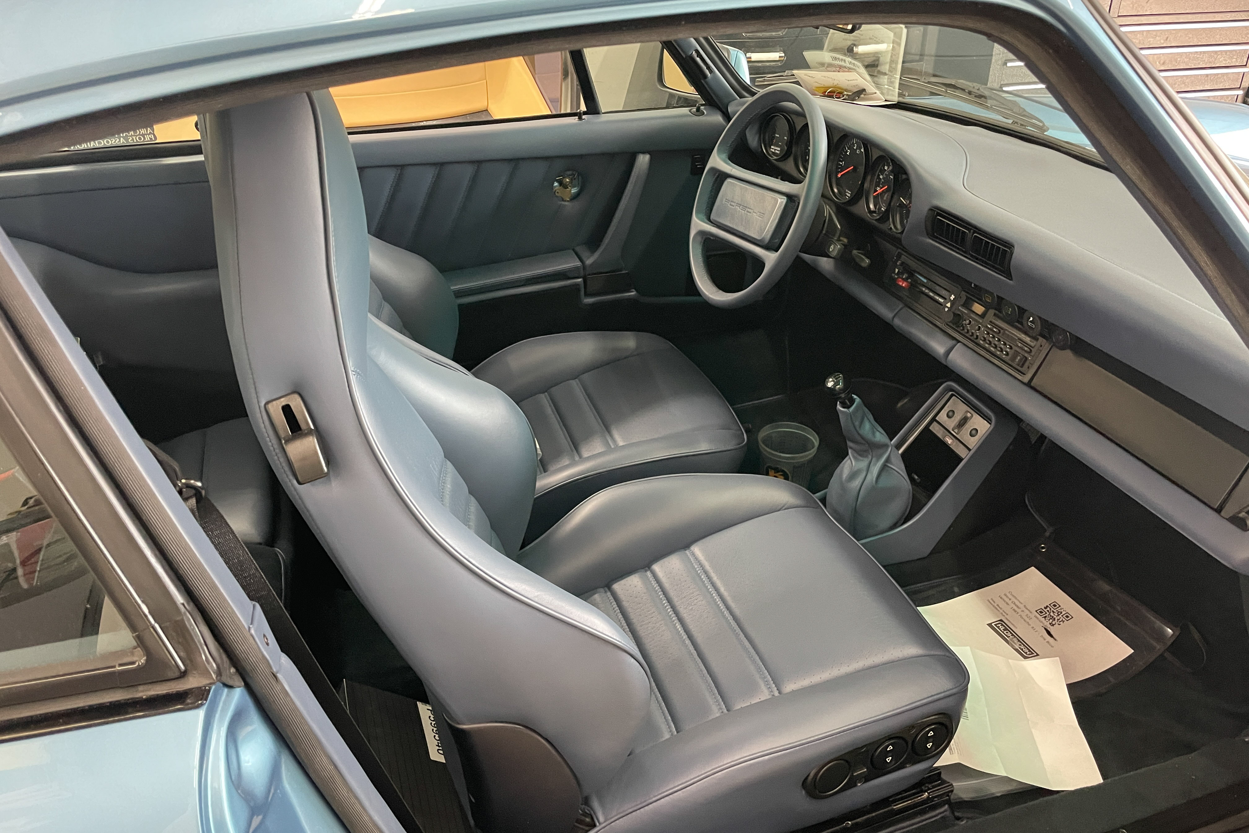 Next was extensive bodywork and metal. Followed by primer, paint, sanding, clear and more sanding. The Porsche factory Iris Blue came out great. Matching the exterior is a Porsche blue leather interior. Every last bit factory correct. There is endless detail work, especially on classic Porsche restorations. Also, remember that this car is going to Moment Motors in Texas to be converted to electric battery and motor. It’s already been there once – getting wiring in place and a lot more.