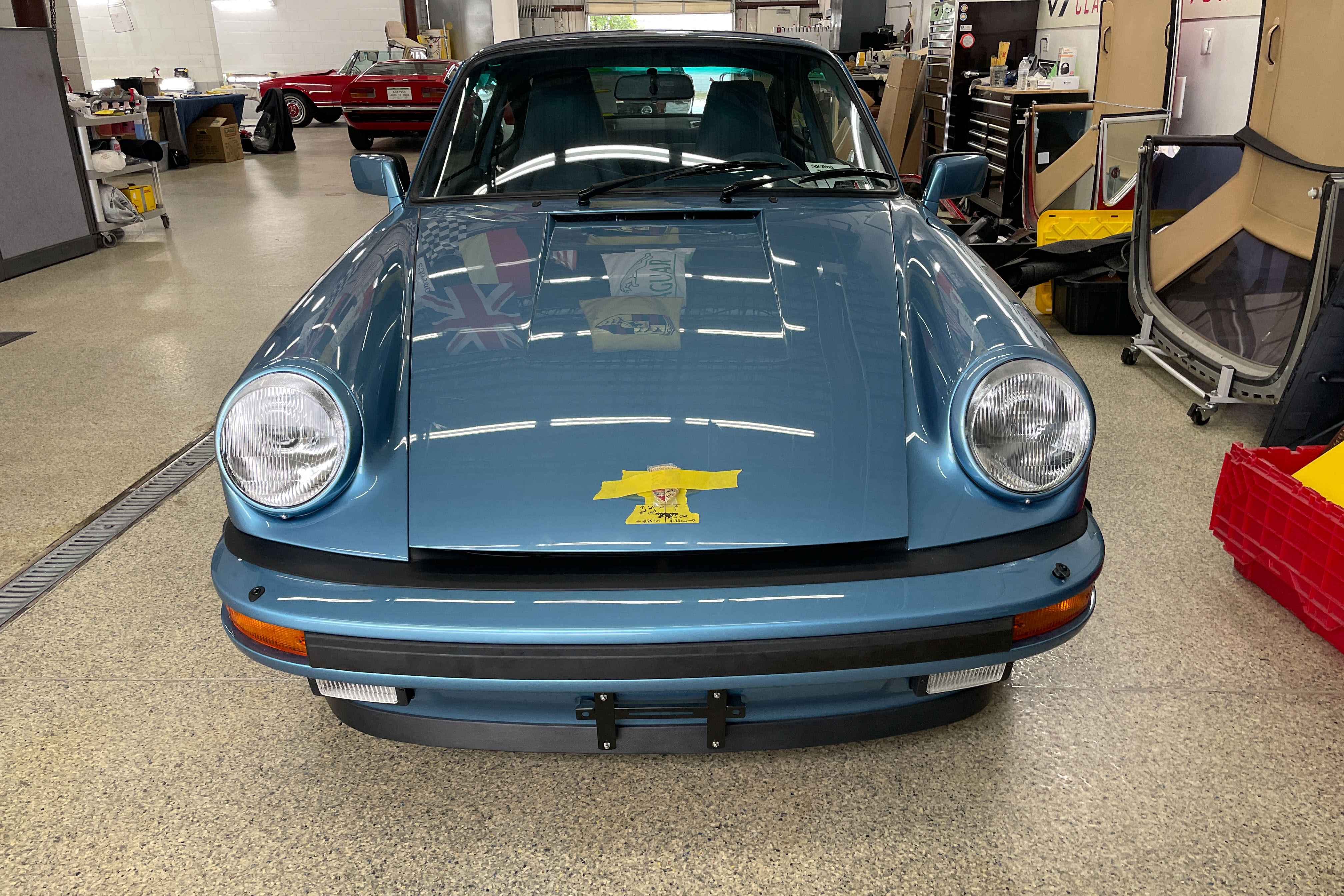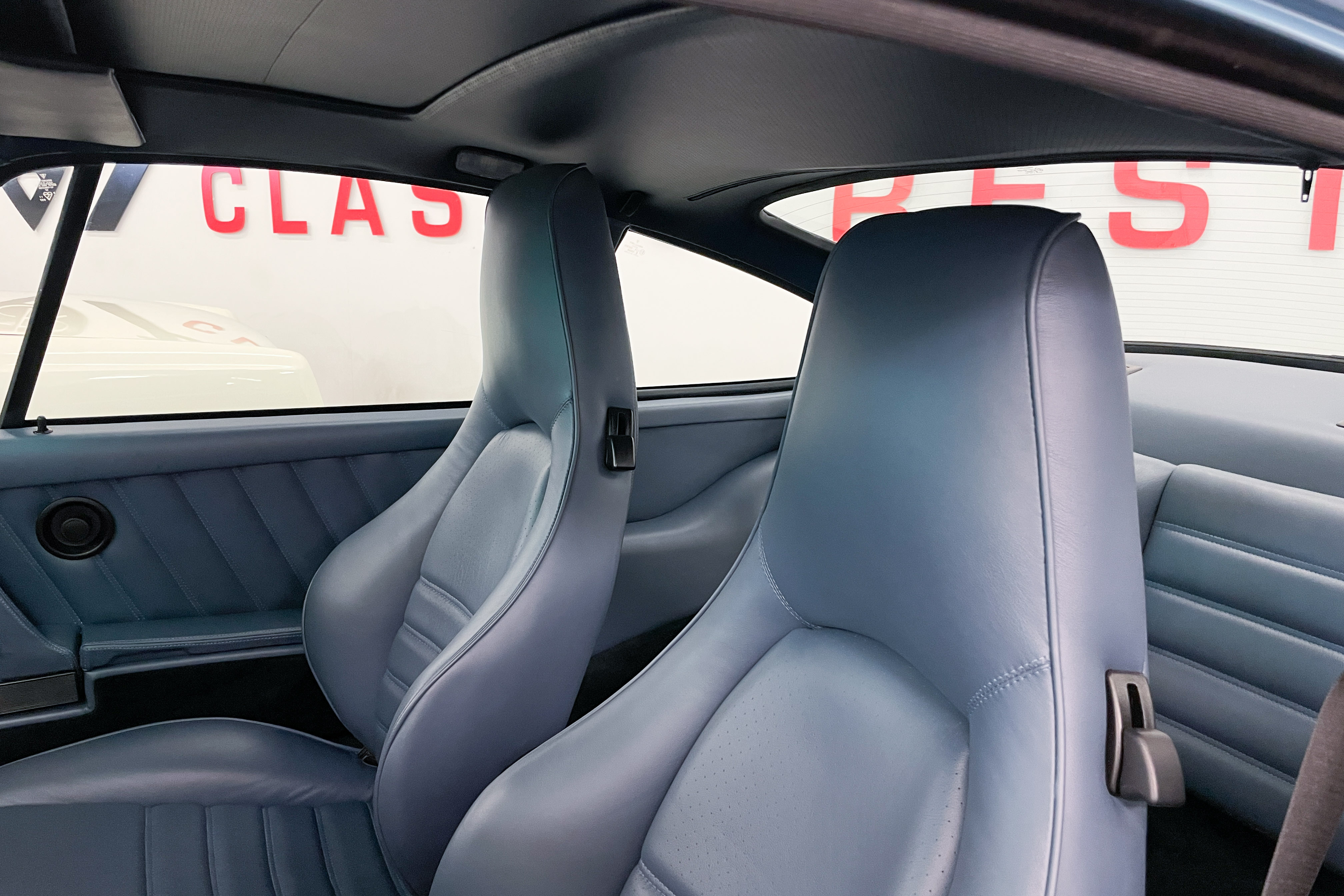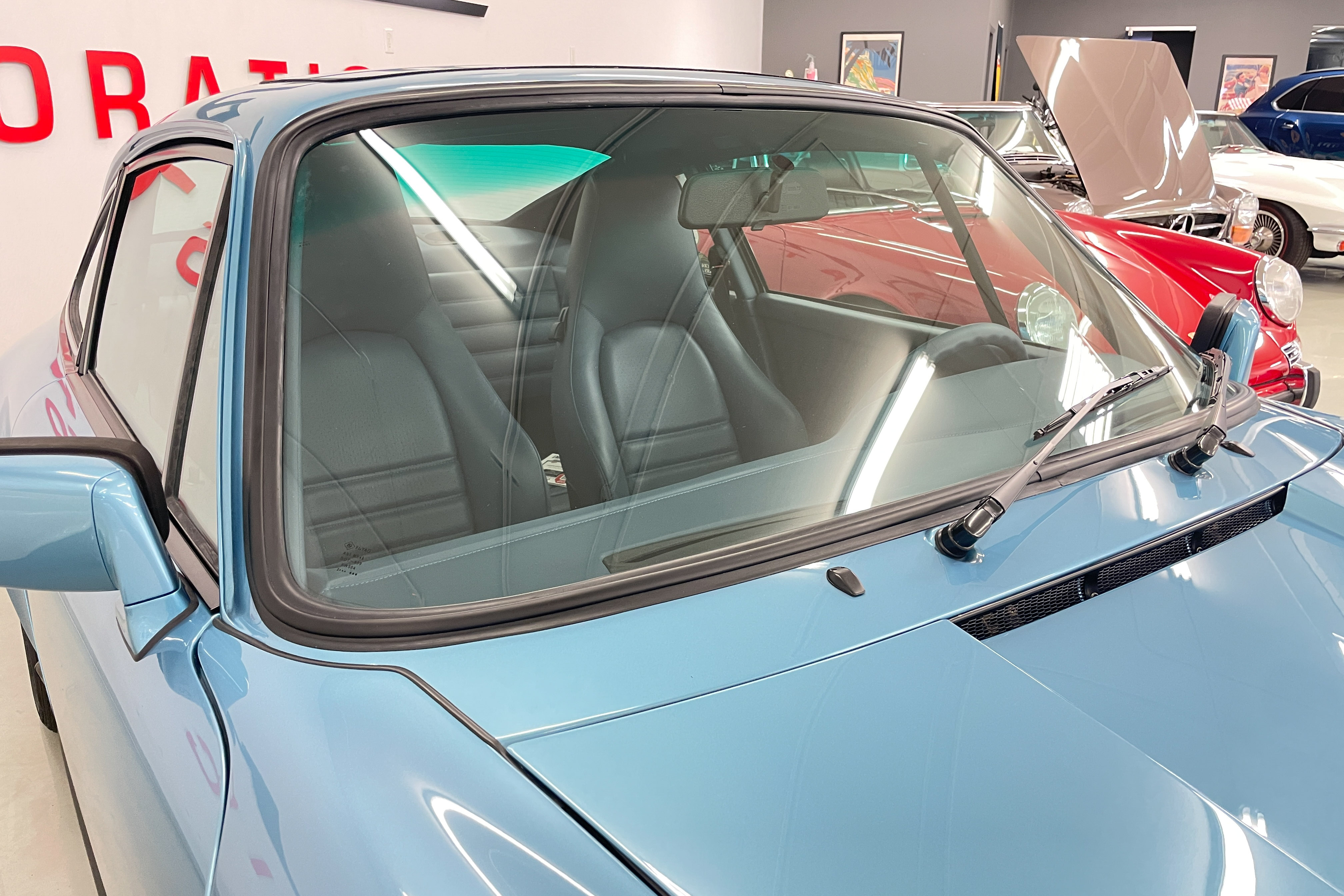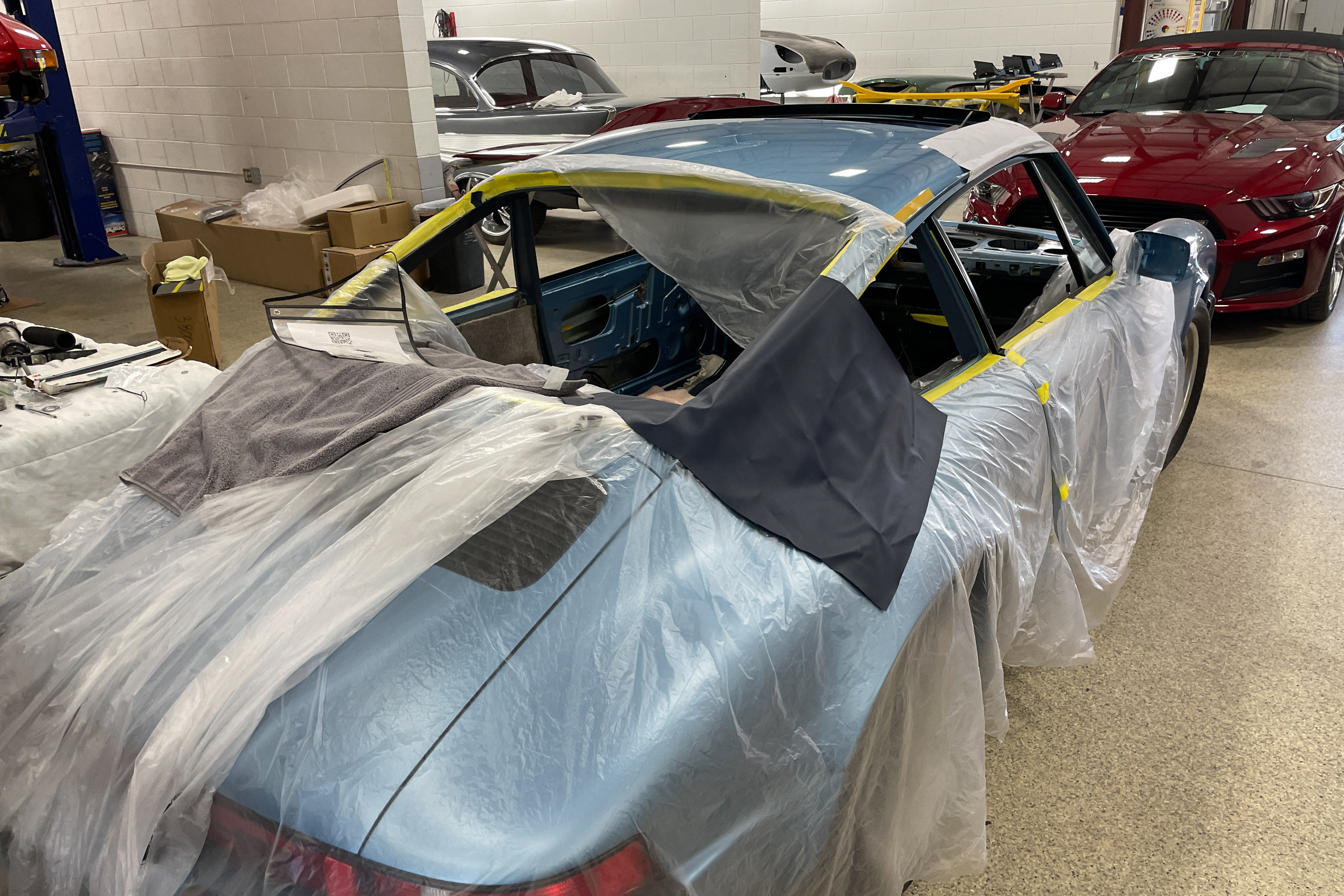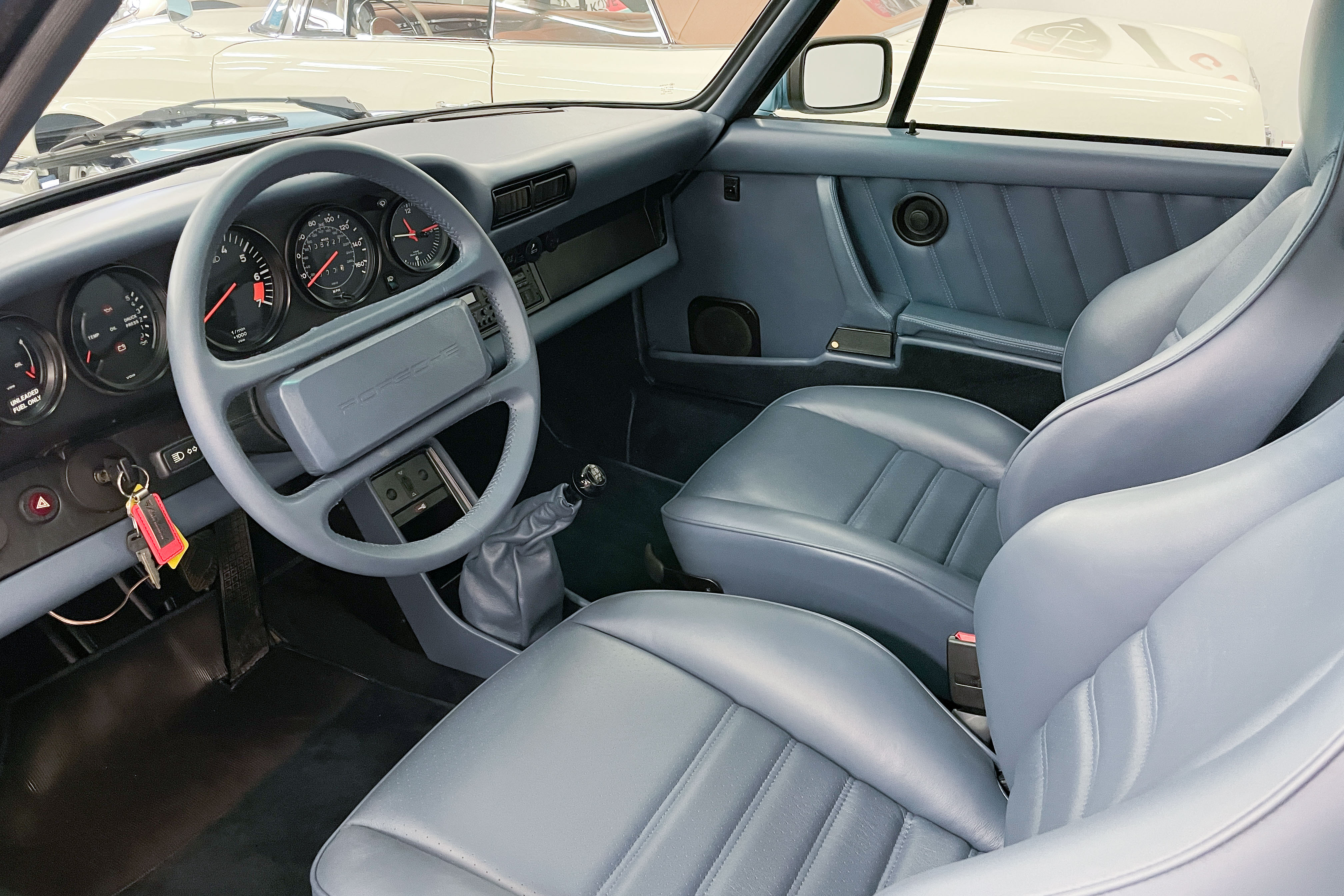 Next was extensive bodywork and metal. Followed by primer, paint, sanding, clear and more sanding. The Porsche factory Iris Blue came out great. Matching the exterior is a Porsche blue leather interior. Every last bit factory correct. There is endless detail work, especially on classic Porsche restorations. Also, remember that this car is going to Moment Motors in Texas to be converted to electric battery and motor. It’s already been there once – getting wiring in place and a lot more.