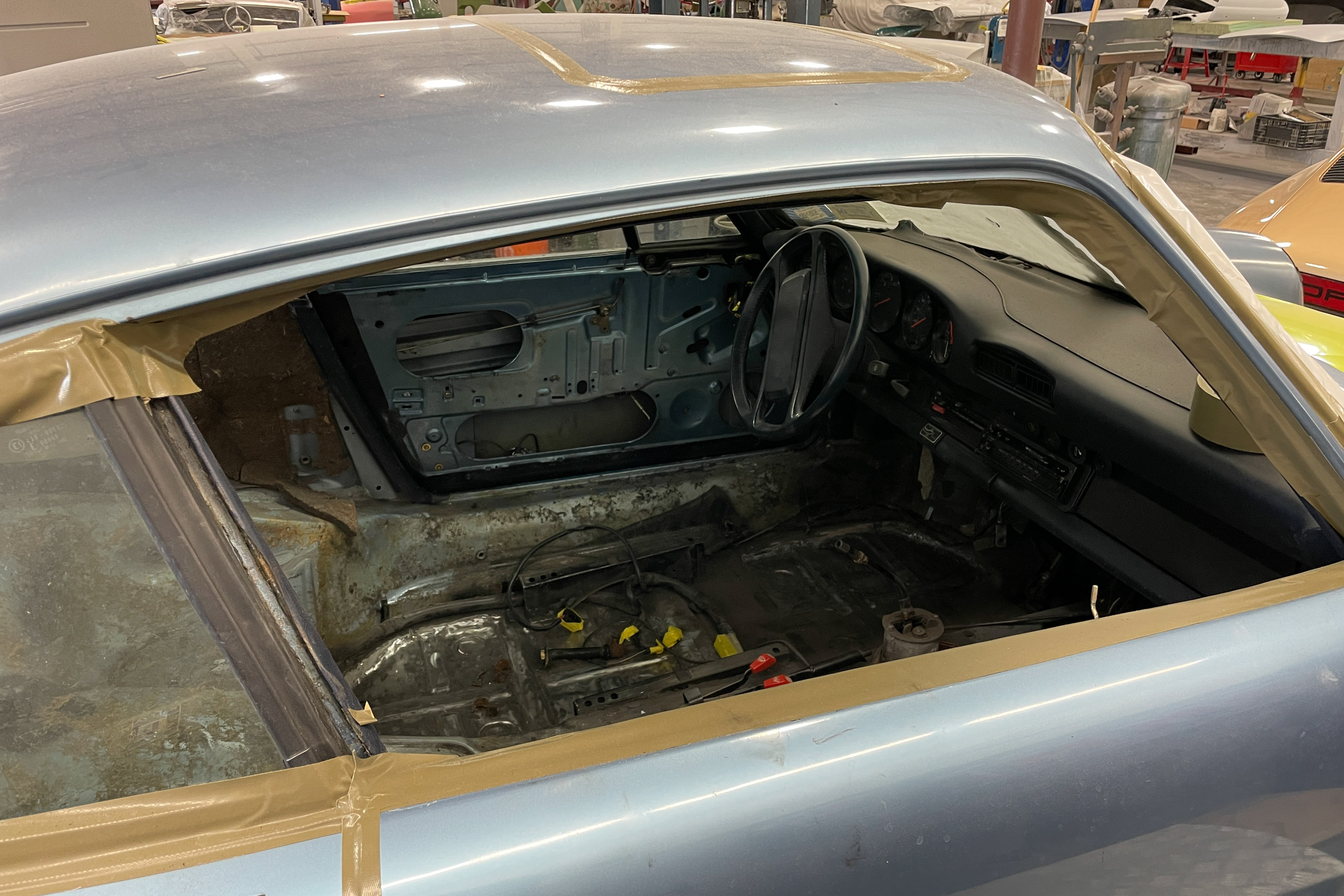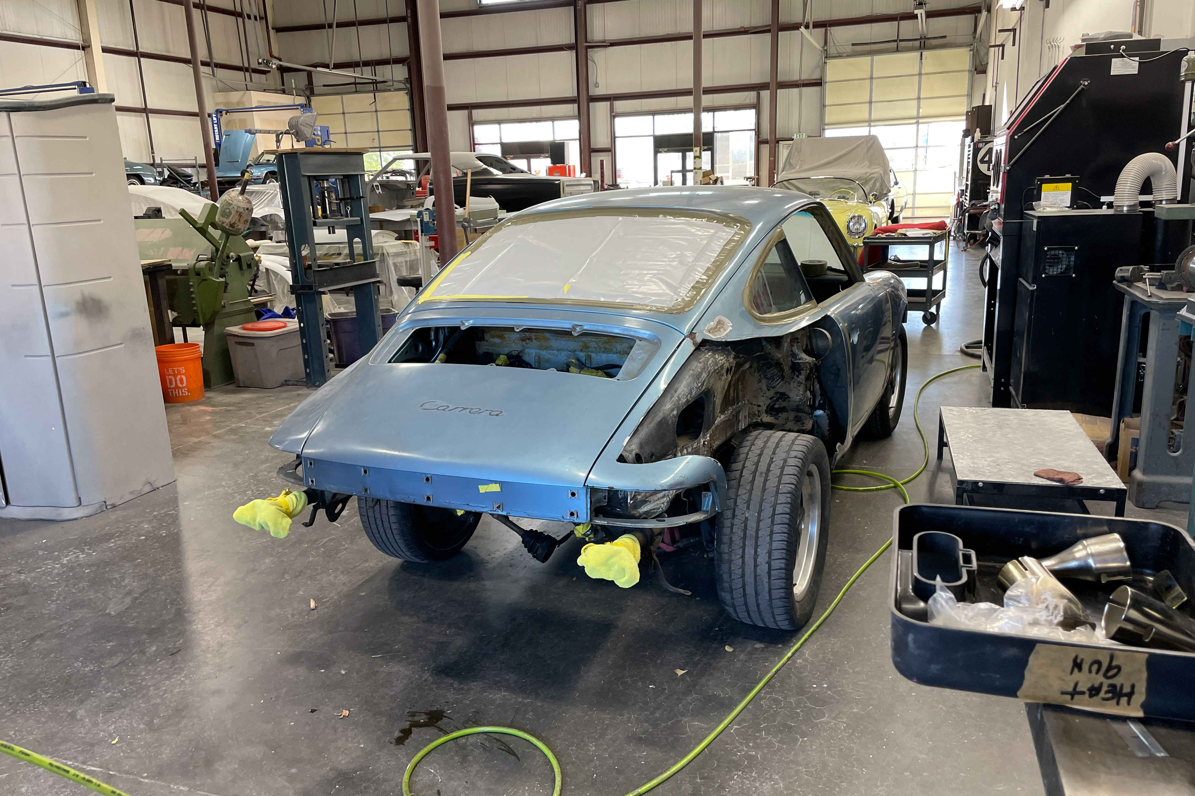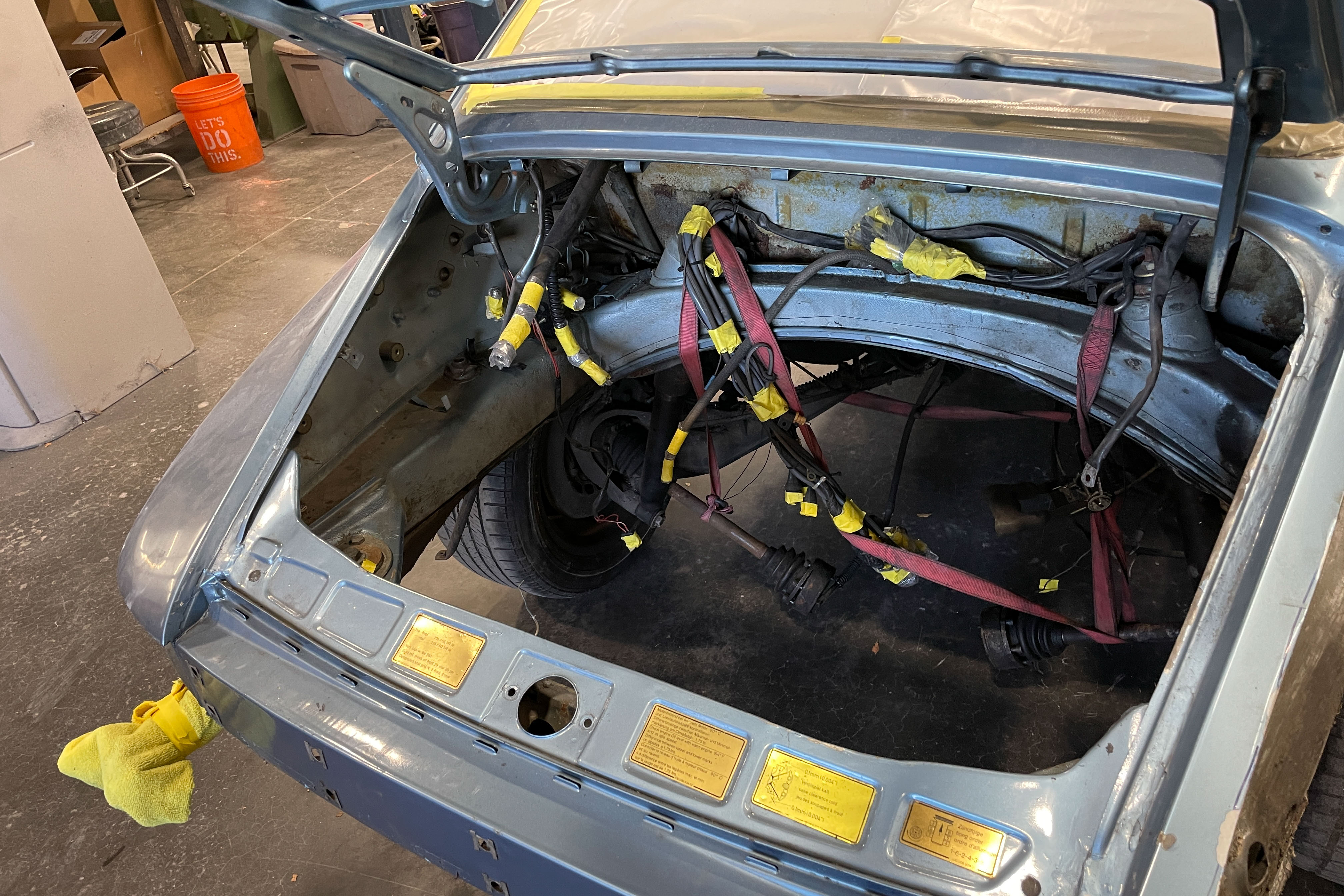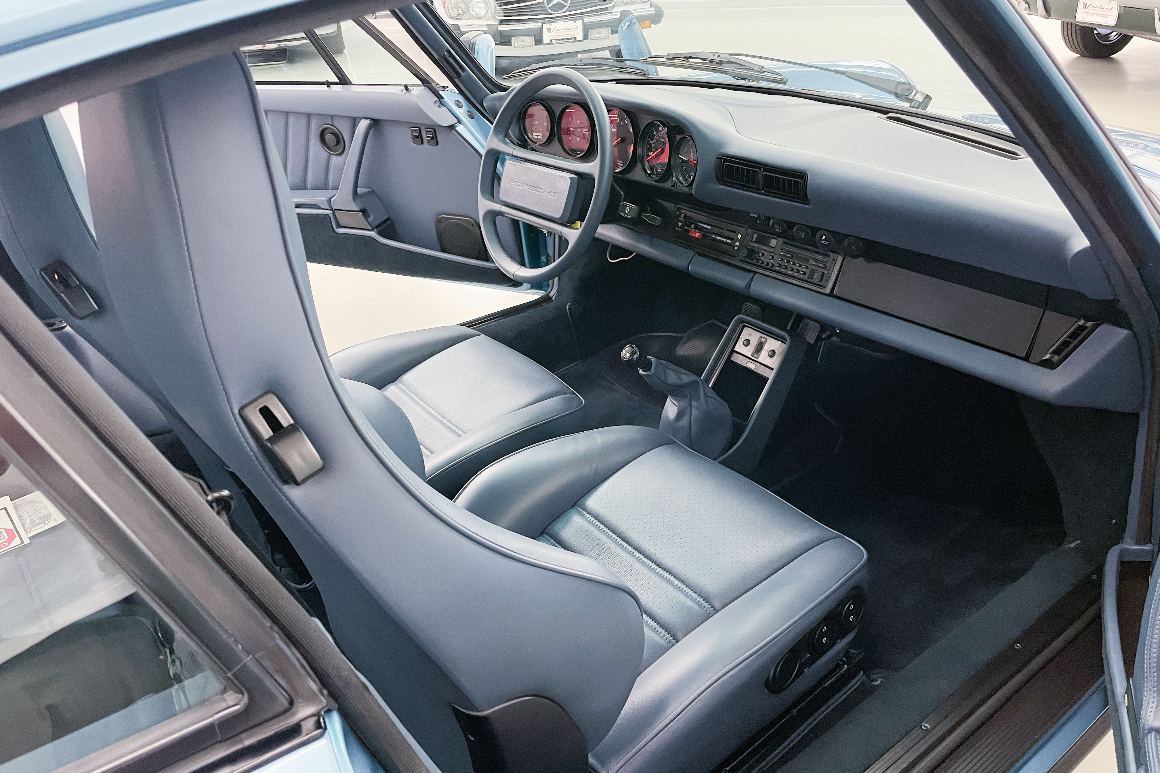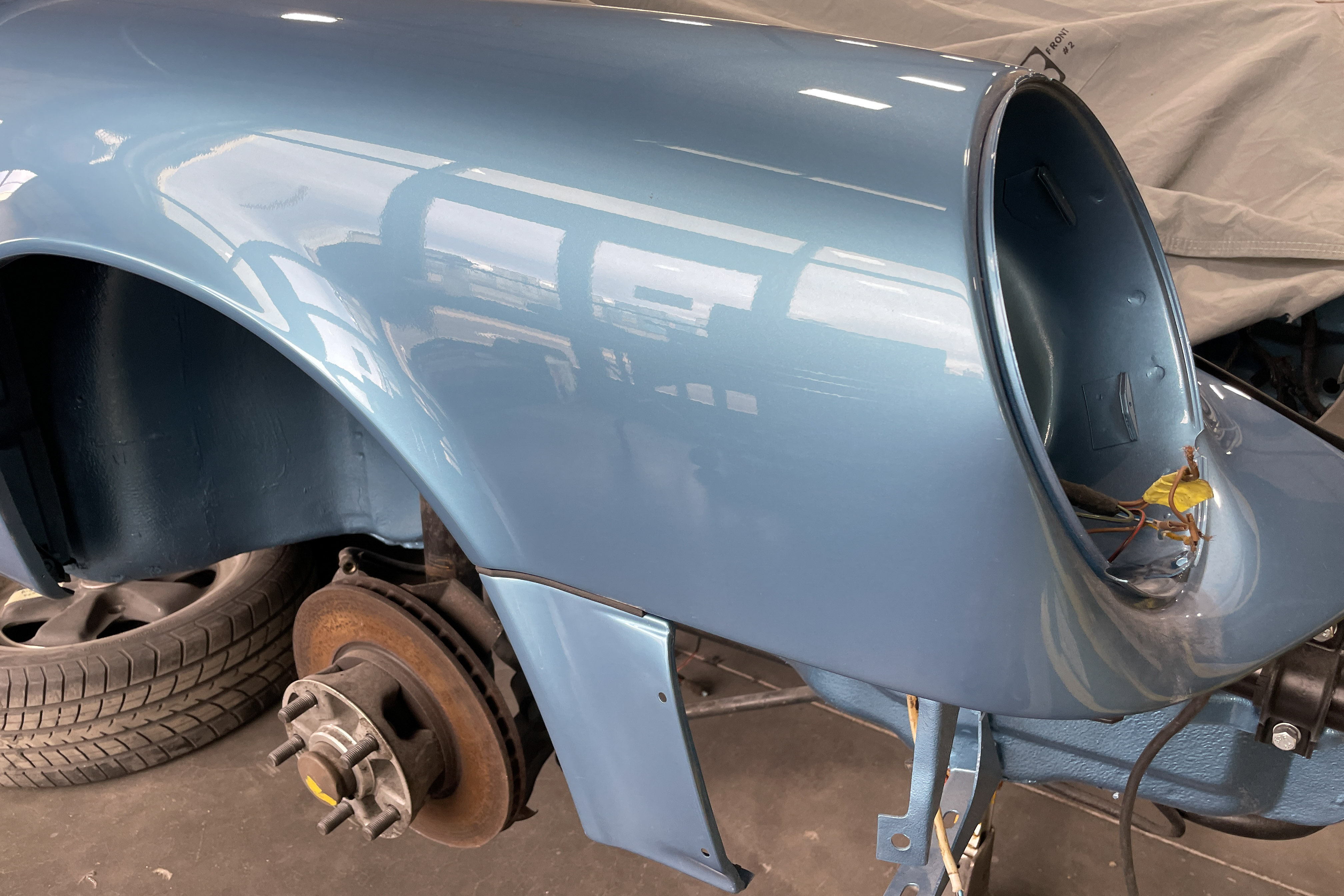 Next was extensive bodywork and metal. Followed by primer, paint, sanding, clear and more sanding. The Porsche factory Iris Blue came out great. Matching the exterior is a Porsche blue leather interior. Every last bit factory correct. There is endless detail work, especially on classic Porsche restorations. Also, remember that this car is going to Moment Motors in Texas to be converted to electric battery and motor. It’s already been there once – getting wiring in place and a lot more.
