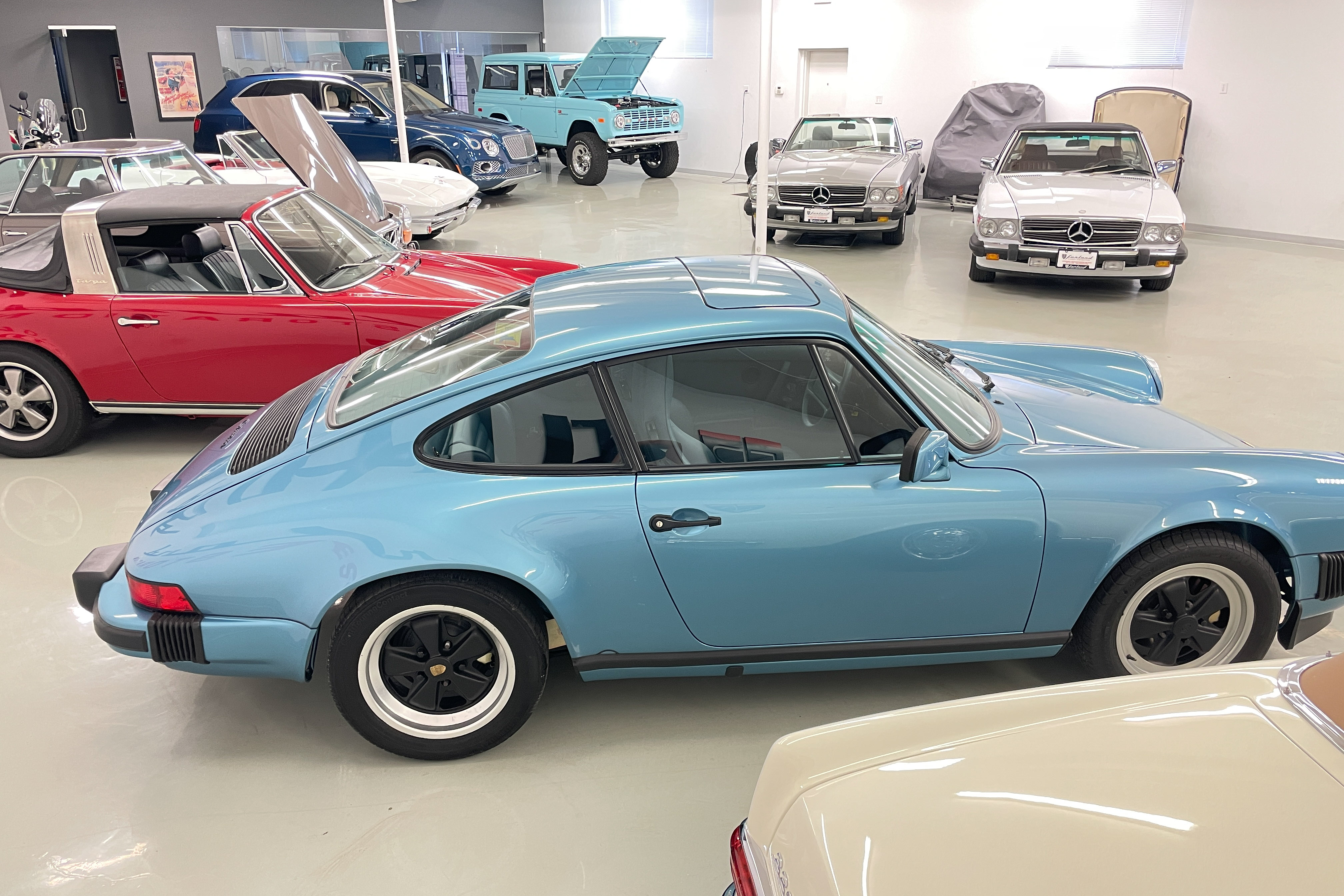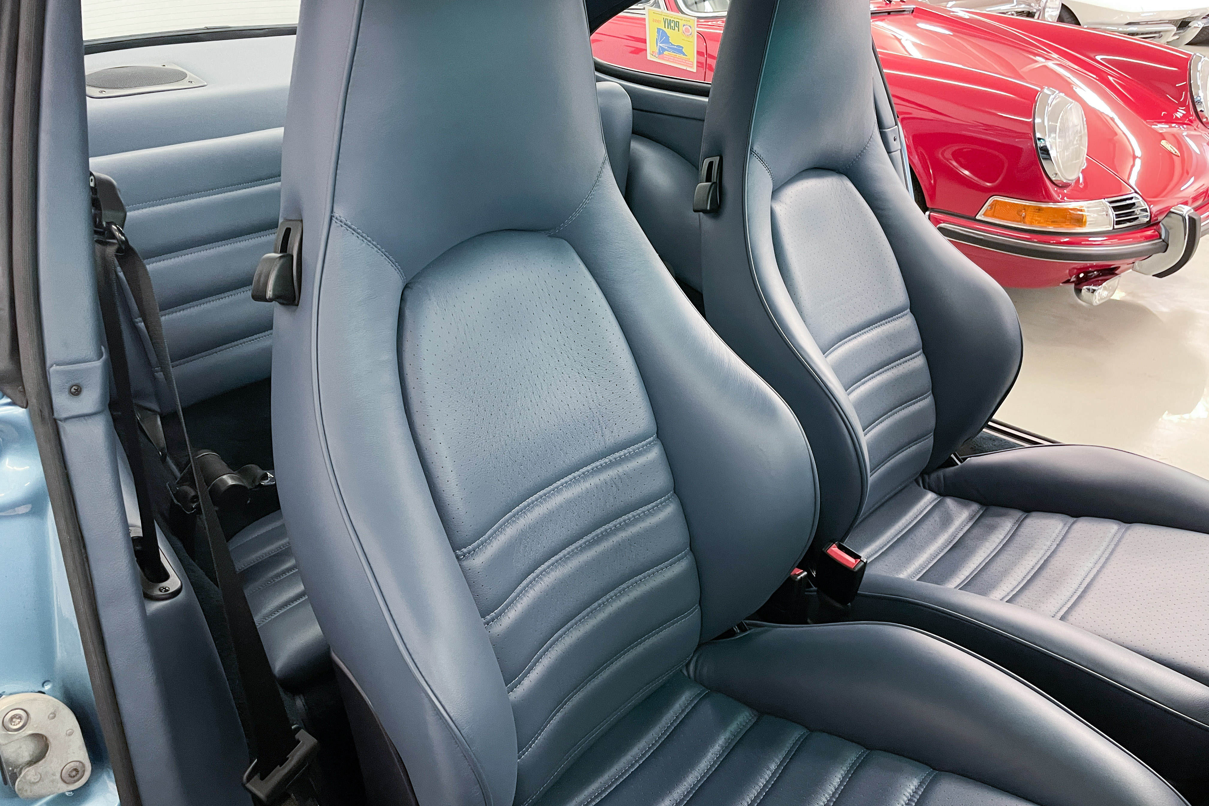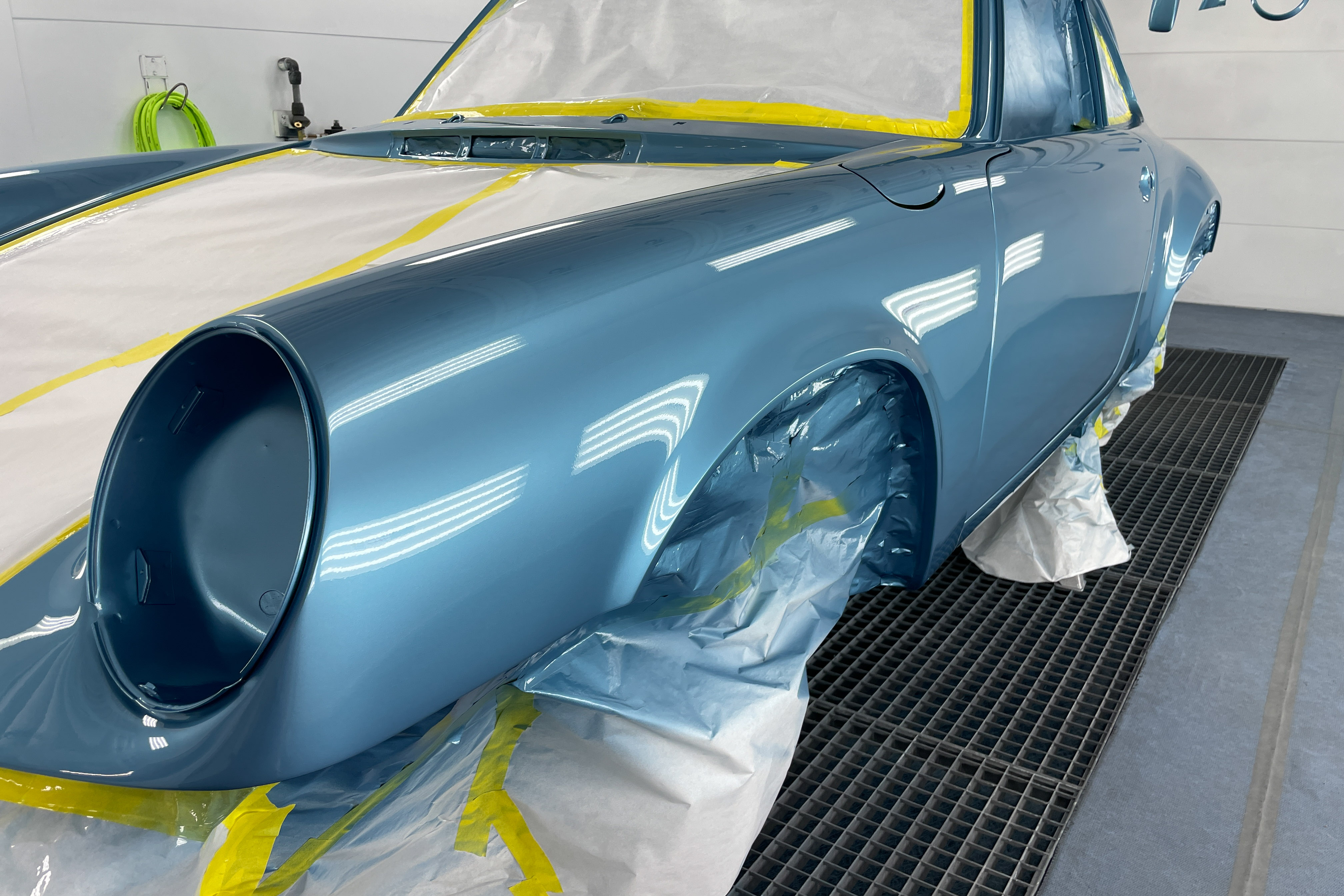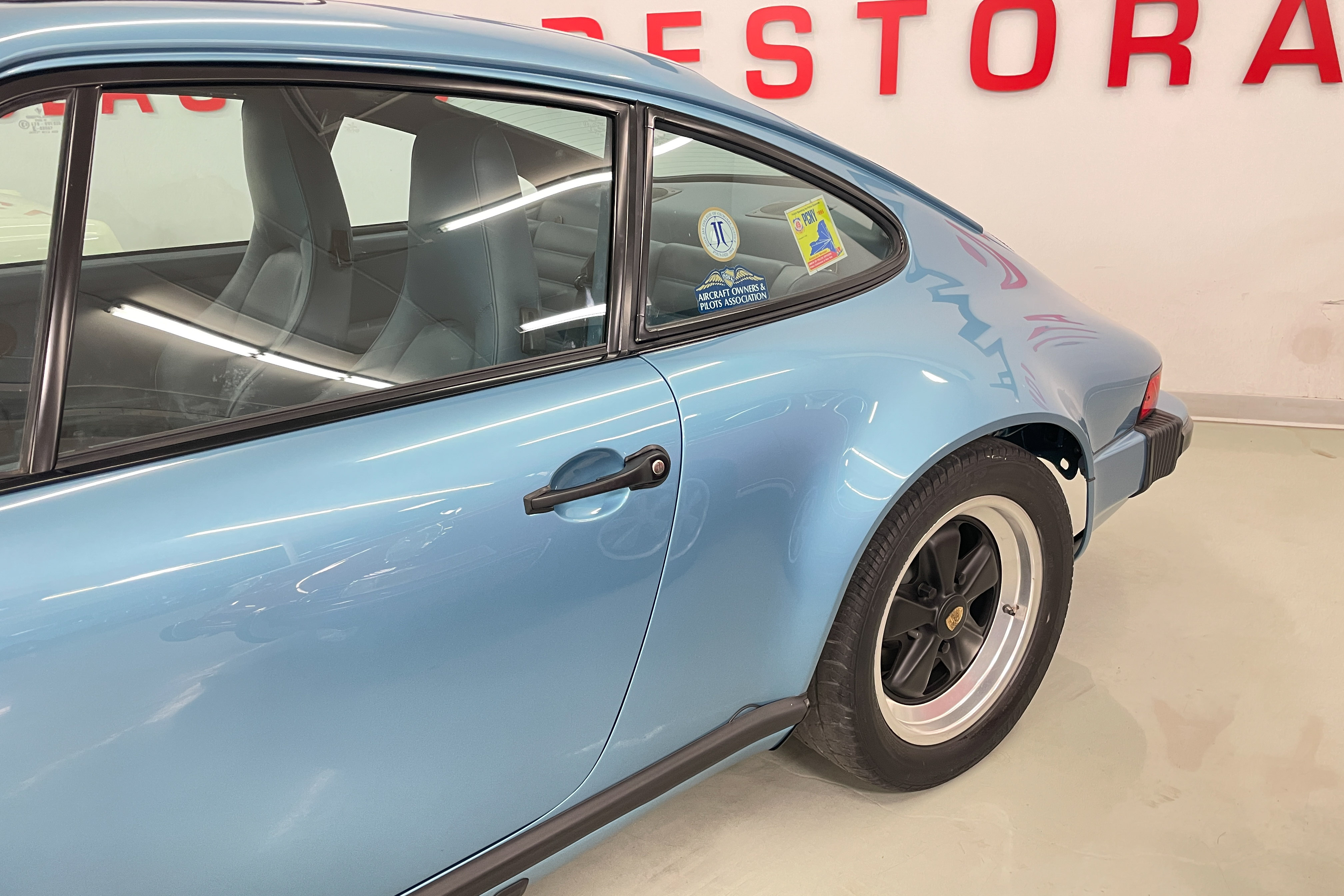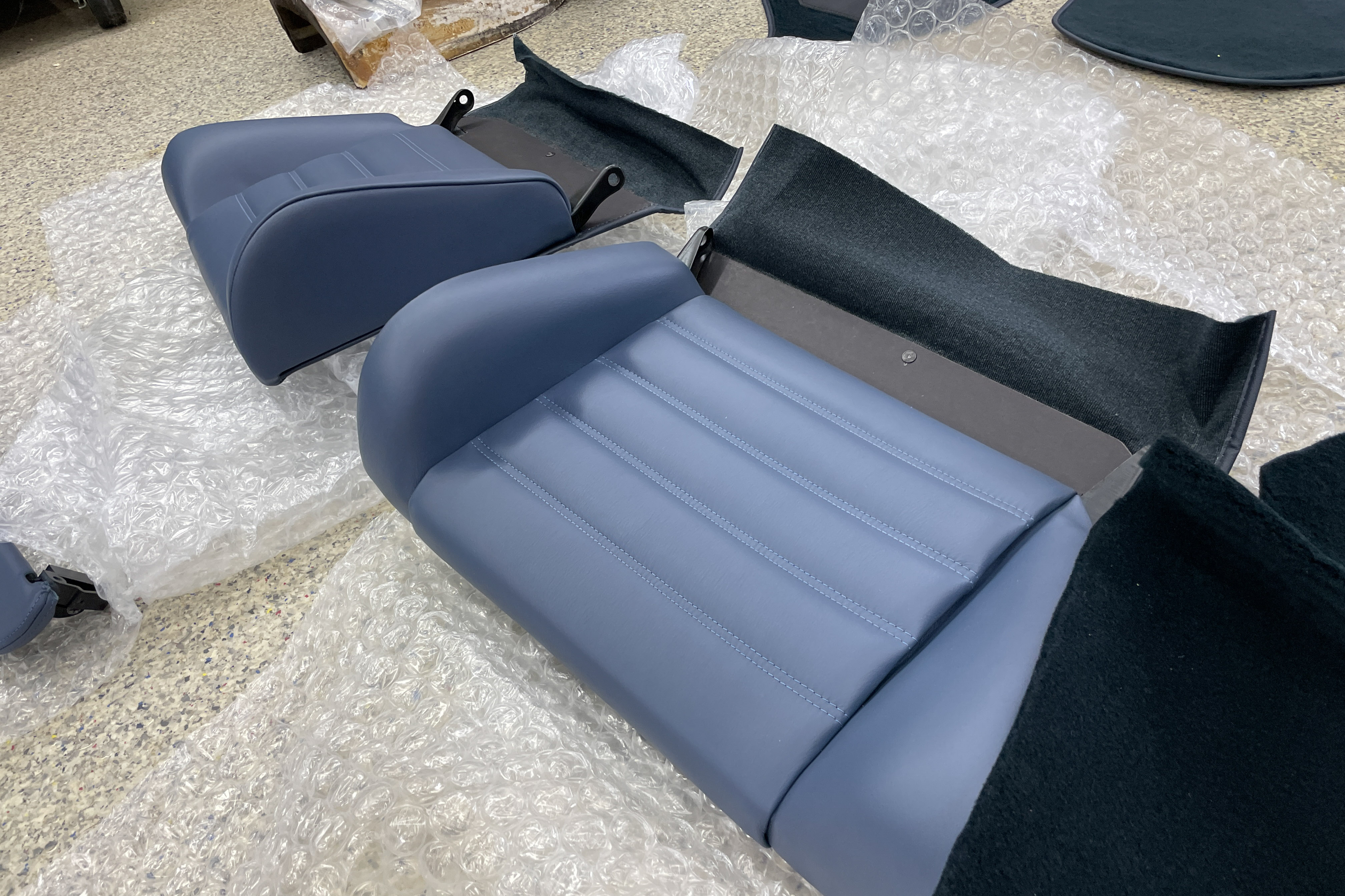 Next was extensive bodywork and metal. Followed by primer, paint, sanding, clear and more sanding. The Porsche factory Iris Blue came out great. Matching the exterior is a Porsche blue leather interior. Every last bit factory correct. There is endless detail work, especially on classic Porsche restorations. Also, remember that this car is going to Moment Motors in Texas to be converted to electric battery and motor. It’s already been there once – getting wiring in place and a lot more.