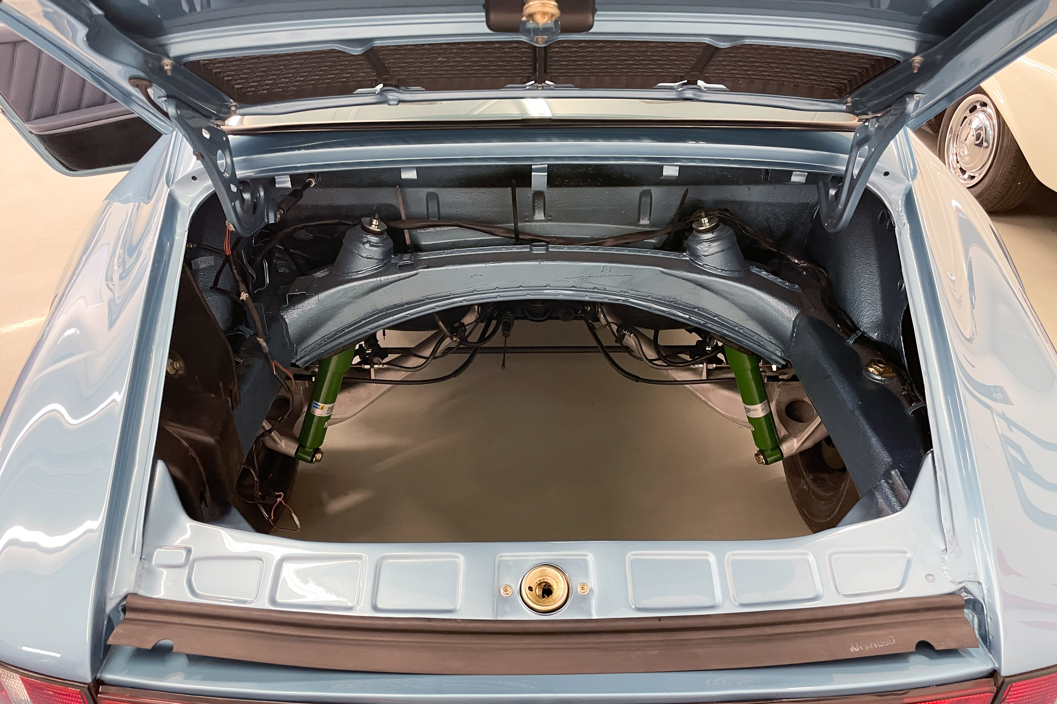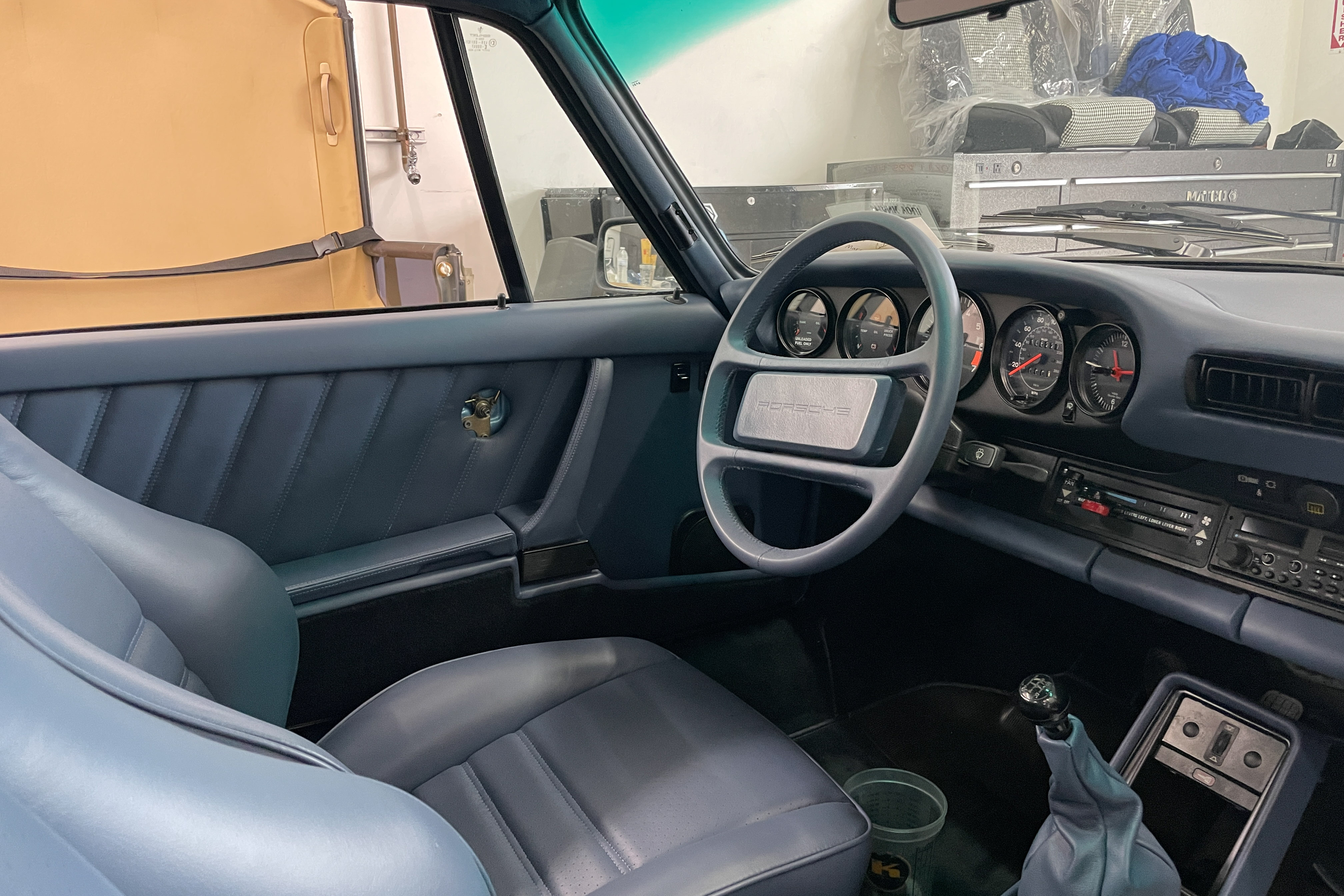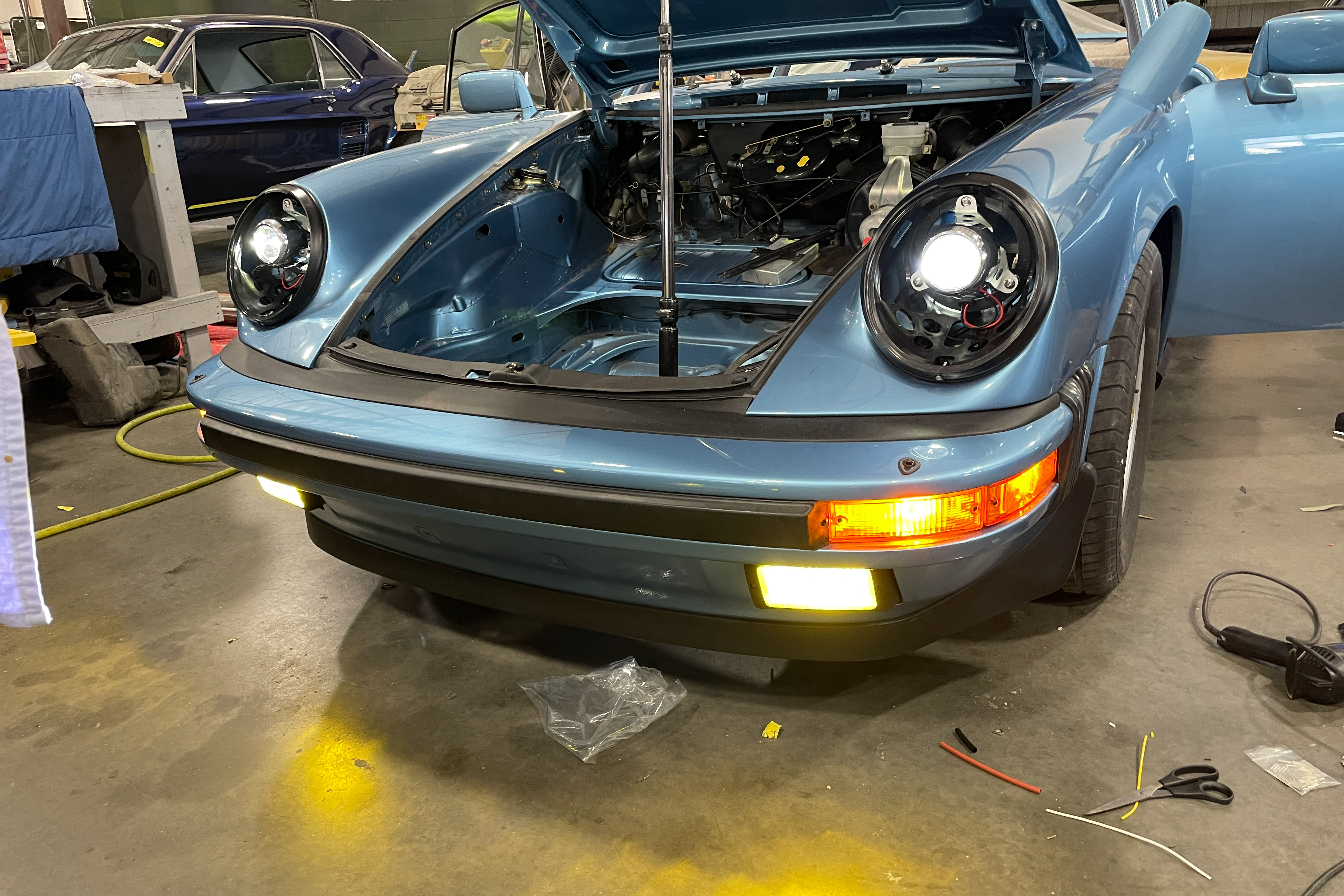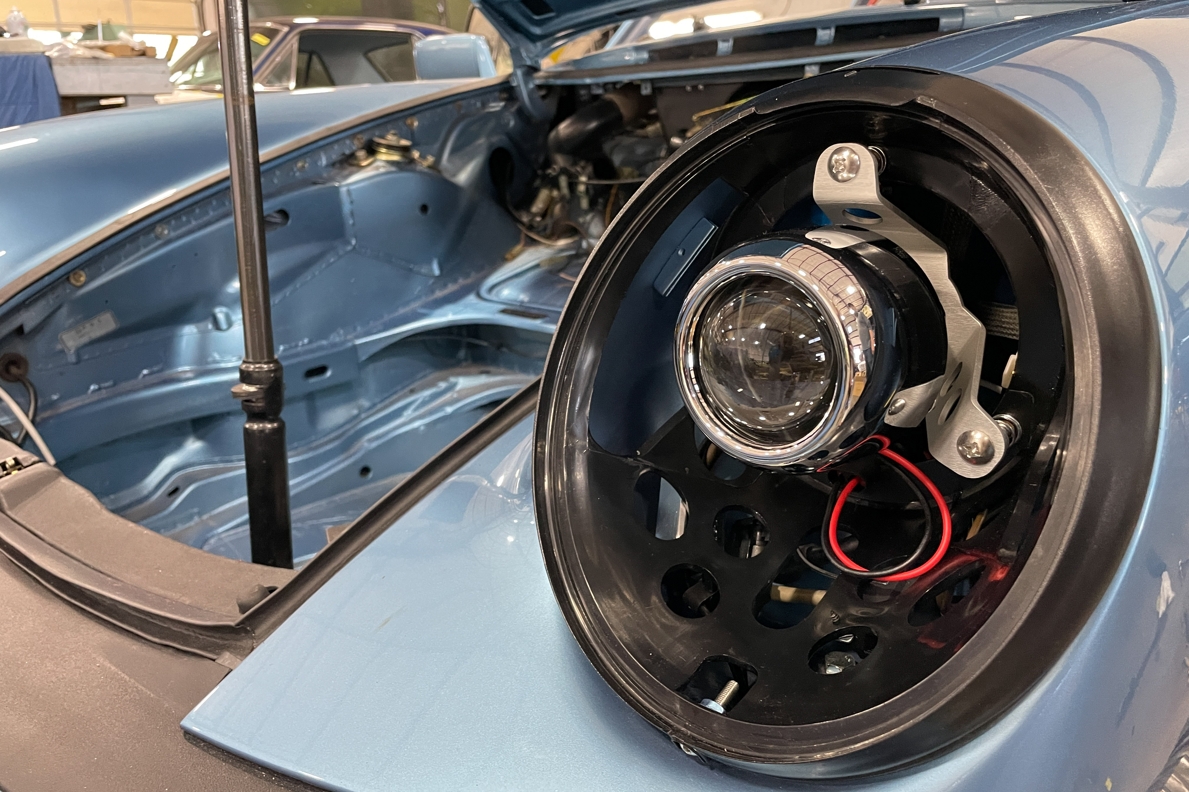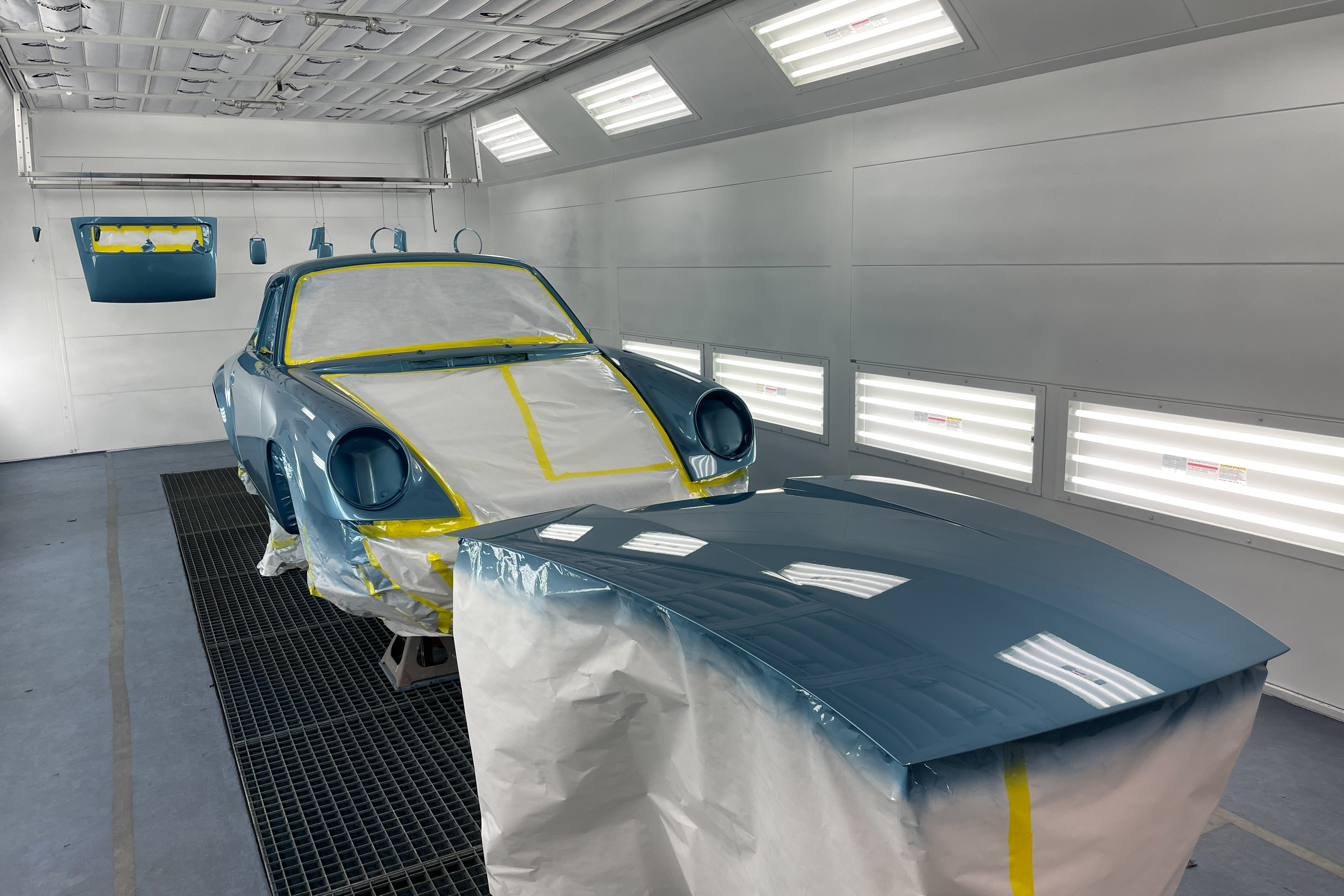 Next was extensive bodywork and metal. Followed by primer, paint, sanding, clear and more sanding. The Porsche factory Iris Blue came out great. Matching the exterior is a Porsche blue leather interior. Every last bit factory correct. There is endless detail work, especially on classic Porsche restorations. Also, remember that this car is going to Moment Motors in Texas to be converted to electric battery and motor. It’s already been there once – getting wiring in place and a lot more.
