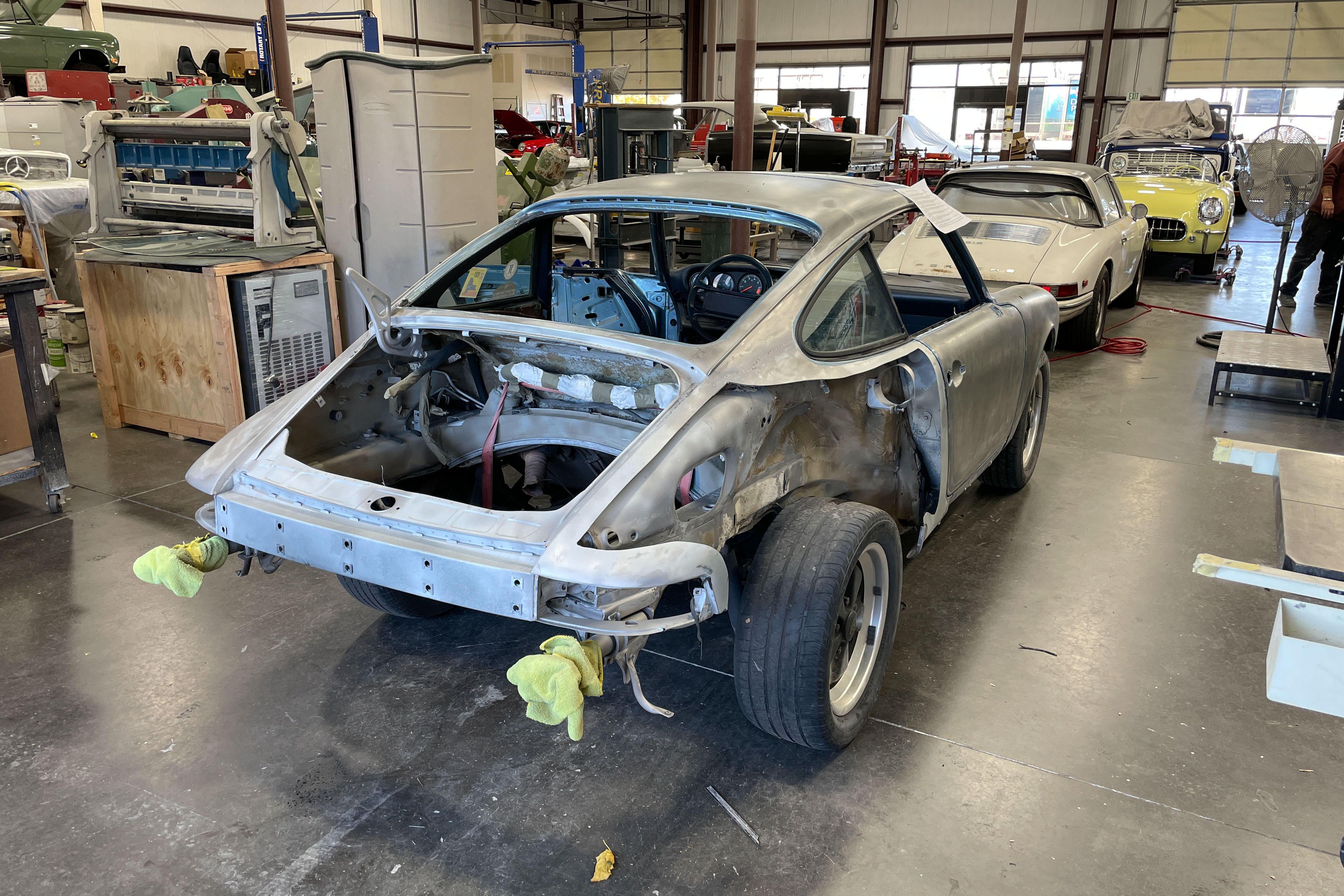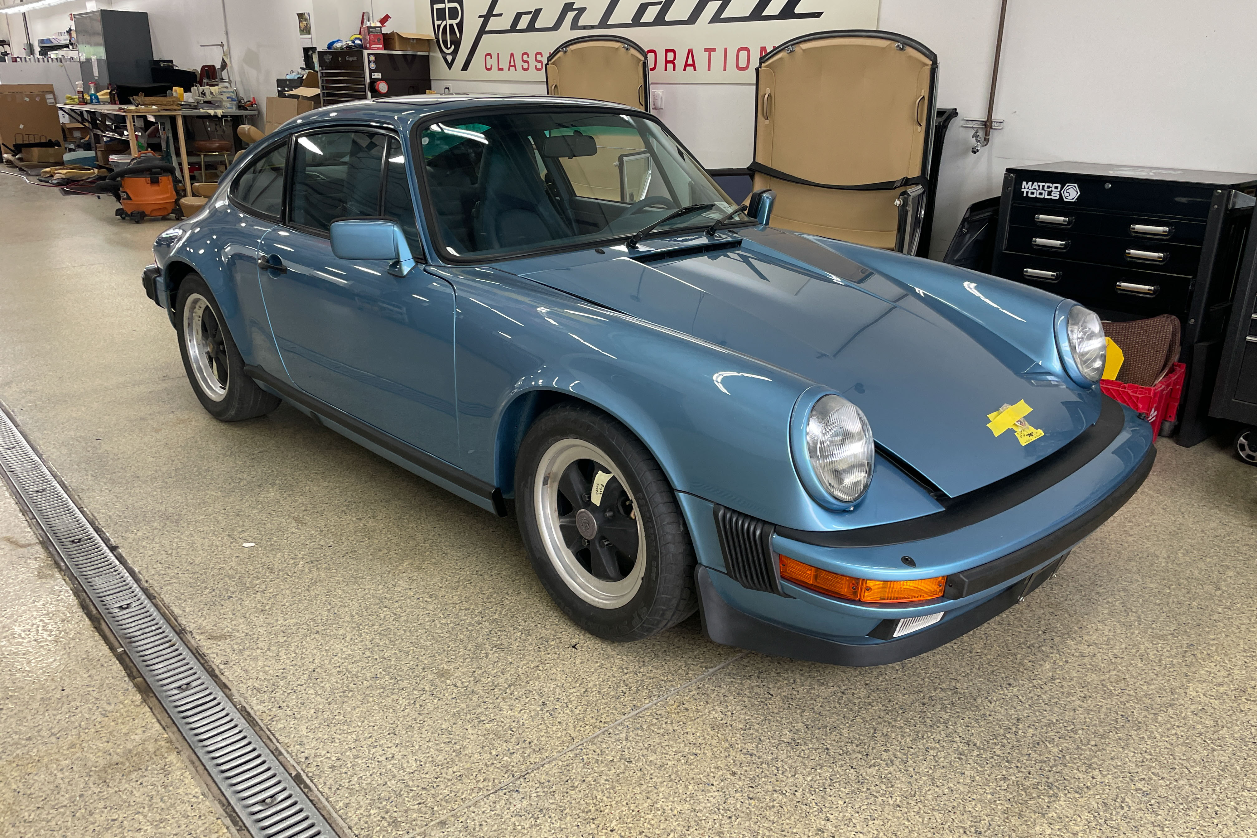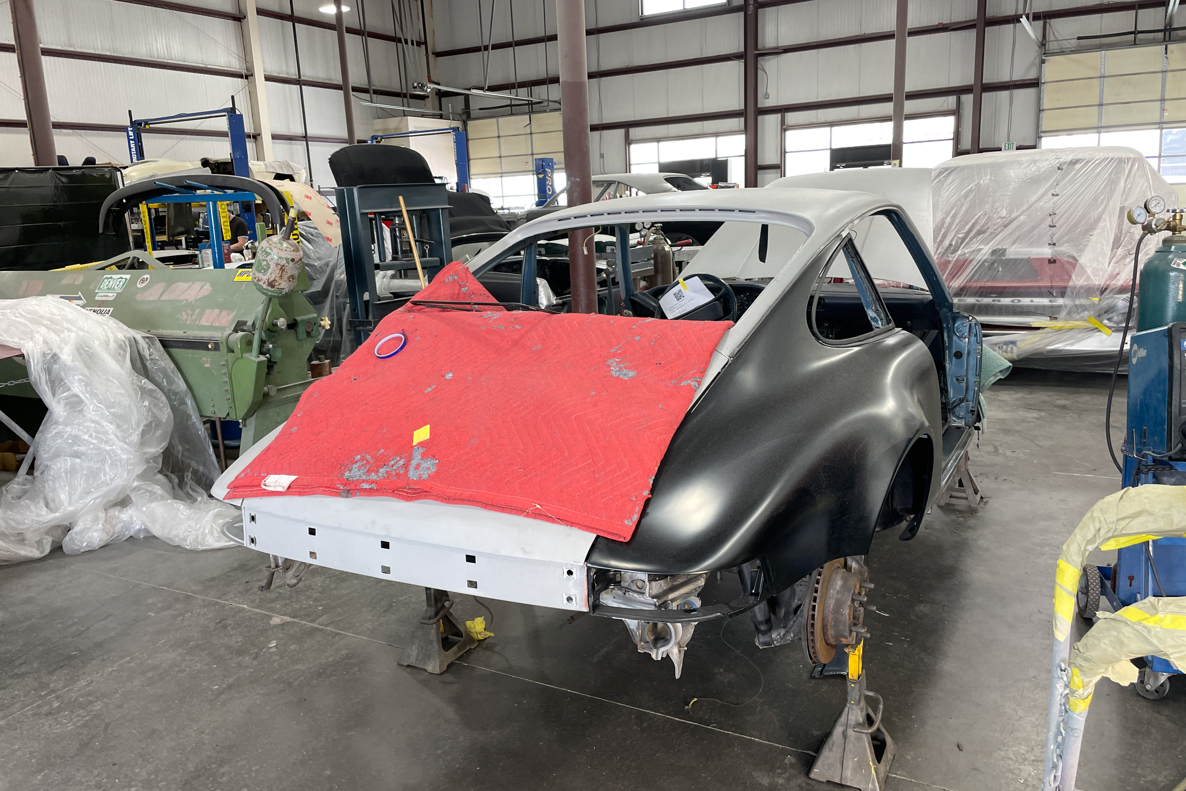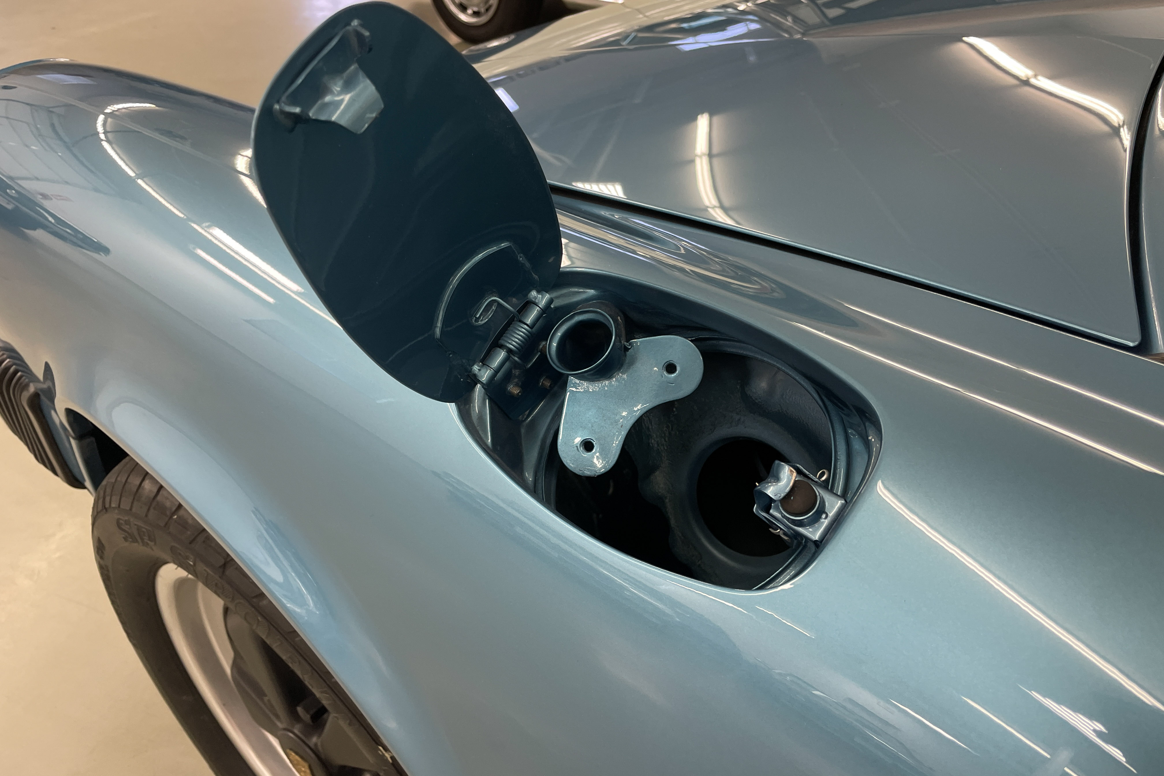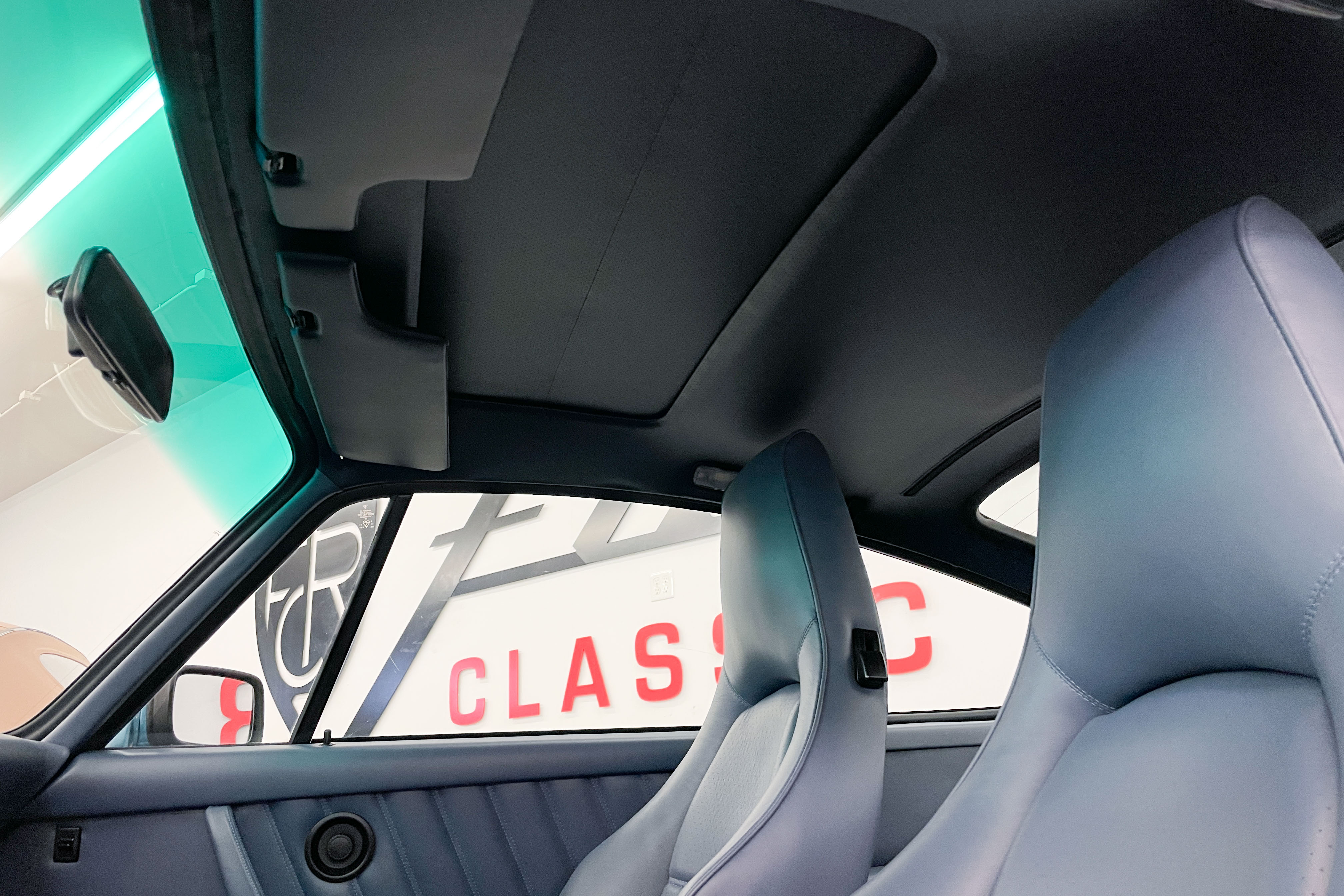 Next was extensive bodywork and metal. Followed by primer, paint, sanding, clear and more sanding. The Porsche factory Iris Blue came out great. Matching the exterior is a Porsche blue leather interior. Every last bit factory correct. There is endless detail work, especially on classic Porsche restorations. Also, remember that this car is going to Moment Motors in Texas to be converted to electric battery and motor. It’s already been there once – getting wiring in place and a lot more.